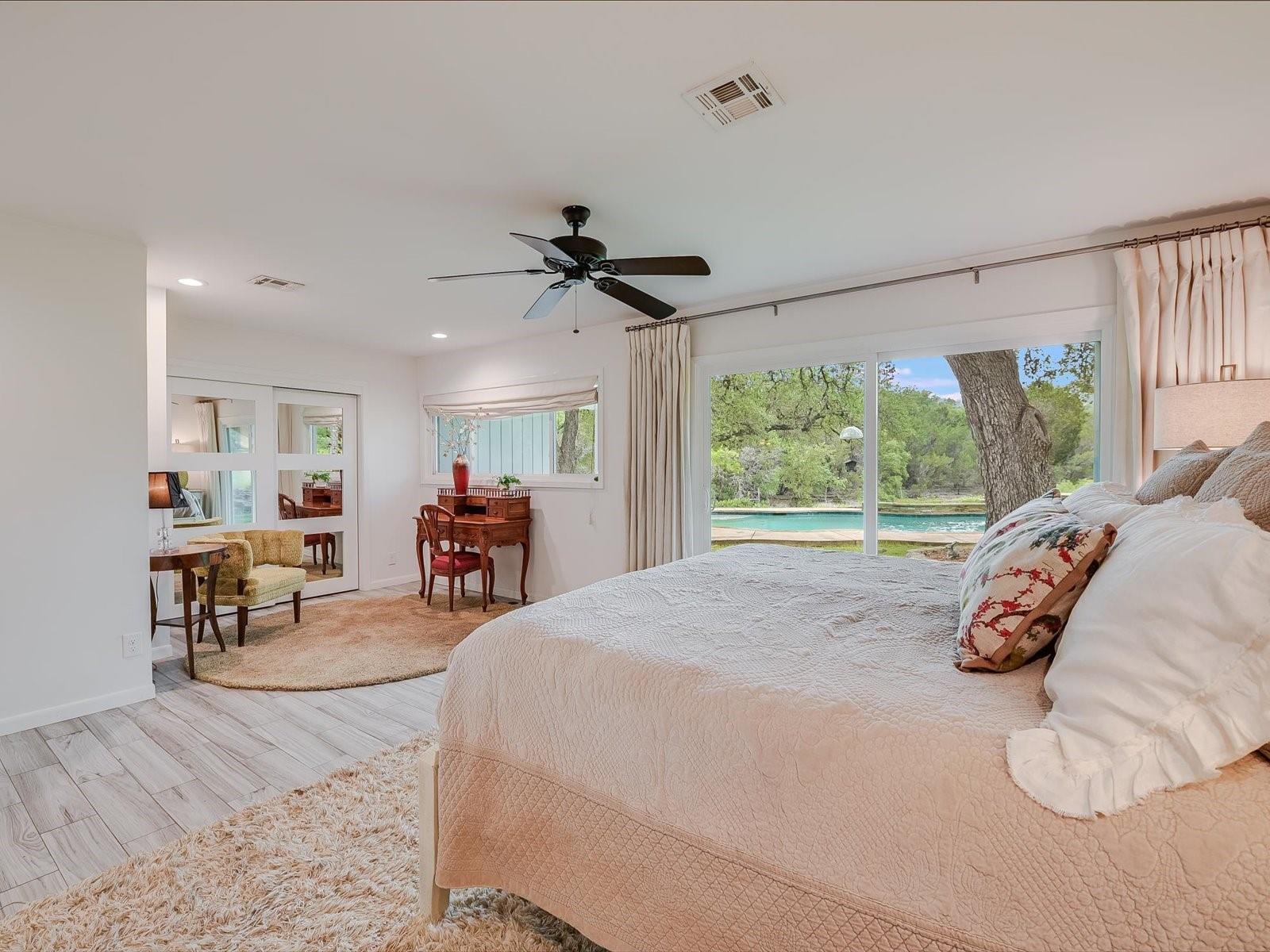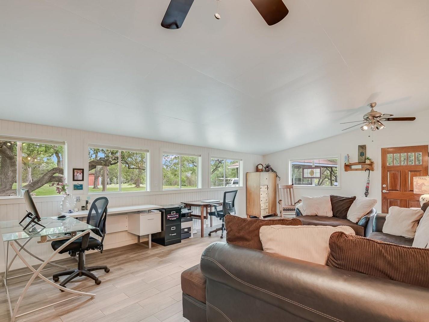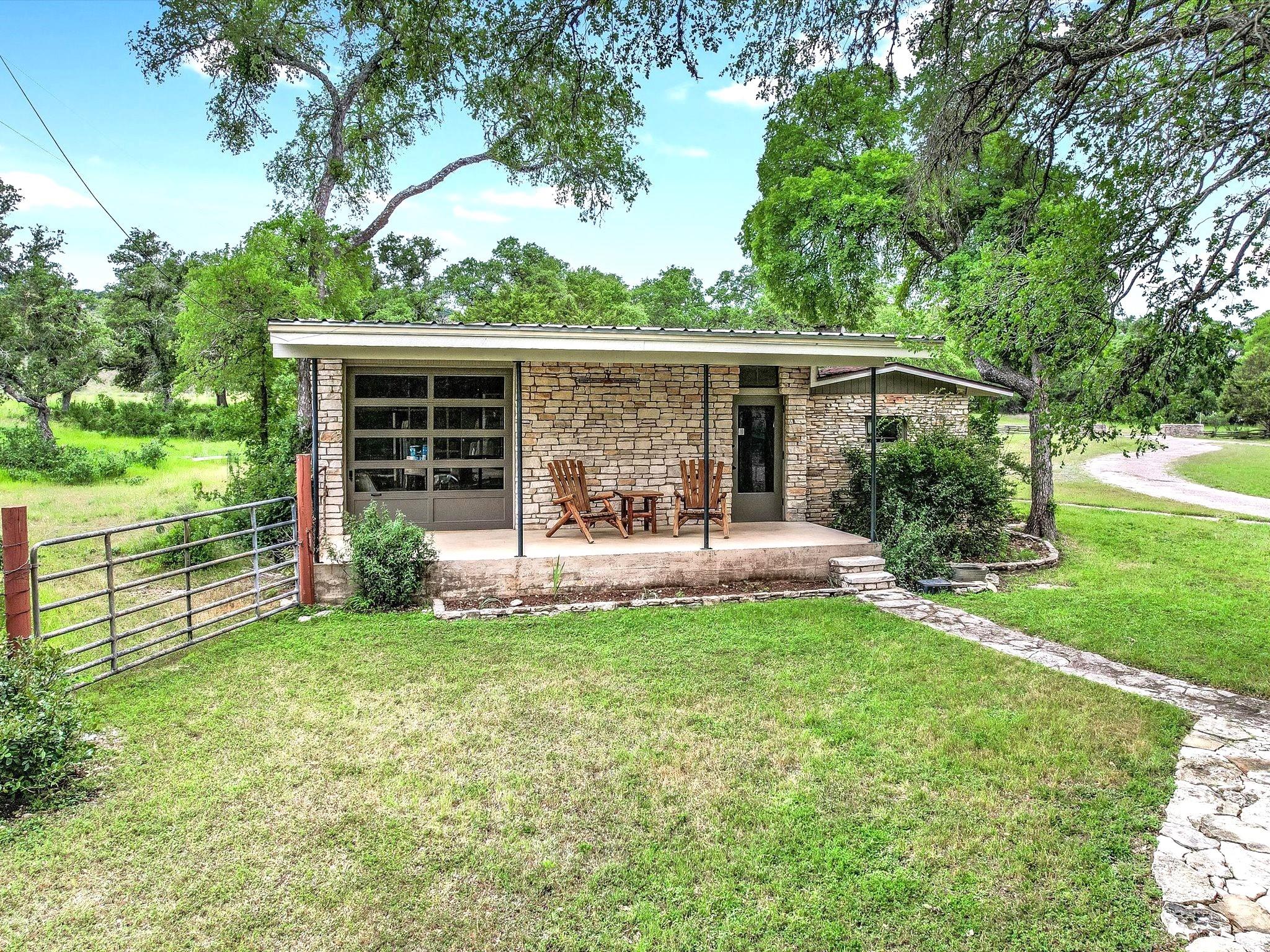 Step into the rich history of Spoke Hollow Ranch, where the warmth of the early '50s embraces you in the original ranch home. Nestled in the Wimberley Valley along Spoke Pile Creek, this hidden retreat offers breathtaking views of serene hills & a captivating landscape. As you wind down the driveway, an immediate sense of peace envelops you as majestic oaks grace the front lawn. The home, now perfectly situated on 10+ acres, was once the heart & soul of the ranch. Conservation-minded family members took over stewardship of the ranch where the land continues to be cherished & cared for today. Located outside city limits with no deed restrictions, the property offers boundless potential for a variety of uses including a resort, wedding venue, short term rentals or a family compound. The home has undergone thoughtful renovations to preserve its mid-century modern aesthetic, featuring interior rock walls & columns, original wood flooring, tilted jalousie windows & a wood-burning fireplace. The spacious kitchen features on-site built cabinets, granite countertops & a longleaf pine island. The kitchen flows into the dining room, a cozy bar & 2 living areas. The remodeled primary suite features stunning views, a sitting area, 3 closets, built-ins, & an adjacent flex room. On the far side of the home, 2 bedrooms share a connecting bathroom & a 3rd living area. Step outside to discover a sparkling inground pool, creekside patio, barn, fenced garden area, chicken coop & a 770 SF workshop/garage that could be repurposed as a guest cottage. Although the home is serviced by Wimberley Water Supply, the well could potentially be restored to provide an additional water source. The property spans 10.3 acres on 2 tracts, w/half remaining relatively untouched. Partially high-fenced, the tract boasts 452+ feet fronting Spoke Pile Creek which comes to life w/cascading waterfalls after a replenishing rainfall.