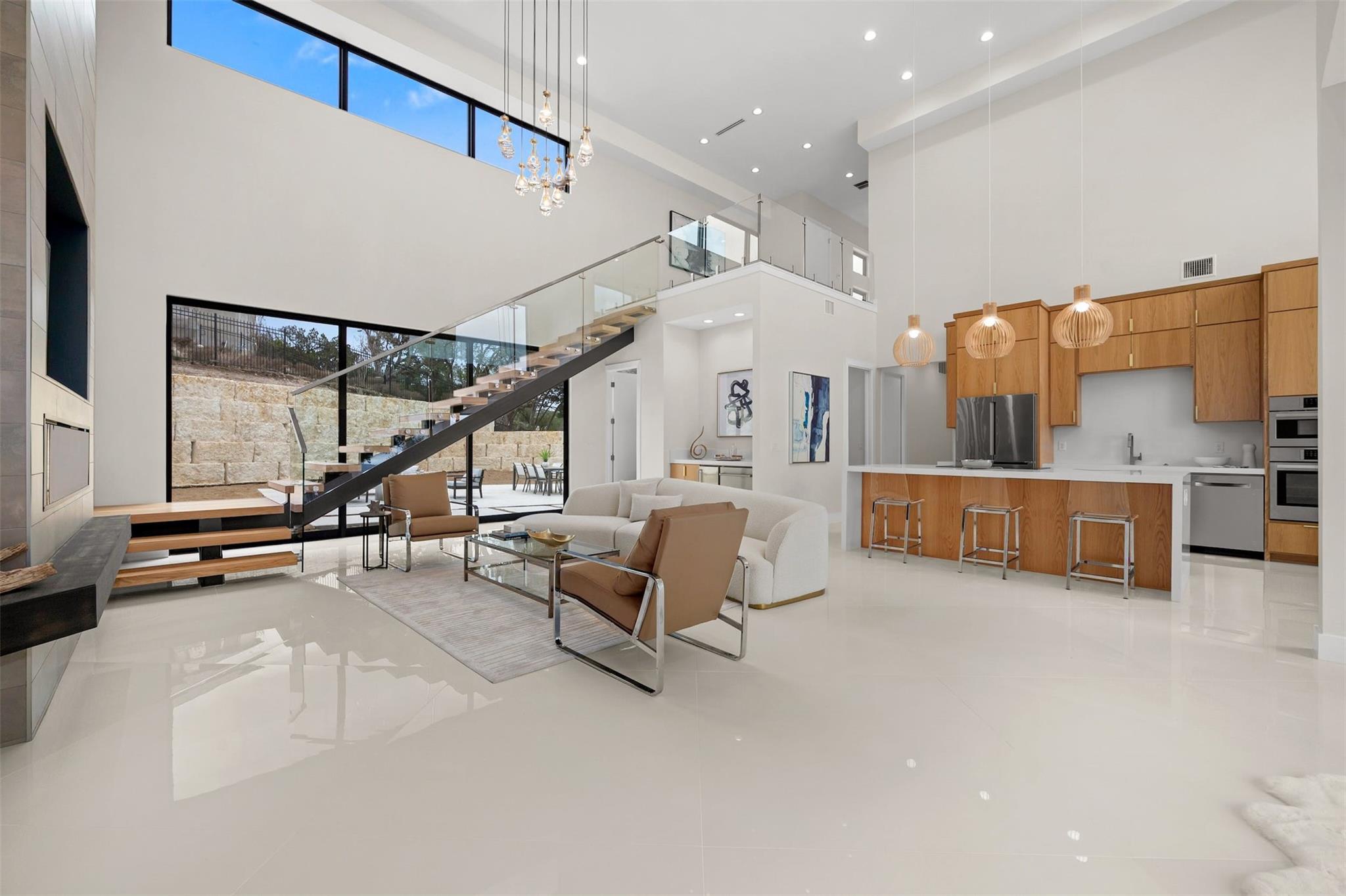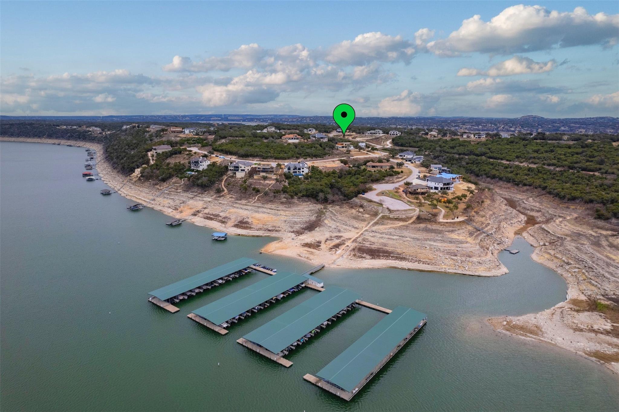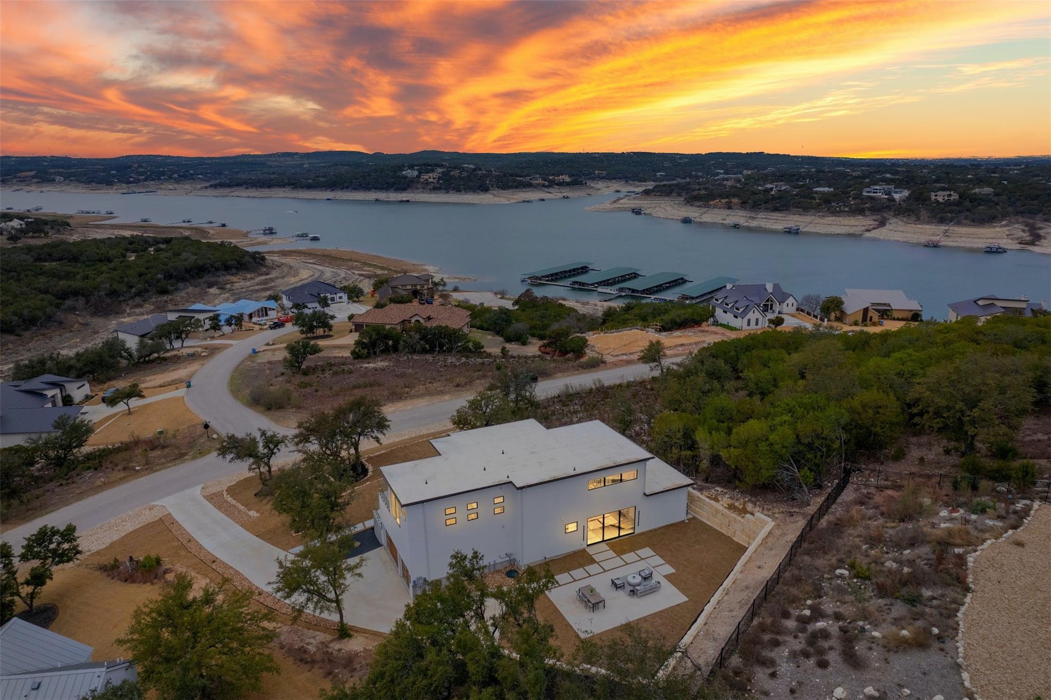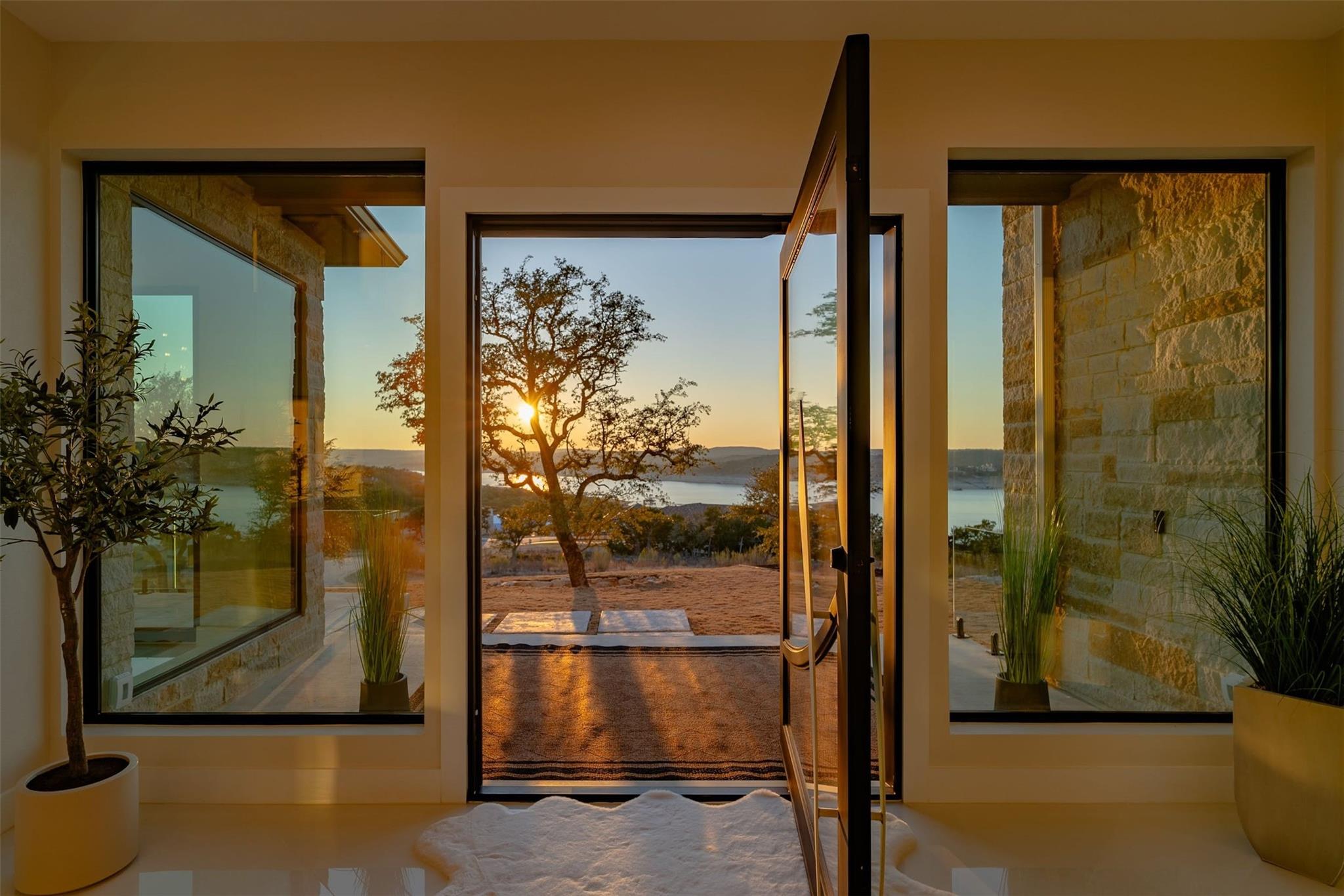 Price Improvement on your Lake Travis dream home in the prestigious Gated Waterford Community! This brand new, custom-built modern masterpiece offers unparalleled luxury and breathtaking panoramic Lake Travis views from every room. With 4 bedrooms, 4.5 bathrooms, this home exudes versatility and sophistication. Step inside to discover an open kitchen concept with 25' high ceilings, complemented by custom light fixtures that illuminate the space beautifully. The architectural floating staircase adds a touch of elegance, while floor-to-ceiling windows in the primary suite showcase the stunning lake vistas. Entertain guests on the second-story balcony or retreat to the large primary suite featuring a huge walk-in shower and tranquil lake views. Bosch appliances, a custom electric fireplace, and a tankless water heater ensure both style and functionality. This home also boasts practical features such as a 3-car garage, ready for 110v electric vehicle charging, and walking distance to the exclusive Waterford Marina for convenient access to lakeside activities and Boat Slips. Outside, mature oak trees provide shade and tranquility, adding to the serene ambiance of this idyllic property. Close proximity to Point Venture & Lago Vista Golf Courses. Don't miss the opportunity to make this exquisite Lake Travis View retreat your own!