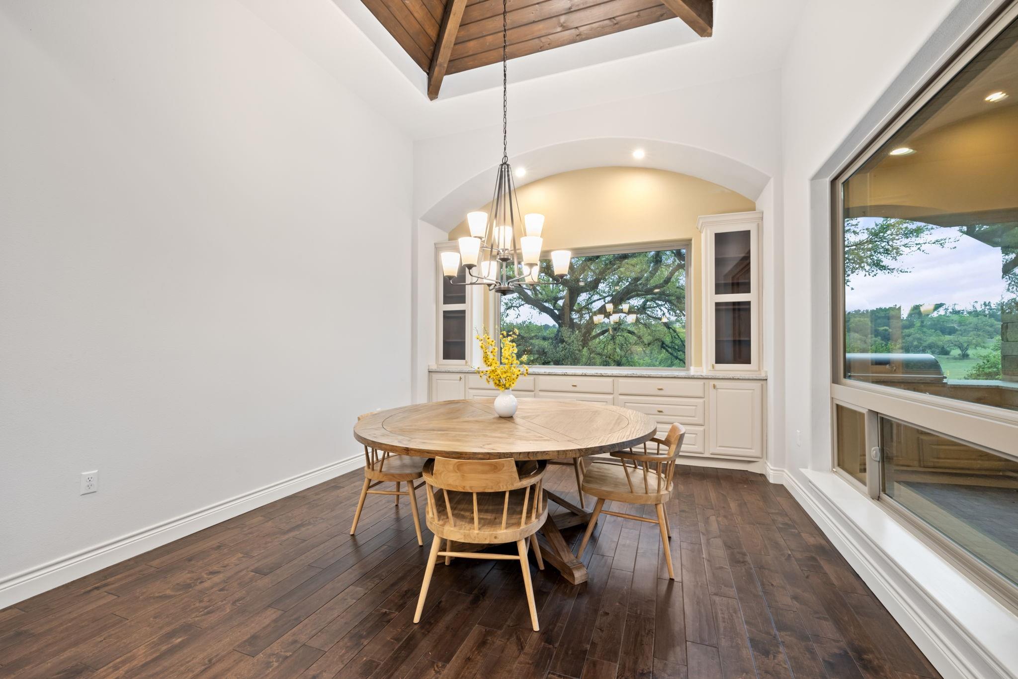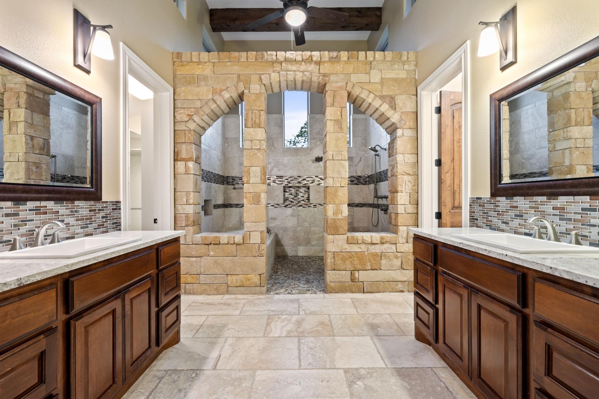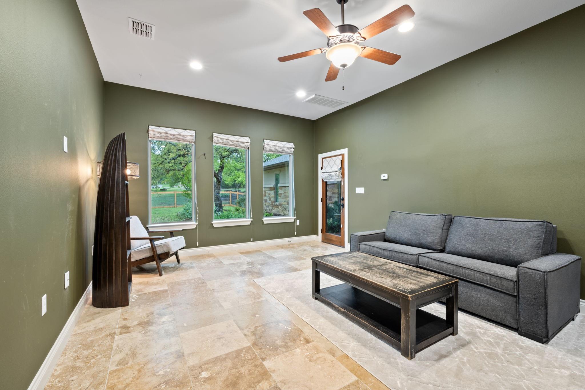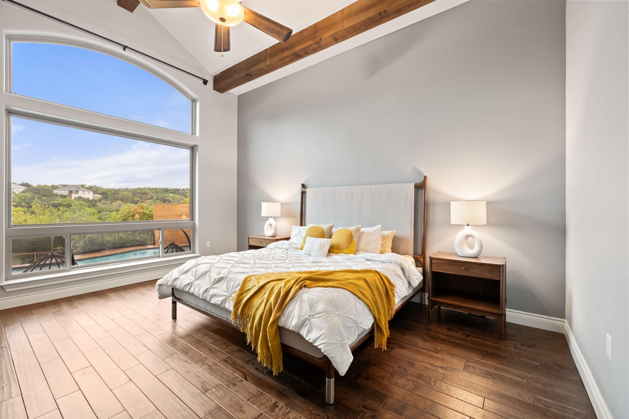 Immerse Yourself in Hill Country Opulence: Unparalleled Luxury awaits in this expansive Hill Country estate nestled within the prestigious La Ventana community. Spread across 2.44 private acres, this residence offers a sanctuary of unparalleled comfort and sophistication. Step Inside: Grand Design: The main home boasts 5 spacious bedrooms, 4 full baths, and a sophisticated powder room. Vaulted ceilings adorned with natural wood beams create a sense of grandeur, while custom-painted cabinetry and a large island with a subway tile backsplash elevate the gourmet kitchen to a chef's haven. Tranquil Retreat: An executive office, or optional 4th bedroom, features a hidden bookcase closet for a truly serene workspace overlooking a secured courtyard. Panoramic Paradise: The second level unveils a dedicated flex room, a 3rd bedroom, and dedicated workspace niche with its own private outdoor patio. Imagine waking up to breathtaking vistas of the sparkling pool, rolling Hill Country terrain, mesmerizing sunsets, and even a golf course! A Haven for Guests: Indulge your guests in unparalleled privacy with a separate 1 bedroom/1 bathroom apartment complete with a full kitchenette and living room. This self-contained haven boasts a built-in Murphy full sized bunk bed for added convenience, and a delightful spacious private yard. This apartment offers the perfect blend of independence and luxury. Outdoor Oasis: Embrace the Hill Country lifestyle with an expansive heated pool feat. an Oasis waterfall, a natural diving board, and a swim-up hot tub bar. Relax under the shade of a custom awning, or whip up a gourmet meal in the fully-equipped outdoor kitchen. A private, direct-access creek awaits just steps away, offering a tranquil escape into the heart and peace of the Hill Country. Beyond the Estate: Enjoy the plethora of additional amenities offered by the exclusive Ranchers Club, all within a short stroll from your doorstep.