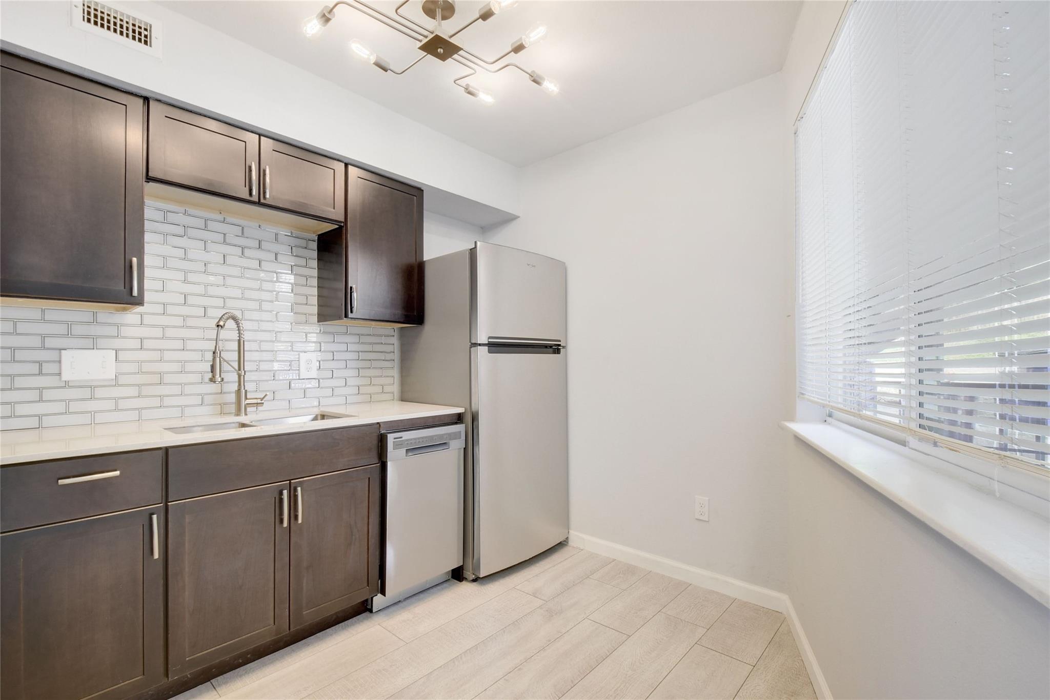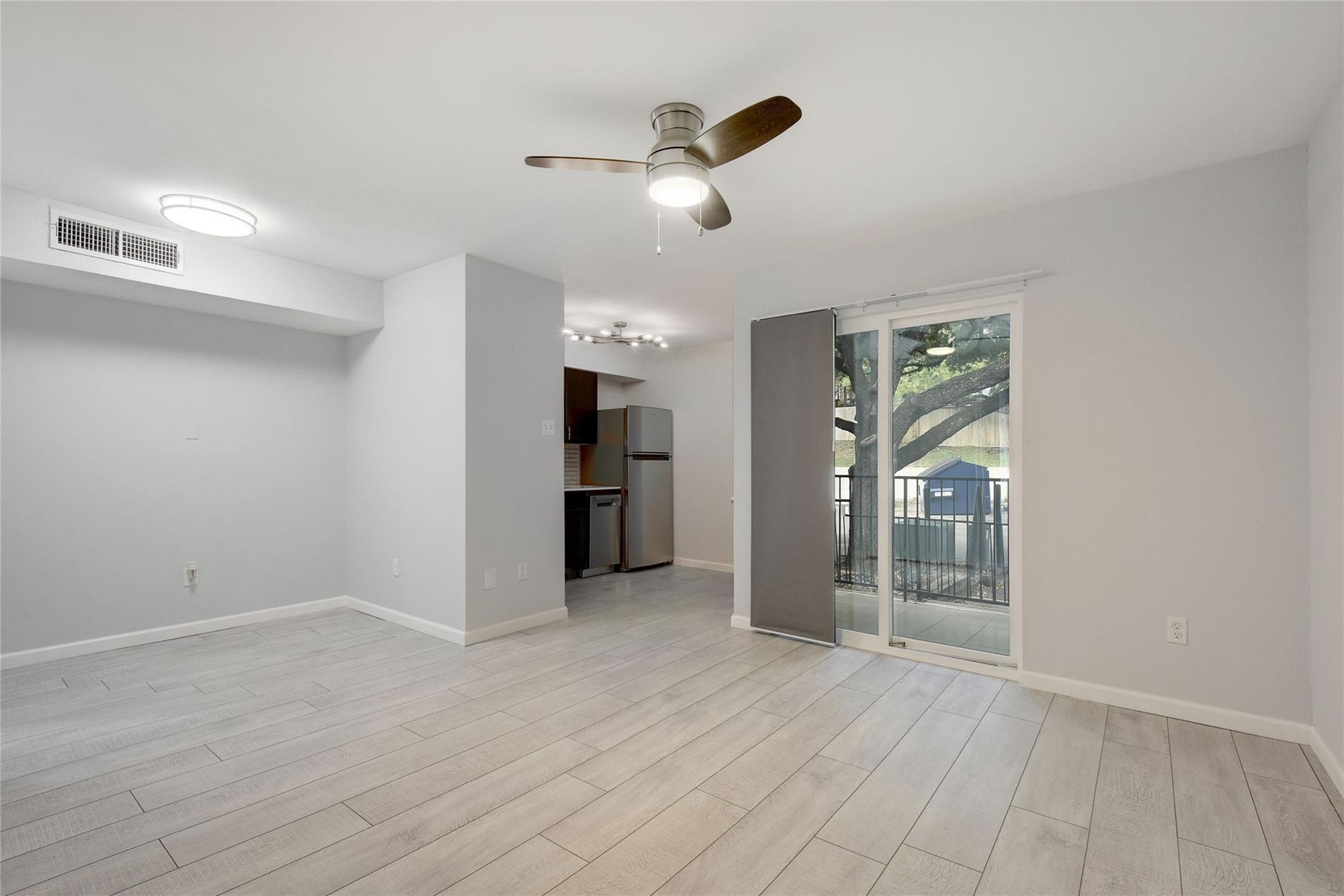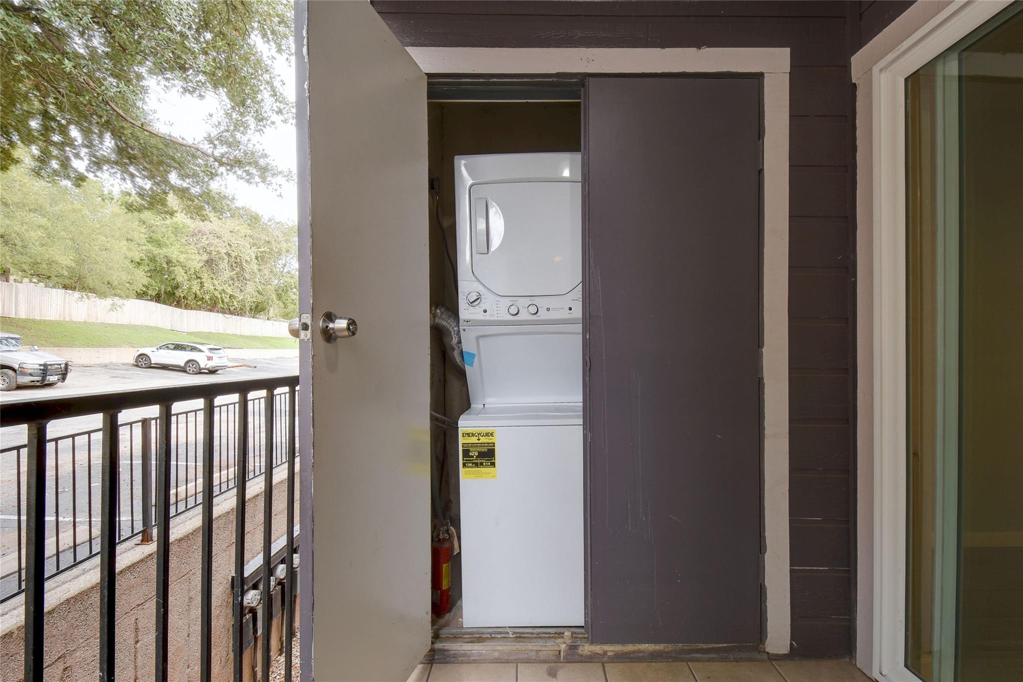 Location! Location! Location! Live the downtown Austin life style in this recently renovated one bed, one bath with incredible designer finishes just steps from the community pool. This second floor entry freshly painted unit offers vinyl plank flooring throughout, recently replaced windows and sliding doors, designer cabinetry, white quartz counters, farmhouse sink, stainless appliances including a refrigerator. Recently replaced washer/dryer, covered balcony for morning coffee & more. the living room offers a nook area perfect for a desk to work from home. The bedroom includes window treatments and a walk in closet with built in shelving. The bathroom has a single vanity with quartz counters and a walk in shower with chrome dual showerhead & a frameless shower door. Minutes from cool Austin dining options, entertainment, an H-E-B+ and Lady Bird Lake, you do not want to miss this!