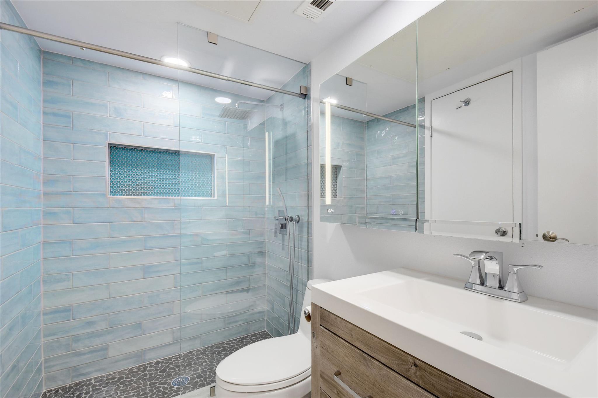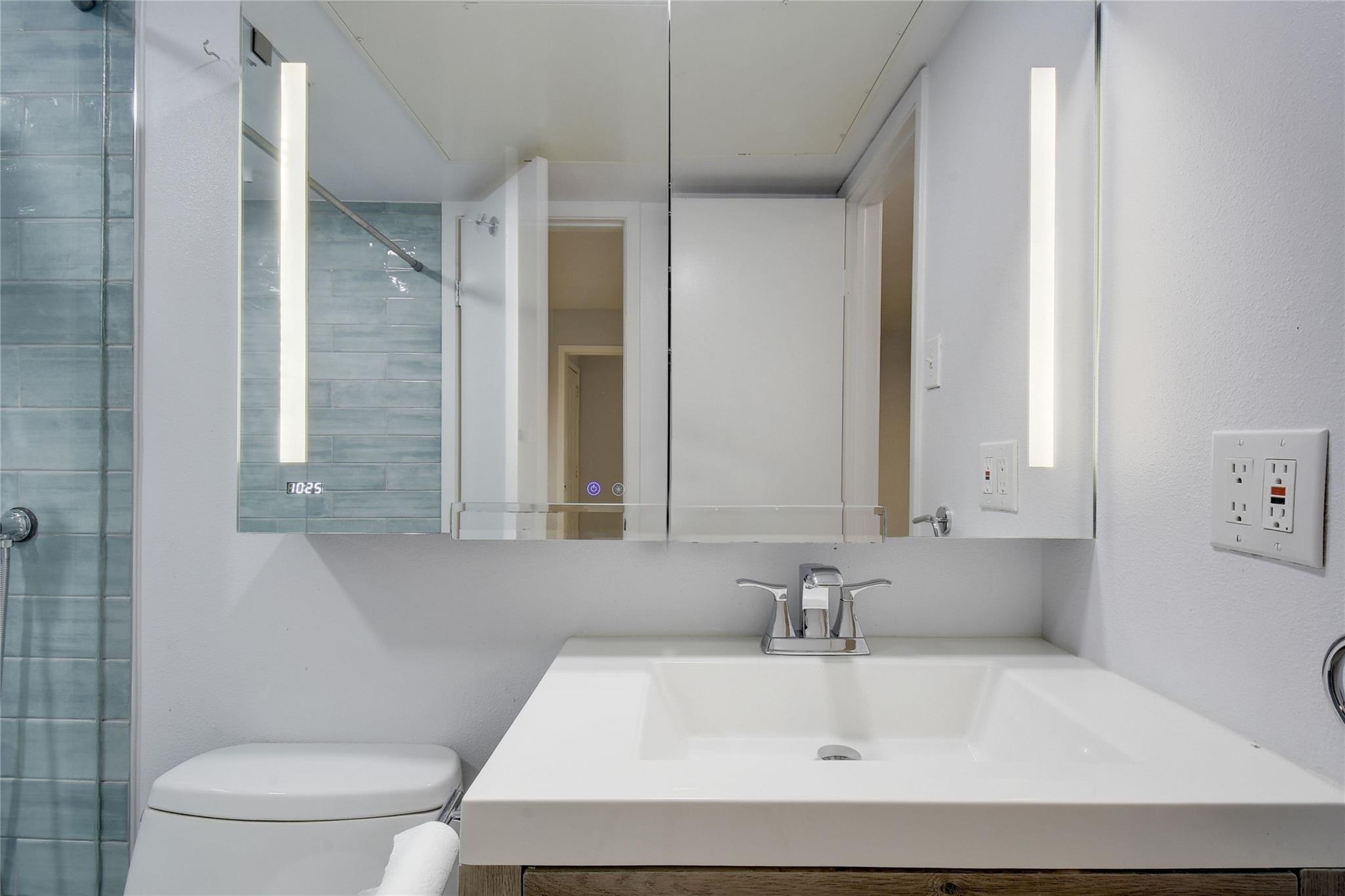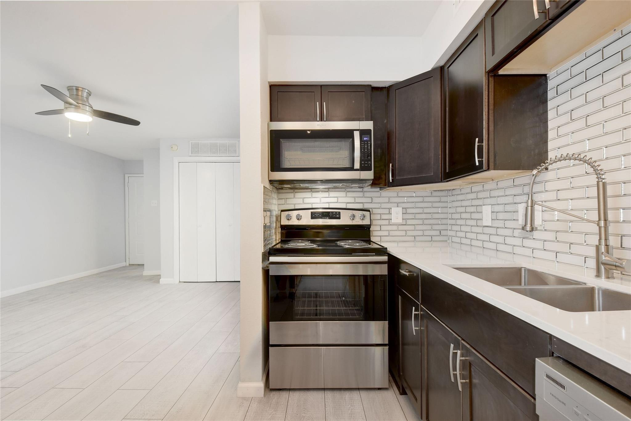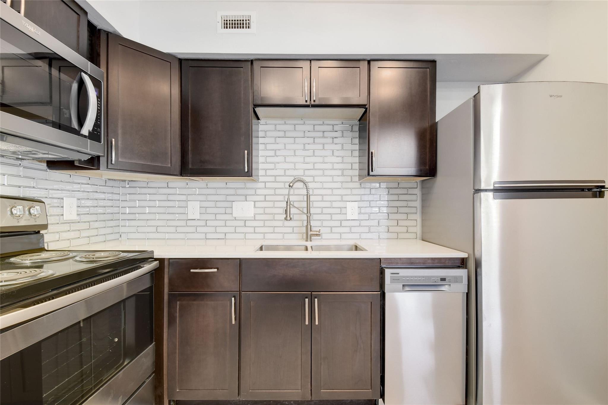 Location! Location! Location! Live the downtown Austin life style in this recently renovated one bed, one bath with incredible designer finishes just steps from the community pool. This second floor entry freshly painted unit offers vinyl plank flooring throughout, recently replaced windows and sliding doors, designer cabinetry, white quartz counters, farmhouse sink, stainless appliances including a refrigerator. Recently replaced washer/dryer, covered balcony for morning coffee & more. the living room offers a nook area perfect for a desk to work from home. The bedroom includes window treatments and a walk in closet with built in shelving. The bathroom has a single vanity with quartz counters and a walk in shower with chrome dual showerhead & a frameless shower door. Minutes from cool Austin dining options, entertainment, an H-E-B+ and Lady Bird Lake, you do not want to miss this!