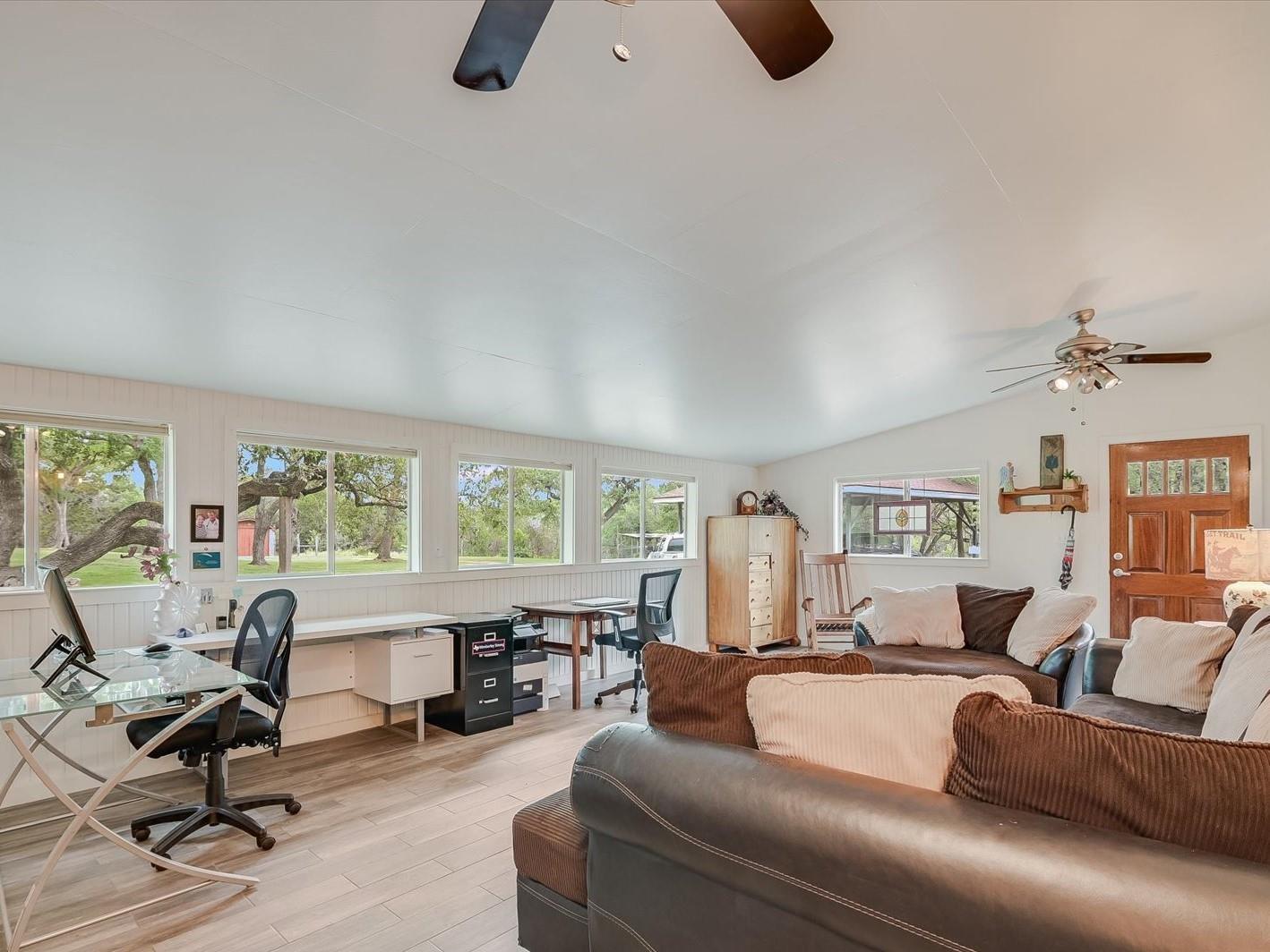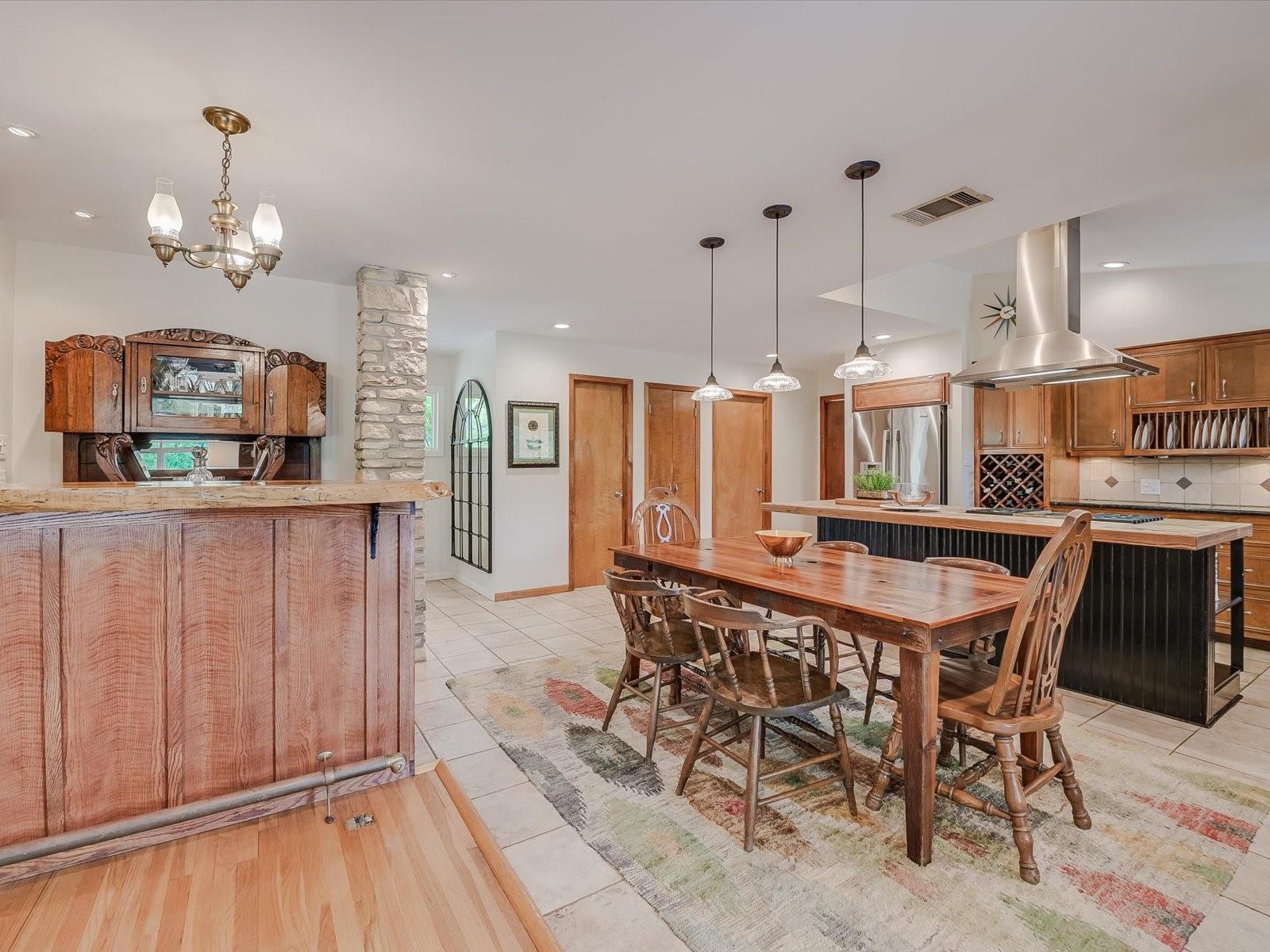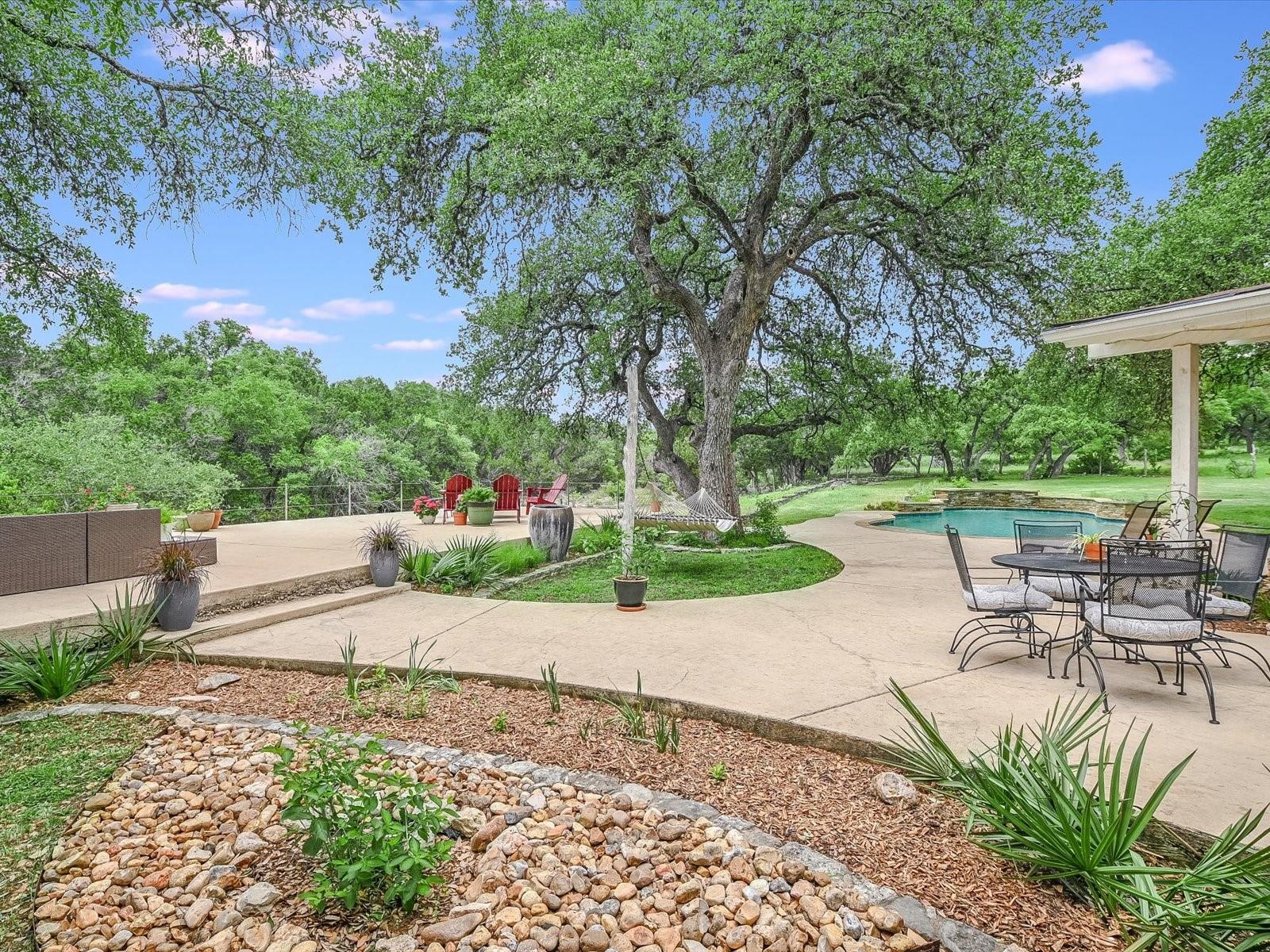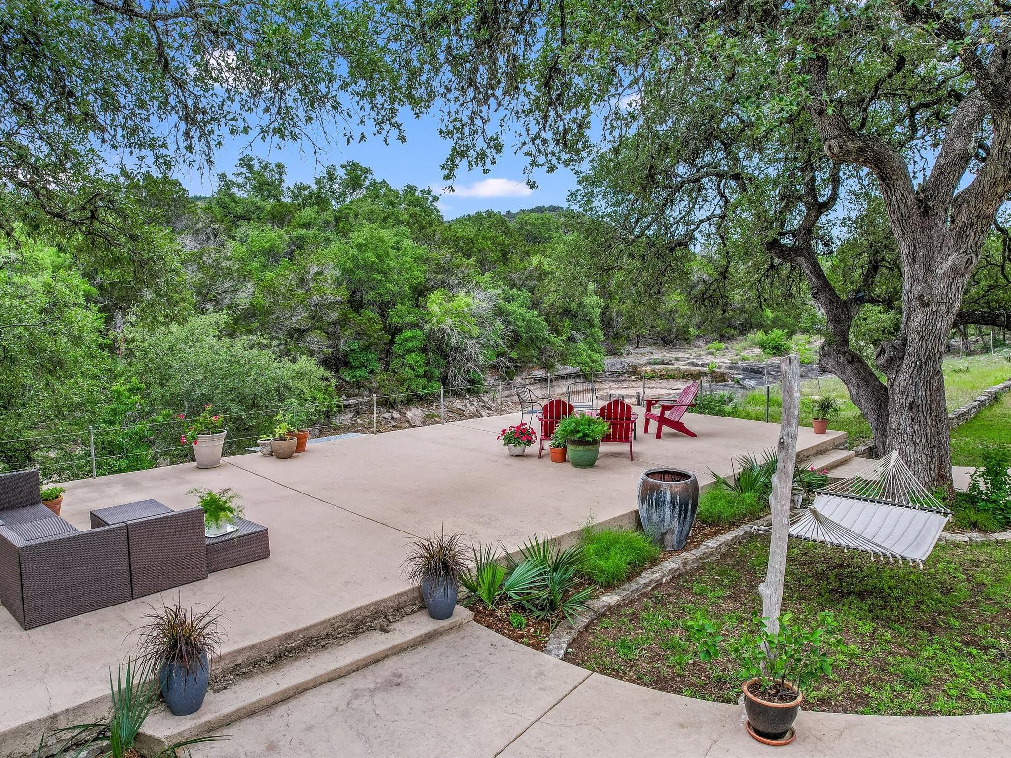 Step into the rich history of Spoke Hollow Ranch, where the warmth of the early '50s embraces you in the original ranch home. Nestled in the Wimberley Valley along Spoke Pile Creek, this hidden retreat offers breathtaking views of serene hills & a captivating landscape. As you wind down the driveway, an immediate sense of peace envelops you as majestic oaks grace the front lawn. The home, now perfectly situated on 10+ acres, was once the heart & soul of the ranch. Conservation-minded family members took over stewardship of the ranch where the land continues to be cherished & cared for today. Located outside city limits with no deed restrictions, the property offers boundless potential for a variety of uses including a resort, wedding venue, short term rentals or a family compound. The home has undergone thoughtful renovations to preserve its mid-century modern aesthetic, featuring interior rock walls & columns, original wood flooring, tilted jalousie windows & a wood-burning fireplace. The spacious kitchen features on-site built cabinets, granite countertops & a longleaf pine island. The kitchen flows into the dining room, a cozy bar & 2 living areas. The remodeled primary suite features stunning views, a sitting area, 3 closets, built-ins, & an adjacent flex room. On the far side of the home, 2 bedrooms share a connecting bathroom & a 3rd living area. Step outside to discover a sparkling inground pool, creekside patio, barn, fenced garden area, chicken coop & a 770 SF workshop/garage that could be repurposed as a guest cottage. Although the home is serviced by Wimberley Water Supply, the well could potentially be restored to provide an additional water source. The property spans 10.3 acres on 2 tracts, w/half remaining relatively untouched. Partially high-fenced, the tract boasts 452+ feet fronting Spoke Pile Creek which comes to life w/cascading waterfalls after a replenishing rainfall.