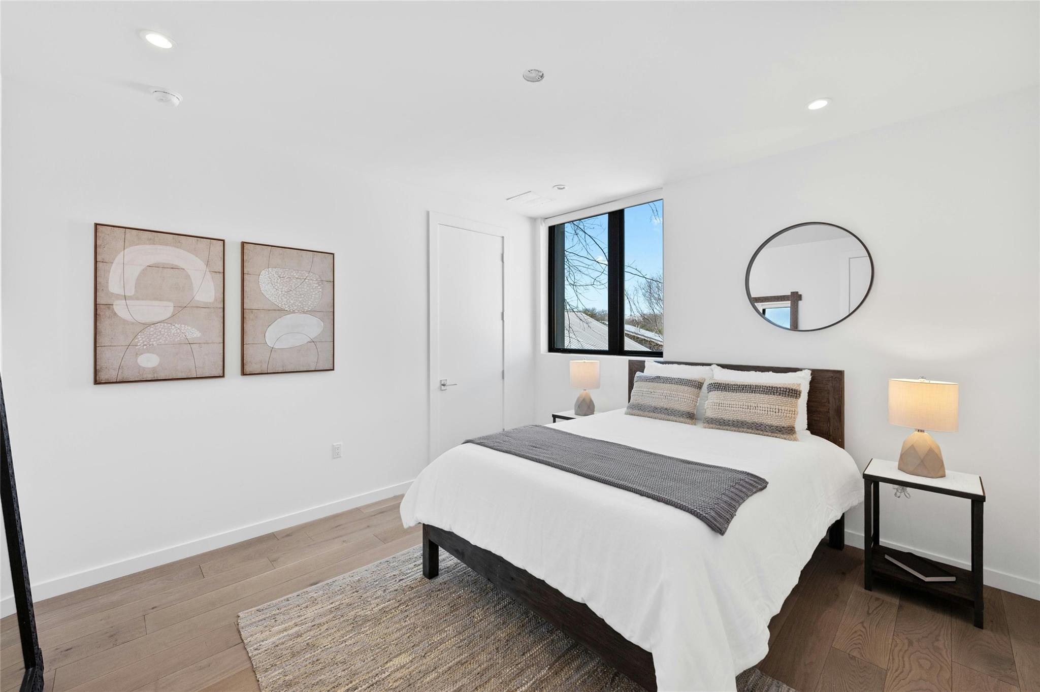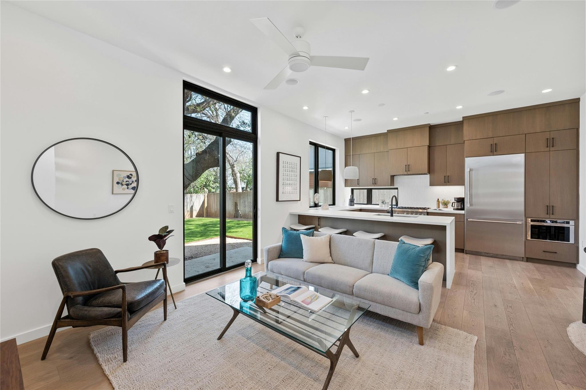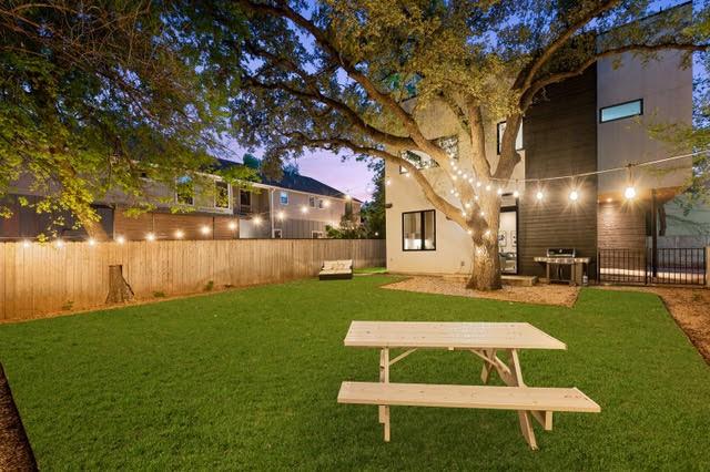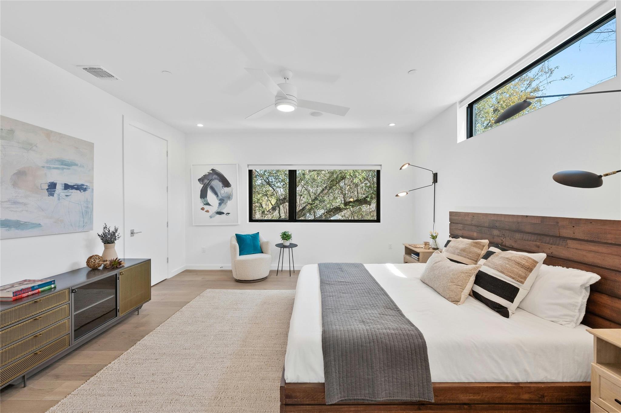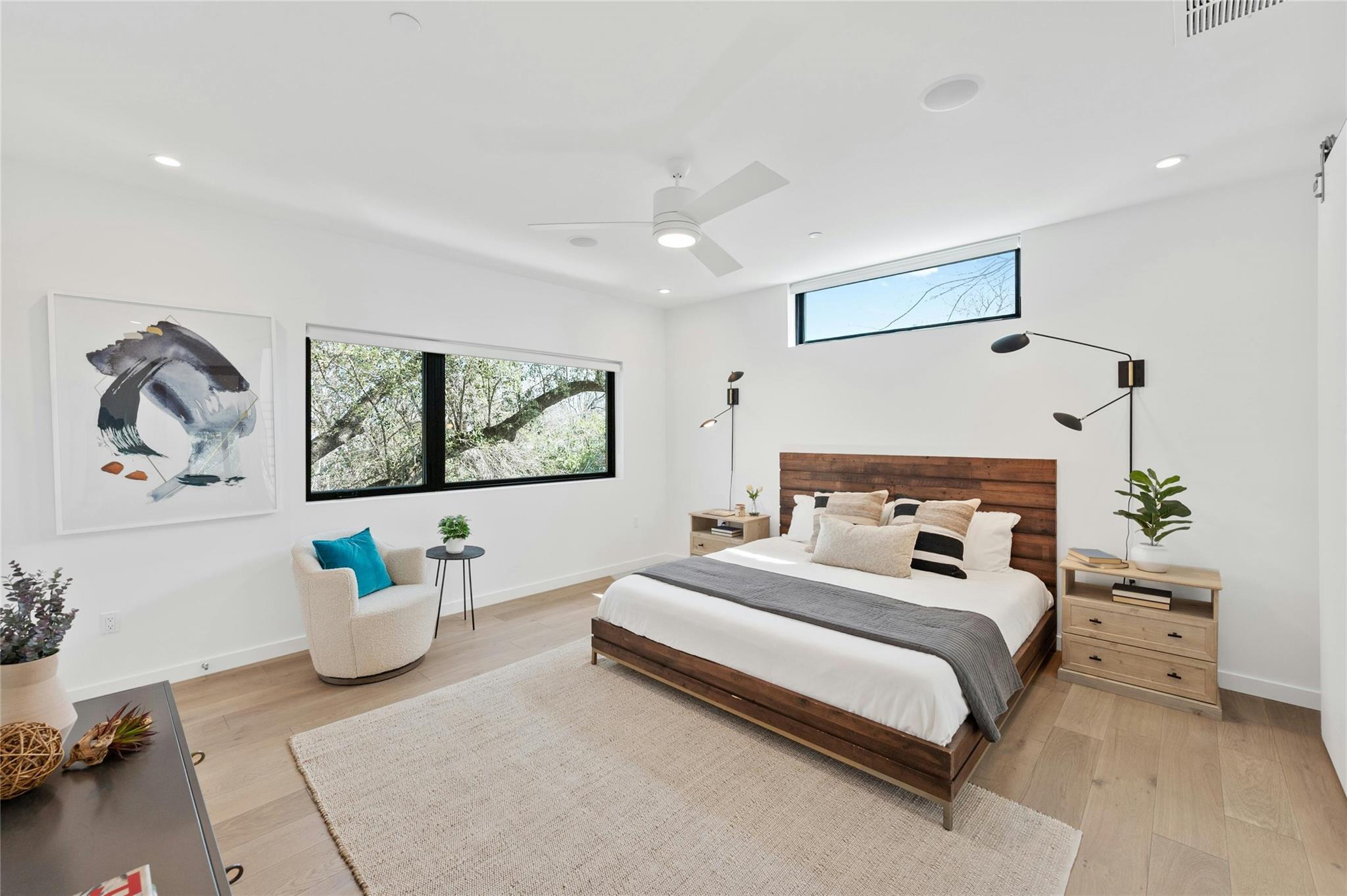 Stunning modern home located in the highly desirable Travis Heights neighborhood. This private, gated property features luxurious finishes, abundant natural light, and breathtaking downtown views from the rooftop deck. The spacious bedrooms all have their own en-suite bathrooms, and there is a versatile flex space perfect for an office, gym, media room or playroom. The primary bathroom includes a shower and freestanding tub. Throughout the home, you'll find wide plank oak floors, walnut cabinetry, and top-of-the-line Thermador appliances. The kitchen and guest bath feature beautiful marble countertops. Faced with Authentic Japanese "Shou Sugi Ban" siding and stucco. The property also includes a 2-car garage, the largest yard in the community, and is elevator ready. The professionally landscaped backyard includes premium turf. Just a 5-minute walk to Hotel St Cecila, Music Lane and South Congress Avenue, Enjoy shops like By George, Allen’s Boots, Stag Provisions and Hermes while dining at Aba, Gueros, Vespaio and Homeslice which are only steps away. Travis Heights own Stacy Park is right around the corner. HOA fee is $300 annually. COMPLEX ALLOWS STRs.