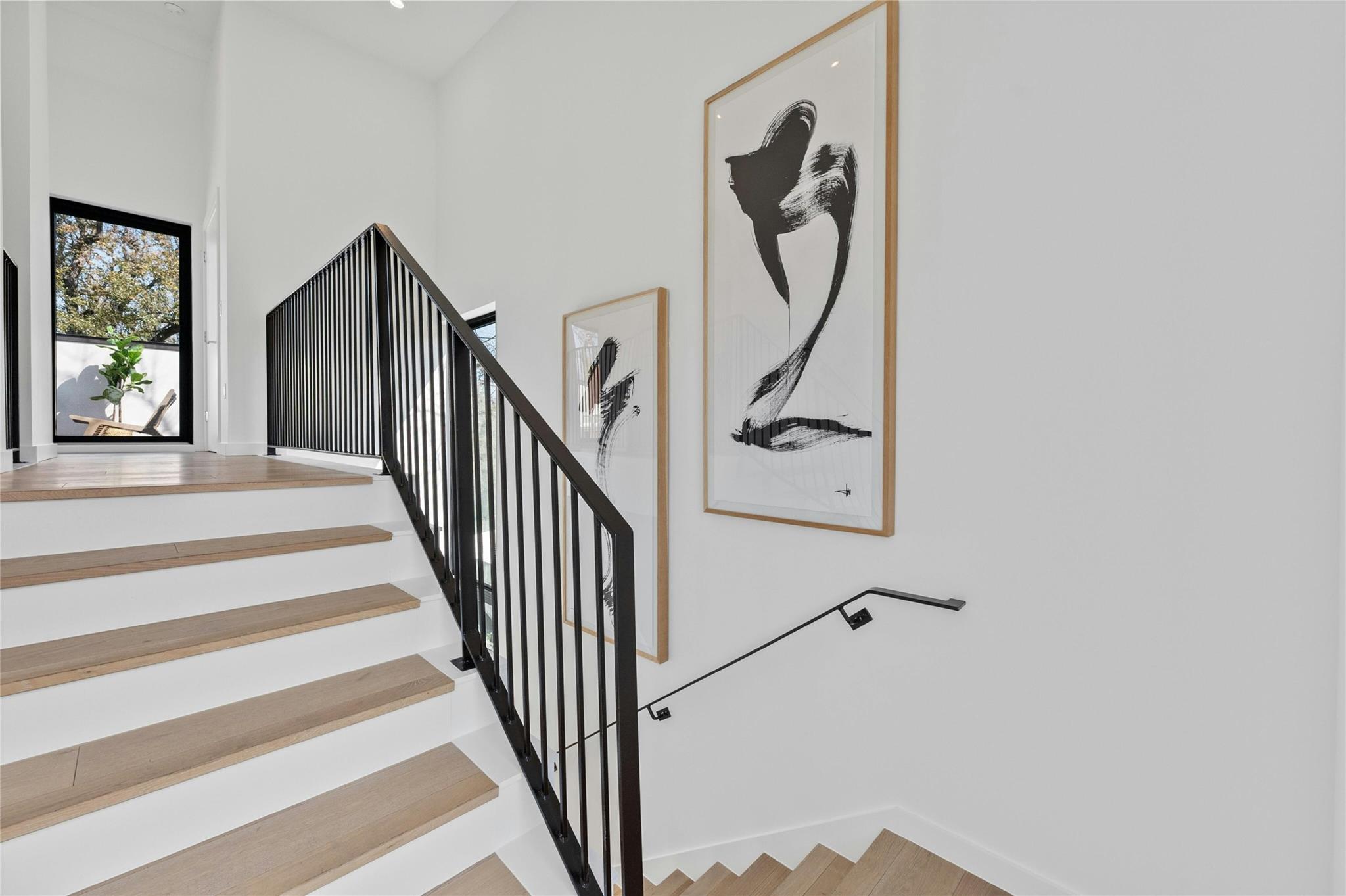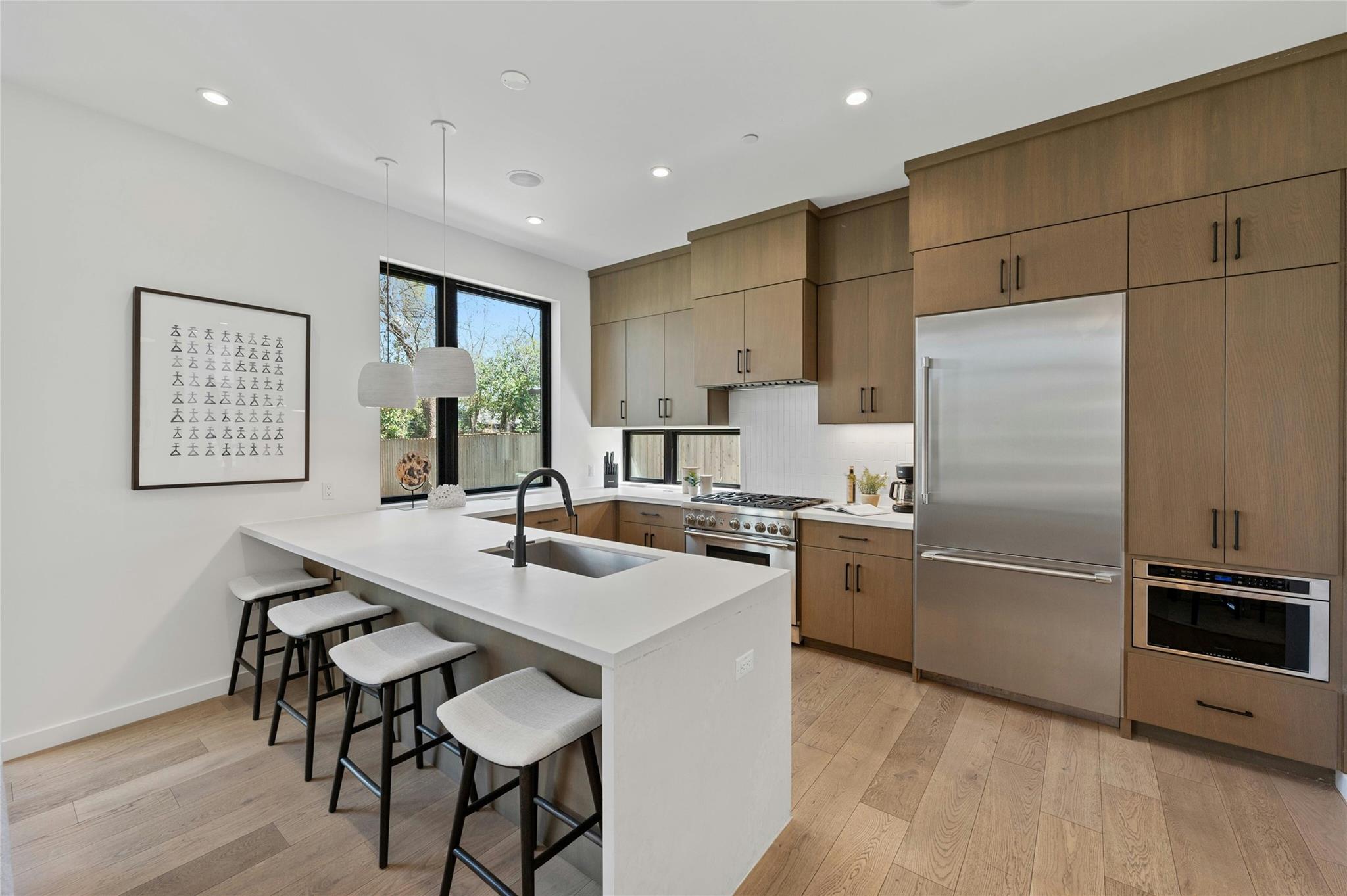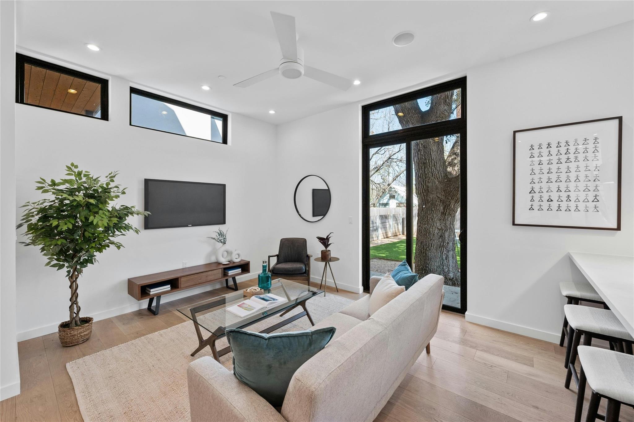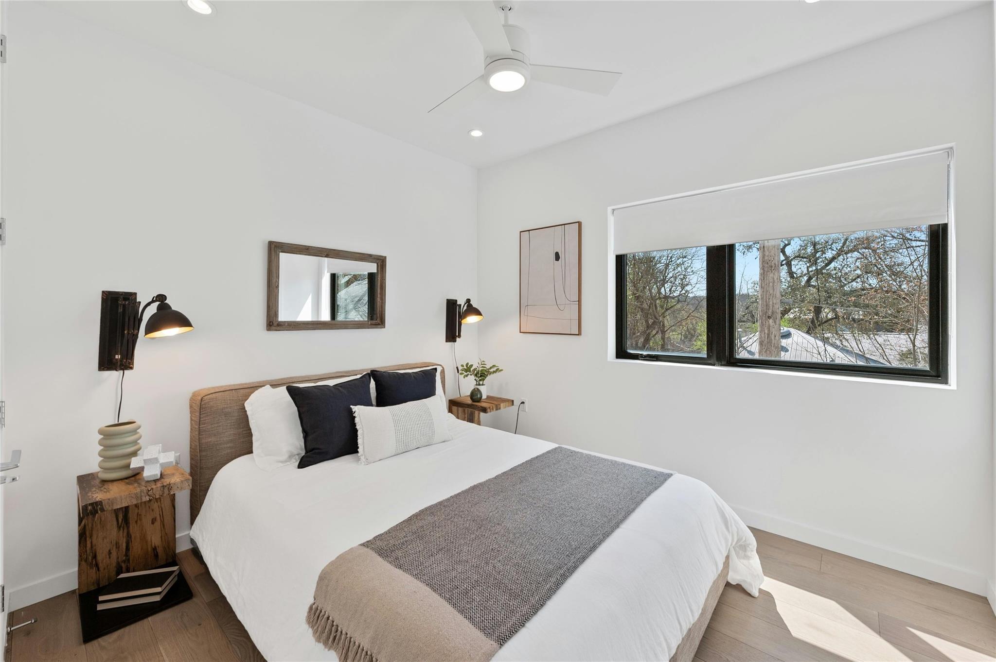 Stunning modern home located in the highly desirable Travis Heights neighborhood. This private, gated property features luxurious finishes, abundant natural light, and breathtaking downtown views from the rooftop deck. The spacious bedrooms all have their own en-suite bathrooms, and there is a versatile flex space perfect for an office, gym, media room or playroom. The primary bathroom includes a shower and freestanding tub. Throughout the home, you'll find wide plank oak floors, walnut cabinetry, and top-of-the-line Thermador appliances. The kitchen and guest bath feature beautiful marble countertops. Faced with Authentic Japanese "Shou Sugi Ban" siding and stucco. The property also includes a 2-car garage, the largest yard in the community, and is elevator ready. The professionally landscaped backyard includes premium turf. Just a 5-minute walk to Hotel St Cecila, Music Lane and South Congress Avenue, Enjoy shops like By George, Allen’s Boots, Stag Provisions and Hermes while dining at Aba, Gueros, Vespaio and Homeslice which are only steps away. Travis Heights own Stacy Park is right around the corner. HOA fee is $300 annually. COMPLEX ALLOWS STRs.