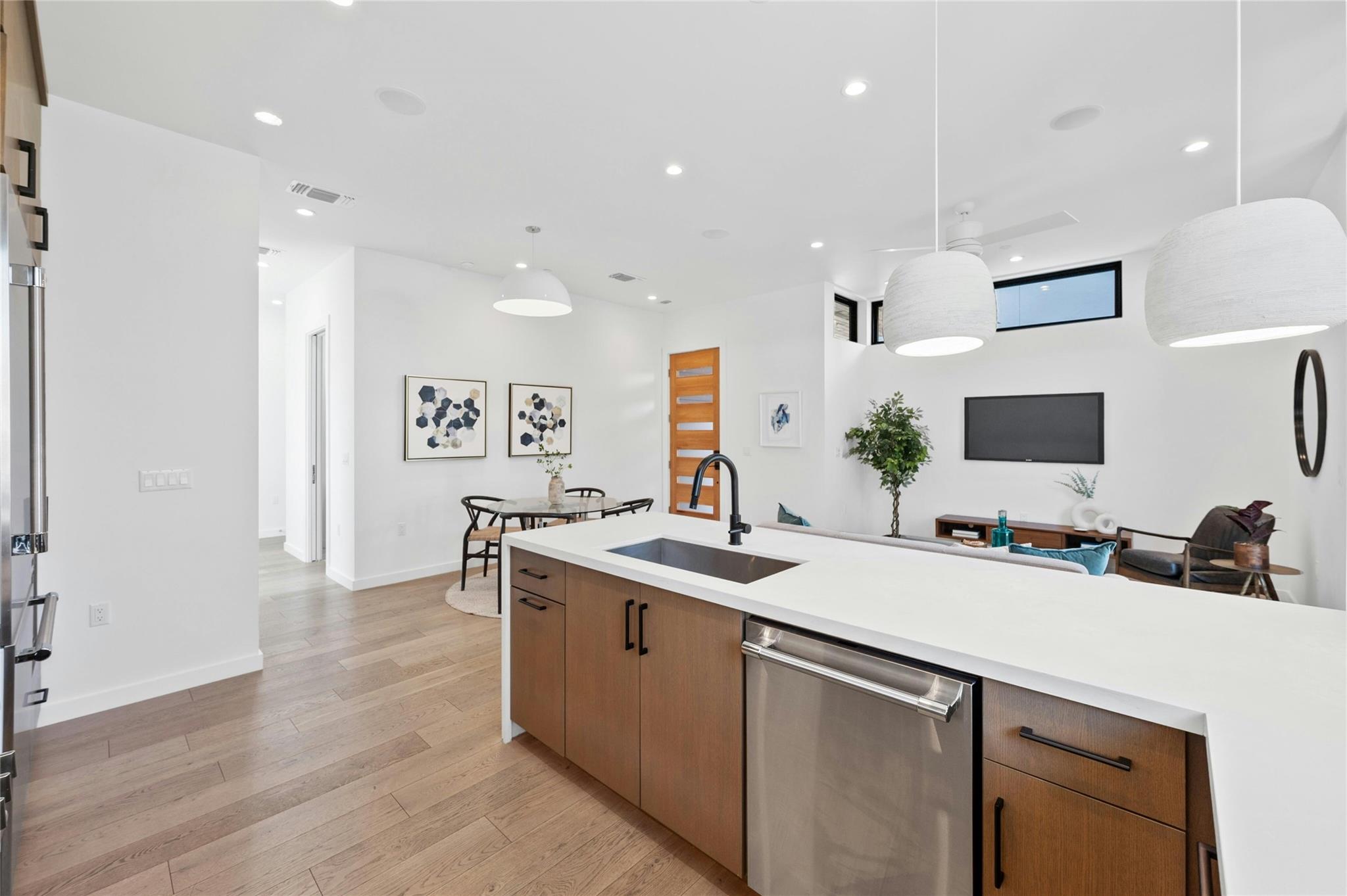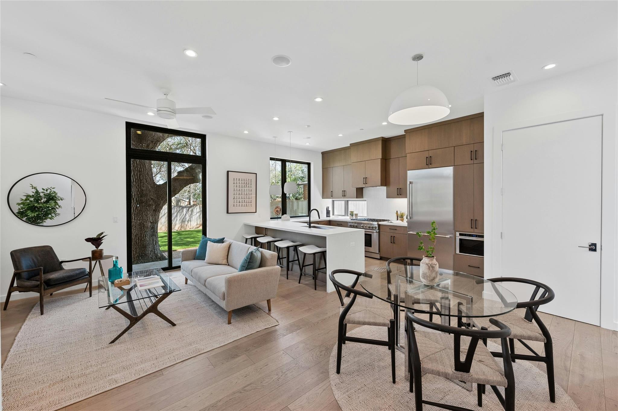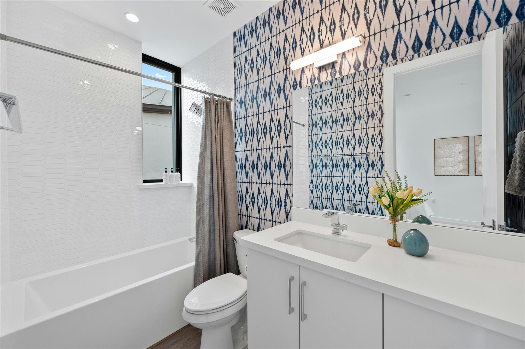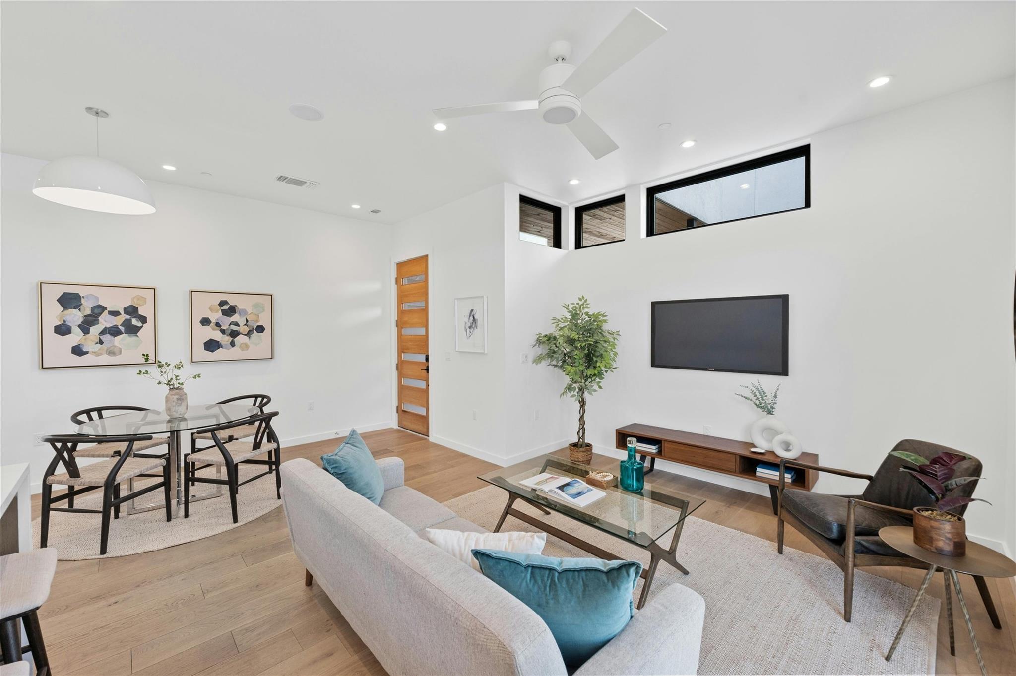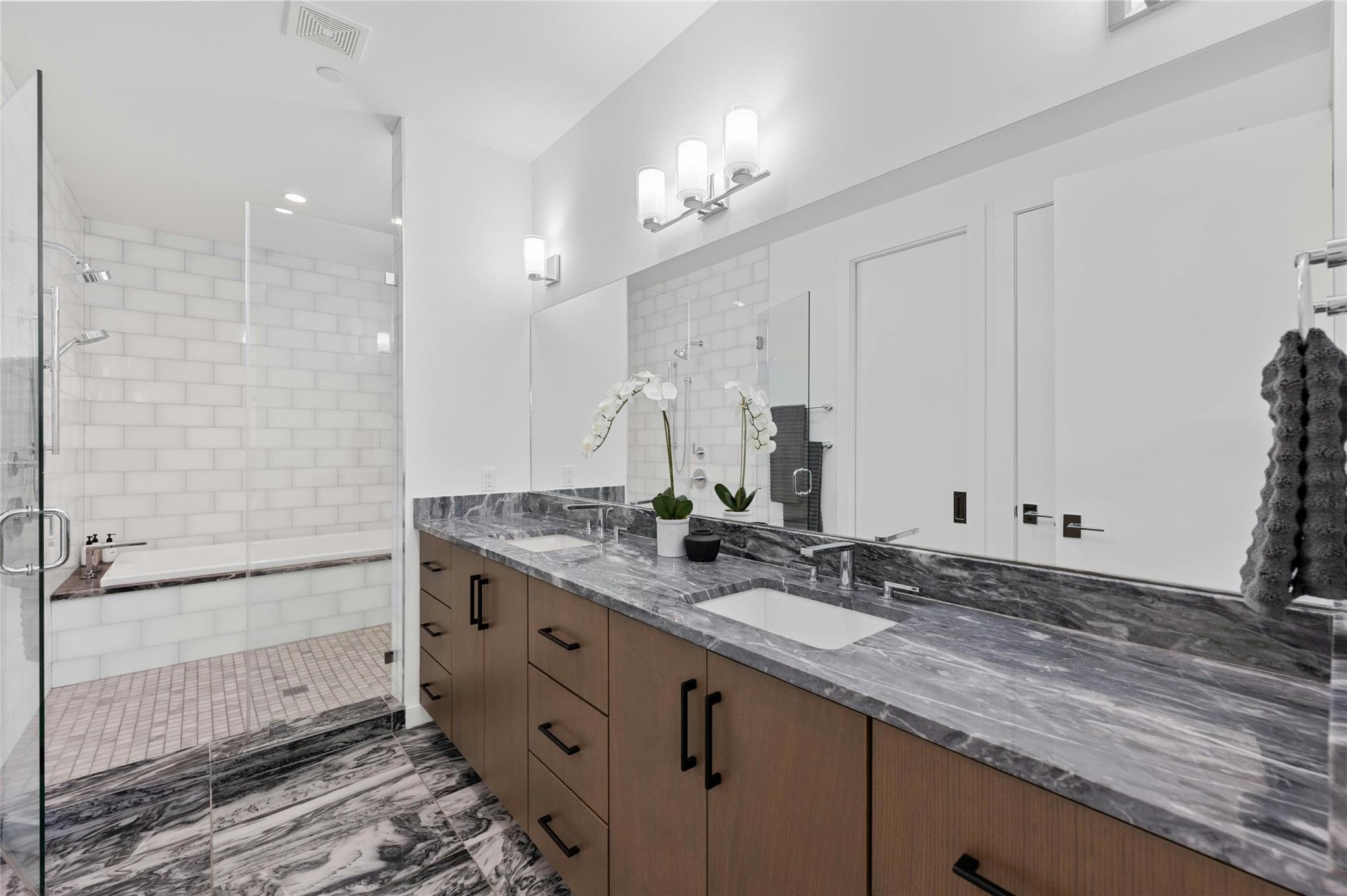 Stunning modern home located in the highly desirable Travis Heights neighborhood. This private, gated property features luxurious finishes, abundant natural light, and breathtaking downtown views from the rooftop deck. The spacious bedrooms all have their own en-suite bathrooms, and there is a versatile flex space perfect for an office, gym, media room or playroom. The primary bathroom includes a shower and freestanding tub. Throughout the home, you'll find wide plank oak floors, walnut cabinetry, and top-of-the-line Thermador appliances. The kitchen and guest bath feature beautiful marble countertops. Faced with Authentic Japanese "Shou Sugi Ban" siding and stucco. The property also includes a 2-car garage, the largest yard in the community, and is elevator ready. The professionally landscaped backyard includes premium turf. Just a 5-minute walk to Hotel St Cecila, Music Lane and South Congress Avenue, Enjoy shops like By George, Allen’s Boots, Stag Provisions and Hermes while dining at Aba, Gueros, Vespaio and Homeslice which are only steps away. Travis Heights own Stacy Park is right around the corner. HOA fee is $300 annually. COMPLEX ALLOWS STRs.
