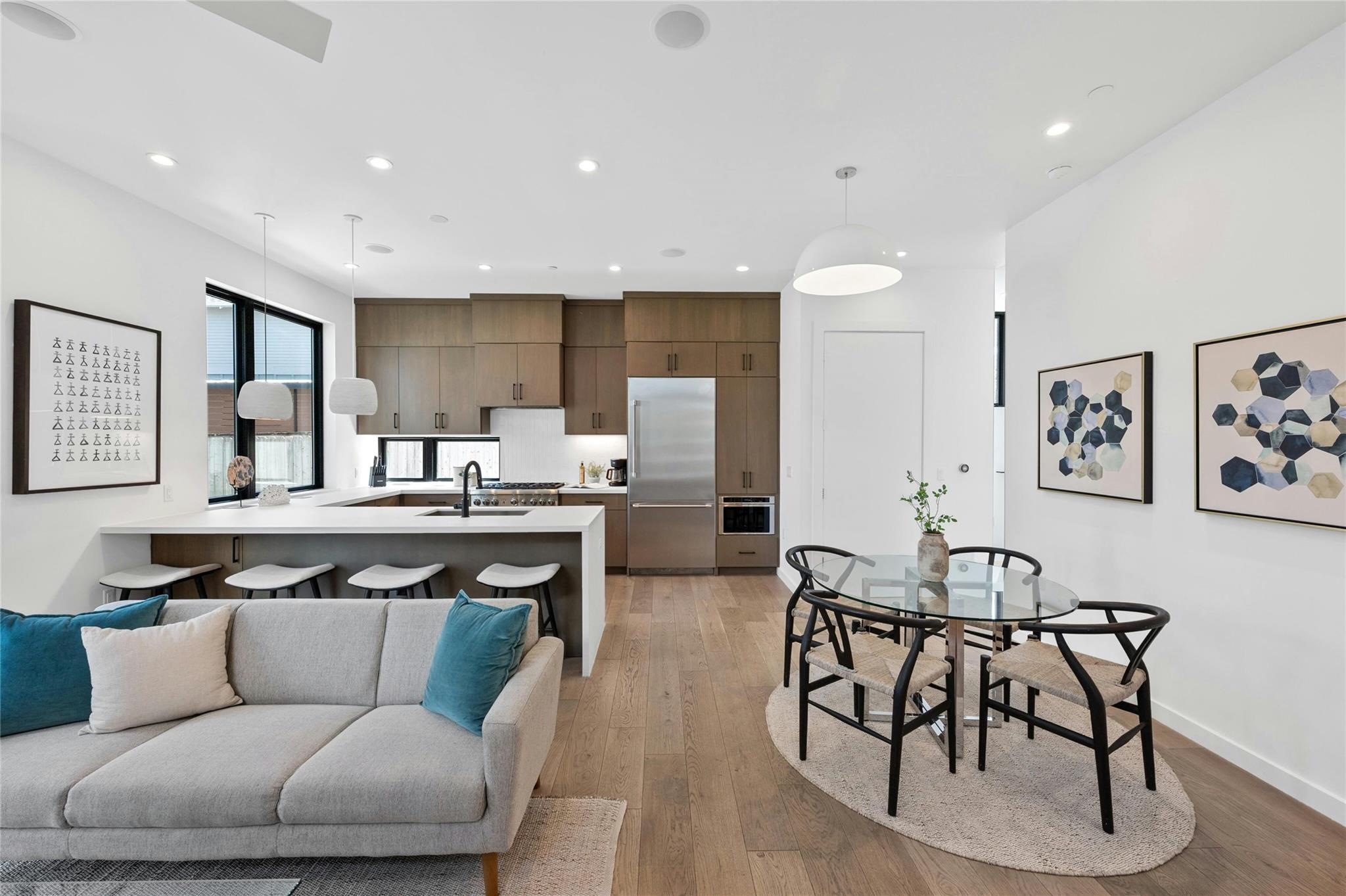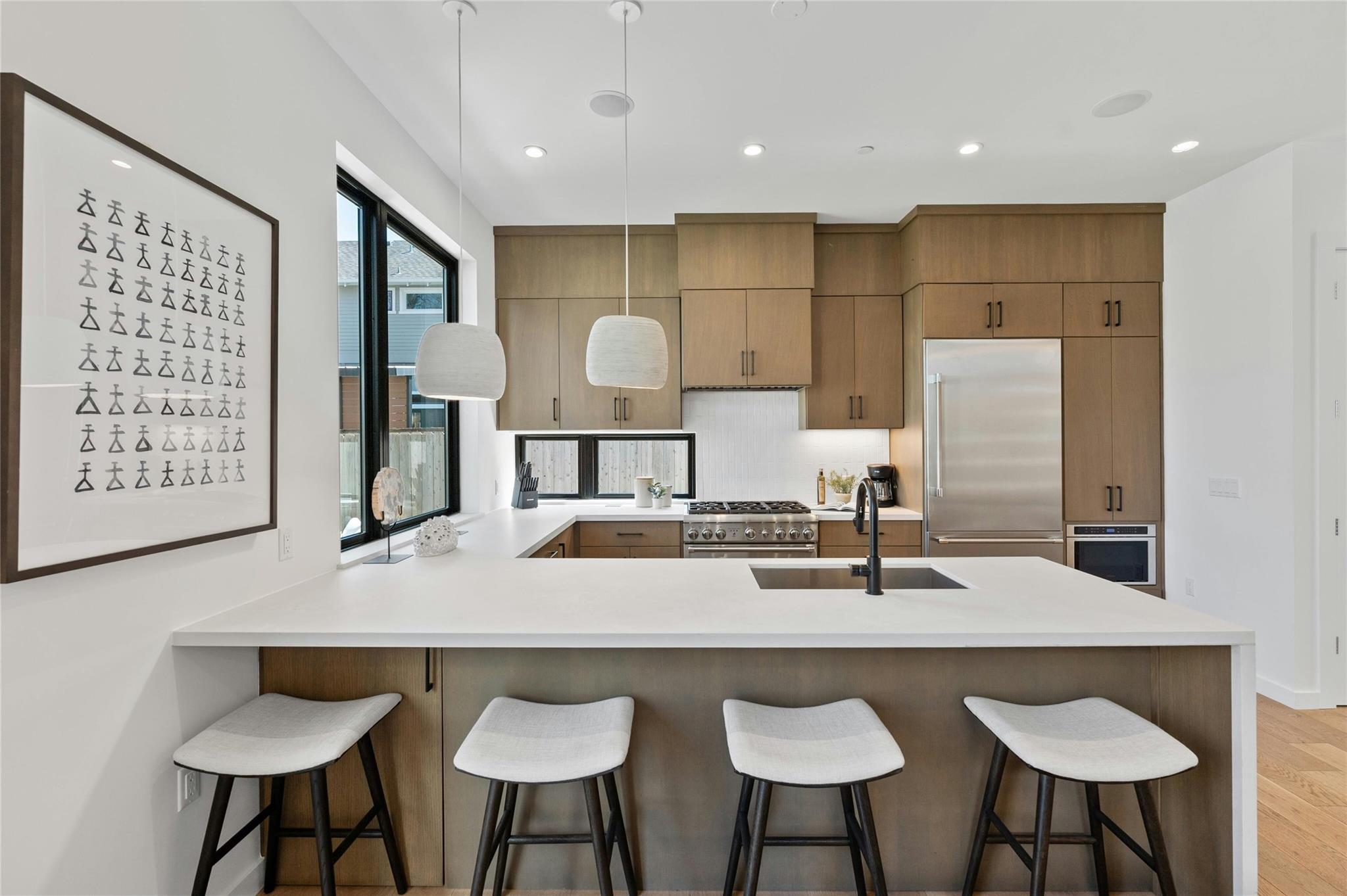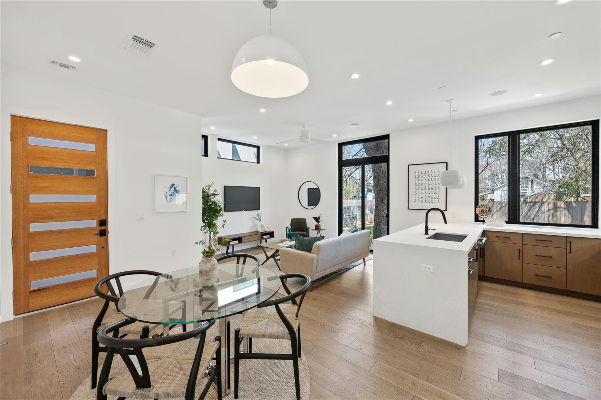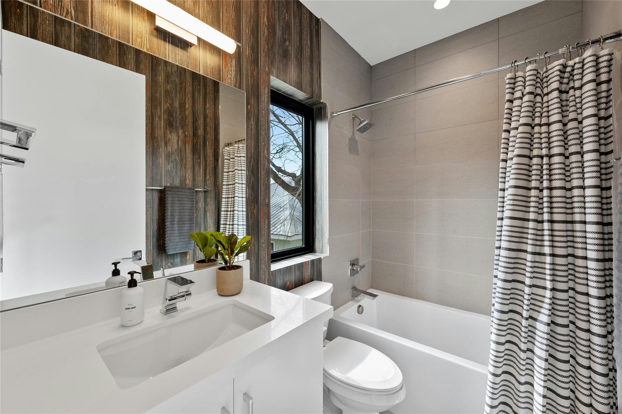Stunning modern home located in the highly desirable Travis Heights neighborhood. This private, gated property features luxurious finishes, abundant natural light, and breathtaking downtown views from the rooftop deck. The spacious bedrooms all have their own en-suite bathrooms, and there is a versatile flex space perfect for an office, gym, media room or playroom. The primary bathroom includes a shower and freestanding tub. Throughout the home, you'll find wide plank oak floors, walnut cabinetry, and top-of-the-line Thermador appliances. The kitchen and guest bath feature beautiful marble countertops. Faced with Authentic Japanese "Shou Sugi Ban" siding and stucco. The property also includes a 2-car garage, the largest yard in the community, and is elevator ready. The professionally landscaped backyard includes premium turf. Just a 5-minute walk to Hotel St Cecila, Music Lane and South Congress Avenue, Enjoy shops like By George, Allen’s Boots, Stag Provisions and Hermes while dining at Aba, Gueros, Vespaio and Homeslice which are only steps away. Travis Heights own Stacy Park is right around the corner. HOA fee is $300 annually. COMPLEX ALLOWS STRs.