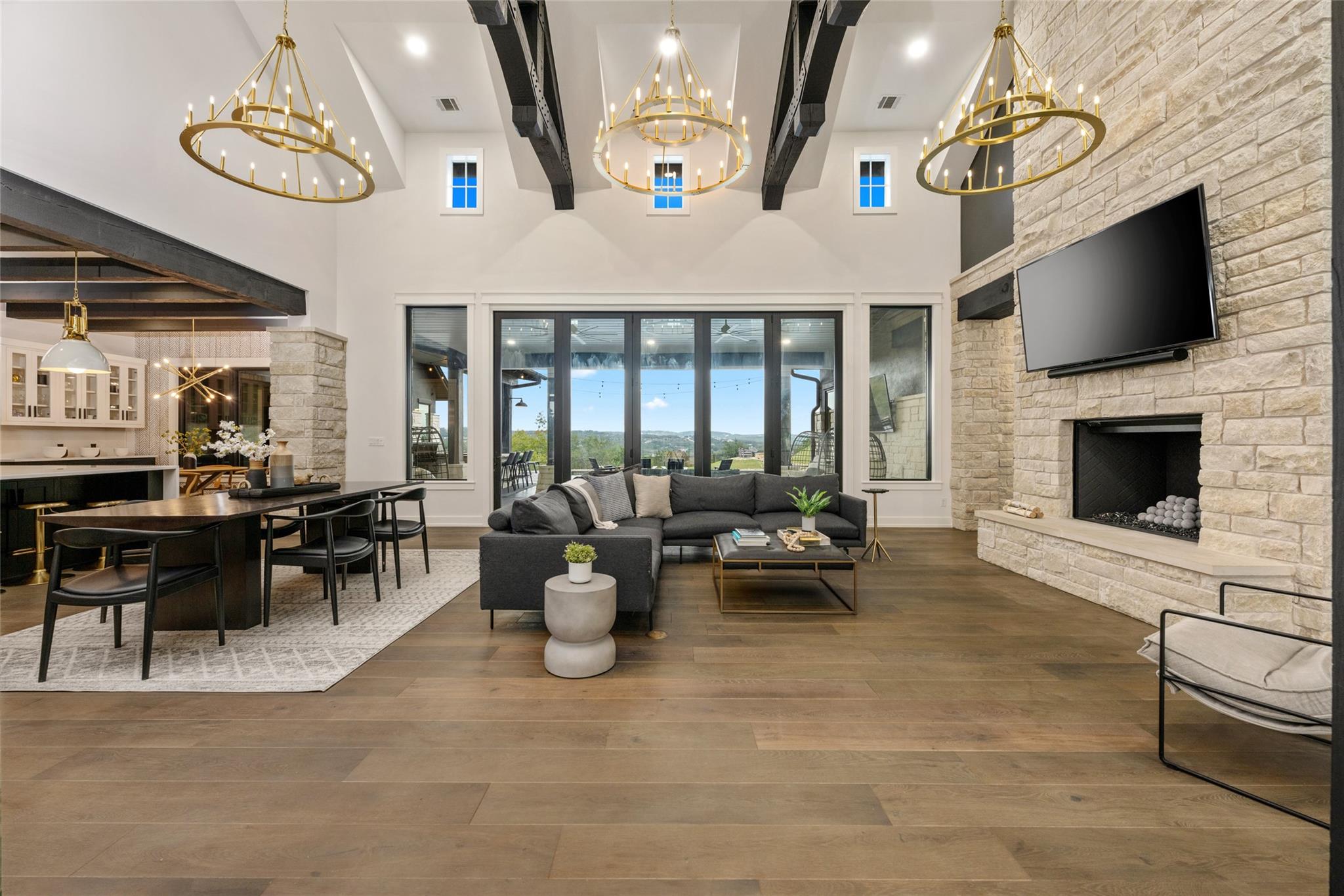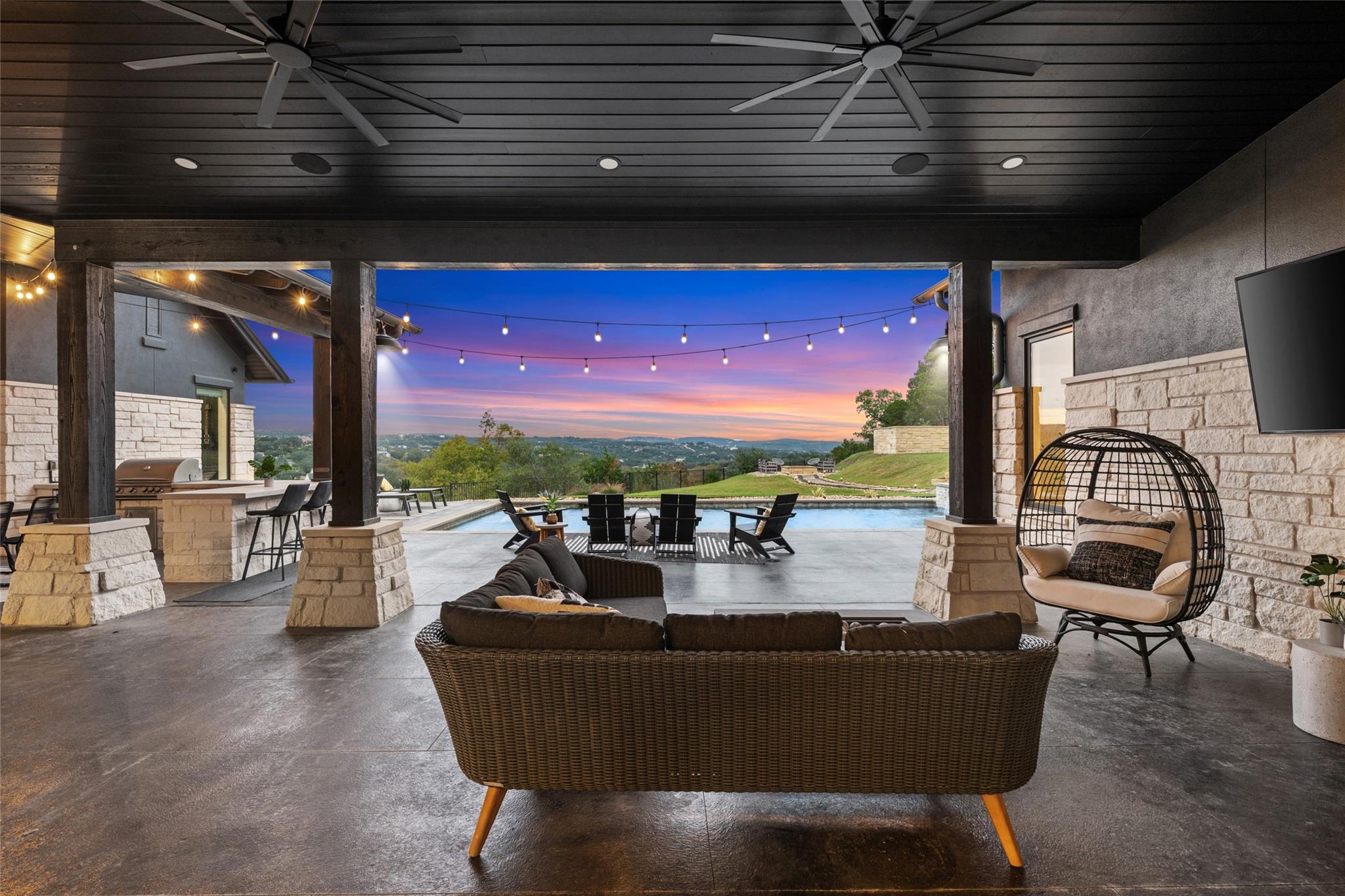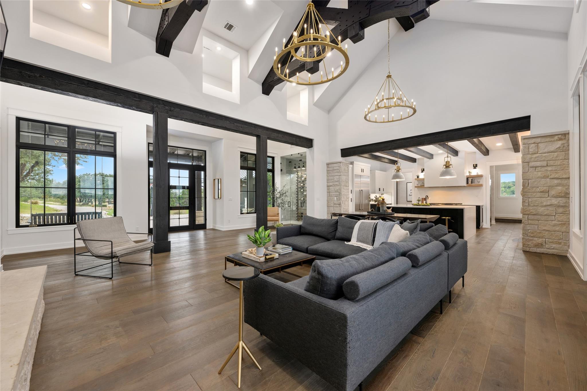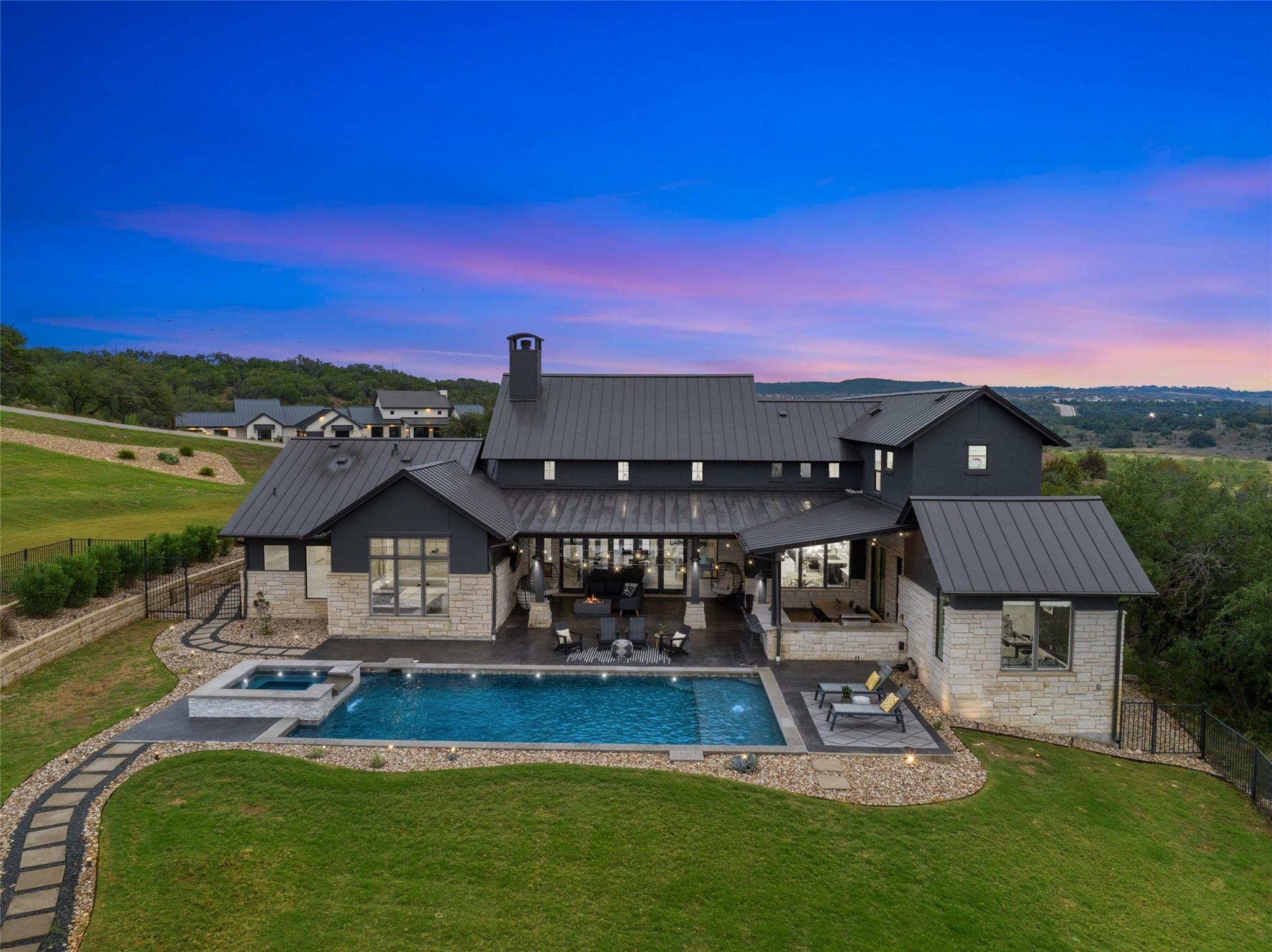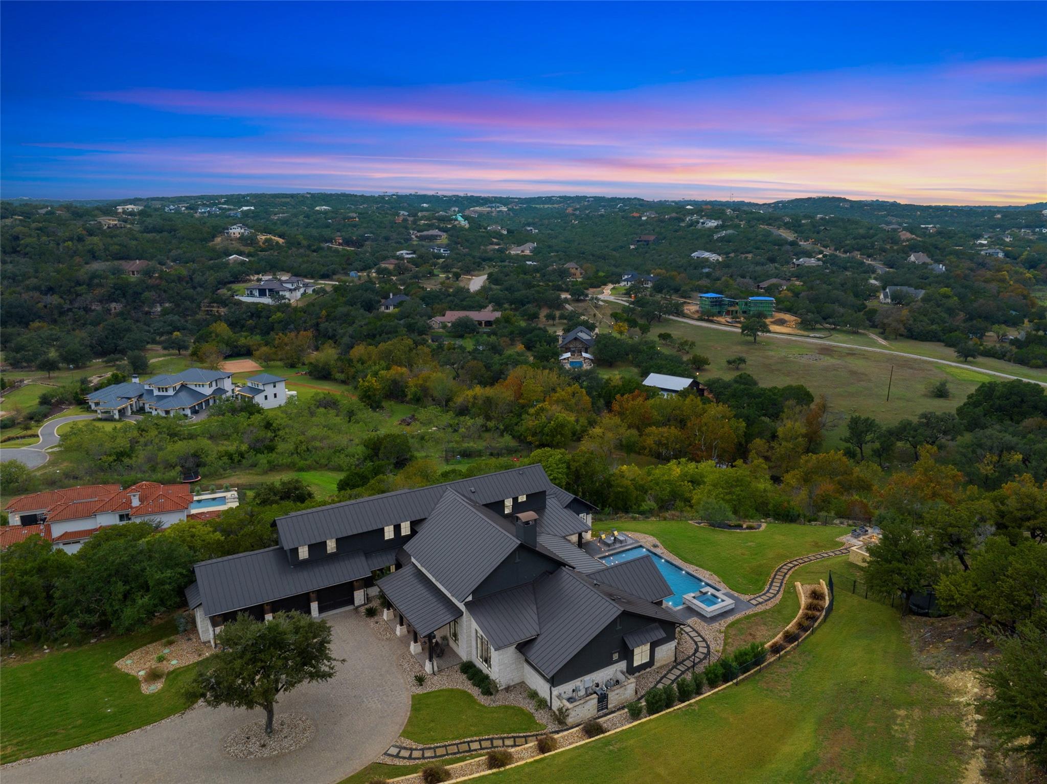 Welcome to a luxurious oasis that redefines upscale living. Situated in the prestigious gated community of Bee Creek Estates in Spicewood, Texas, this extraordinary, remodeled estate occupies a sprawling 3-acre home site with stunning 10-mile panoramic views. With meticulous attention to detail and impeccable craftsmanship, this home offers unparalleled elegance and sophistication. Step inside and be captivated by the grandeur of the cathedral ceiling great room, seamlessly connected to a spacious gourmet kitchen. French white hardwood flooring exudes timeless beauty, complemented by dazzling quartz countertops and a suite of professional-grade stainless steel appliances. The adjacent butler's pantry adds convenience, catering to your culinary desires. Discover bespoke elegance with custom wall treatments and exquisite light fixtures that effortlessly elevate every room's aesthetic. The oversized owner's suite is a masterpiece, offering an unparalleled escape. Pamper yourself in the sumptuous spa bath, featuring an oversized body jetted shower and freestanding bathtub, for the perfect haven of relaxation. This remarkable residence boasts a flexible floor plan, accommodating your ever-changing needs. Embrace joy and entertainment in the downstairs games area, seamlessly connected to the inviting pool, offering a seamless indoor-outdoor lifestyle. For work, retreat to the peaceful sanctuary of the separate office(s), allowing you to balance productivity and tranquility. Upstairs, find two additional en-suite bedrooms adorned with exquisite finishes, accompanied by a living area for unwinding or quality time with loved ones. Step outside into the oversized covered outdoor living area, complete with a built-in kitchen for hosting gatherings while enjoying the breathtaking scenery or head out to the firepit area and marvel at the stars. Dive into the pool or surrender to the soothing embrace of the spa as you bask in the tranquility of your personal retreat.