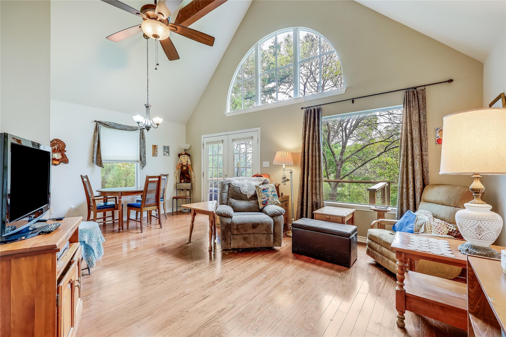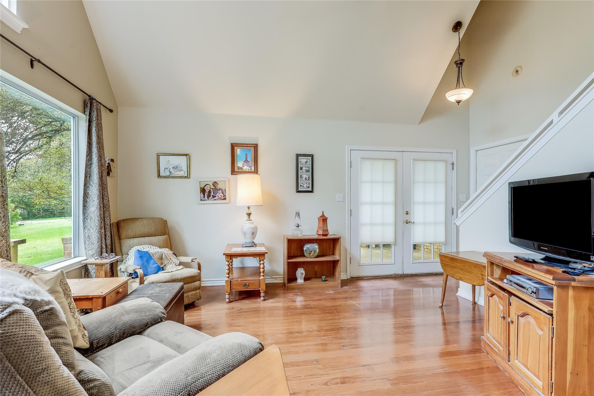 The lower floor, accessible via stairs from the main floor, through the French doors opening to the backyard, or via the large two-car garage, features additional living space with a living room, bedroom, and full bath, offering flexibility, convenience, and privacy.