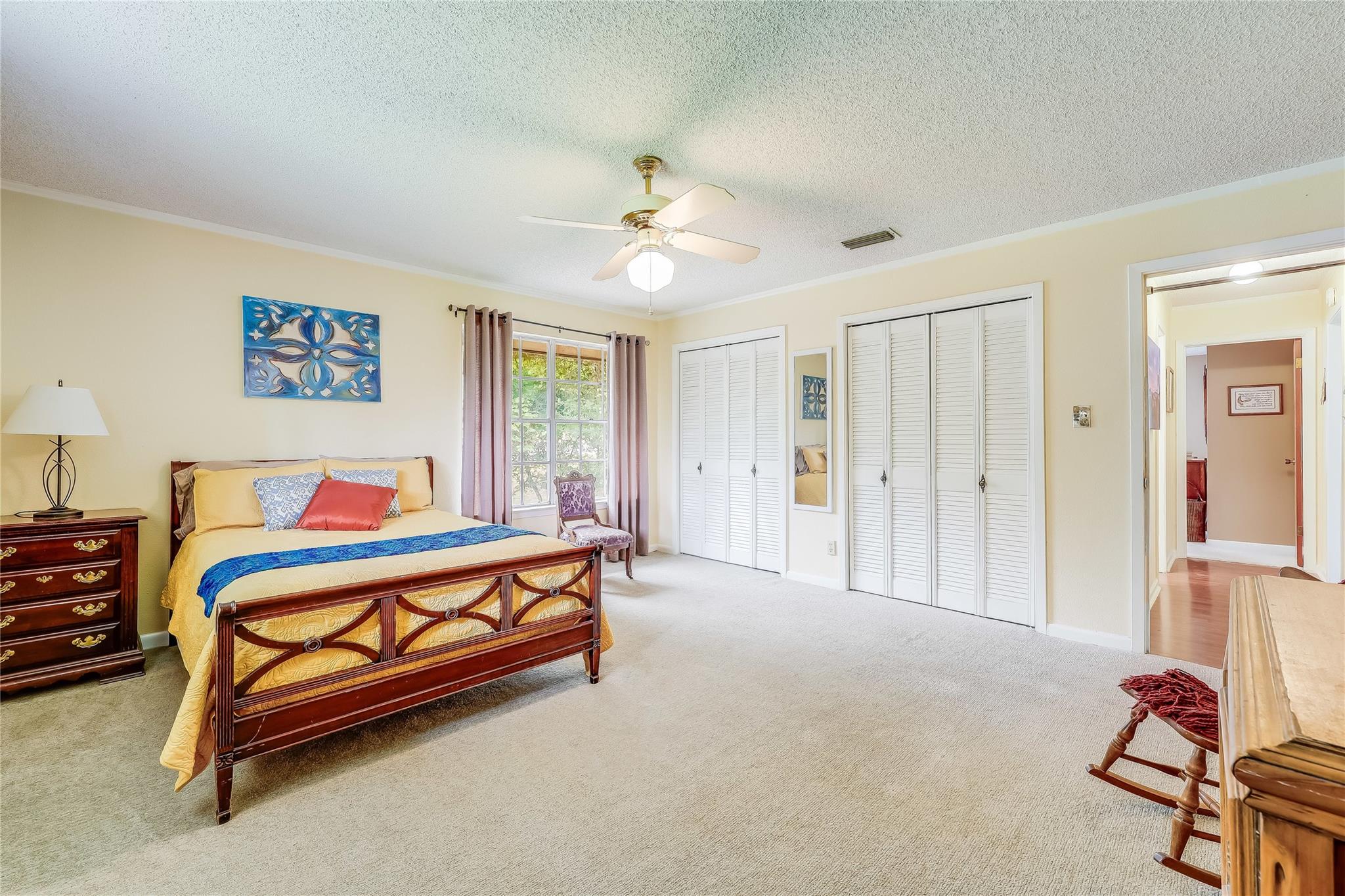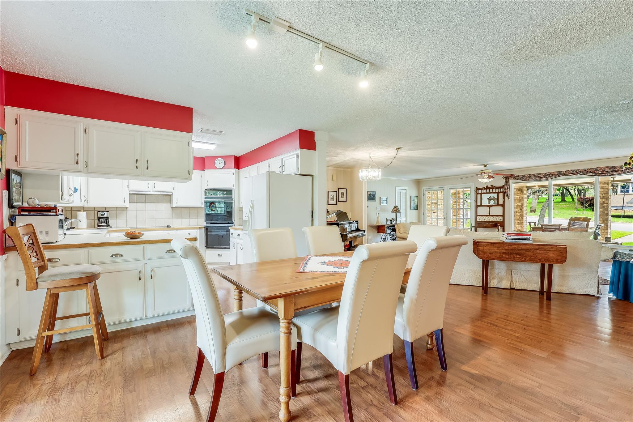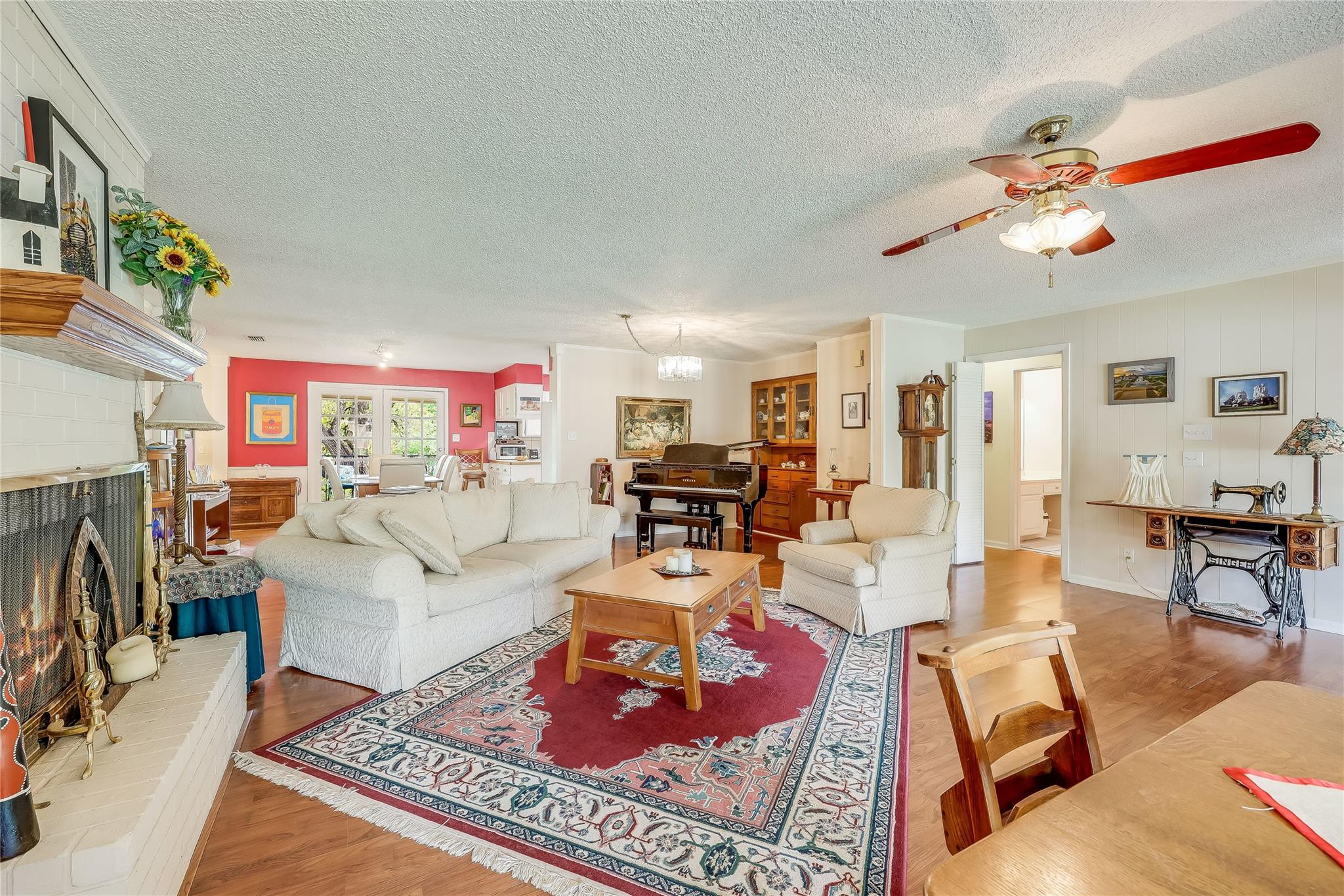 The main level of the home is designed with ease of living in mind, housing three bedrooms, two full bathrooms, an open living room with large picture windows, and French doors opening to an elevated patio overlooking the open backyard. The kitchen, featuring a breakfast bar offers a seamless flow. Enjoying your morning coffee on the covered front patio and a glass of wine or cool iced tea in the evening on the backyard patio is a perfect way to bookend the day.