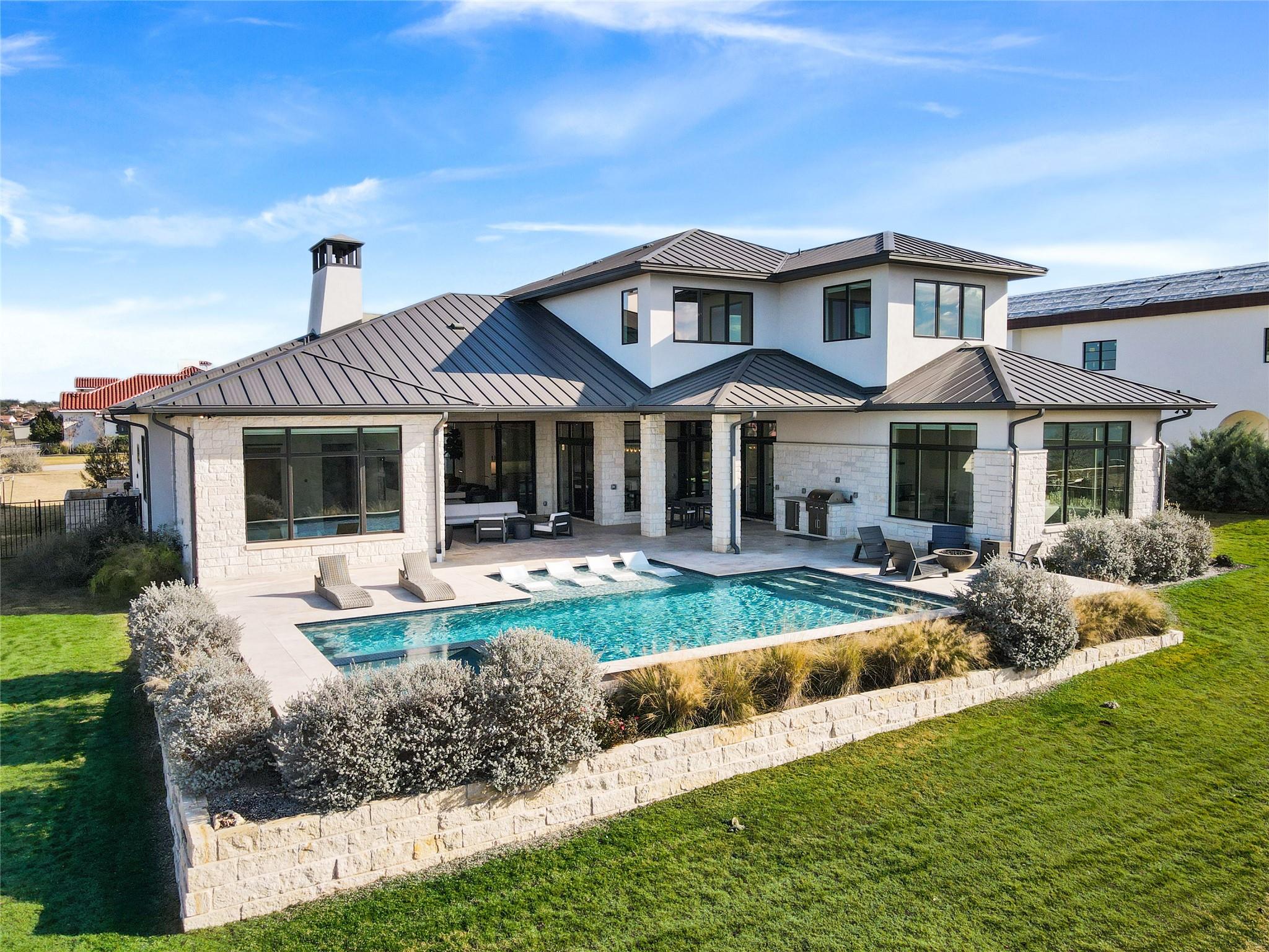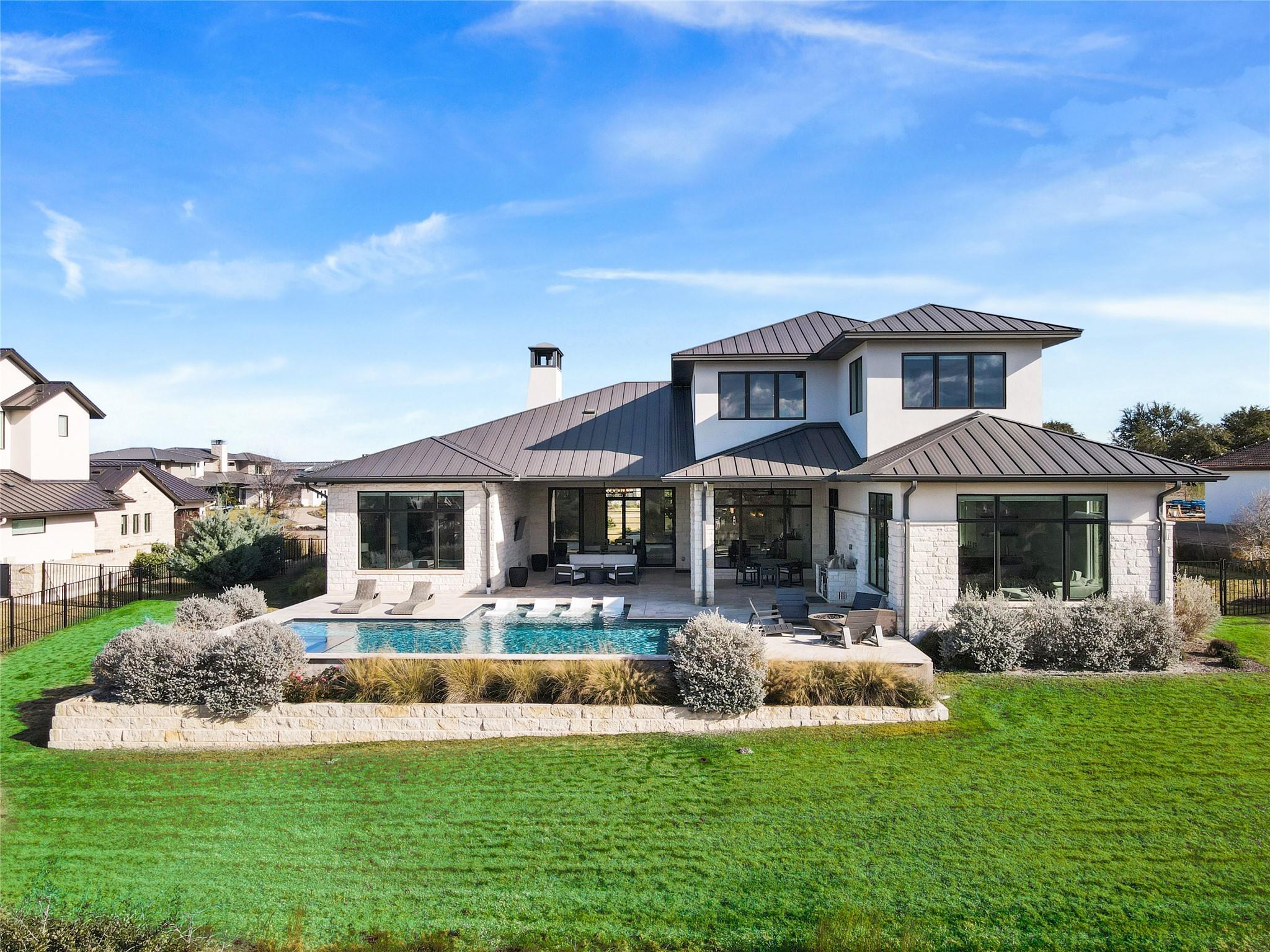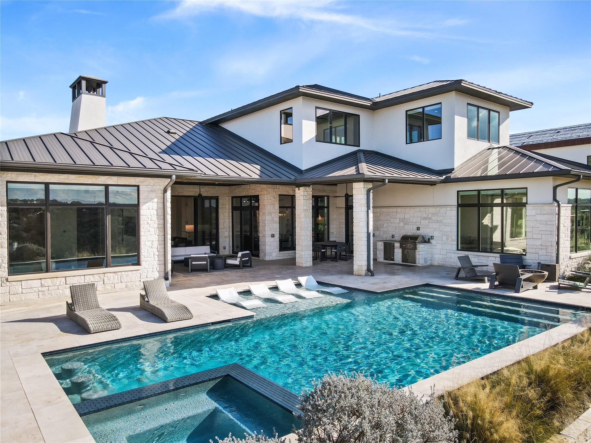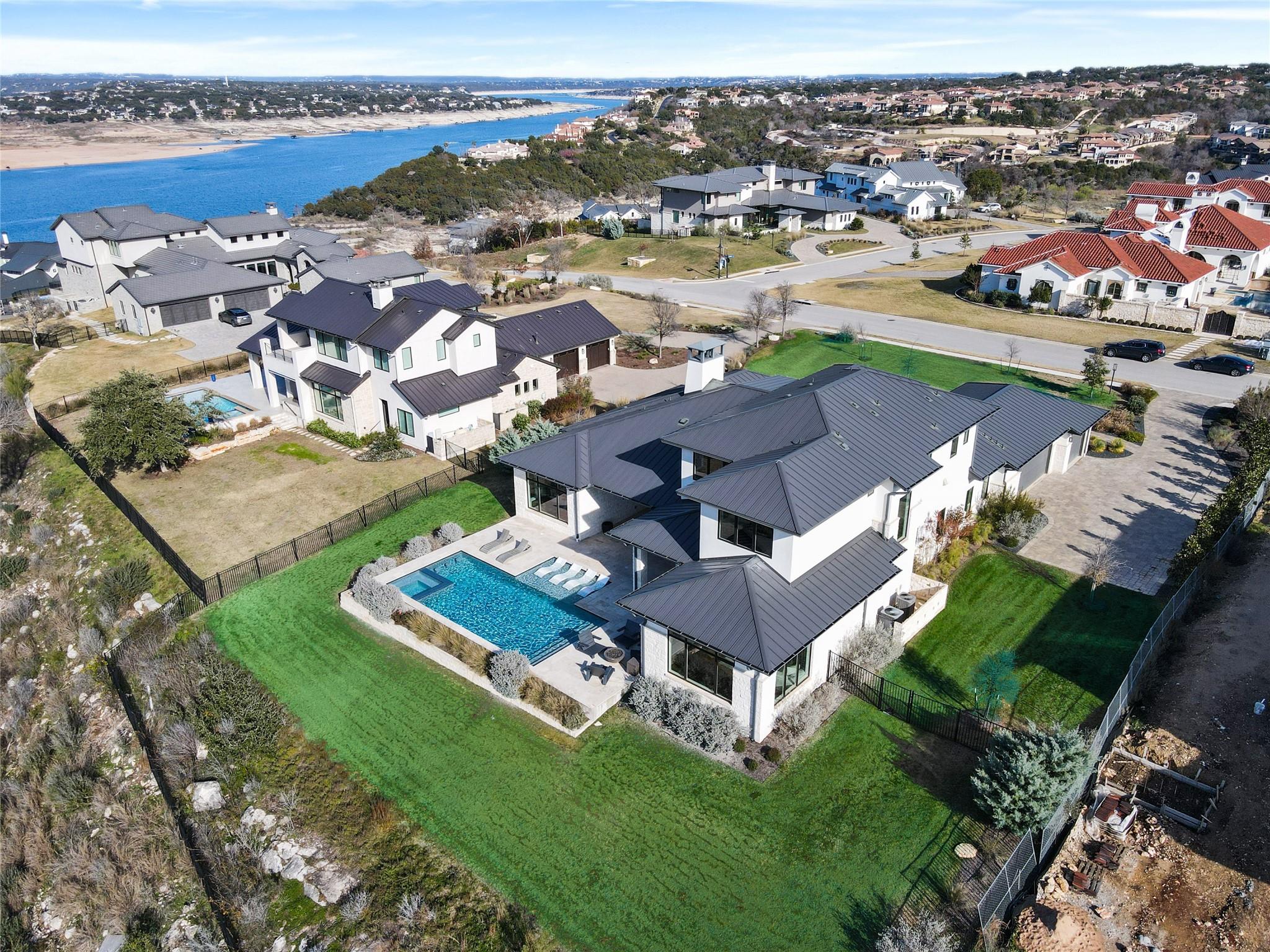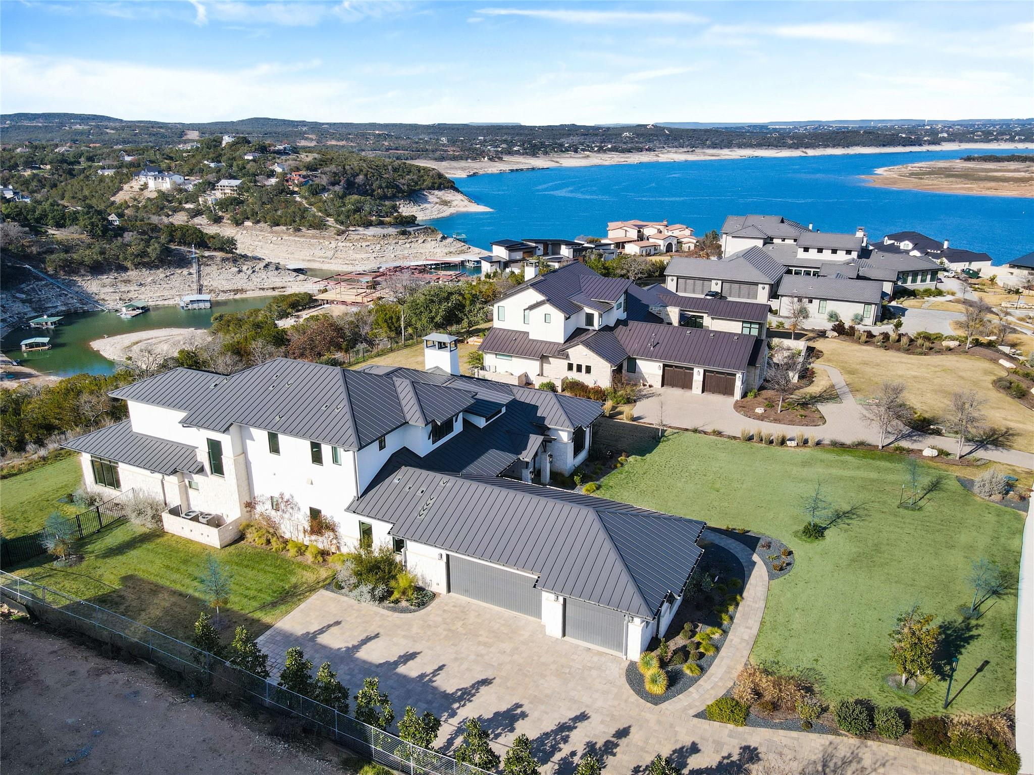 Stunning modern Lake Travis waterfront views surround this masterpiece located in The Peninsula of Rough Hollow-Lakeway. 5,378 sf, 5 beds/5.5 bathrooms (1.79AC). See the lake from almost every room, including the huge luxury Master suite! The downstairs features a supersized flex/game room w/full bar + kegerator and office. Outdoor covered living spaces and firepit area surround a resort style pool w/spa, in-water seating and bubblers. Modern finishes, designer lighting, abundant light, large format windows/glass doors, w/ tall ceilings. Wolfe 7 burner range anchors the open kitchen, framed in white quartz counters on an oversized center island. Tray lighting in ceiling and under cabinet lighting provide an elegant soft glow. 3 bedrooms up centered by a secondary living space w/more lake views. The upstairs also features a private gym w padded flooring and mirrored wall. Exquisite craftsmanship and attention to detail are hallmarks of this home built by award winning builder Arbogast Custom Homes. Designed by Geschke Group Architecture. This magnificent home can be sold entirely furnished as shown. The Peninsula is the most exclusive neighborhood in Rough Hollow, with two privacy gates with concierge, private access to a tram with community dock and observation deck. Note the beautiful, lush landscape as you meander down Peninsula Blvd. Residents will receive access to the Rough Hollow Yacht Club & Marina, 22+ miles of hike and bike trails, water-themed community center, basketball, tennis, and pickleball courts and discounts to the fabulous Canyon Grill restaurant perched over the marina. A new fitness center/gym opened recently as well. Lakeway is an active lifestyle community and golf cart friendly. LTISD schools, HEB, Starbucks, BSW Hospital, restaurants, Lakeway Market, and retail are minutes away. There are 3 marinas in Lakeway, World of Tennis, golf courses and country clubs, gyms, nature hike/bikes trails, community and dog parks, event centers, and MORE!