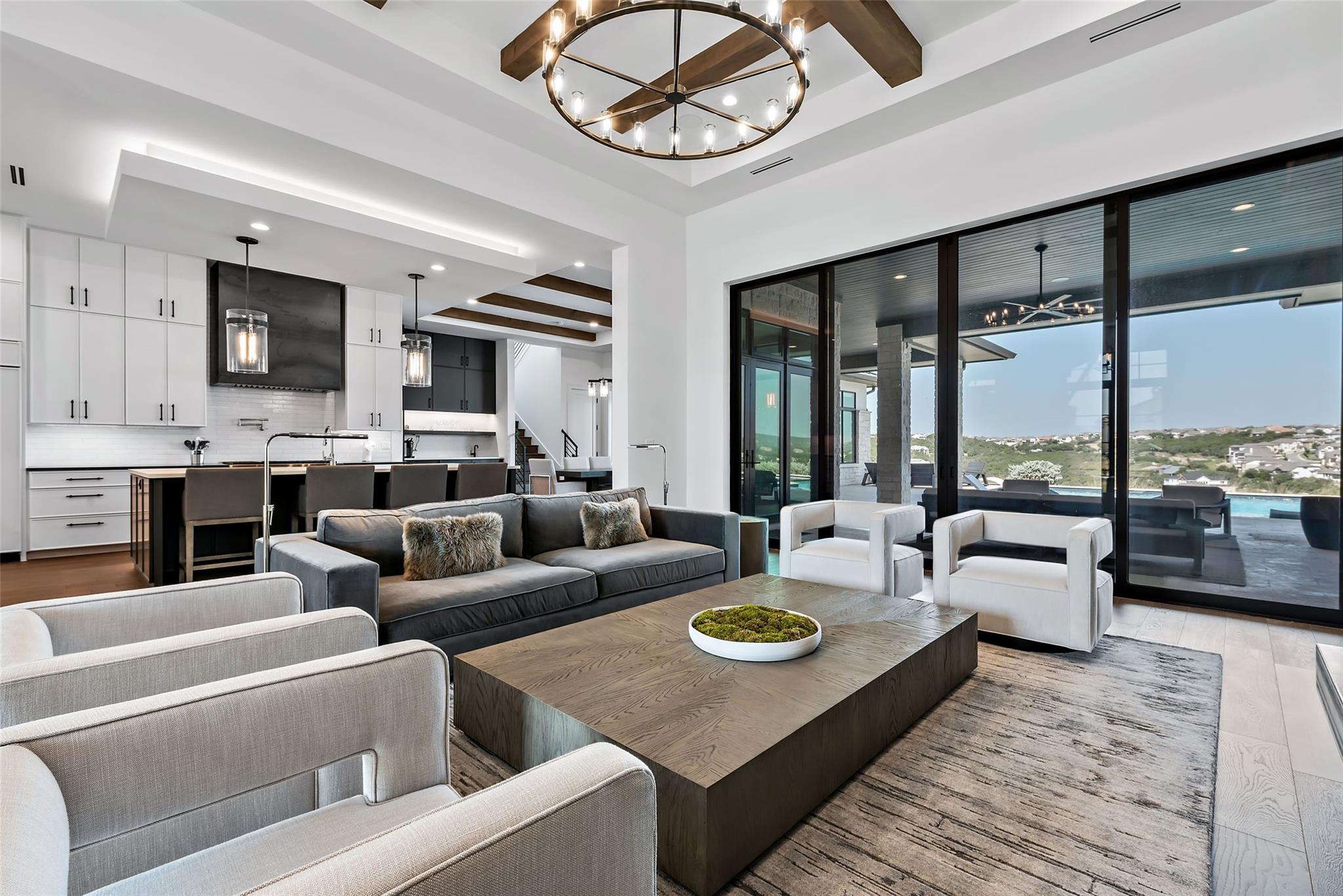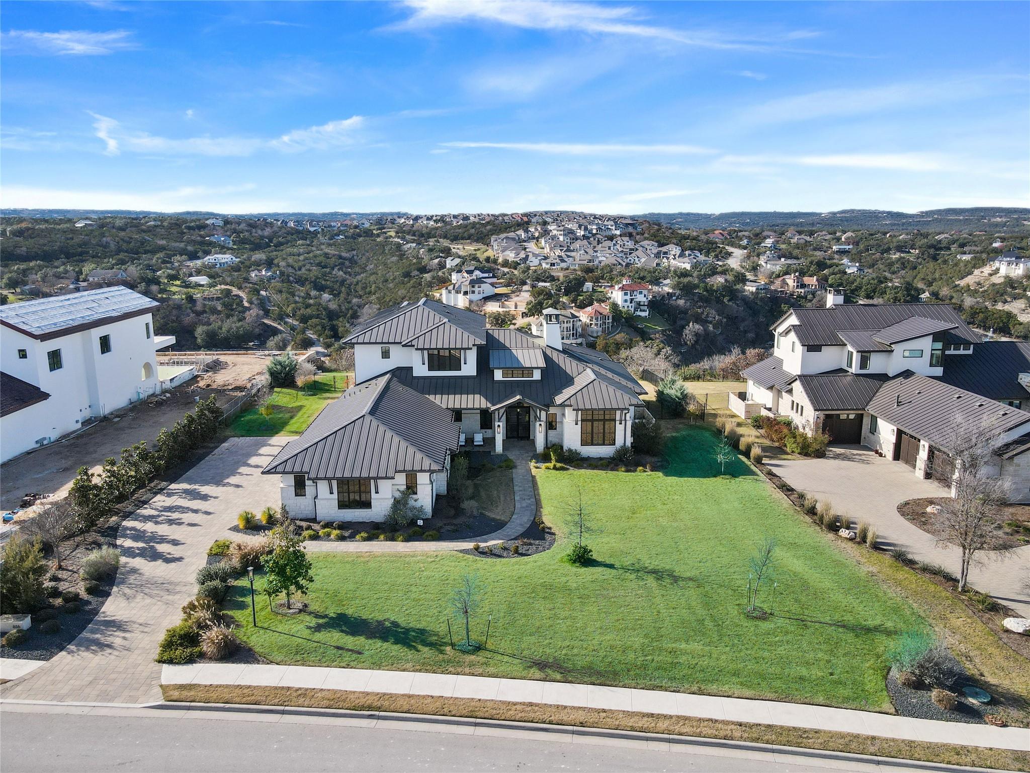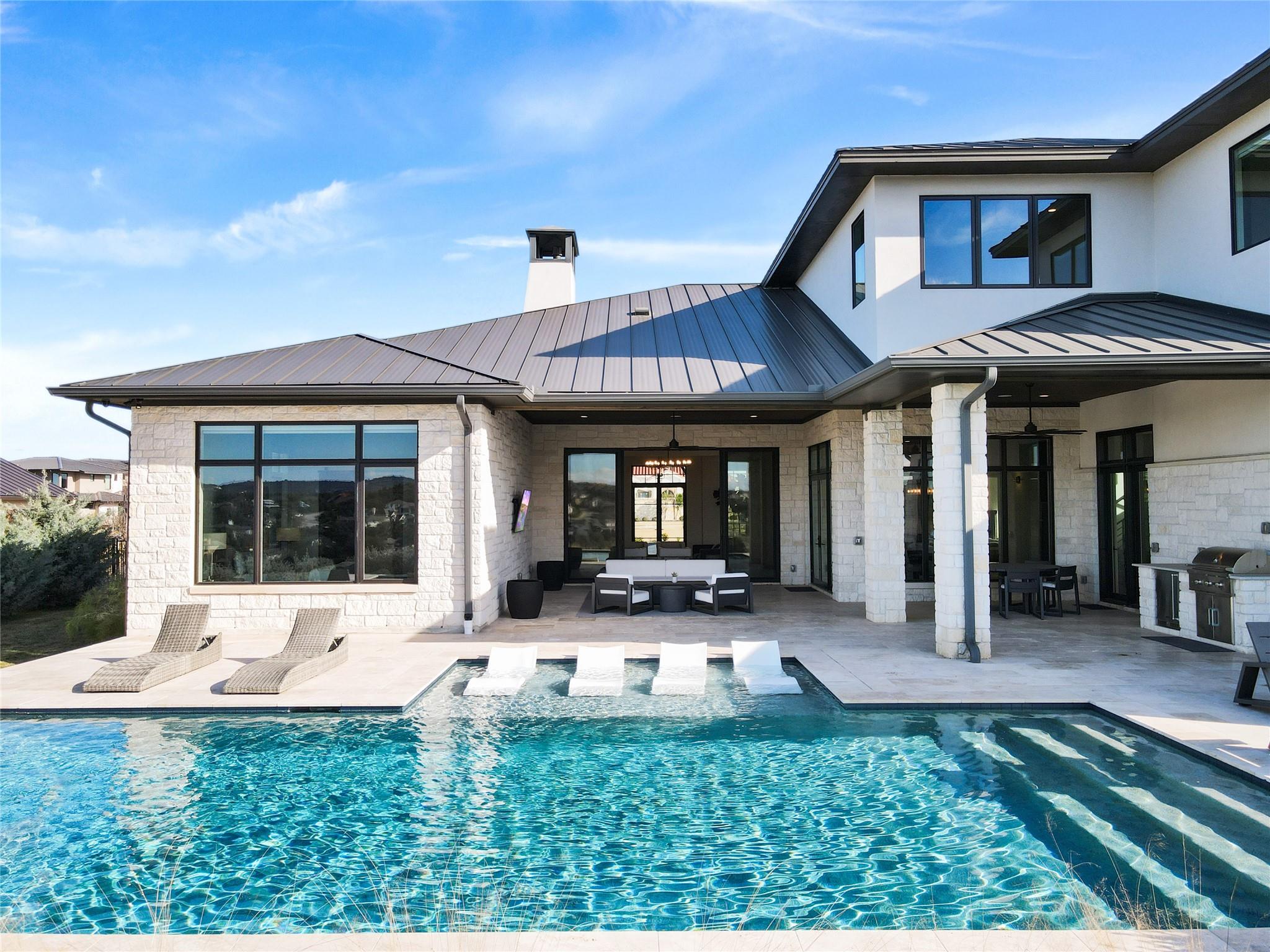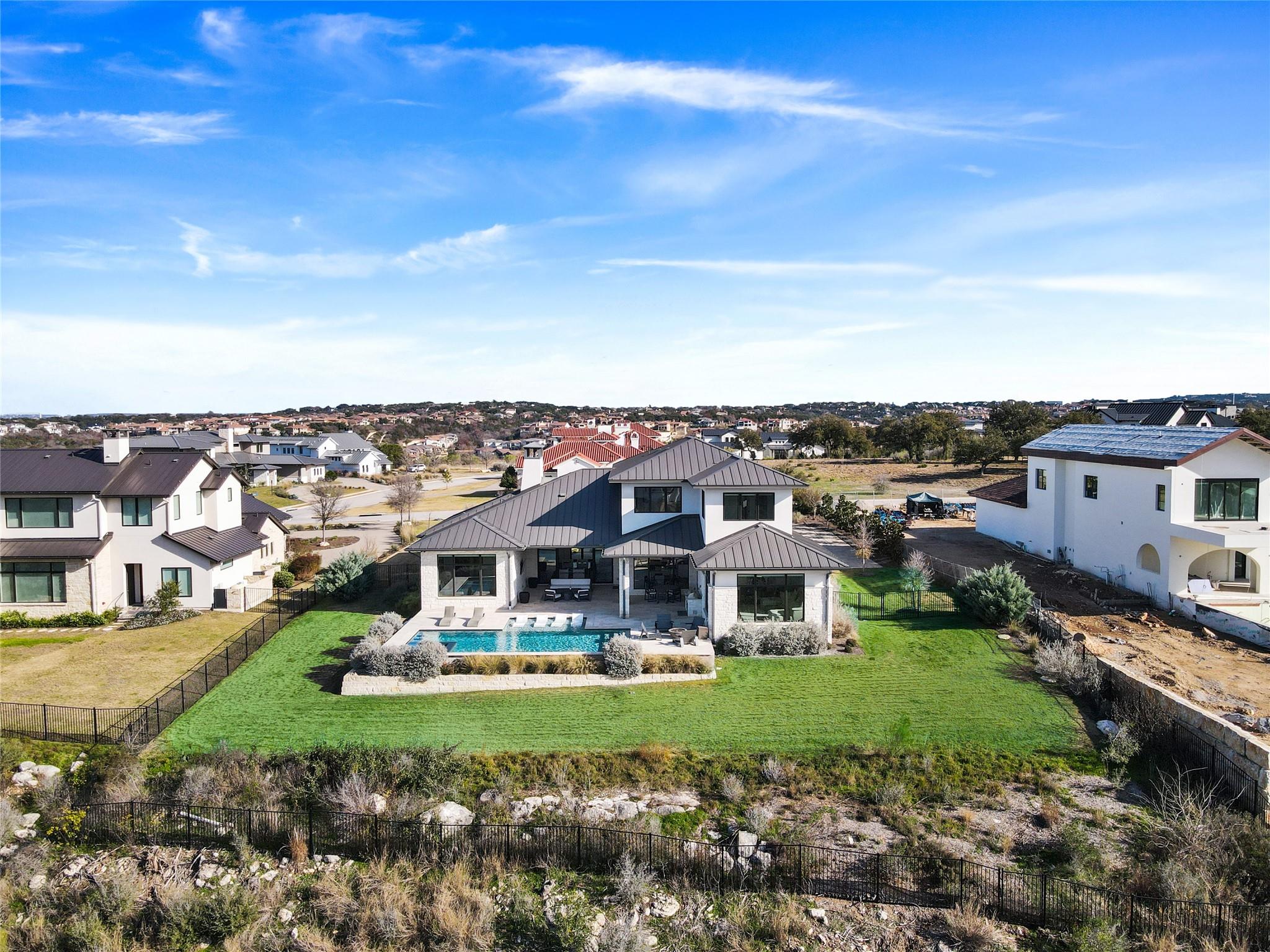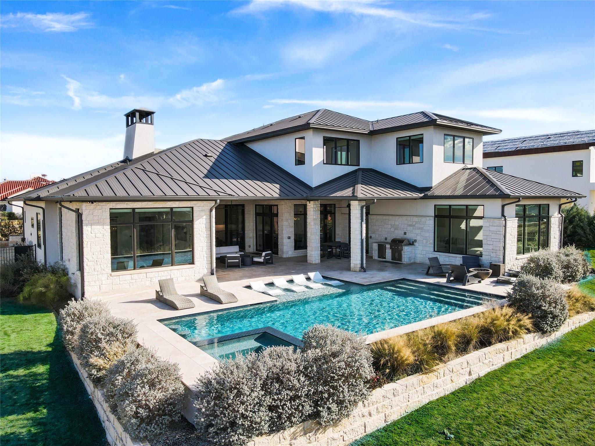 Stunning modern Lake Travis waterfront views surround this masterpiece located in The Peninsula of Rough Hollow-Lakeway. 5,378 sf, 5 beds/5.5 bathrooms (1.79AC). See the lake from almost every room, including the huge luxury Master suite! The downstairs features a supersized flex/game room w/full bar + kegerator and office. Outdoor covered living spaces and firepit area surround a resort style pool w/spa, in-water seating and bubblers. Modern finishes, designer lighting, abundant light, large format windows/glass doors, w/ tall ceilings. Wolfe 7 burner range anchors the open kitchen, framed in white quartz counters on an oversized center island. Tray lighting in ceiling and under cabinet lighting provide an elegant soft glow. 3 bedrooms up centered by a secondary living space w/more lake views. The upstairs also features a private gym w padded flooring and mirrored wall. Exquisite craftsmanship and attention to detail are hallmarks of this home built by award winning builder Arbogast Custom Homes. Designed by Geschke Group Architecture. This magnificent home can be sold entirely furnished as shown. The Peninsula is the most exclusive neighborhood in Rough Hollow, with two privacy gates with concierge, private access to a tram with community dock and observation deck. Note the beautiful, lush landscape as you meander down Peninsula Blvd. Residents will receive access to the Rough Hollow Yacht Club & Marina, 22+ miles of hike and bike trails, water-themed community center, basketball, tennis, and pickleball courts and discounts to the fabulous Canyon Grill restaurant perched over the marina. A new fitness center/gym opened recently as well. Lakeway is an active lifestyle community and golf cart friendly. LTISD schools, HEB, Starbucks, BSW Hospital, restaurants, Lakeway Market, and retail are minutes away. There are 3 marinas in Lakeway, World of Tennis, golf courses and country clubs, gyms, nature hike/bikes trails, community and dog parks, event centers, and MORE!