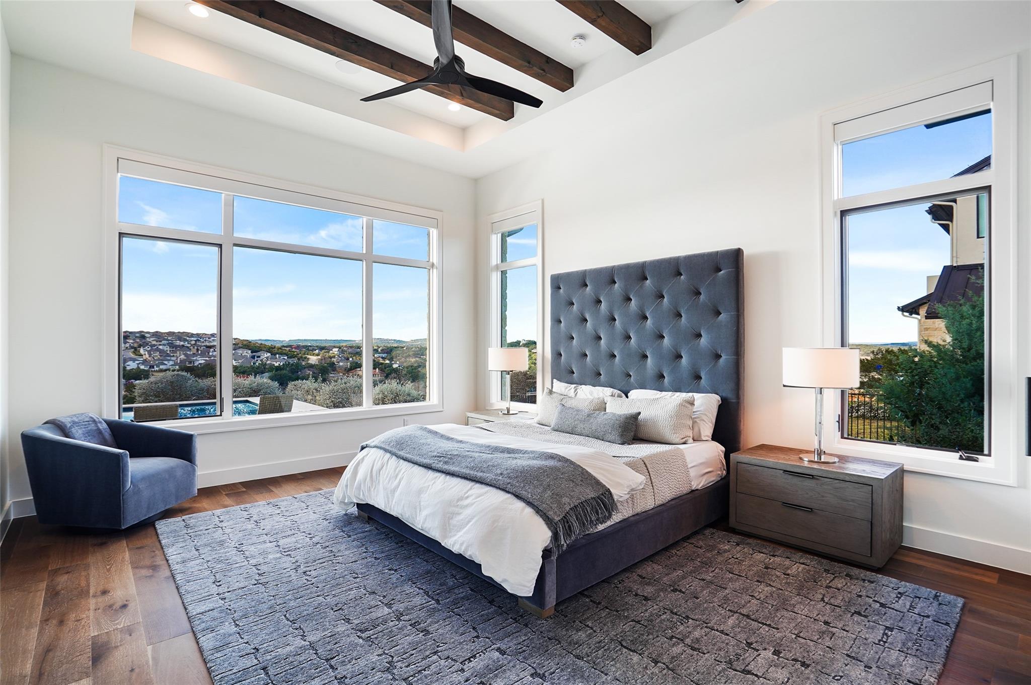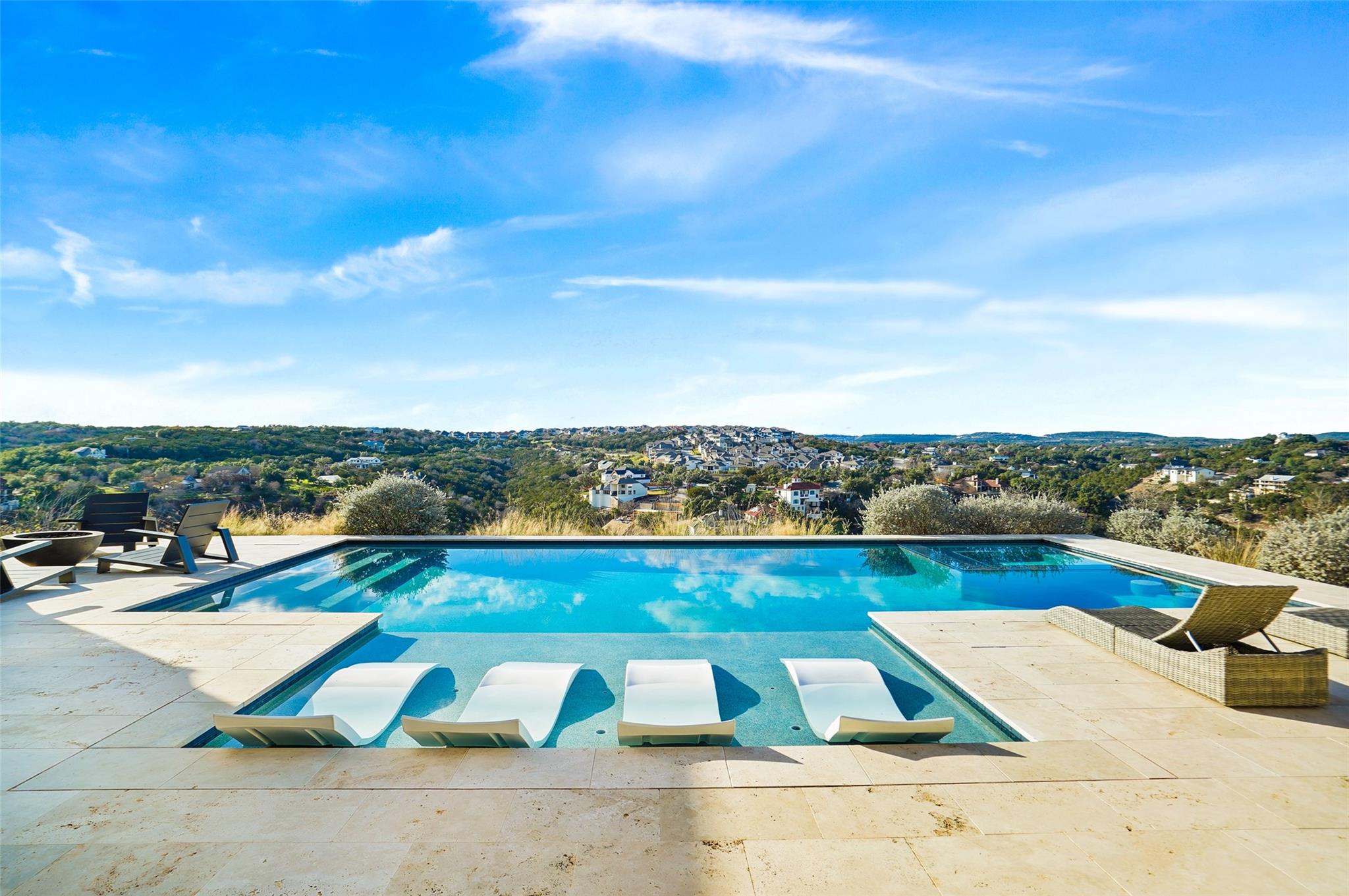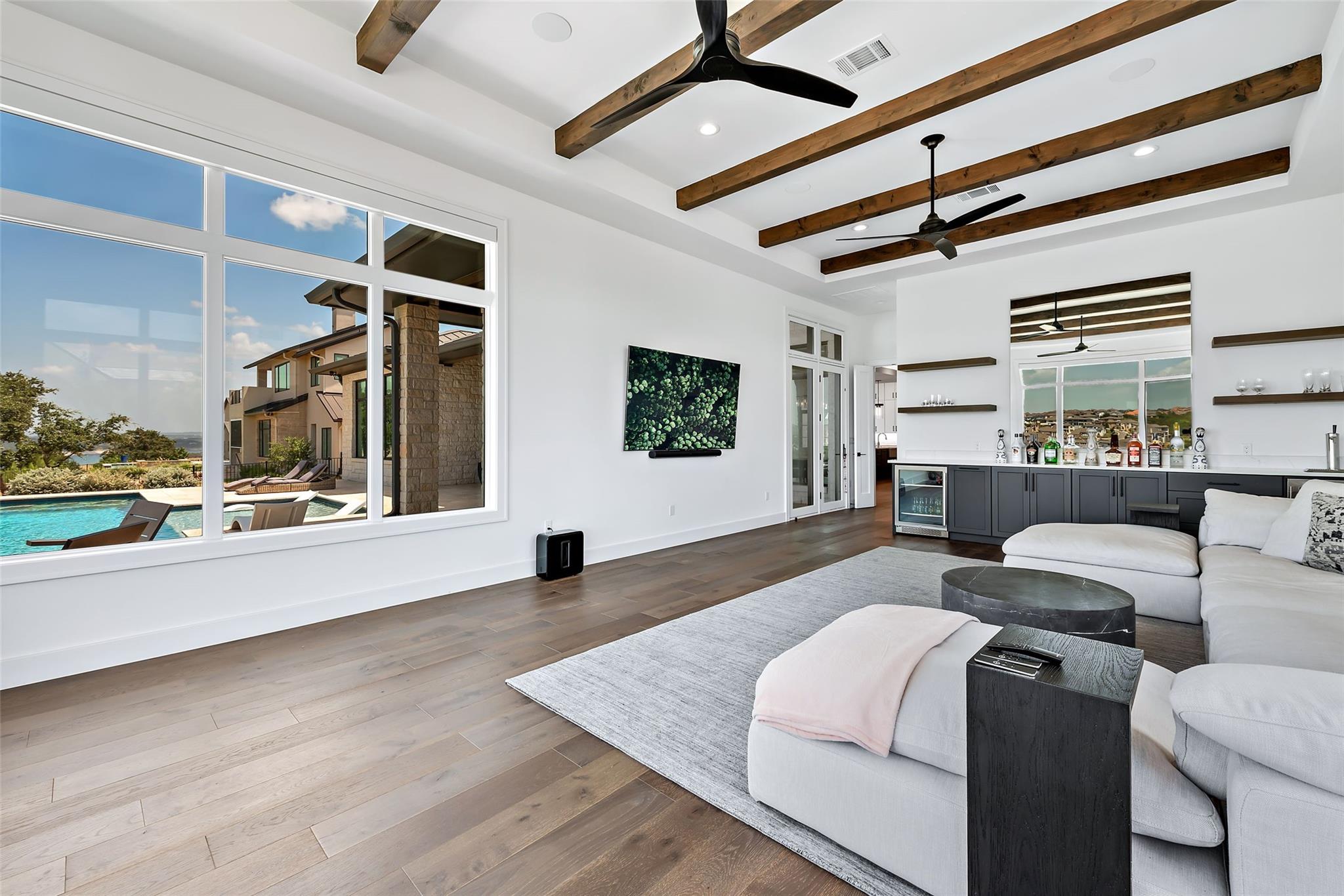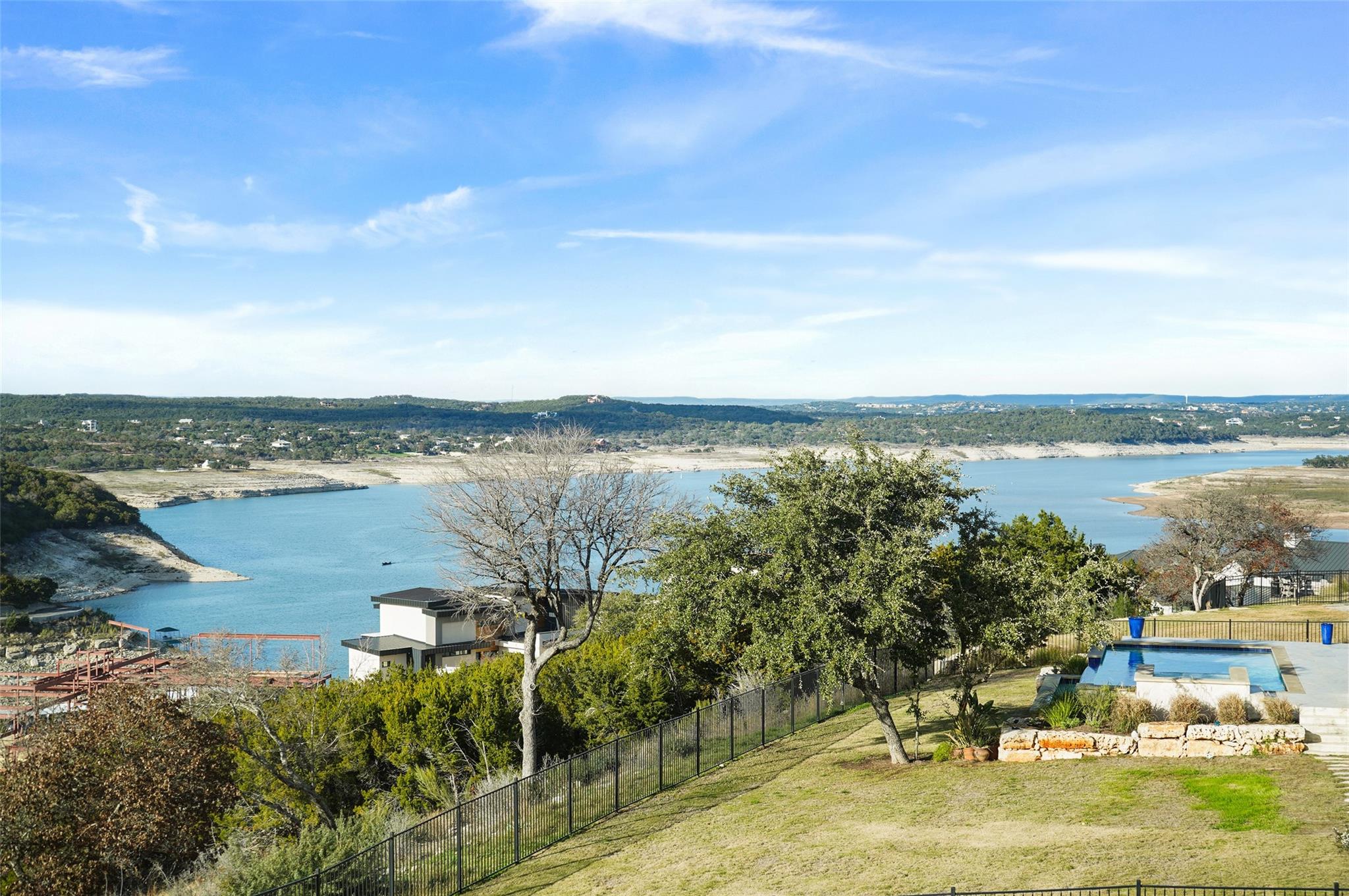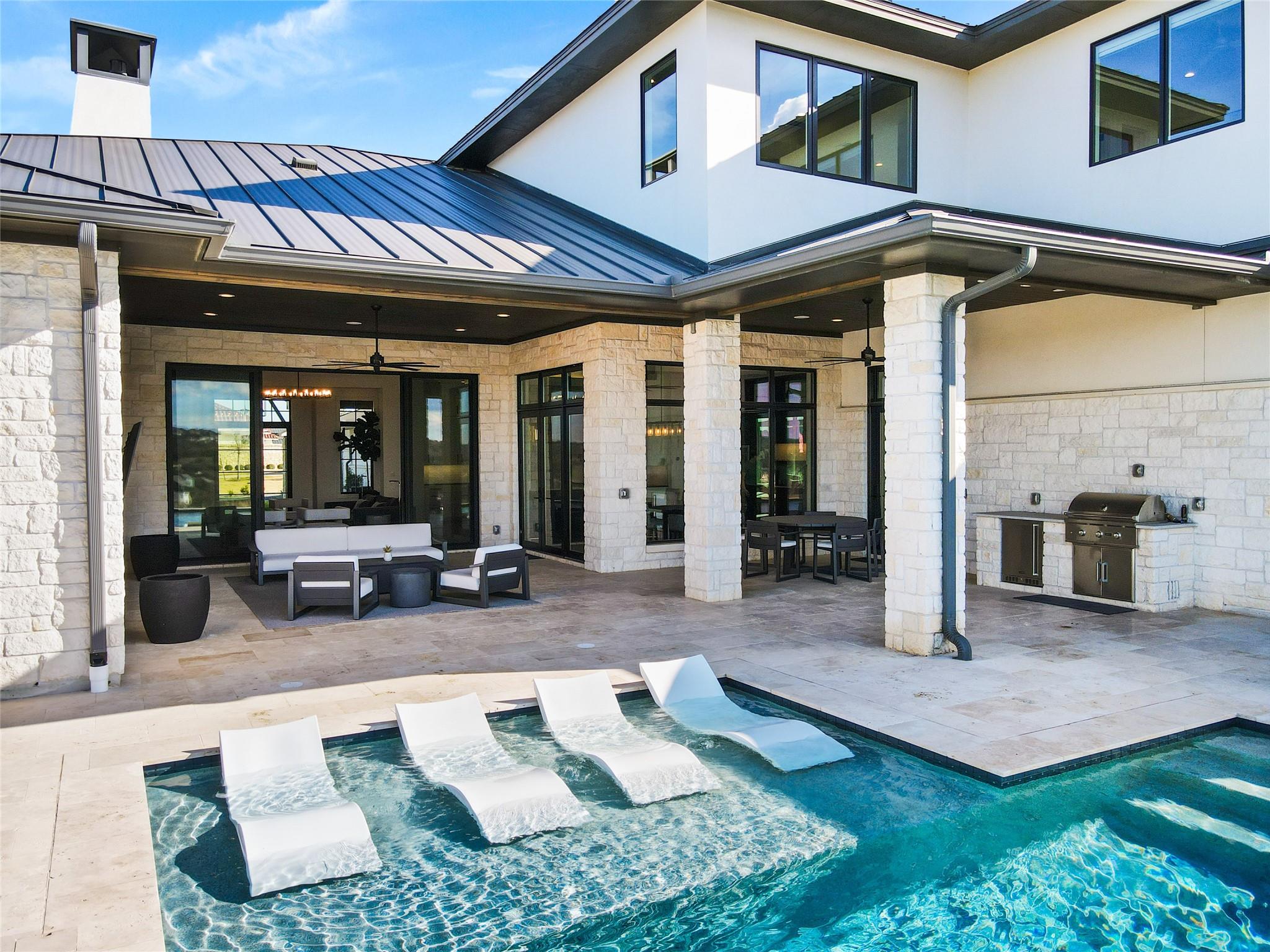 Stunning modern Lake Travis waterfront views surround this masterpiece located in The Peninsula of Rough Hollow-Lakeway. 5,378 sf, 5 beds/5.5 bathrooms (1.79AC). See the lake from almost every room, including the huge luxury Master suite! The downstairs features a supersized flex/game room w/full bar + kegerator and office. Outdoor covered living spaces and firepit area surround a resort style pool w/spa, in-water seating and bubblers. Modern finishes, designer lighting, abundant light, large format windows/glass doors, w/ tall ceilings. Wolfe 7 burner range anchors the open kitchen, framed in white quartz counters on an oversized center island. Tray lighting in ceiling and under cabinet lighting provide an elegant soft glow. 3 bedrooms up centered by a secondary living space w/more lake views. The upstairs also features a private gym w padded flooring and mirrored wall. Exquisite craftsmanship and attention to detail are hallmarks of this home built by award winning builder Arbogast Custom Homes. Designed by Geschke Group Architecture. This magnificent home can be sold entirely furnished as shown. The Peninsula is the most exclusive neighborhood in Rough Hollow, with two privacy gates with concierge, private access to a tram with community dock and observation deck. Note the beautiful, lush landscape as you meander down Peninsula Blvd. Residents will receive access to the Rough Hollow Yacht Club & Marina, 22+ miles of hike and bike trails, water-themed community center, basketball, tennis, and pickleball courts and discounts to the fabulous Canyon Grill restaurant perched over the marina. A new fitness center/gym opened recently as well. Lakeway is an active lifestyle community and golf cart friendly. LTISD schools, HEB, Starbucks, BSW Hospital, restaurants, Lakeway Market, and retail are minutes away. There are 3 marinas in Lakeway, World of Tennis, golf courses and country clubs, gyms, nature hike/bikes trails, community and dog parks, event centers, and MORE!