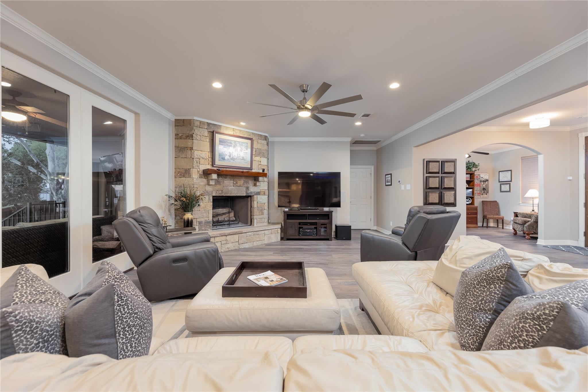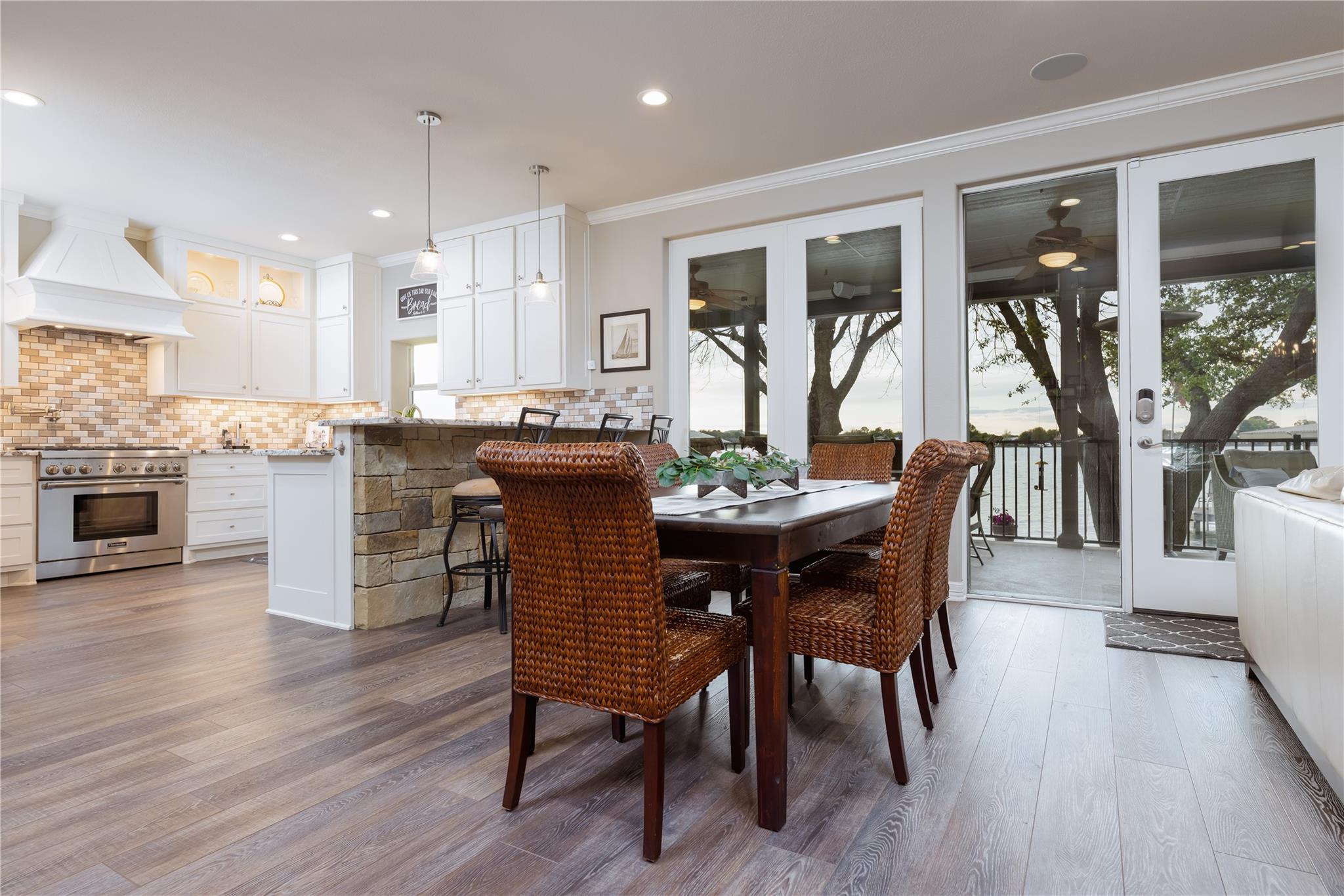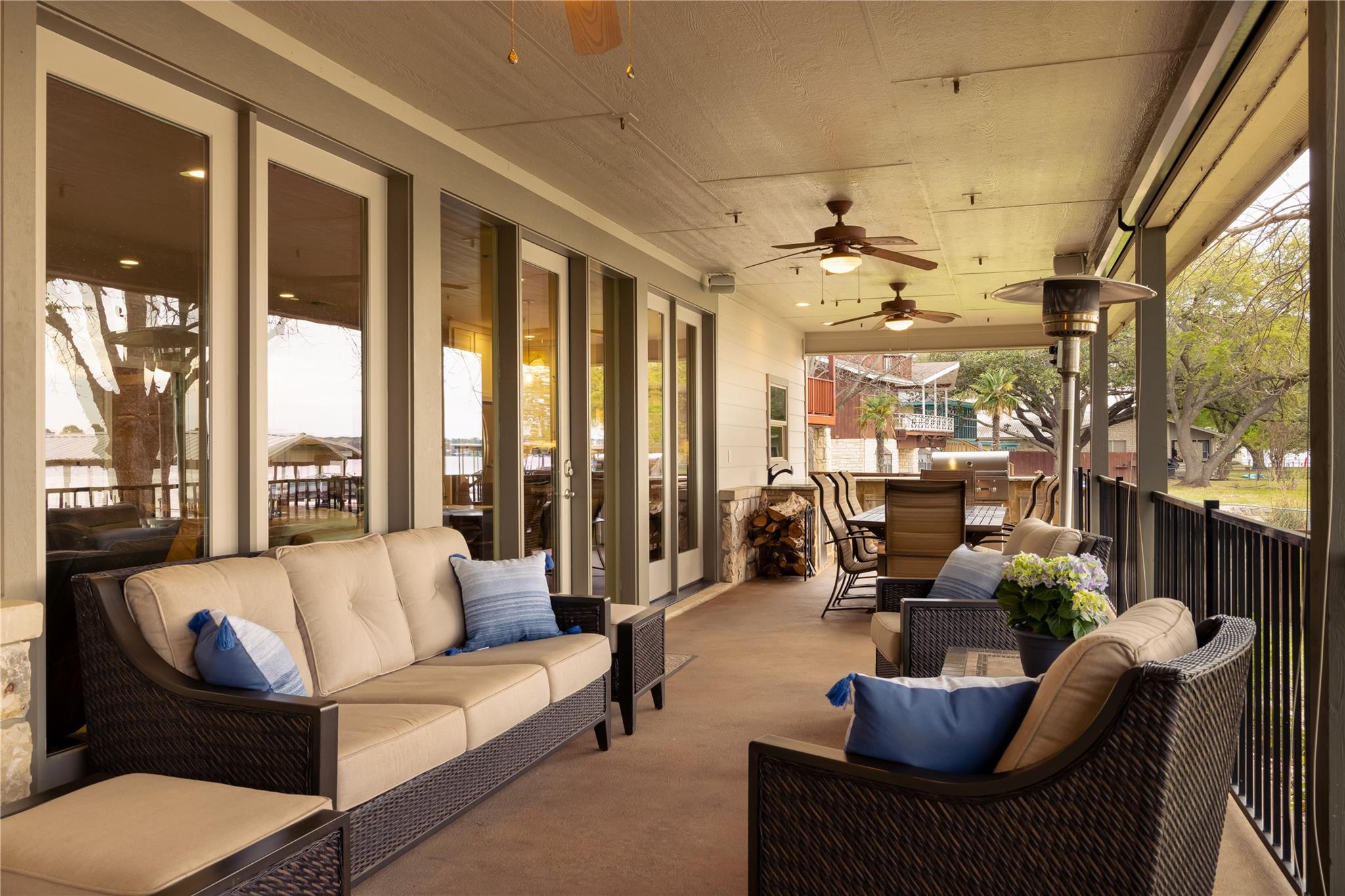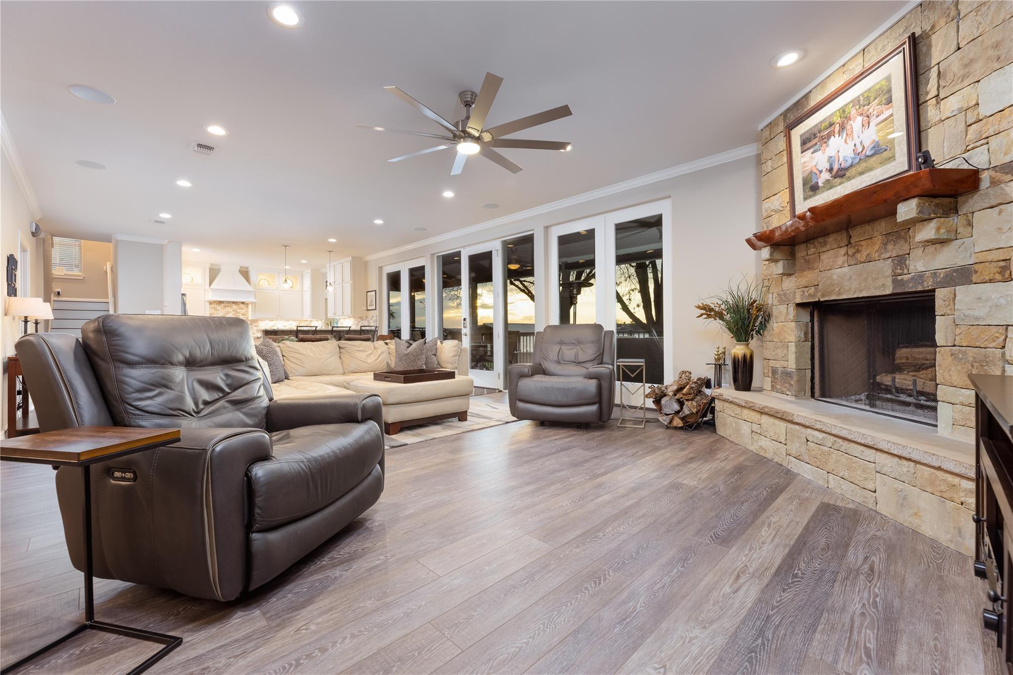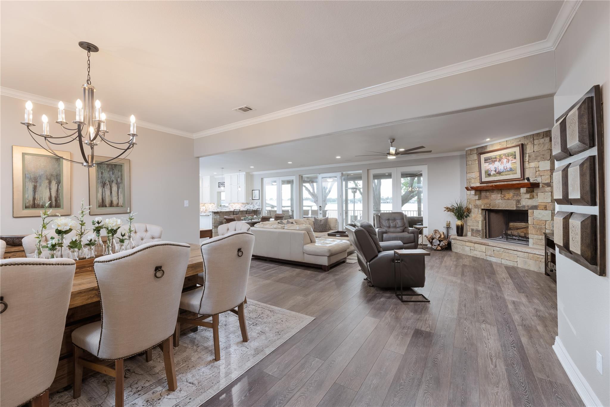 This is the luxury lake home you have been looking for! The spectacular open water view greets you as soon as you open the front door. Open concept living, tastefully updated throughout with luxury appointments throughout including a heated master bathroom floor, gourmet kitchen, remote control patio sun shades, hydraulic boat and jet ski lifts, and smart home app control of thermostats and many other household functions. This home comfortably sleeps 16 with 3 bedrooms, a bunk room, a flex room, and 4 1/2 baths. Waterfront exterior includes a backyard oasis with two outdoor living areas and upstairs veranda. Full outdoor kitchen even includes a warming drawer. Lots of room for parking with large lot, additional two car garage, and storage barn. If you are looking for a turn key property, most furnishings negotiable. Short term rentals are allowed. Owner is a licensed real estate agent.