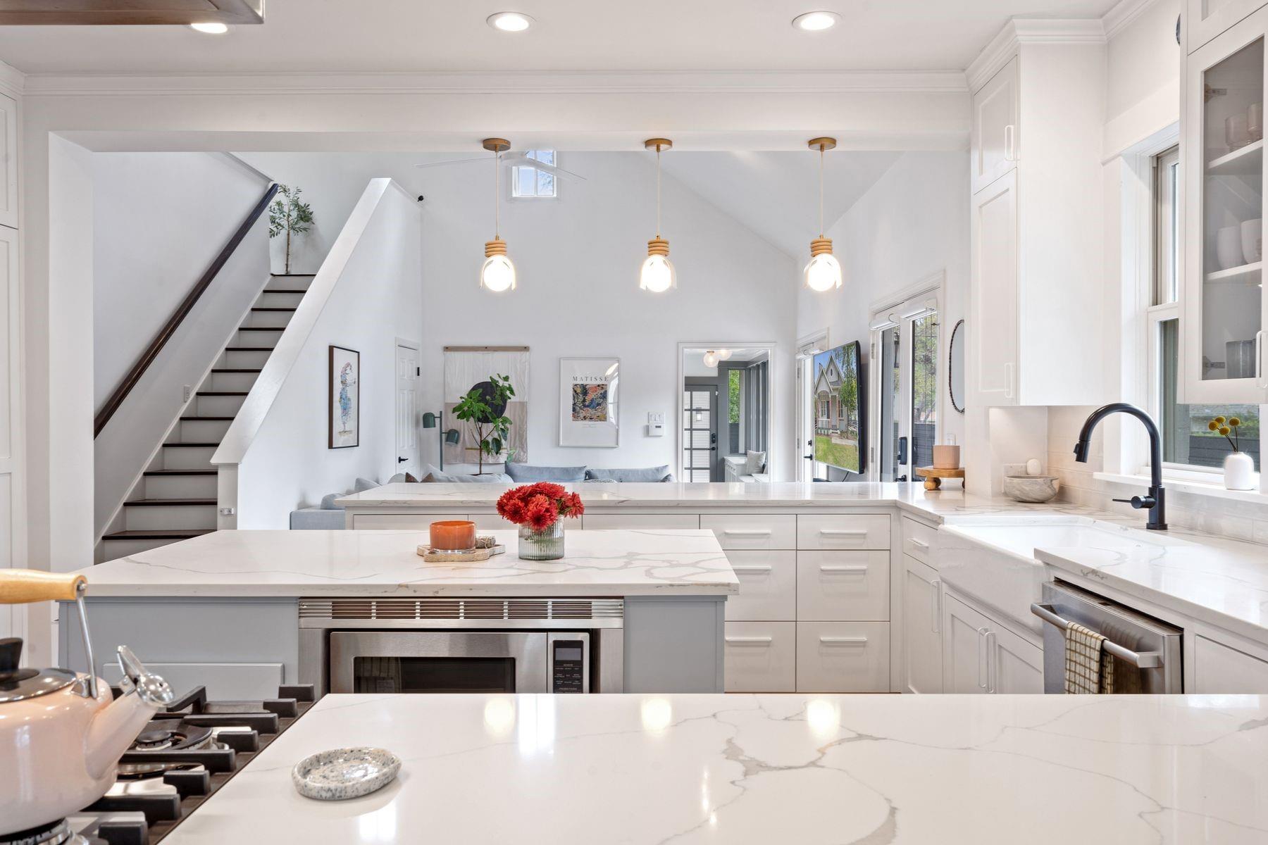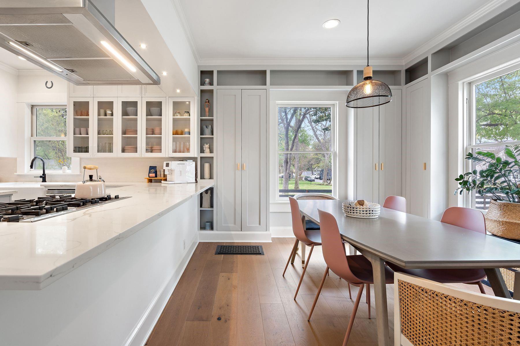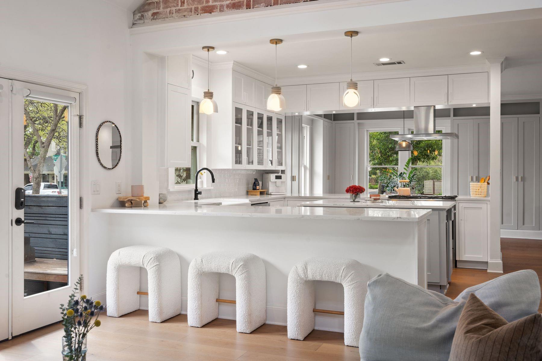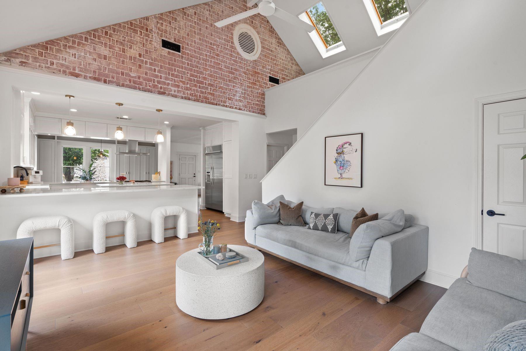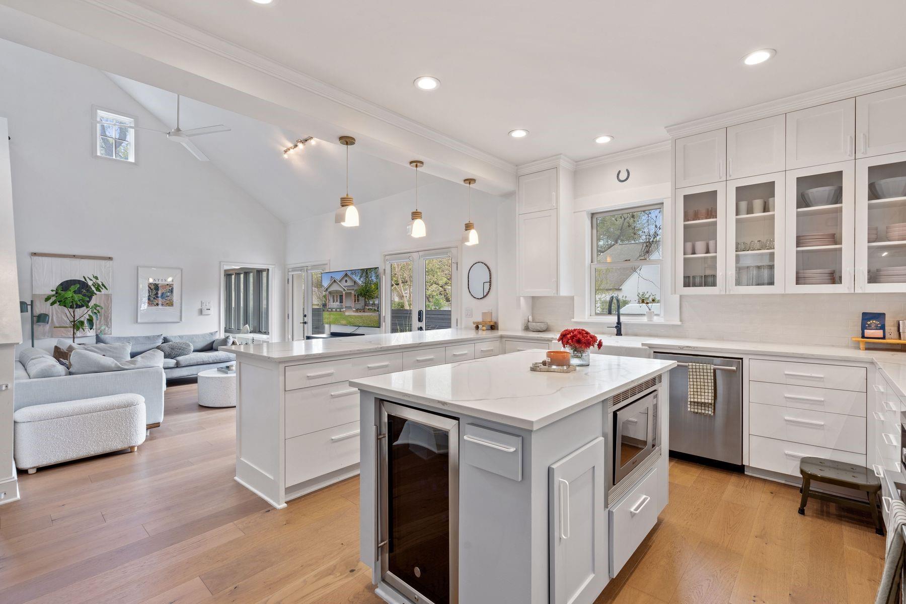1500 Northwood, reimagined by the acclaimed McWalters Collaborative, is a classic gem in Pemberton Heights, marrying classic finishes with modern flair. This home welcomes you with its sophisticated charm and luxury, highlighted by high-end finishes that define its timeless appeal. The open floor plan boasts vaulted ceilings and facilitates a seamless flow between the living areas, dining space, and a modern kitchen. The primary suite, located at the home's rear, serves as a private retreat, complete with an updated primary bathroom that features elegant fixtures, and a spacious shower that exudes a spa-like ambiance. This area also includes a dedicated office space or dressing room, enhancing the suite's functionality and privacy. In addition to the main residence, the property offers separate living quarters above the two-car garage. This distinct space includes a screened-in porch, providing a peaceful outdoor retreat. Inside, the living quarters feature a separate office downstairs with a built-in desk, ideal for focused work or creative endeavors. A covered flex space adds versatility, suitable for various activities or storage needs. This arrangement, set in the heart of the iconic Central Austin neighborhood, offers both additional living space and potential for a variety of uses, reflecting the thoughtful design and utility of the entire property. *square footage per architect