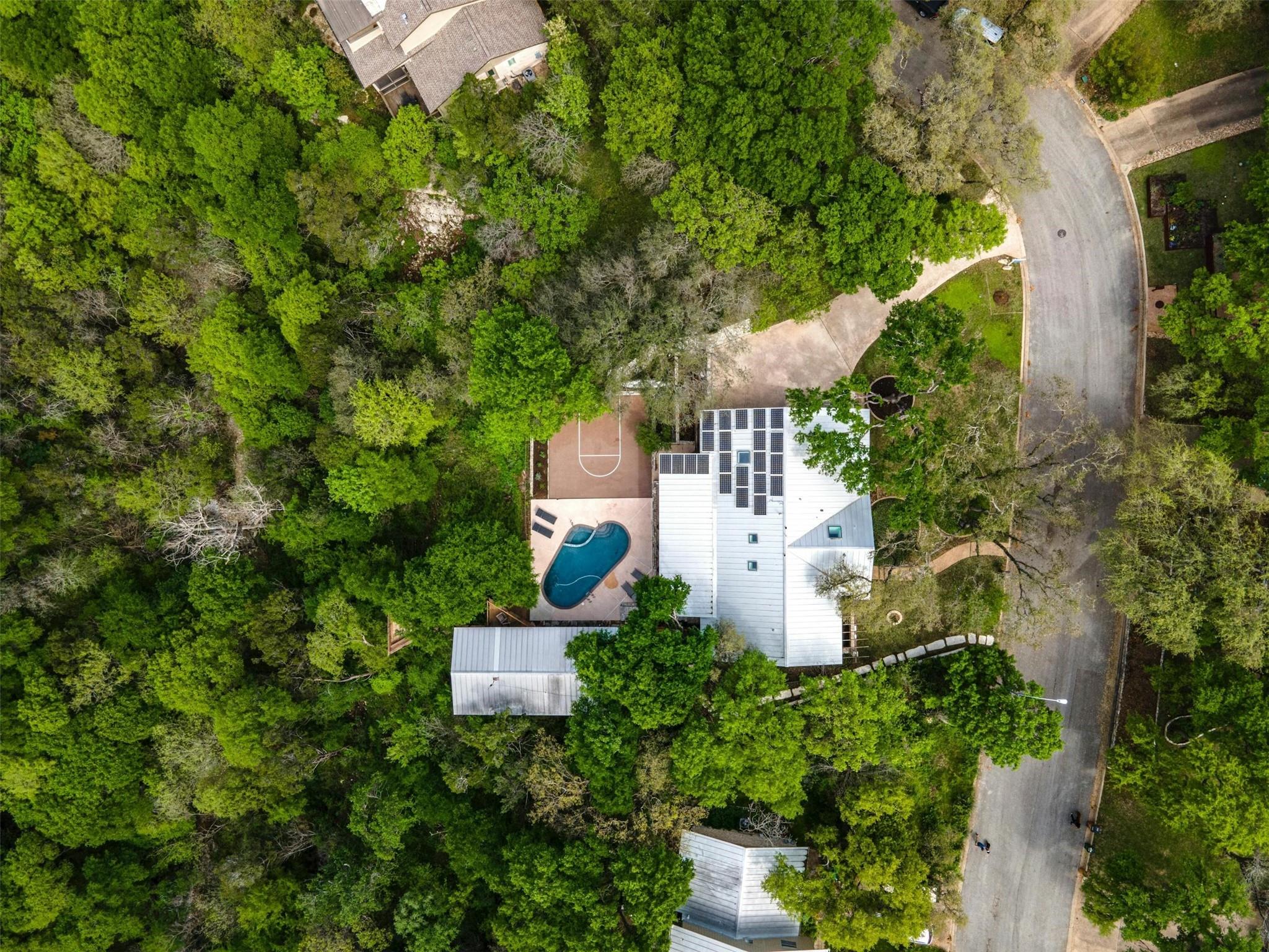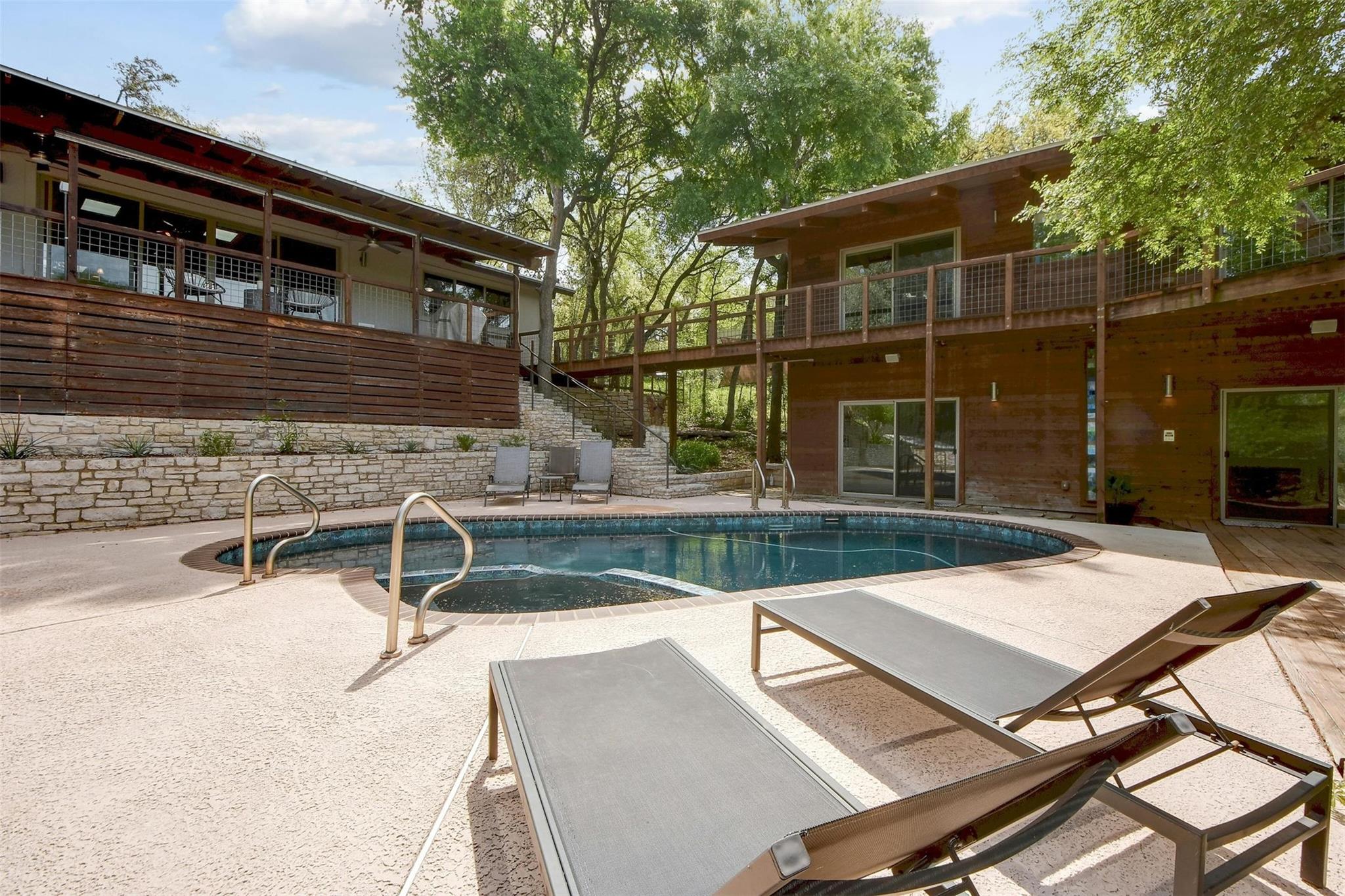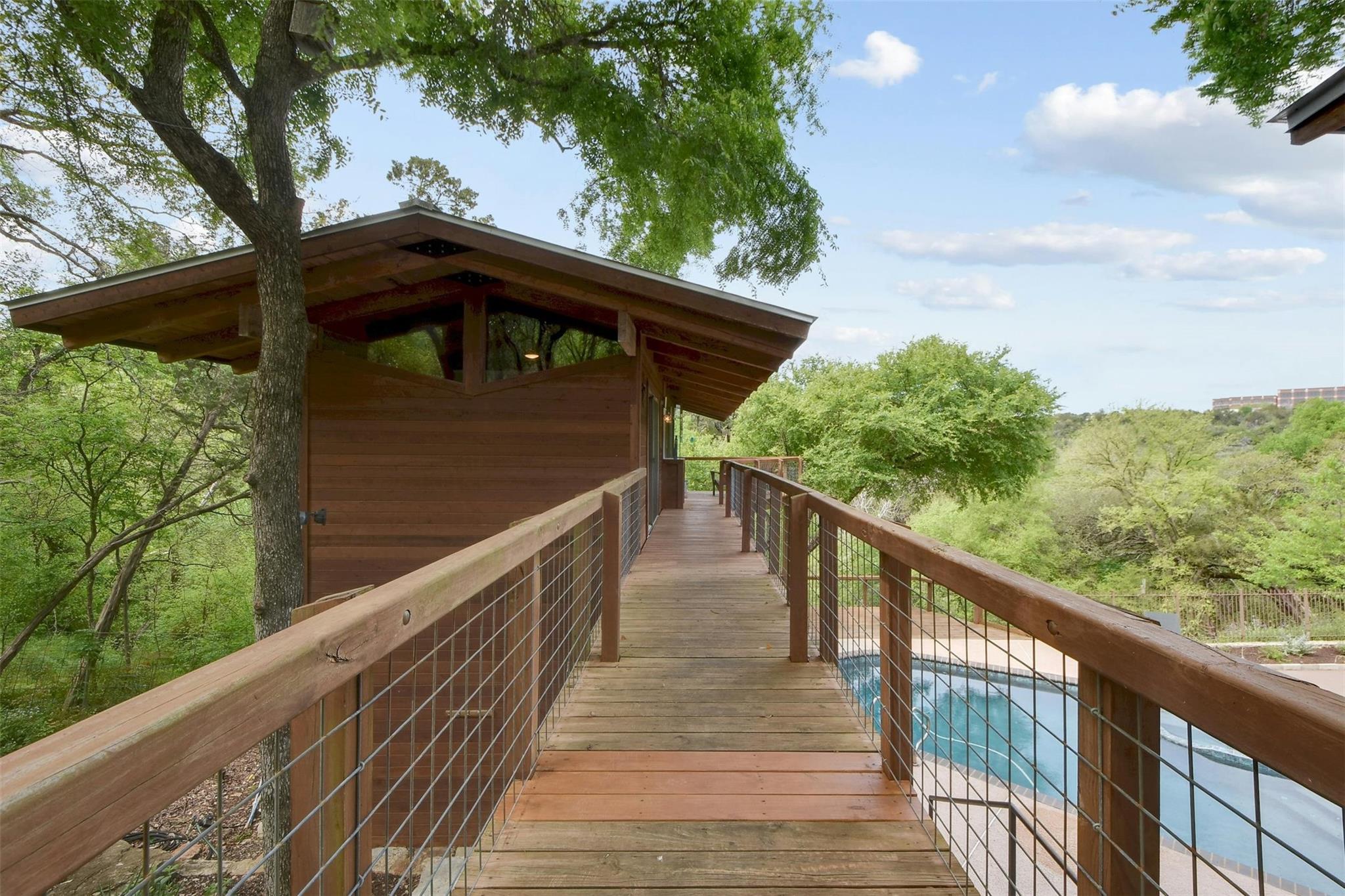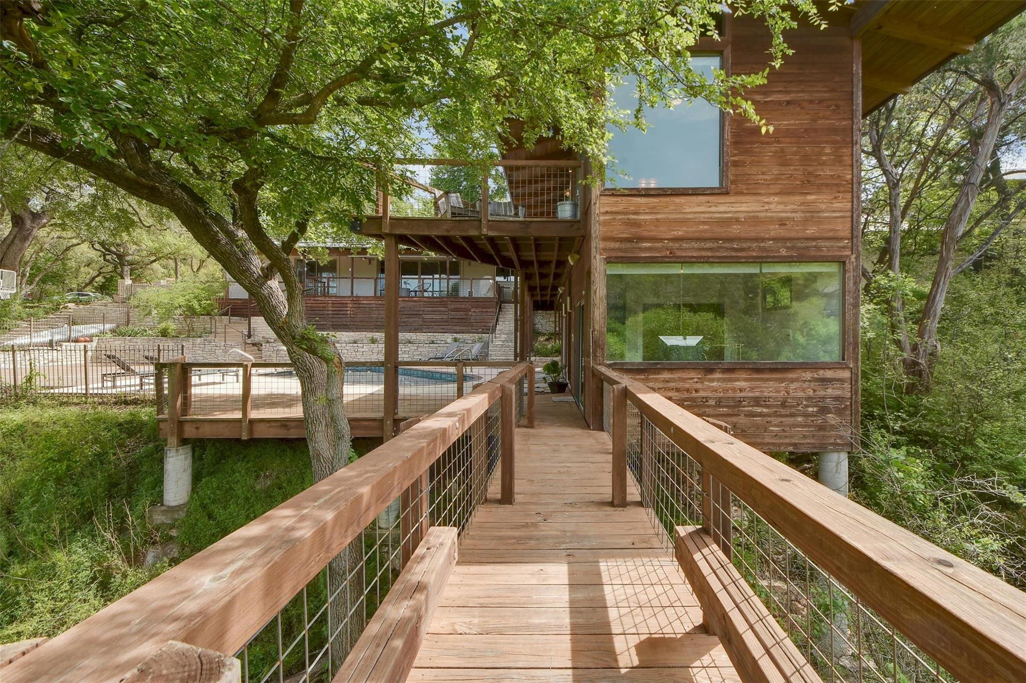 MULTIPLE OFFERS RECEIVED, HIGHEST AND BEST DUE THURS 3/28 AT 10AM. Welcome to 2611 Deerfoot Trail. Nestled on nearly an acre of land with a pool and sports court, this exceptional property overlooks the Barton Creek greenbelt in the highly sought-after Barton Hills neighborhood. The thoughtfully designed home is comprised of a main house and a detached two-story casita, each surrounded by expansive decks that capture the greenbelt views.The main residence is 1723-sq feet,built in mid-century modern style, and underwent a comprehensive down-to-the-studs remodel in 2012.With 3 bedrooms and 2 baths, it presents a comfortable, well-appointed living space.The two-story detached casita, completed in 2013, spans 850 sq ft & offers a flexible space for additional bedrooms, home office or studio.Built with a modern tree house vibe, the upper level features 2 rooms with a full bath and kitchen, accessible from the street.The lower level comprises 2 rooms with a half bath and kitchenette, opening onto the pool and sports court.Encompassing a total of 0.937 acres, the property includes an undeveloped buildable lot, graced with its own enchanting grotto and a captivating cascading waterfall during heavy rain.Ideally situated just 3 miles from downtown & 12 miles from ABIA,Barton Hills is surrounded by greenbelt trails and is home to an award-winning elementary school. Located on a tranquil street, the residence is a mere 15 min stroll to Barton Springs, Zilker Park & Lady Bird Lake, with easy access to dining and shopping on S. Lamar & S. Congress.This property's unique combination of greenbelt positioning and substantial lot size is a rare find. 2611 Deerfoot Trail offers tremendous potential for expansion while currently presenting a beautifully constructed and inviting home.Contact us to schedule your private appointment and discover the extraordinary allure of this property.