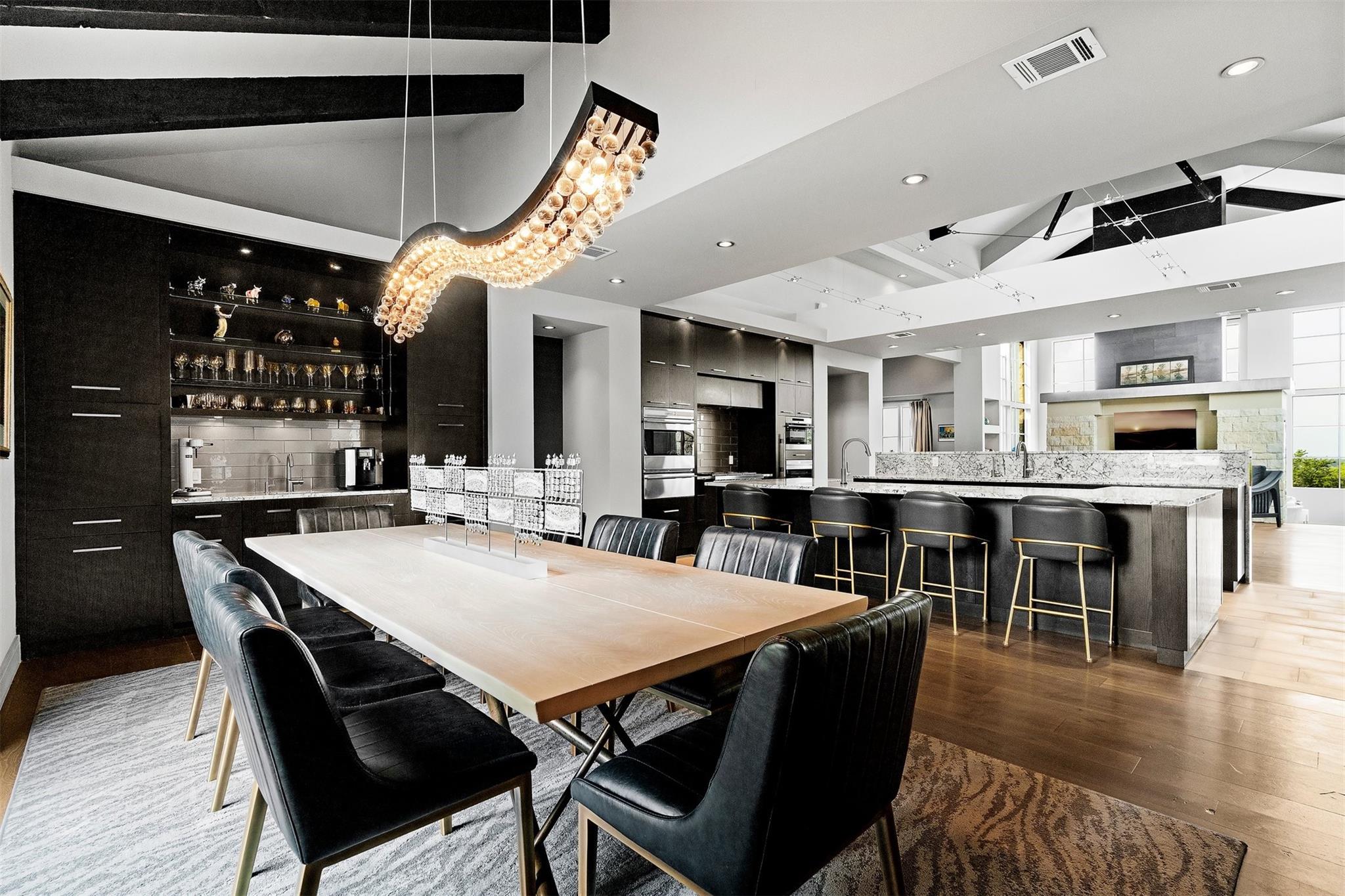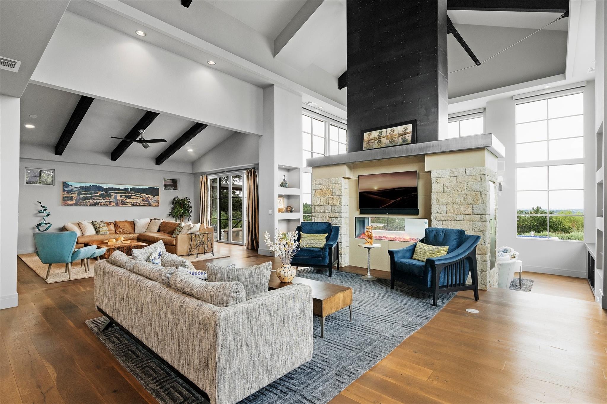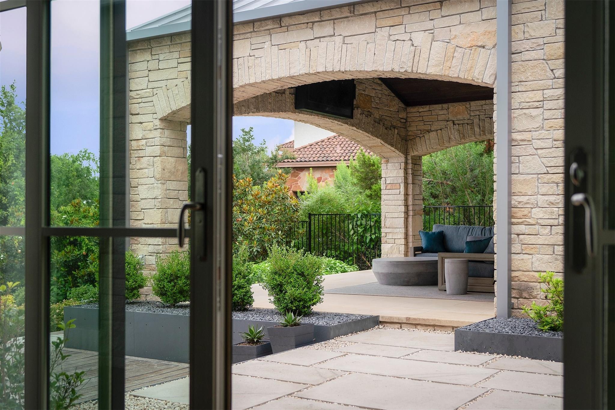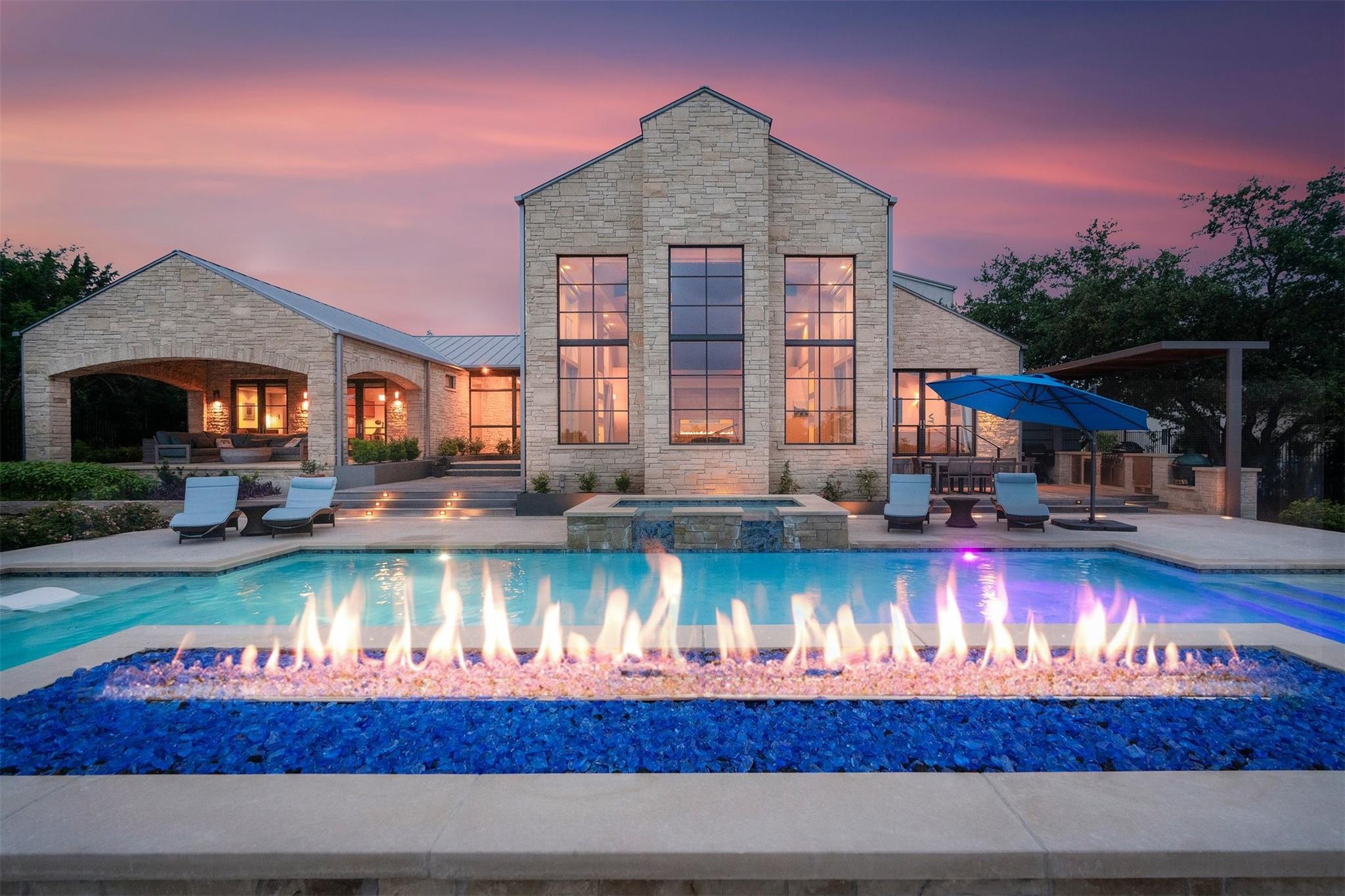 Located in the prestigious gated enclave of Spanish Oaks, every inch of this home has been thoughtfully curated; designed by David Gostecnik and built by Jim Lindsay. As you approach the property, the lighted driveway, metal roof and Lueders limestone set the stage for the home's majestic presence. Upon entering, you are greeted by a dramatic entryway adorned with art feature lighting, Venetian plaster walls, and rock detail. The gourmet kitchen is equipped with Wolf, Sub-Zero, and Bosch appliances. Highlights include a six-burner Wolf cooktop, steam oven, and a 48-inch built-in refrigerator. Custom cabinetry with specialized storage solutions, a 146-bottle wine cooler, and a dedicated coffee bar make this kitchen perfect for both everyday living and lavish entertaining. Adjacent to the kitchen, the living room showcases custom-designed trusses and beams, complimented by a striking see-through fireplace. Two-story windows with electronic sunshades offer breathtaking views. The dining room features a hand-crafted chandelier, built-in China cabinet, and a wet bar with floating glass shelves. The owner's suite features custom ceiling details, and controllable sunshades. The spa-like owner's bath is equipped with Carrara marble, a steam shower, air jet soaking tub and a custom-built closet. The outdoor space boasts a fully fenced yard, a large custom swimming pool and spa with beach entries, and extensive fire and water features. An outdoor kitchen with a Lueders limestone gas grill and Green Egg smoker is perfect for alfresco dining. With features like Kolbe high-efficiency windows, Hunter Douglas electric blackout shades, and a whole-house automation system, this home is designed for ultimate comfort and convenience. The centerpiece of the community is the private Spanish Oaks Golf Club, featuring an 18-hole golf course designed by PGA Tour legend Bobby Weed. Zoned for Lake Travis ISD. Schedule your private tour and make this dream residence your reality!