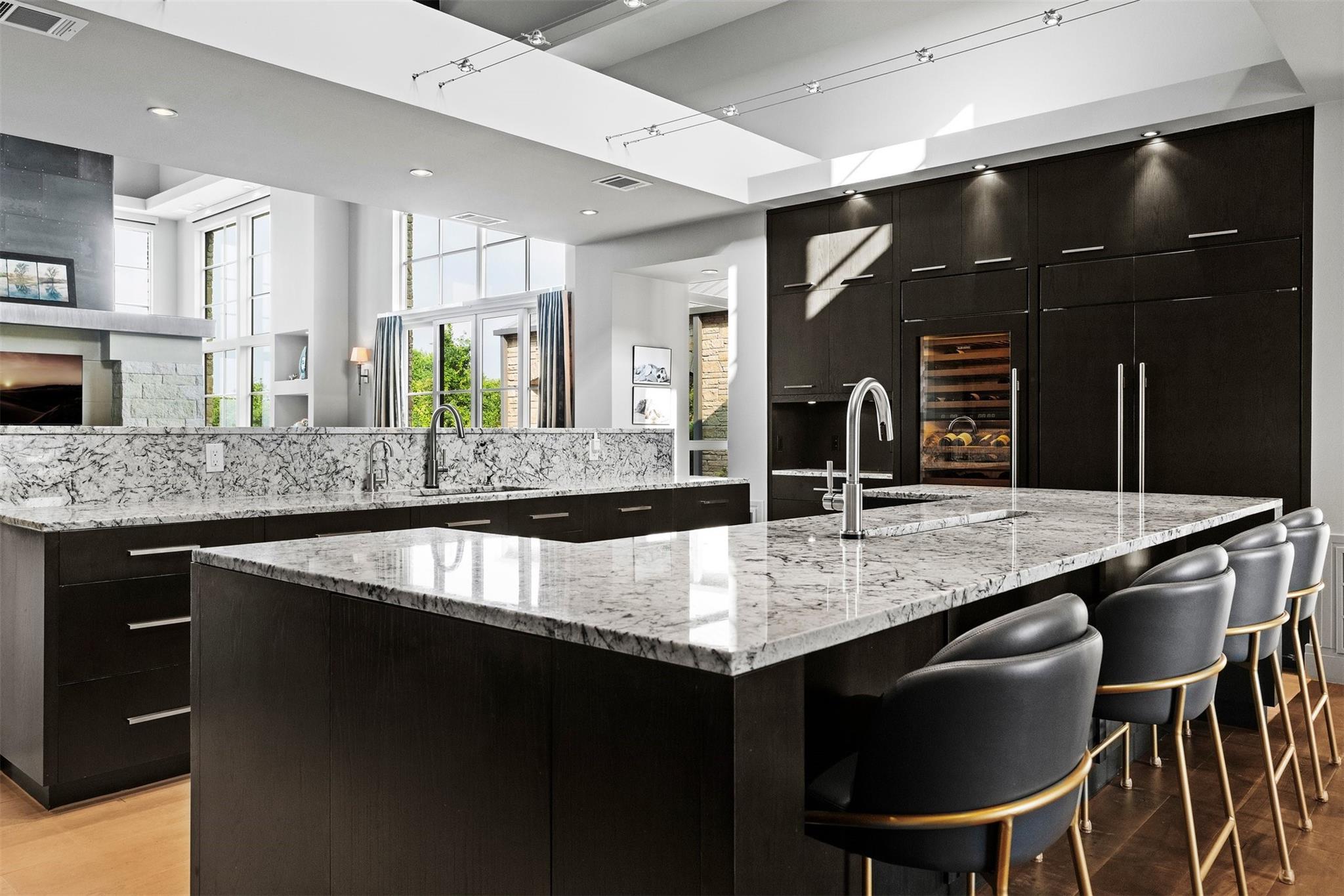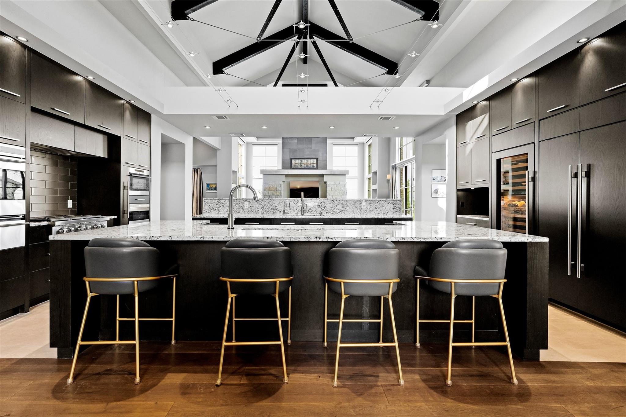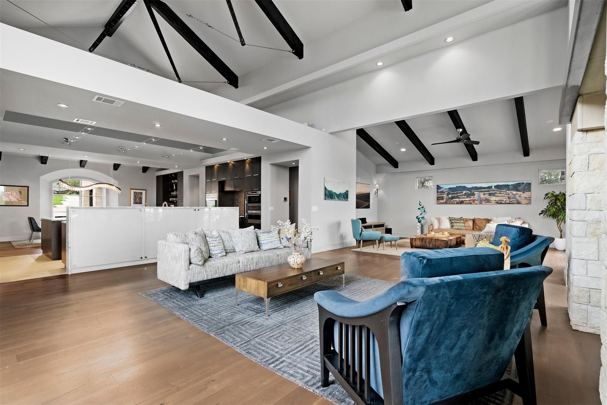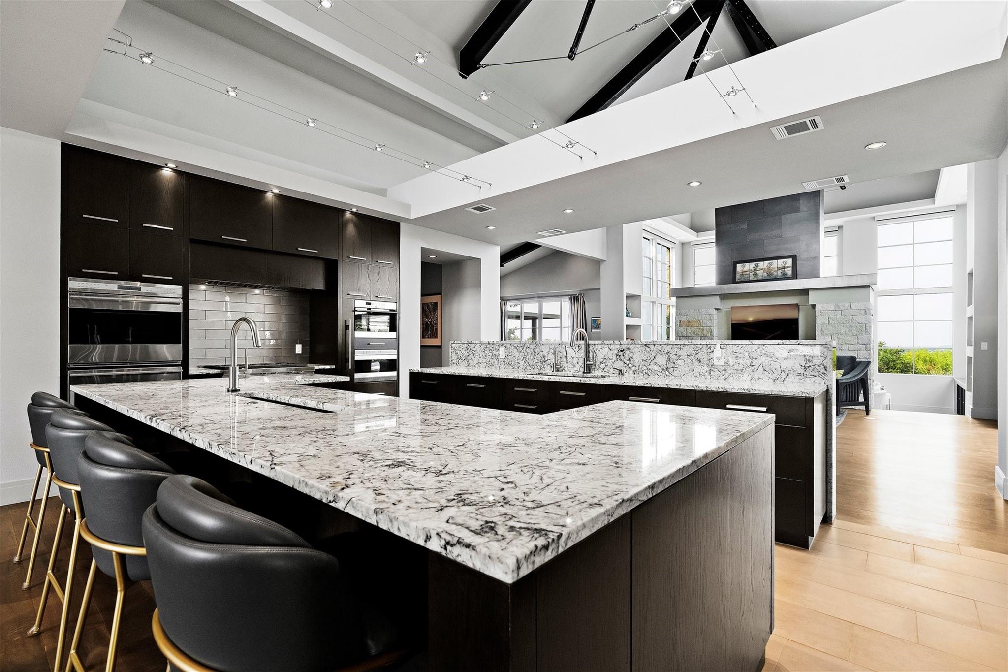Located in the prestigious gated enclave of Spanish Oaks, every inch of this home has been thoughtfully curated; designed by David Gostecnik and built by Jim Lindsay. As you approach the property, the lighted driveway, metal roof and Lueders limestone set the stage for the home's majestic presence. Upon entering, you are greeted by a dramatic entryway adorned with art feature lighting, Venetian plaster walls, and rock detail. The gourmet kitchen is equipped with Wolf, Sub-Zero, and Bosch appliances. Highlights include a six-burner Wolf cooktop, steam oven, and a 48-inch built-in refrigerator. Custom cabinetry with specialized storage solutions, a 146-bottle wine cooler, and a dedicated coffee bar make this kitchen perfect for both everyday living and lavish entertaining. Adjacent to the kitchen, the living room showcases custom-designed trusses and beams, complimented by a striking see-through fireplace. Two-story windows with electronic sunshades offer breathtaking views. The dining room features a hand-crafted chandelier, built-in China cabinet, and a wet bar with floating glass shelves. The owner's suite features custom ceiling details, and controllable sunshades. The spa-like owner's bath is equipped with Carrara marble, a steam shower, air jet soaking tub and a custom-built closet. The outdoor space boasts a fully fenced yard, a large custom swimming pool and spa with beach entries, and extensive fire and water features. An outdoor kitchen with a Lueders limestone gas grill and Green Egg smoker is perfect for alfresco dining. With features like Kolbe high-efficiency windows, Hunter Douglas electric blackout shades, and a whole-house automation system, this home is designed for ultimate comfort and convenience. The centerpiece of the community is the private Spanish Oaks Golf Club, featuring an 18-hole golf course designed by PGA Tour legend Bobby Weed. Zoned for Lake Travis ISD. Schedule your private tour and make this dream residence your reality!