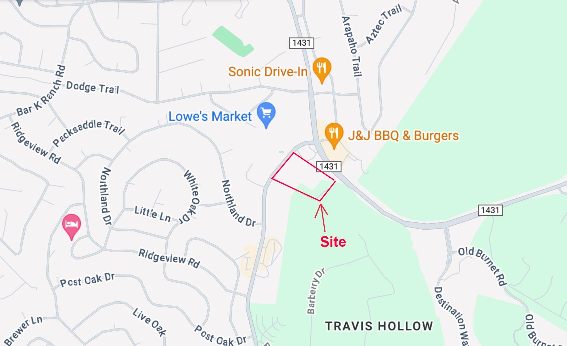 Great visibility, with over 300 feet of frontage. Zoned C-2. 2 curb cuts on Lohman Ford. Adjacent to hard corner of FM 1431 and Lohman Ford. Great retail site for strip center, fast food, coffee, drive-thru etc. Growing area that is underserved commercially. Owners working on getting reciprocal access to FM 1431. Cell tower with an existing lease conveys with the property.