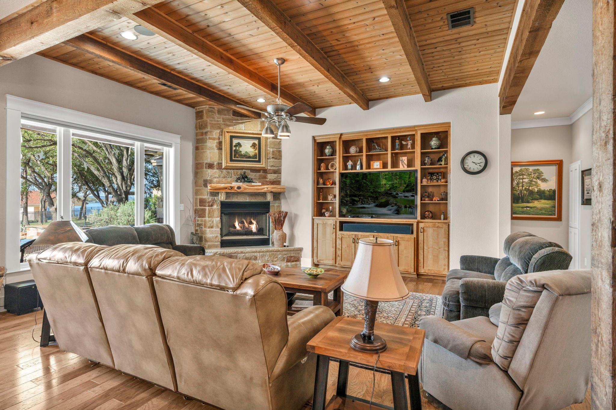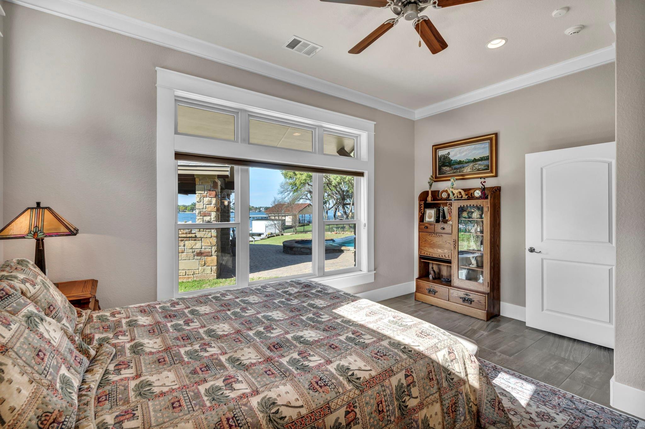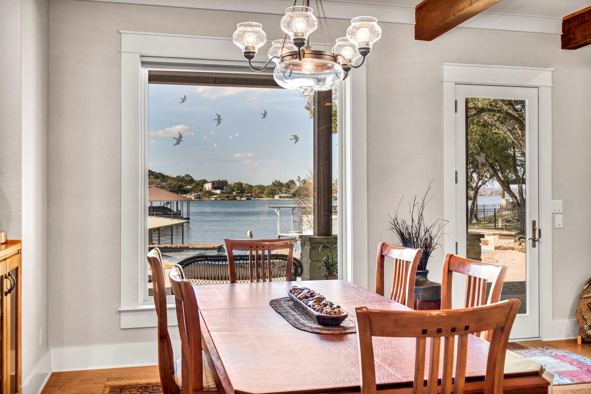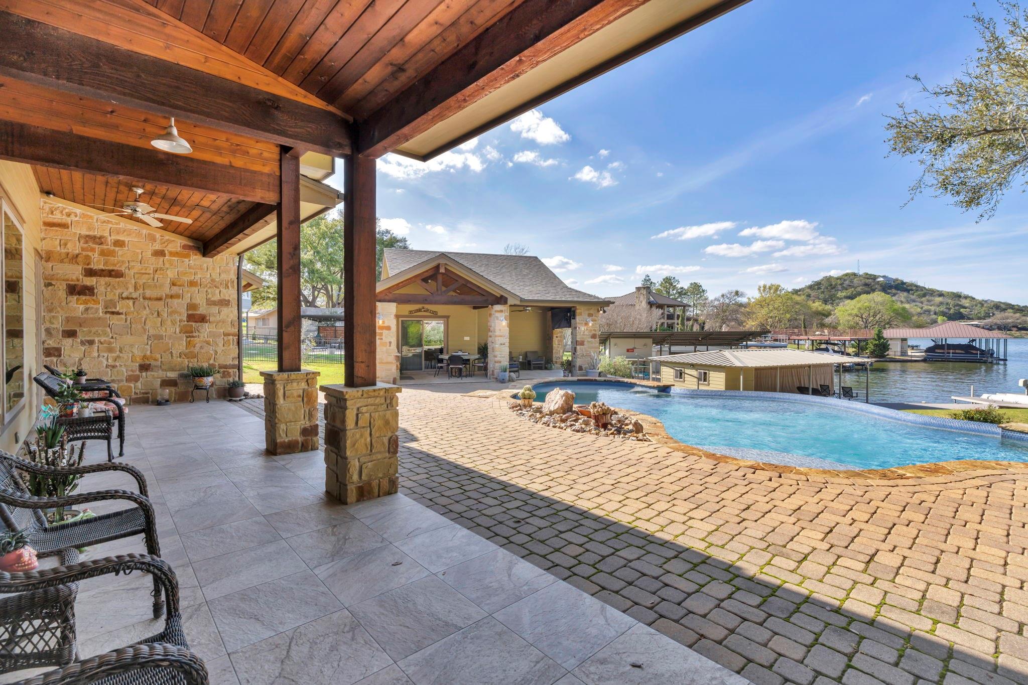 Location. Location, Location on Lake LBJ. Located in the highly sought after Blue Lake Estates, this exquisite lakefront home combines a first-class design with beautiful craftsmanship and finished with an unsurpassed attention to detail. The main house has three bedrooms downstairs each with an ensuite bath. A fabulous, split floor plan offers an expansive lakeside owner's suite with a sitting area to enjoy water views. A bonus room upstairs in the main house has a half bath and could be used a bedroom, exercise room, or would be perfectas a media room. The main living, kitchen, and dining blends living space with lake views. A detached casita offers an additional 420square feet of living with a kitchenette, a large bedroom with lake views, and a full bath. The third garage bay was designed for a smal RV. It has a twelve foot garage door, sewer dump station, and a 30 amp outlet. There are almost too many features to list but include a studio with a glass garage door, a fenced yard with a sprinkler system and garden area, a 25 foot covered boat dock with a touchless boat cover, an abundance of storage throughout, over 90 feet of lake frontage per the county, an oversized utility room with built in cabinetry and a large sink, and propane on site. The composition roof was replaced in December, 2023, exterior of main house and guest house painted in Summer, 2023 and garage floor was painted in February, 2024.. Boat is available one separate bill of sale.