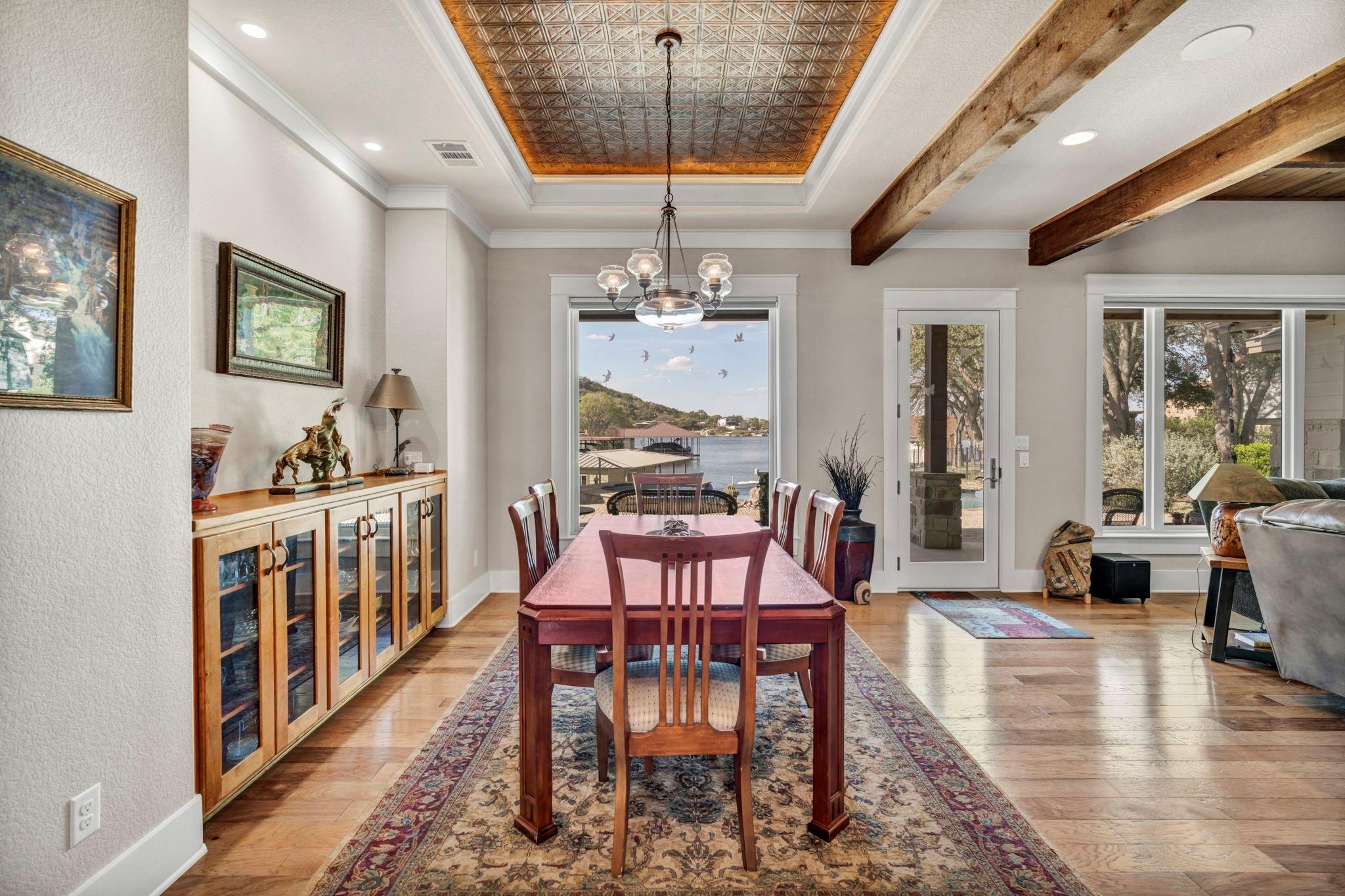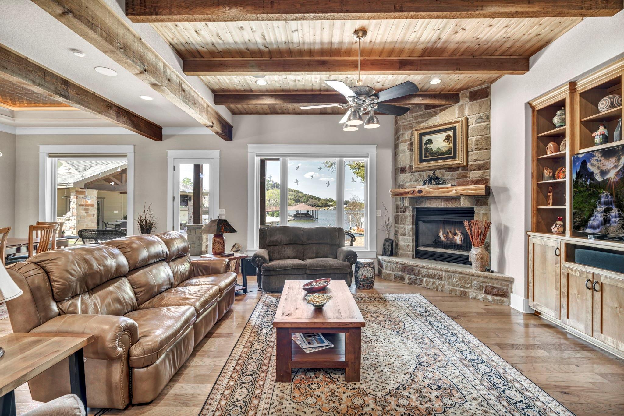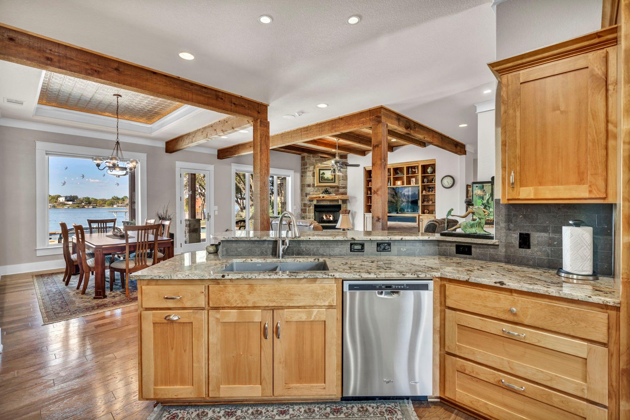 Location. Location, Location on Lake LBJ. Located in the highly sought after Blue Lake Estates, this exquisite lakefront home combines a first-class design with beautiful craftsmanship and finished with an unsurpassed attention to detail. The main house has three bedrooms downstairs each with an ensuite bath. A fabulous, split floor plan offers an expansive lakeside owner's suite with a sitting area to enjoy water views. A bonus room upstairs in the main house has a half bath and could be used a bedroom, exercise room, or would be perfectas a media room. The main living, kitchen, and dining blends living space with lake views. A detached casita offers an additional 420square feet of living with a kitchenette, a large bedroom with lake views, and a full bath. The third garage bay was designed for a smal RV. It has a twelve foot garage door, sewer dump station, and a 30 amp outlet. There are almost too many features to list but include a studio with a glass garage door, a fenced yard with a sprinkler system and garden area, a 25 foot covered boat dock with a touchless boat cover, an abundance of storage throughout, over 90 feet of lake frontage per the county, an oversized utility room with built in cabinetry and a large sink, and propane on site. The composition roof was replaced in December, 2023, exterior of main house and guest house painted in Summer, 2023 and garage floor was painted in February, 2024.. Boat is available one separate bill of sale.