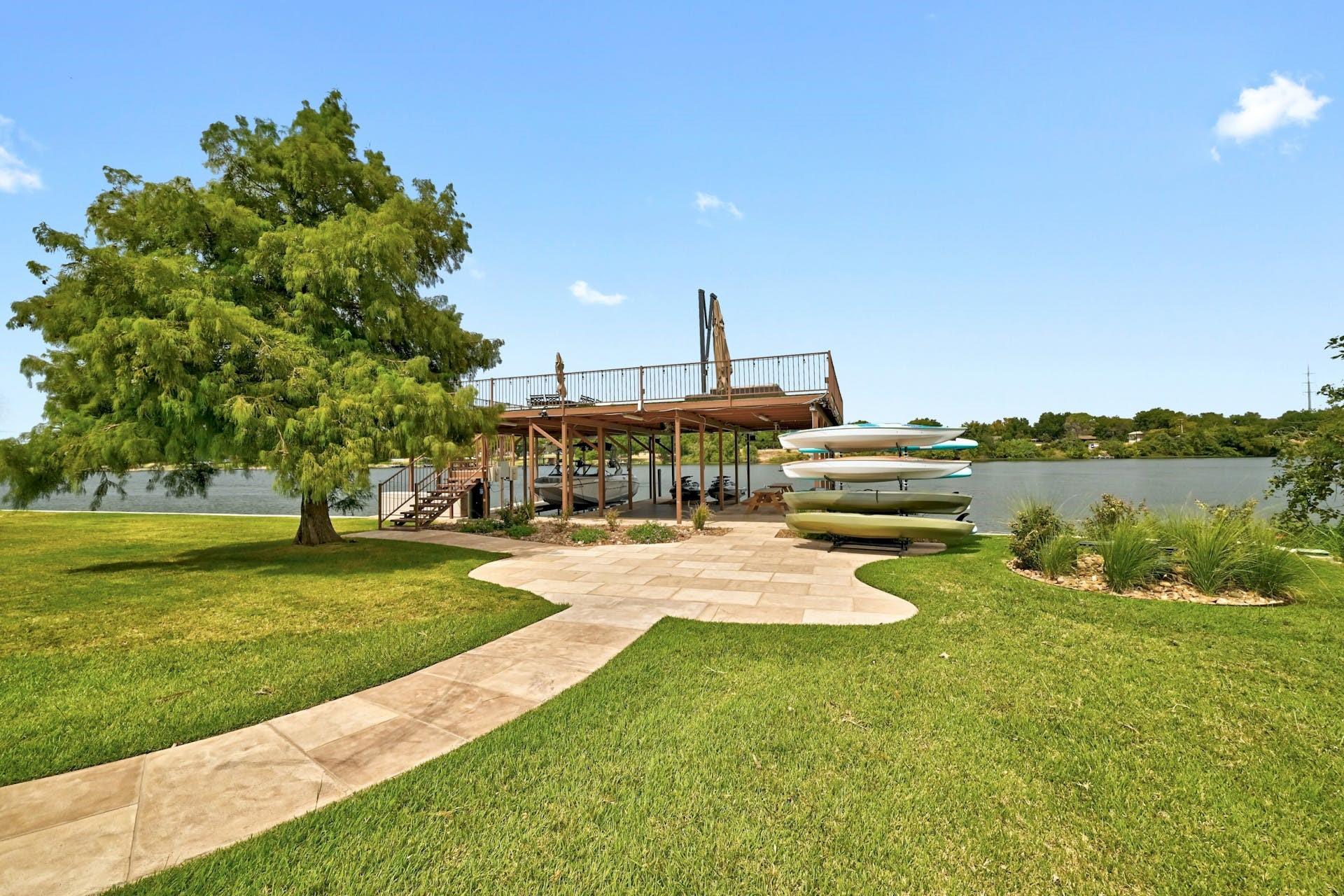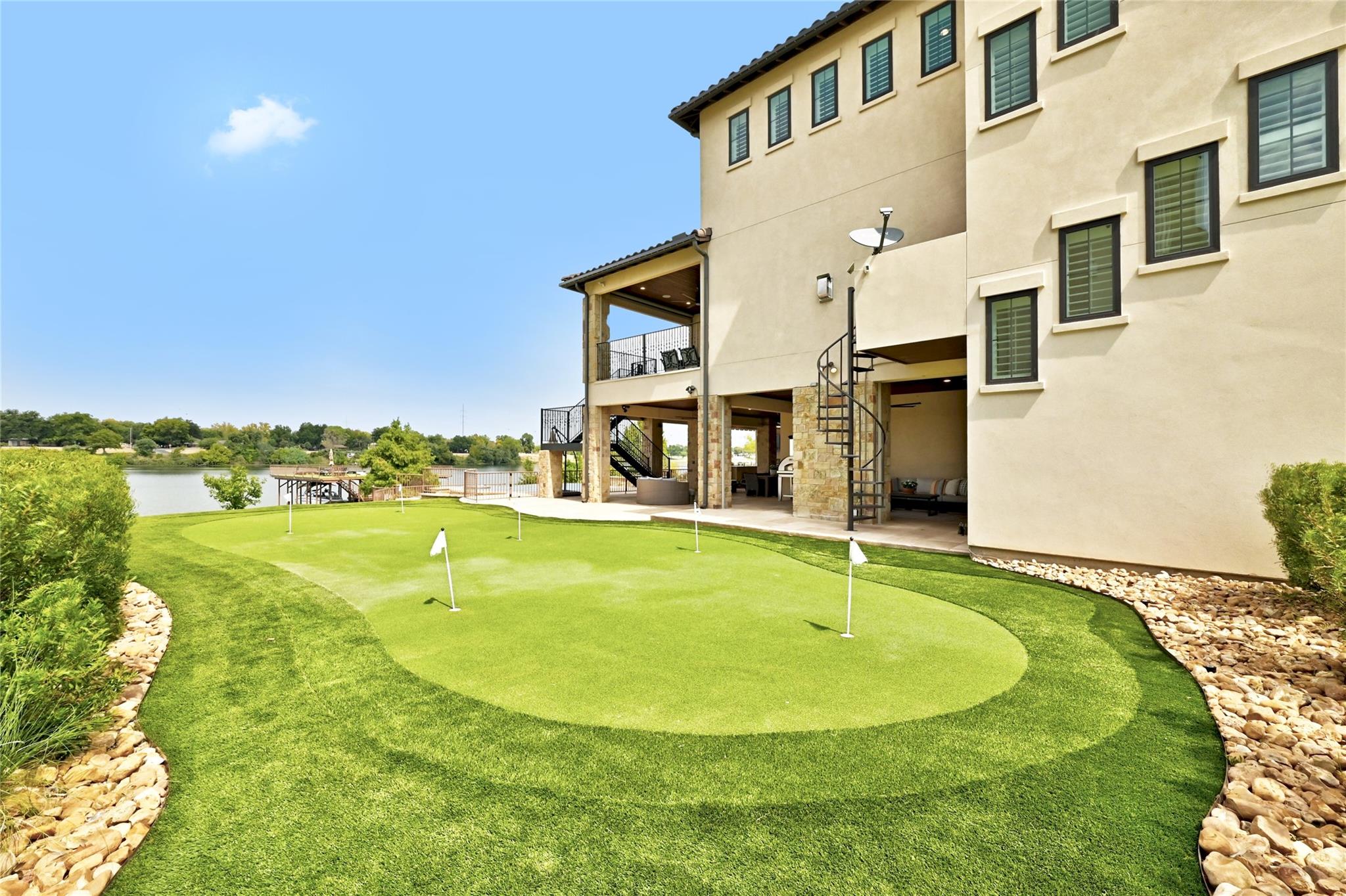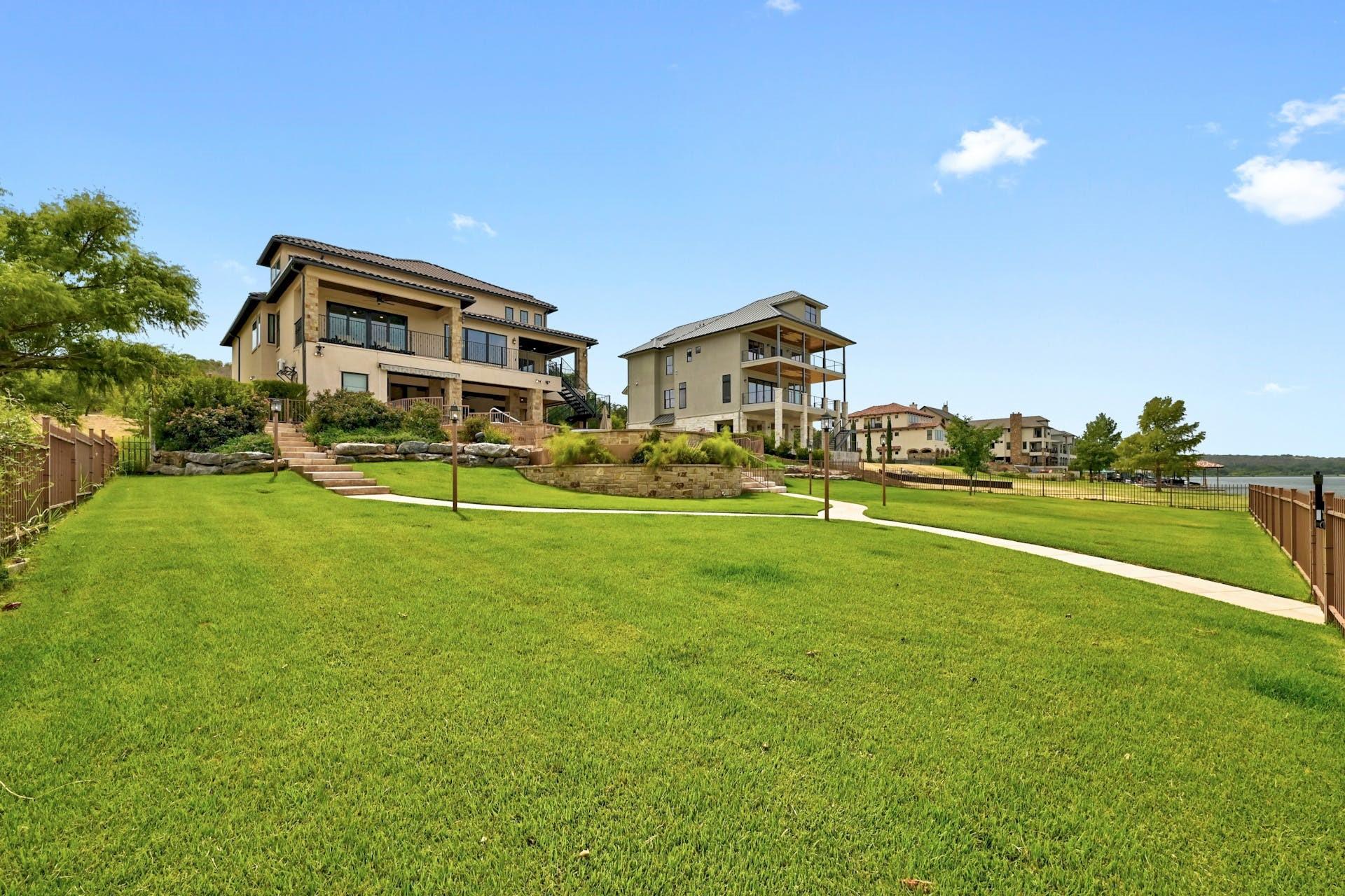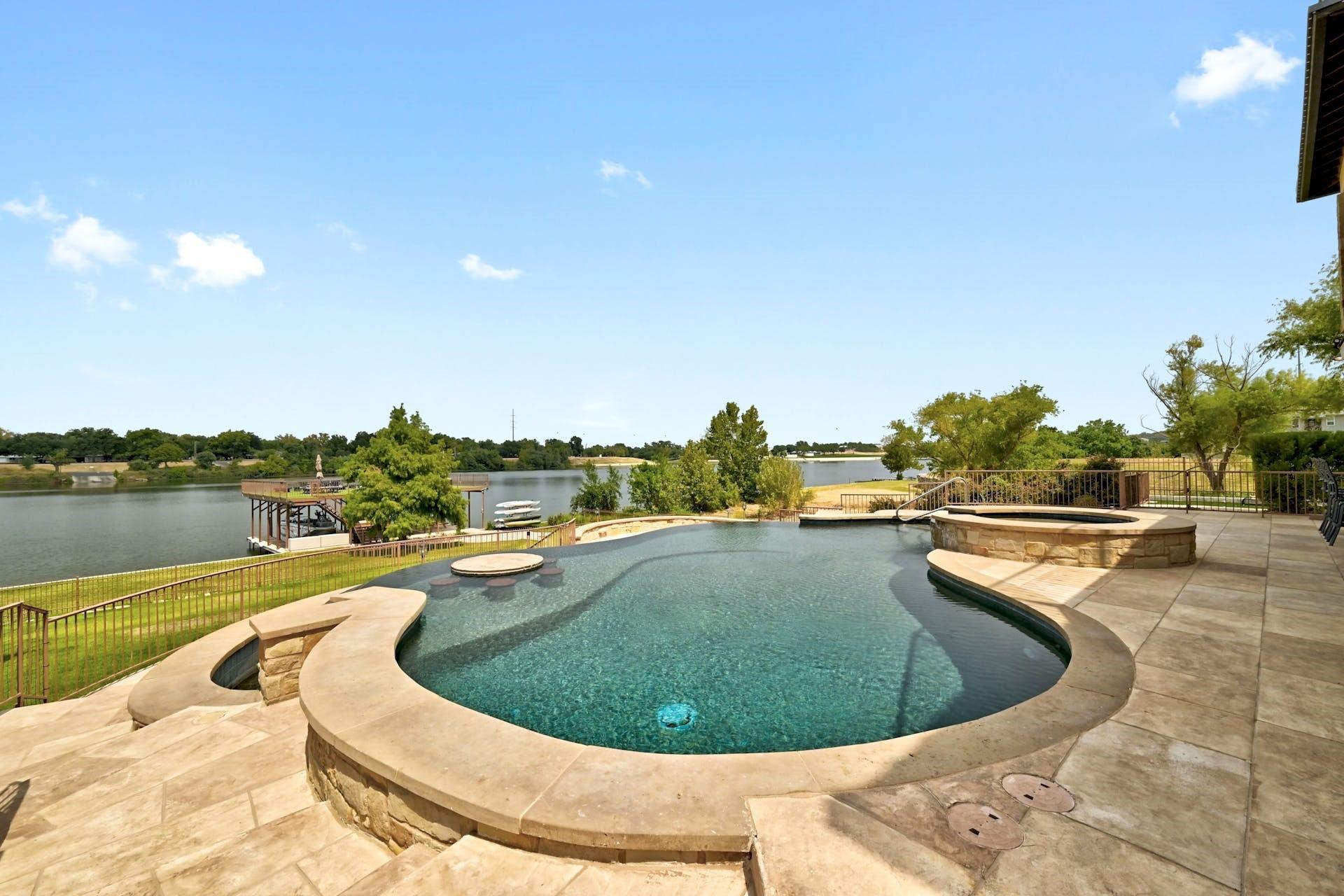 This magnificent lakefront retreat epitomizes luxury living at its finest. With over 4,800 square feet of exquisitely designed living space and sprawling across a lush 1.14-acre double lot, this home offers an unparalleled blend of modern elegance, outdoor recreation, and serene waterfront living. Stepping through the impressive front entrance, you are greeted by a modern and sophisticated interior. The open-concept design seamlessly connects the living spaces, allowing for an effortless flow of natural light and panoramic lake views making hosting dinner parties or casual gatherings a breeze. The home boasts four generously sized bedrooms, each with its own full bathroom, as well as two additional half bathrooms providing comfort and privacy for residents and guests alike. The jewel in the crown of this property is the infinity pool that seems to merge with the lake's horizon. It's a tranquil oasis where you can unwind and soak in the sun. The two-story boat dock offers easy access to the water, perfect for water sports enthusiasts or those seeking a leisurely day on the lake. With its modern amenities, and unparalleled outdoor spaces, this lakefront home is a sanctuary of relaxation and luxury. Whether you're gazing at the breathtaking sunsets from your infinity pool or perfecting your golf game on the putting green, this property is a dream come true for those seeking the ultimate waterfront lifestyle. Centrally located a short distance from downtown Marble Falls and its amenities and within a small gated community which offers lock and leave options for the busy buyer, this property is a must see.