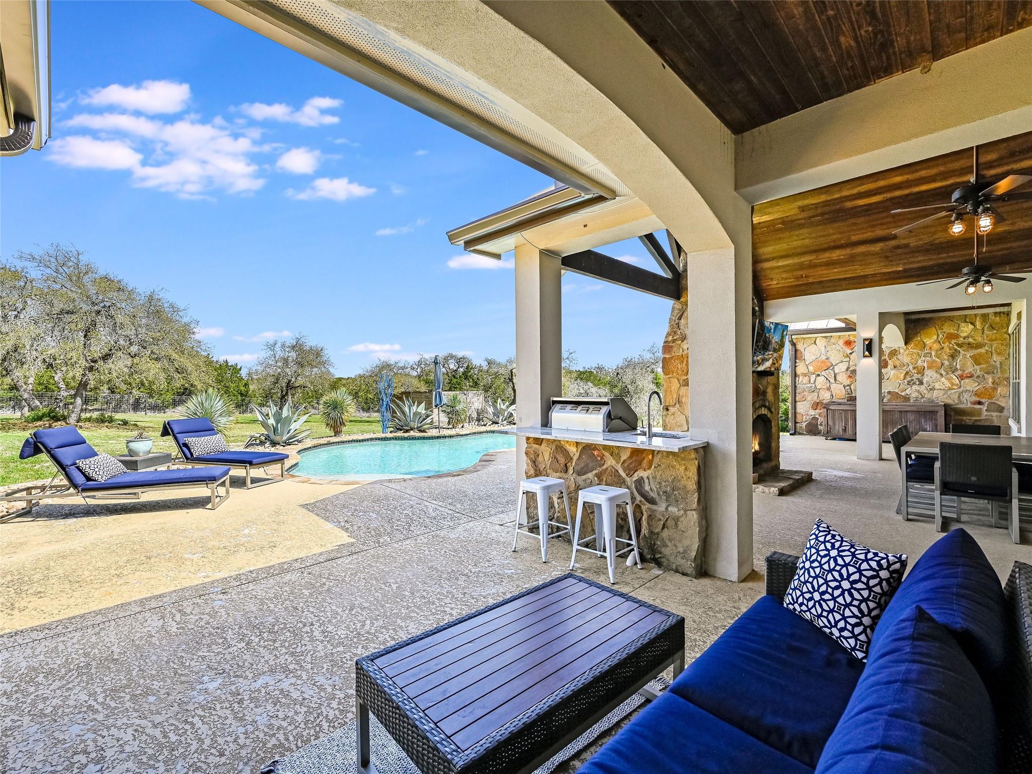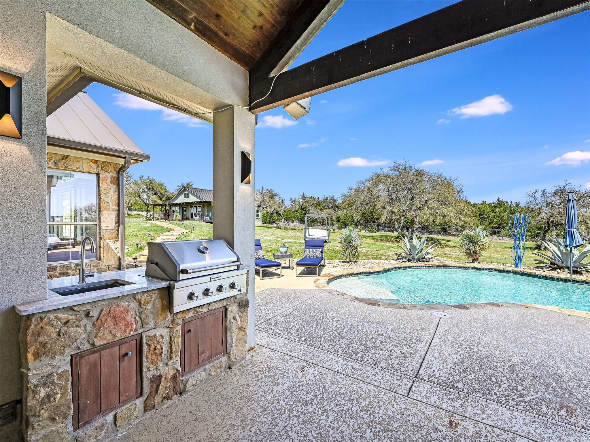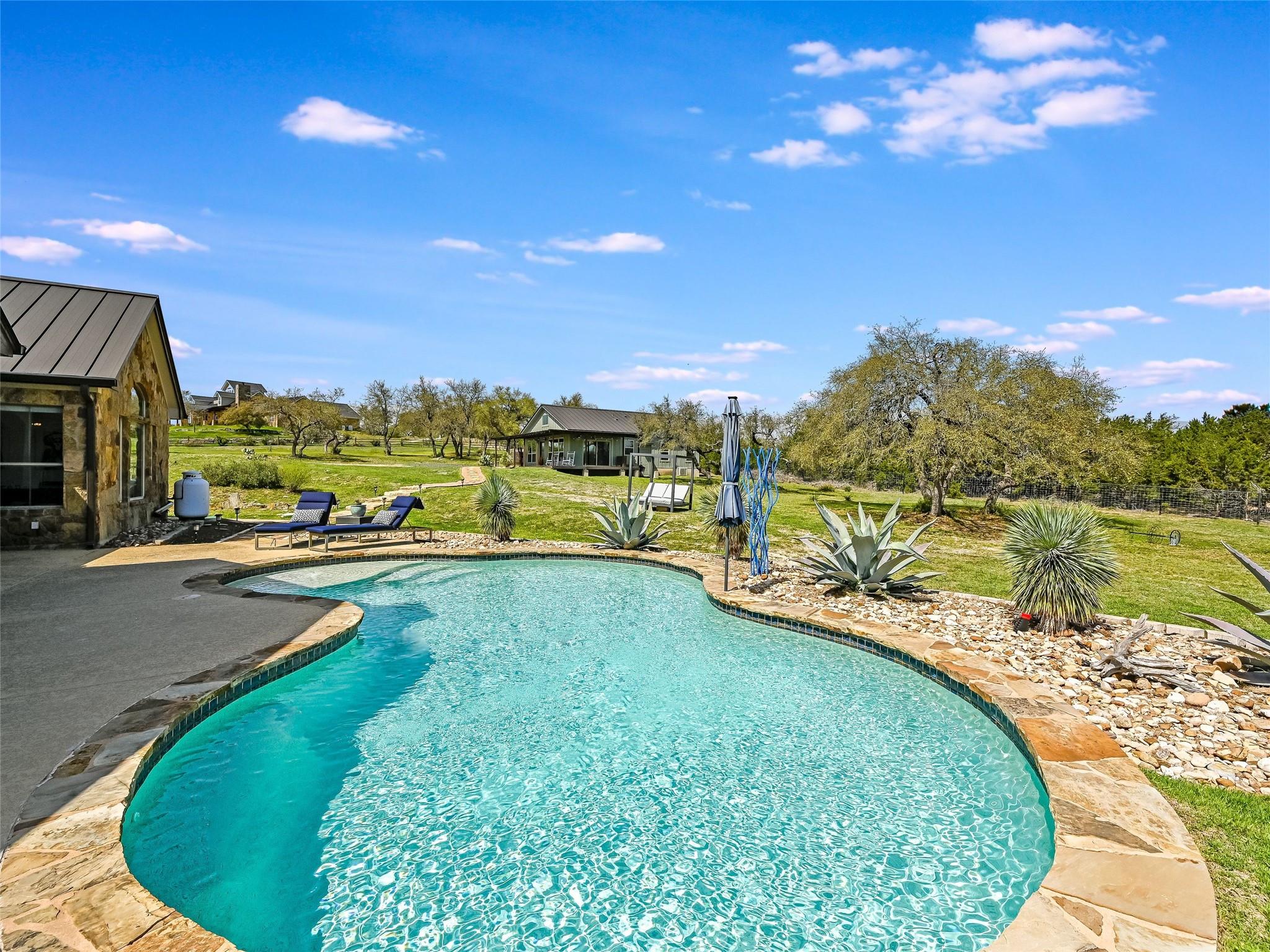**Discover Your Hill Country Haven!** This stunning residence offers over 4,300 sqft of living space in the main home, complemented by a spacious 1,162 sqft, 2-bed guest house, a pool, and an expansive outdoor area perfect for year-round entertaining. Situated on over 2 acres in a serene gated community off scenic Fitzhugh Rd, the main house features mostly one-story living with 4 beds, an office, 3 full baths, a Jack-and-Jill bath, and a powder room. A spacious upstairs game room can easily transform into a 5th bedroom with an ensuite bath or a garage apartment above the 3-car garage. The grand entrance, flooded with natural light and vaulted ceilings, is perfect for gatherings inside and out. Relax on the large covered back patio with a fireplace, outdoor kitchen, and pool. The gourmet kitchen, the heart of the home, boasts a new prep kitchen/pantry with a second dishwasher, wine fridge, and full-size secondary refrigerator for added convenience while entertaining. The newly updated primary retreat features spa-like amenities, including a 6’ soaker tub and oversized walk-in shower. Additional highlights include solid hardwood flooring, updated baths with quartz countertops and floor-to-ceiling tile, and smart home upgrades like a Tesla wall charger, commercial grade dual-WAN network, indoor and outdoor speakers, and motorized shades. Conveniently located between Austin, Dripping Springs, and Bee Cave, this home offers luxury living in the Hill Country with city conveniences. With over $200K in recent upgrades, the Hill Country Haven is truly a one-of-a-kind gem.