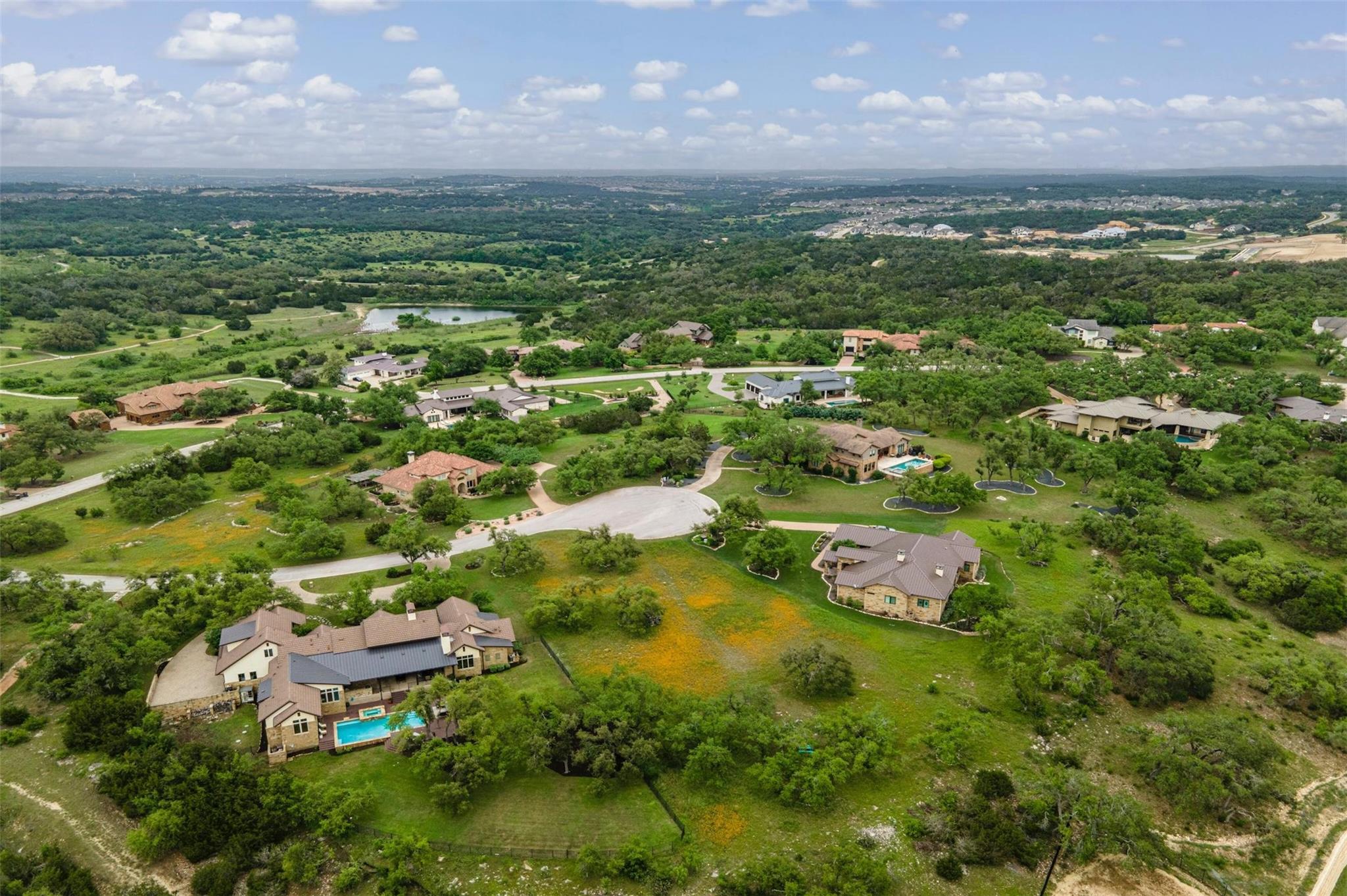 Experience the epitome of Hill Country living in the highly coveted Belvedere community, just a short drive from Austin. This sprawling estate has a vast floorplan that encompasses the predominantly single-story layout. Fresh updates include new flooring, paint & more, adding contemporary flair to the classic stone & beam accents thru out. No detail is overlooked in this meticulously designed home. Step outside to discover the extraordinary outdoor living area, complete w a spacious covered patio, fireplace, built-in grill/green egg, & kitchen. The expansive bkyd offers panoramic views , creating a serene oasis to call home. Inside, the kitchen exudes warmth & charm w its inviting ambiance & striking island adorned w exquisite pendant glass bulbs. Seamlessly connected to the open great room, it creates the perfect setting for gatherings. Entertaining is a breeze w the built-in bar, featuring glass encased cabinetry, sink, & storage. Additionally, the spacious private office adjacent to the primary suite offers a space for productivity. Each bedroom is a retreat w its own en suite bath. The oversized mudroom & laundry room, conveniently located off the garage, ensures organization. Speaking of the garage, it's a car enthusiast's dream w custom painted flooring & ample space. Upstairs, a bonus room w a full bath provides for an add'l bedrm, media, or home gym. Placed w/in the prestigious Belvedere community, this home is part of an exquisite luxury subdivision renowned for its elegance & sophistication. Residents enjoy access to top-rated schools in the highly acclaimed Lake Travis School District. W/in the neighborhood, walking trails wind through the picturesque landscape, while a lazy river pool & park offer leisurely escapes just a few blocks from your doorstep. Additionally, convenient to shopping, entertainment & schools means that everything you need is just minutes away. **Adjoining lot (MLS# 9255011) is also for sale. **