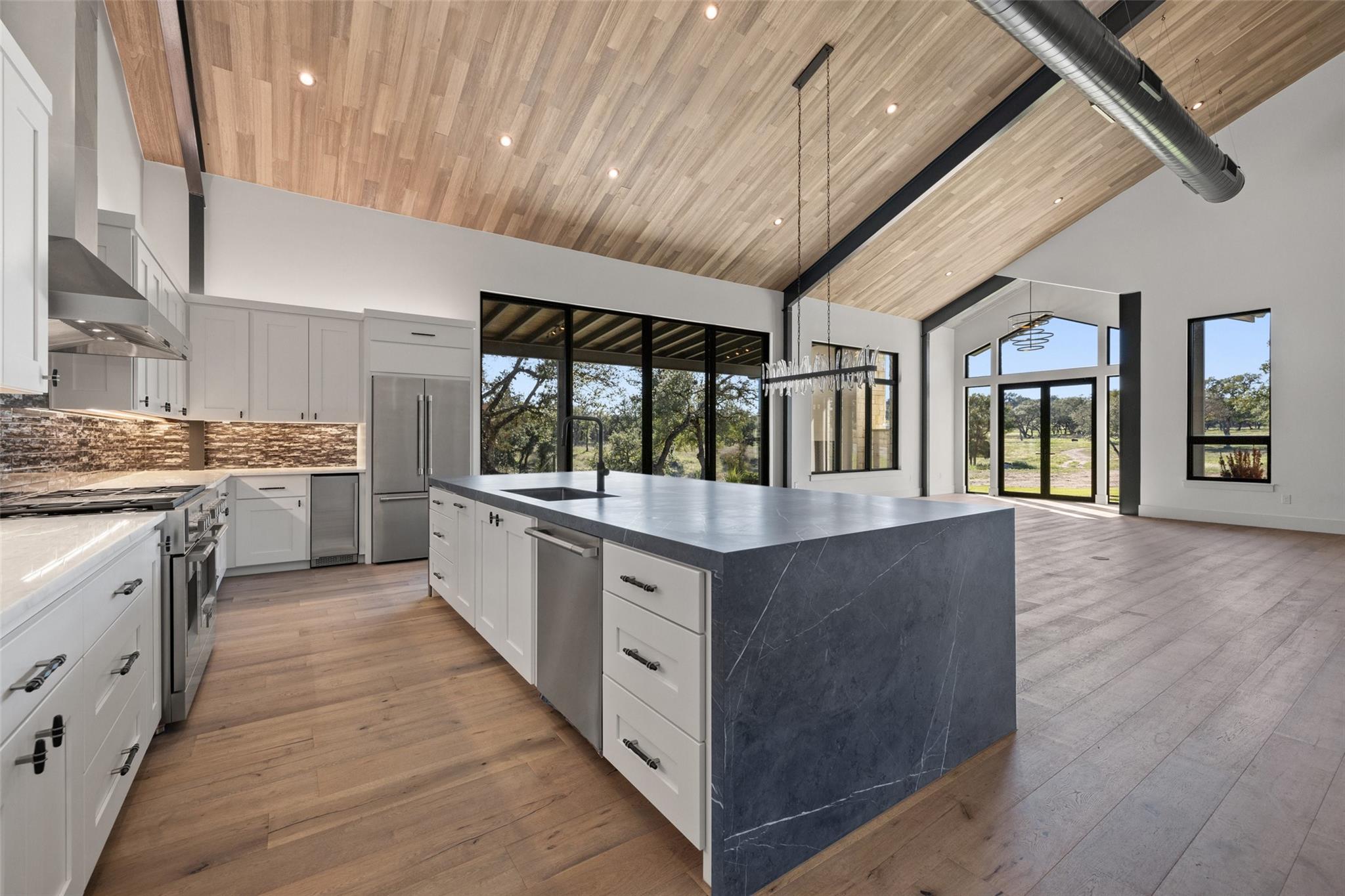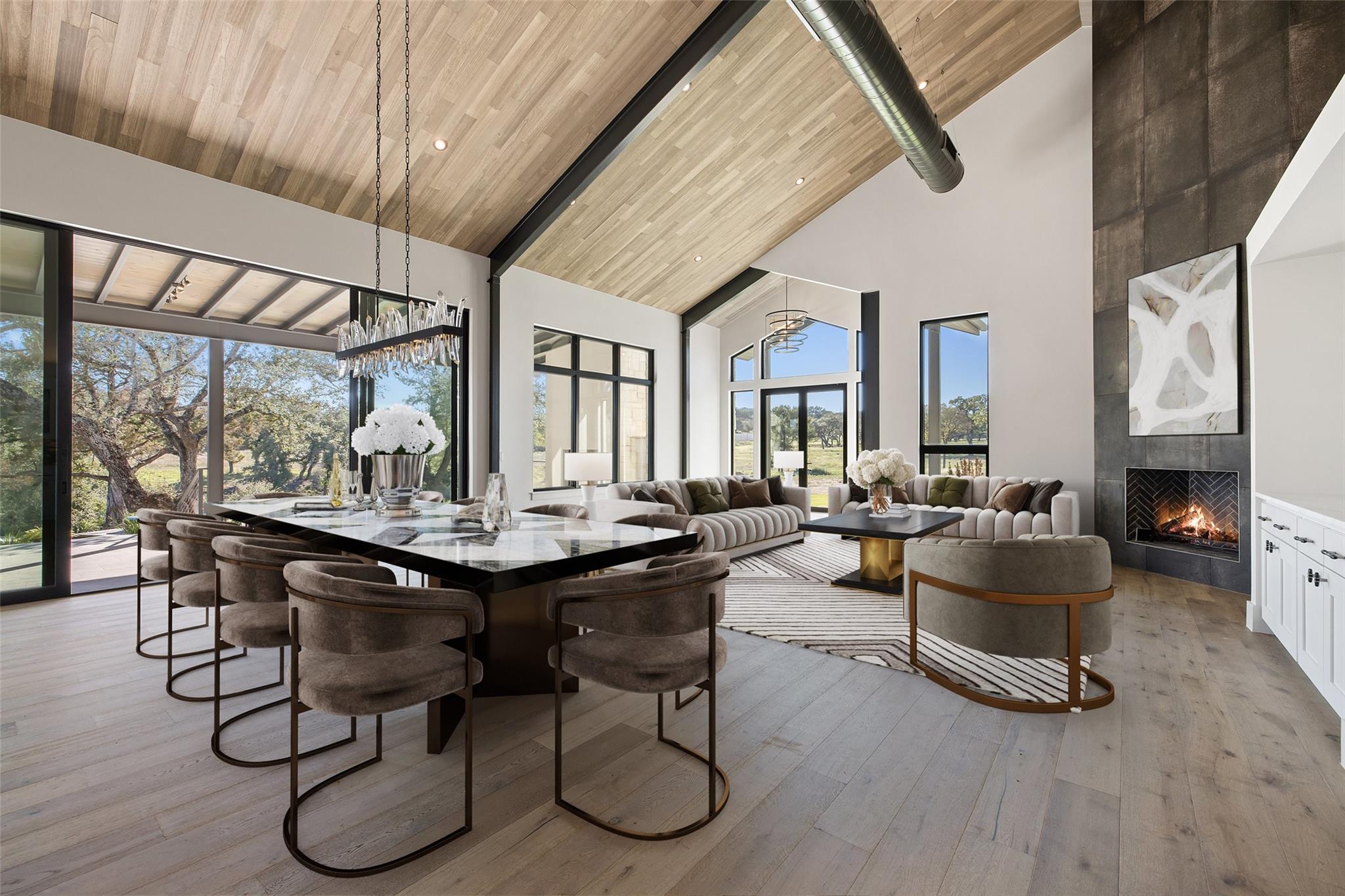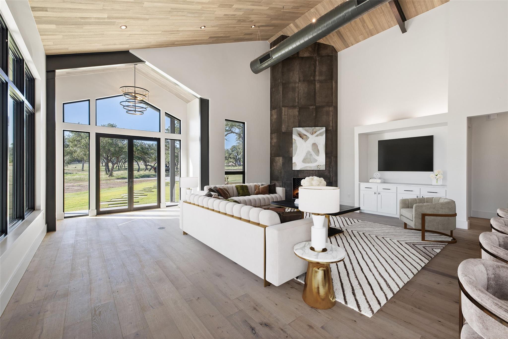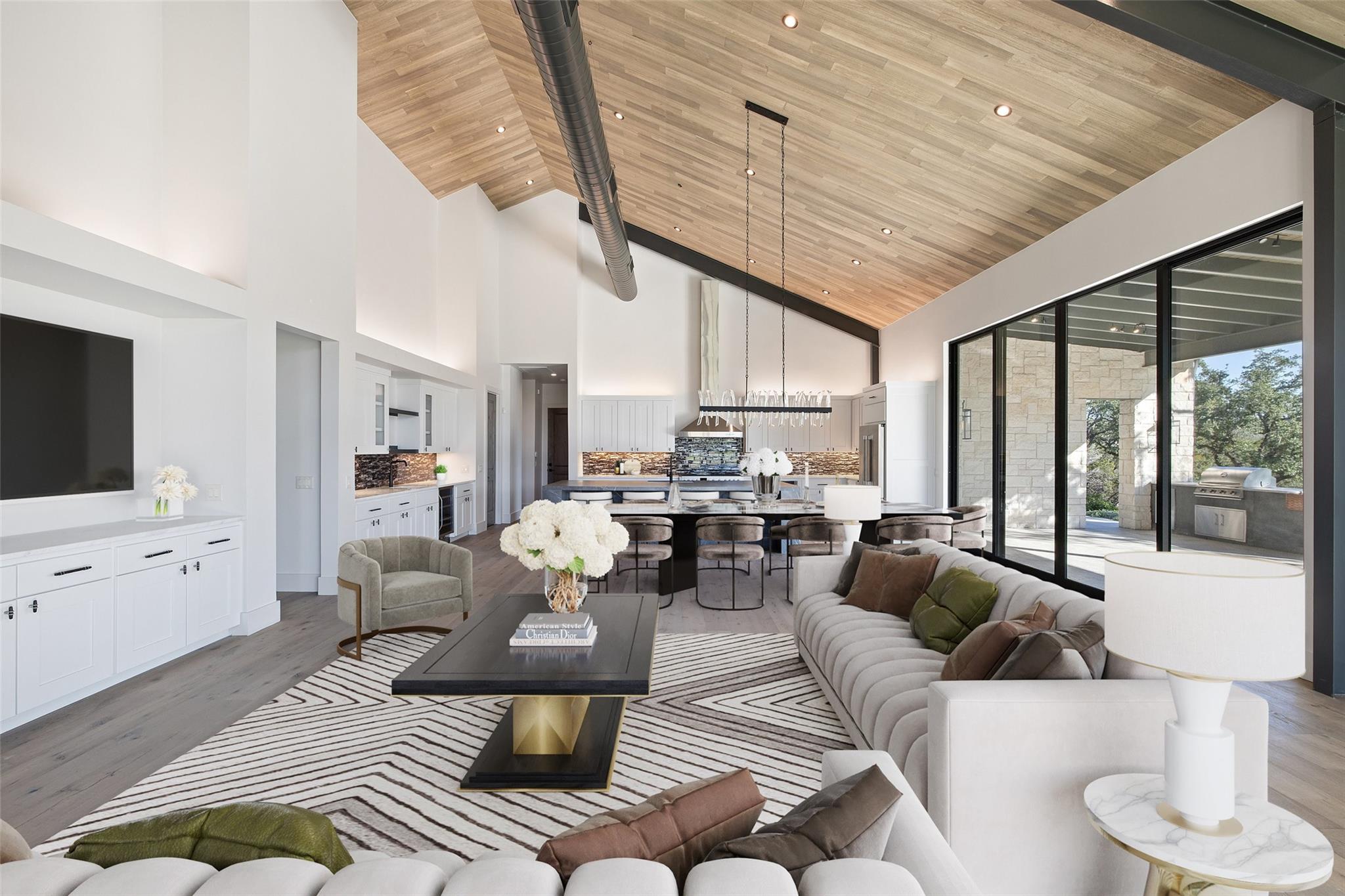 This Hill Country Modern, new construction, move in ready estate is situated on 8 plus acres in one of the top ten wealthiest zip codes in Texas, 78669. Welcoming you on arrival is a custom gated entrance opening to a stunning paver blocked driveway that leads to the oversized 2 car garage and additional guest parking off the main entrance. Approaching the front entrance via the staggered garden stones take note of the large windows flanking the modern French entry doors. The interior boasts an expansive open concept with wide planked wood floors throughout, designer cathedral ceilings highlighted by exposed iron beams, sleek industrial ductwork, and a grand fireplace accompanied by a built in entertainment cabinet. Speaking of zip codes, the kitchen island may need its own! Made of “porcelanna", it’s the centerpiece of the eat in style kitchen and open living concept. The kitchen offers all the amenities a chef could ask for including wet bar & wine fridge. Anchoring the open concept are panoramic doors which open to the covered patio allowing for the indoor/outdoor flow to continue. For relaxing on those gorgeous Texas nights the exterior offers an outdoor kitchen with built in grill, recessed fire pit, and spa/hot tub tucked under a couple magnificent trees.The home has 3 bedrooms, 3 full baths, half bath, utility room, plan allows for an additional office. The home is serviced by Windermere Water Supply, but also has a well for irrigation with a 3,000 gallon storage tank. With 8 plus acres there’s room for an additional dwelling unit, shop, pool, or sports court. Conveniently located to Spicewood Airport, numerous vineyards, Iron Wolf Distillery, Krause Springs, Muleshoe & Pace Bend Parks, multiple golf courses, and beautiful Lake Travis. Shopping, dining, and entertainment in either direction with Marble Falls to the West and Bee Cave/Lakeway to the East. Both within 20 minutes. If 8 acres isn't enough, there are two, 4 acre adjoining lots also available!