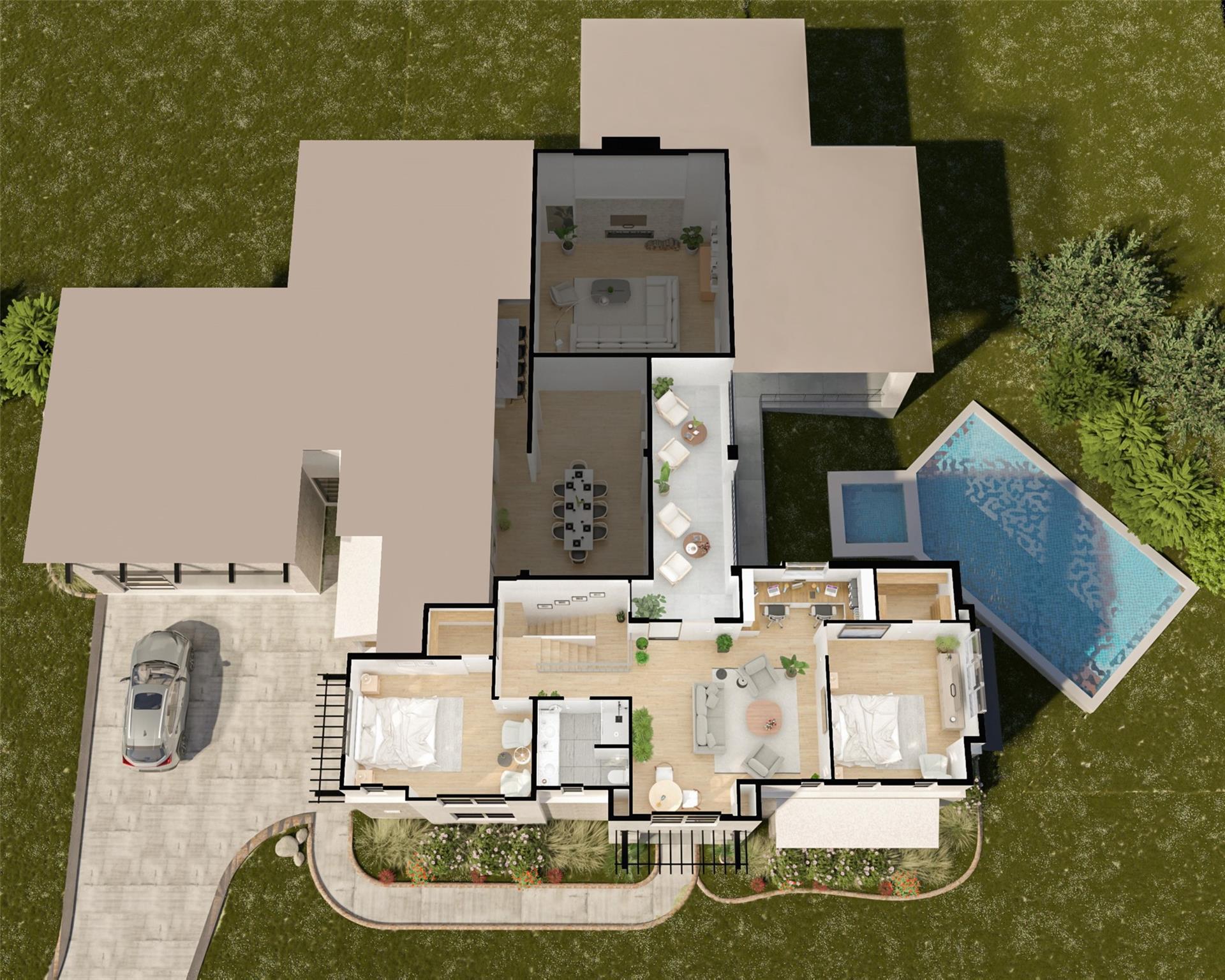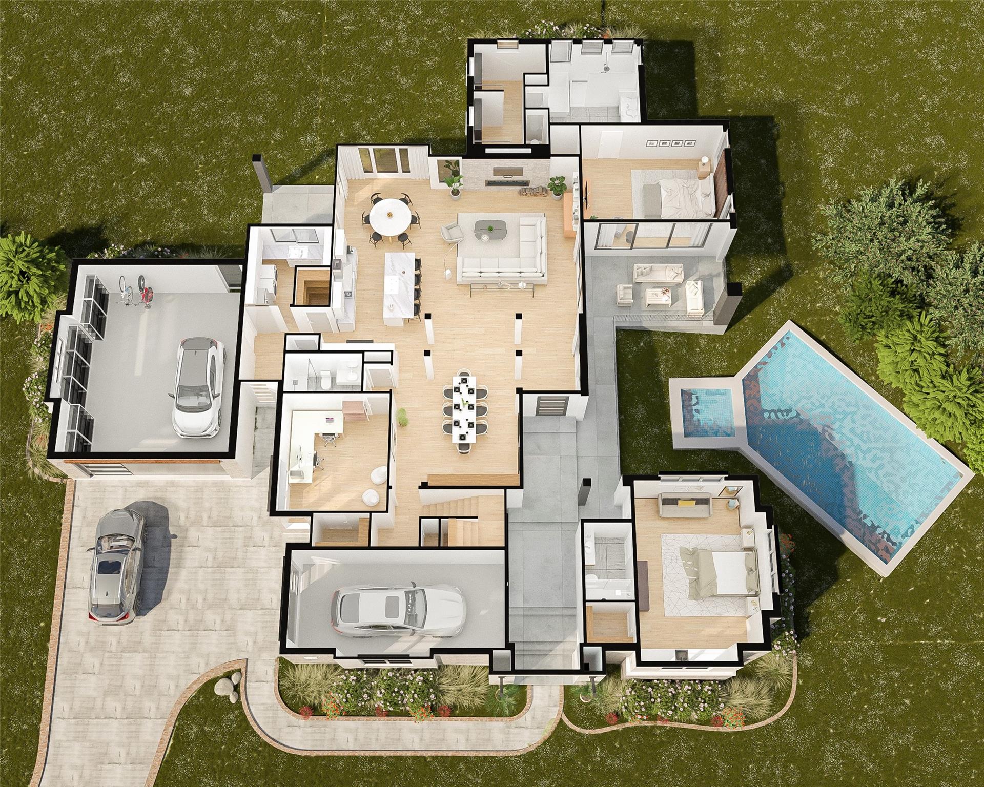 Pass through the expansive breezeway into this thoughtfully designed Rough Hollow home. This custom ready-to-be-built floor plan offers everything you could imagine, including guest quarters for multigenerational living. With five bedrooms and five baths, this home provides ample space for family and guests. Beyond the main entrance, you'll find a great room with soaring cathedral ceilings and a stately fireplace, creating a perfect environment for entertaining.The home's design ensures a perfect blend of indoor and outdoor living with magnificent folding glass doors in the great room that open to the pool area. The gourmet kitchen features a spacious 48-inch range, built-in refrigerator, a large island, and a walk-in pantry. Adjacent to the kitchen is a cozy breakfast nook that opens to side yard. The primary bedroom boasts an expanse of glass doors that open to poolside, enhancing the seamless indoor-outdoor living experience. Cathedral ceilings add to the spaciousness of the room, while the luxurious primary bath features a large tub, an oversized shower, dual vanities, and dual closets. Guest quarters on the first level include a spacious room complete with a kitchenette, walk-in closet, and ensuite bath, offering privacy and comfort. Other amenities include a spacious dining room, expansive laundry room which includes space for an additional refrigerator and sink. The property also features two separate garages—a two-car garage and a one-car garage, along with a convenient mudroom for shoes, backpacks, and other essentials needed at the highly coveted Lake Travis Independent School District. Additionally on the main level, you'll find another ensuite bedroom/dedicated office, providing further versatility. The second level has two large bedrooms with walk-in closets, a loft space, a computer niche, and a fifth bathroom, ensuring ample living space for the entire family.