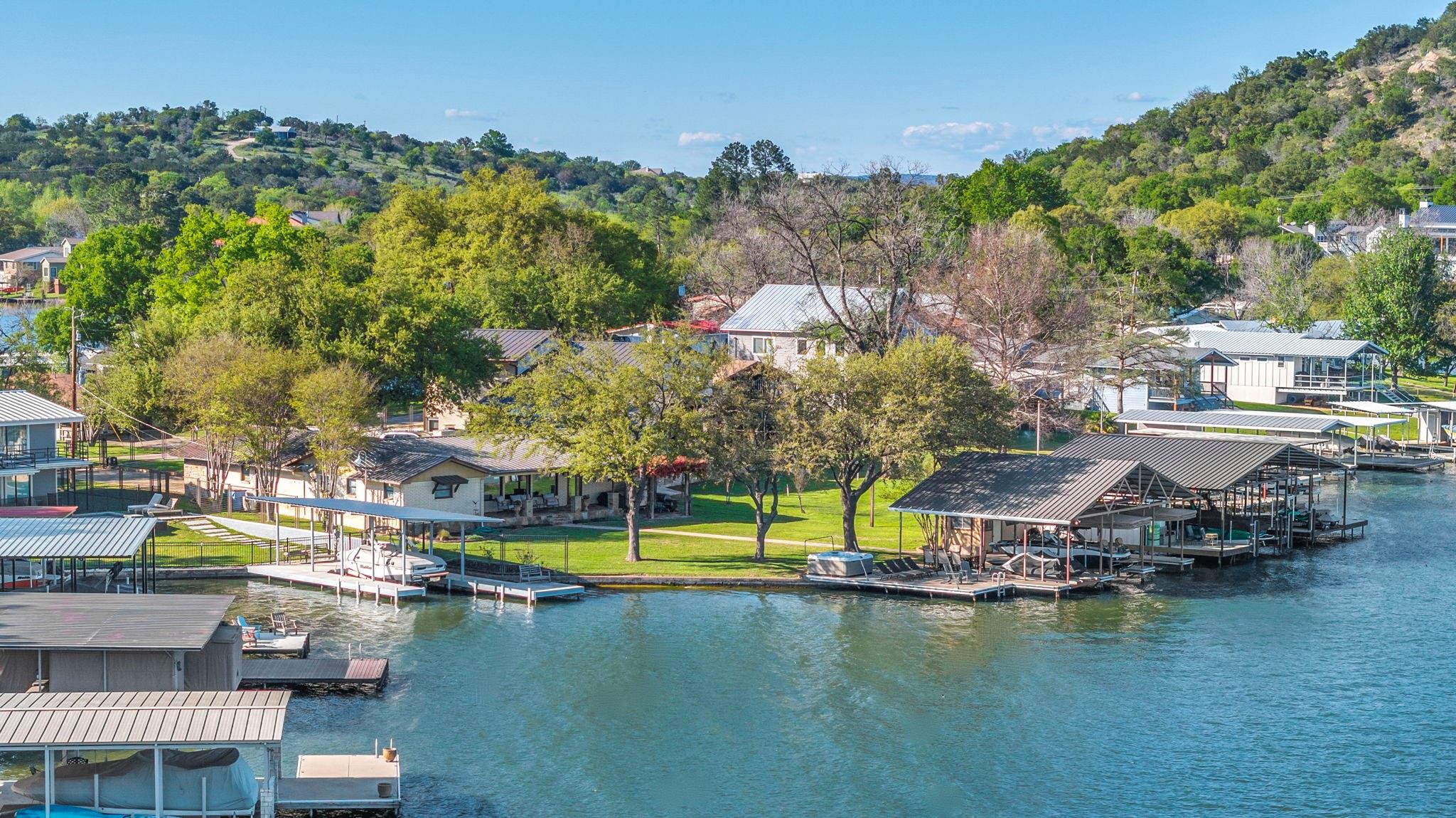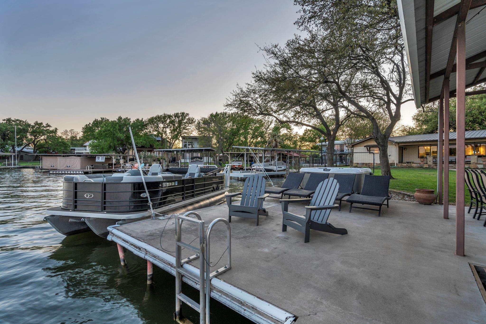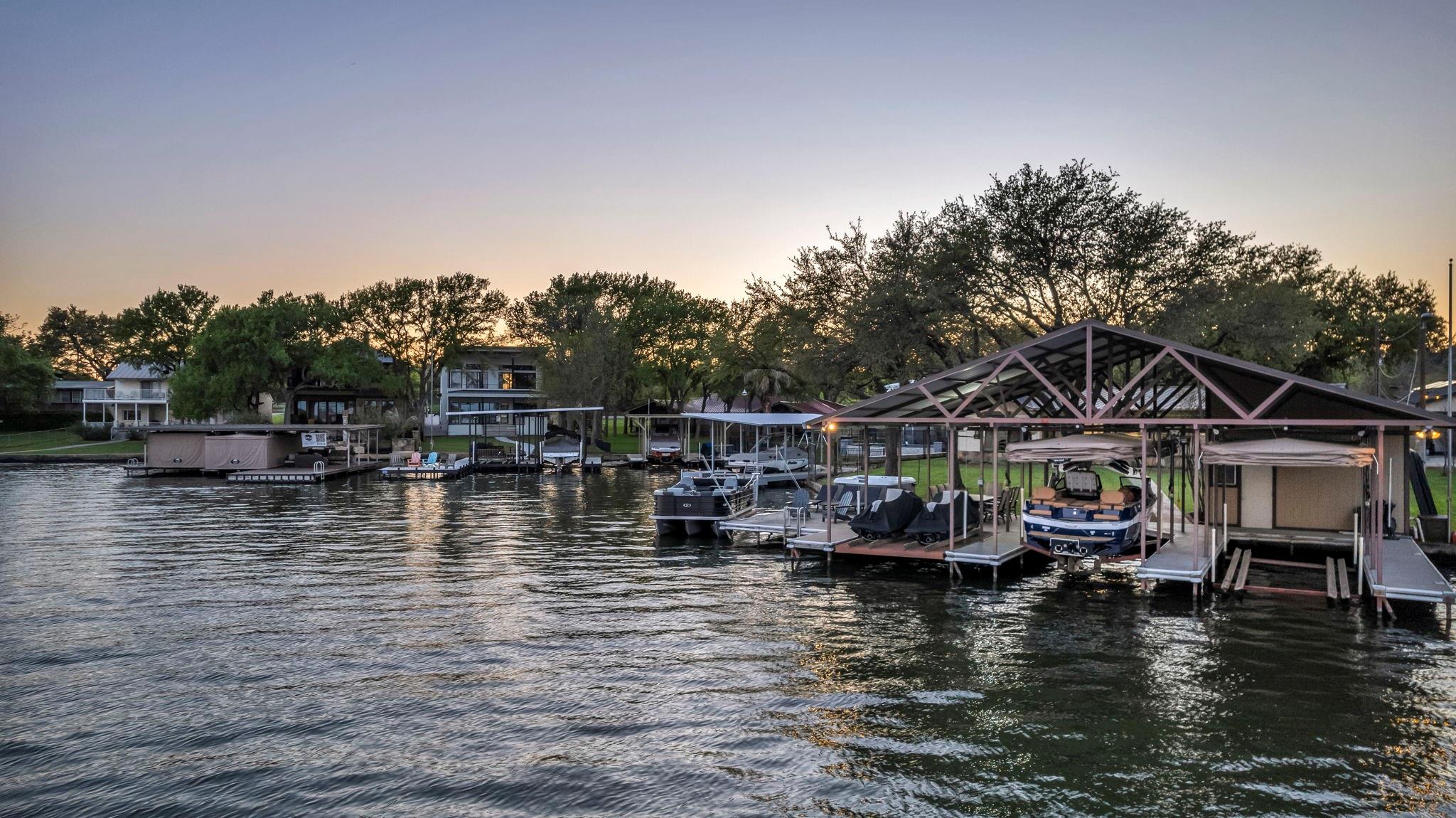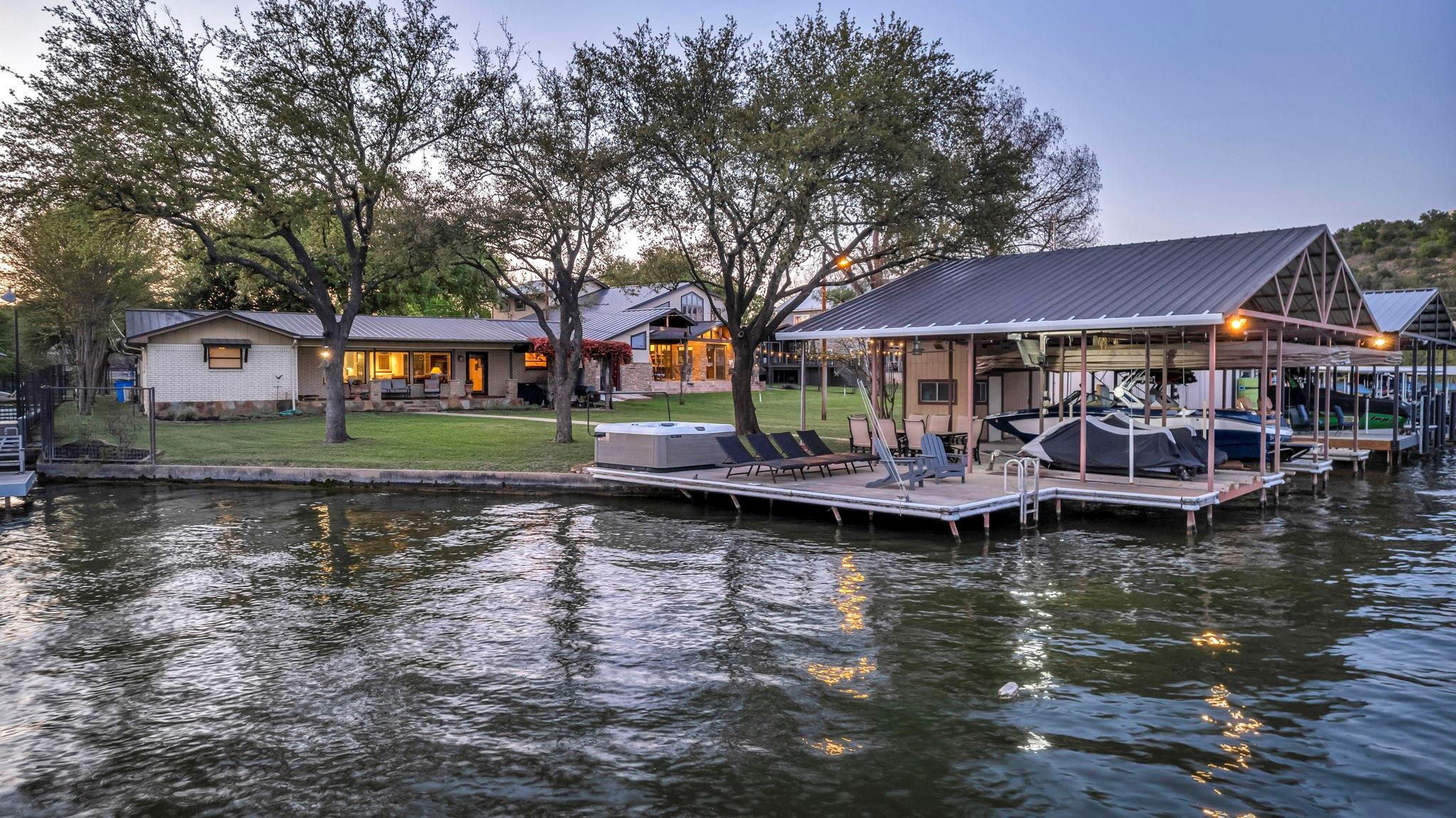 Experience 133 ft of prime East-facing Lake LBJ open waterfront, perfect for swimming, water sports, fishing, paddle boarding, and kayaking. The large boathouse has two tall boat slips with electronic lifts to accommodate tall boats or wake boats, two personal watercraft lifts, storage room, hot tub, additional tie up space for guests, and plenty of seating on the oversized deck. Inside the privately gated property with a large old growth live oak tree, the single-story home features three bedrooms, an office, and three full bathrooms. Incredible lake and Texas Hill Country views are seen through the large windows in the living and dining area, while the primary suite has a large walk in closet and its own private entrance to the large covered lakeside porch. The large bunk room comfortably accommodates guests, and you'll enjoy the multiple storage options throughout the home. With its well-appointed amenities and comfortable living spaces, it presents an exceptional opportunity for lakefront living. Sold fully furnished with a few exceptions. Agent related to seller.