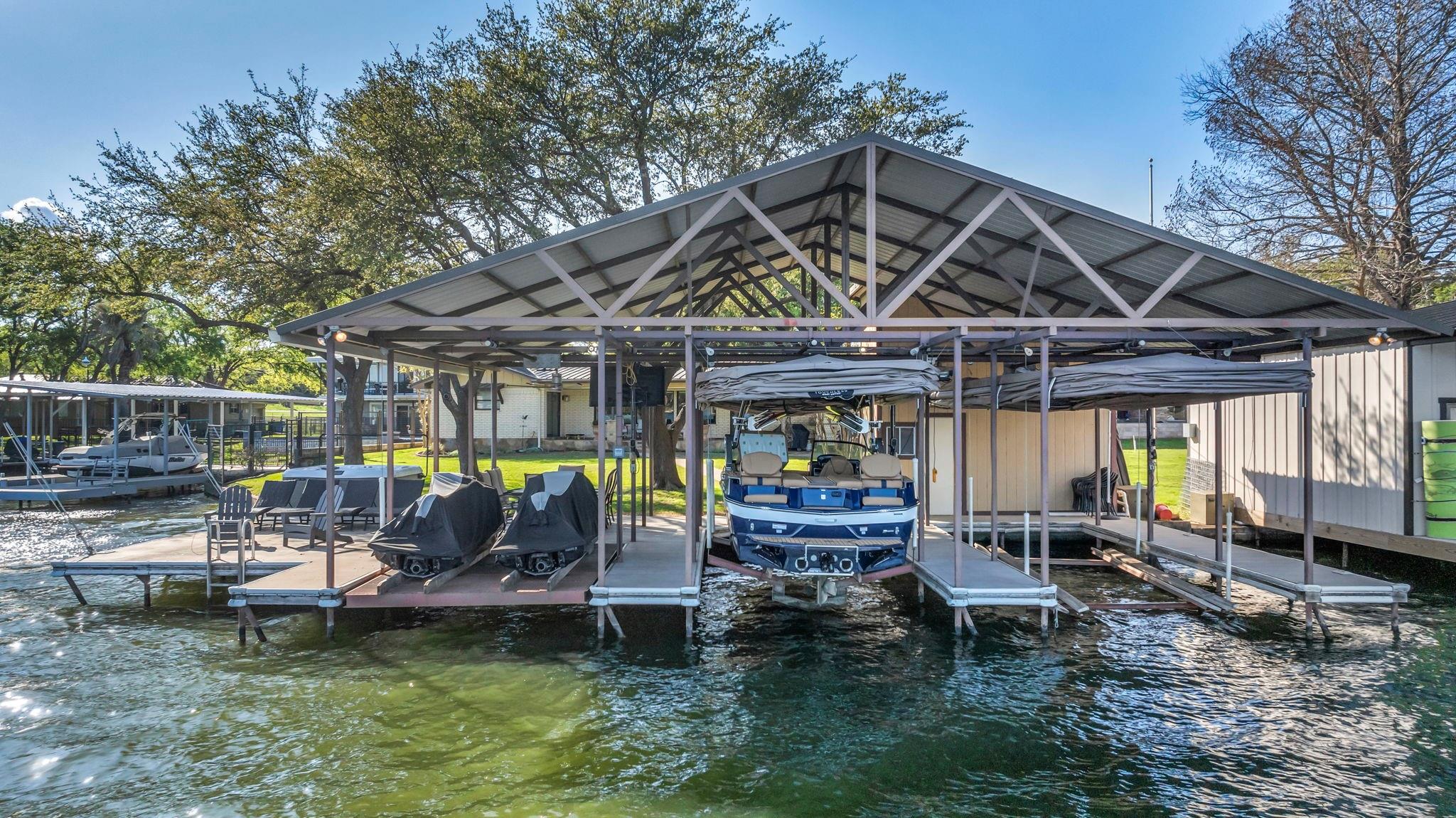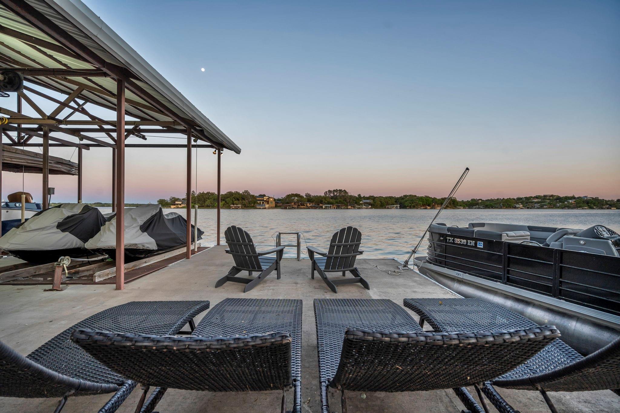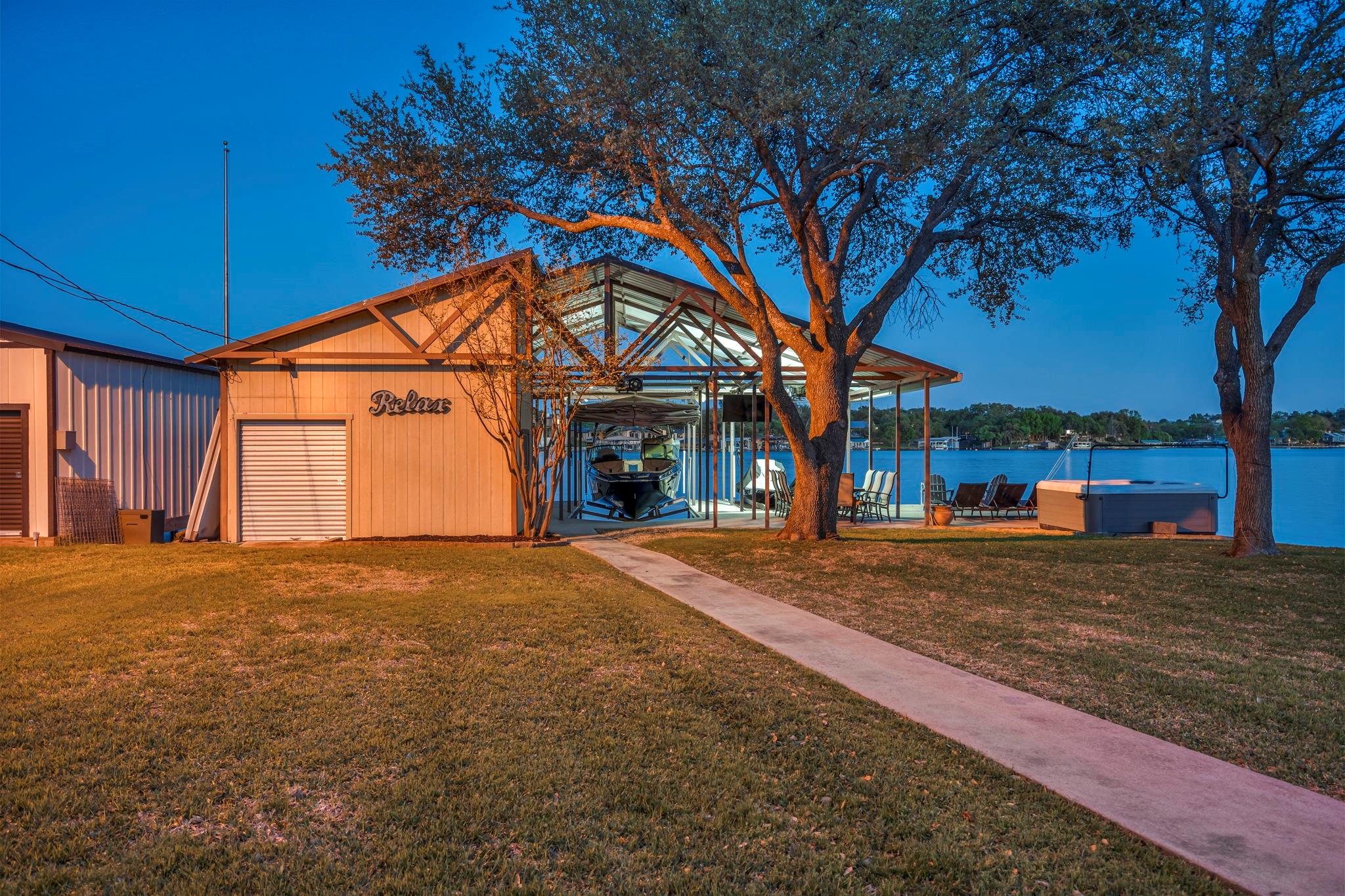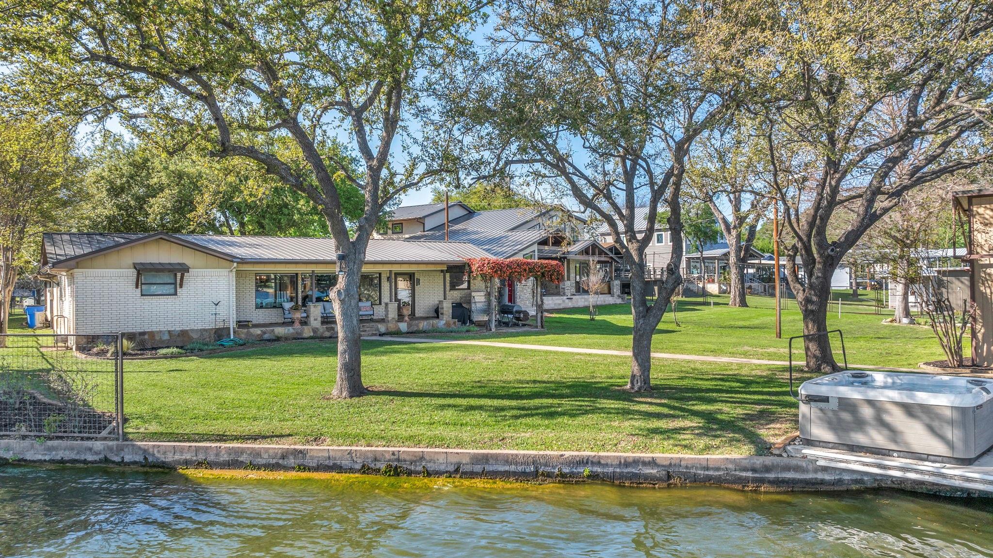 Experience 133 ft of prime East-facing Lake LBJ open waterfront, perfect for swimming, water sports, fishing, paddle boarding, and kayaking. The large boathouse has two tall boat slips with electronic lifts to accommodate tall boats or wake boats, two personal watercraft lifts, storage room, hot tub, additional tie up space for guests, and plenty of seating on the oversized deck. Inside the privately gated property with a large old growth live oak tree, the single-story home features three bedrooms, an office, and three full bathrooms. Incredible lake and Texas Hill Country views are seen through the large windows in the living and dining area, while the primary suite has a large walk in closet and its own private entrance to the large covered lakeside porch. The large bunk room comfortably accommodates guests, and you'll enjoy the multiple storage options throughout the home. With its well-appointed amenities and comfortable living spaces, it presents an exceptional opportunity for lakefront living. Sold fully furnished with a few exceptions. Agent related to seller.