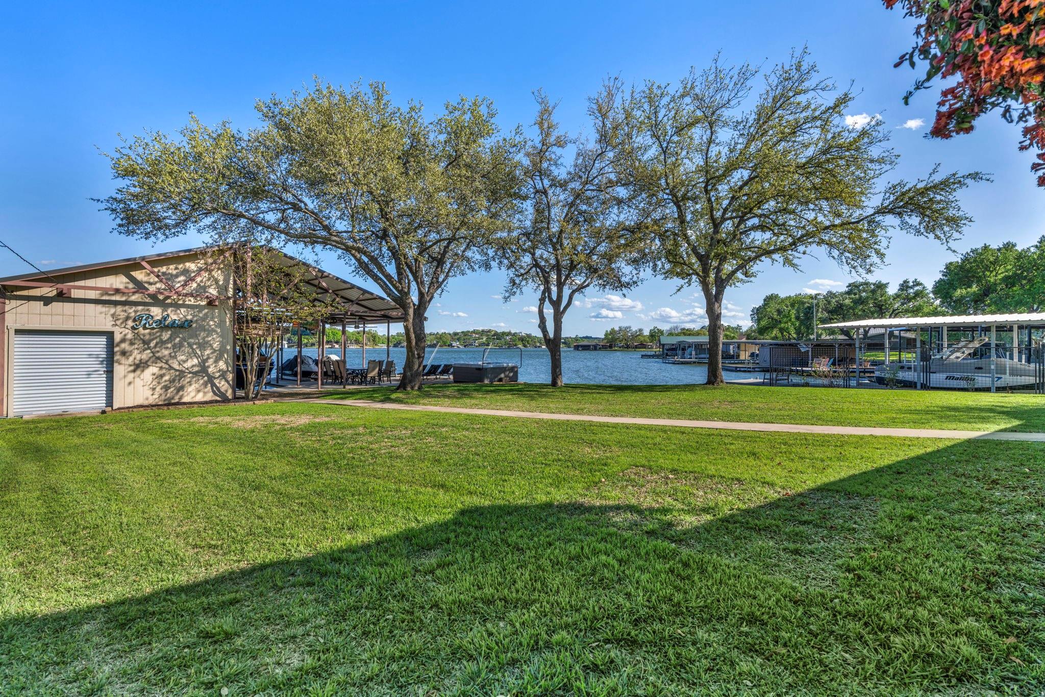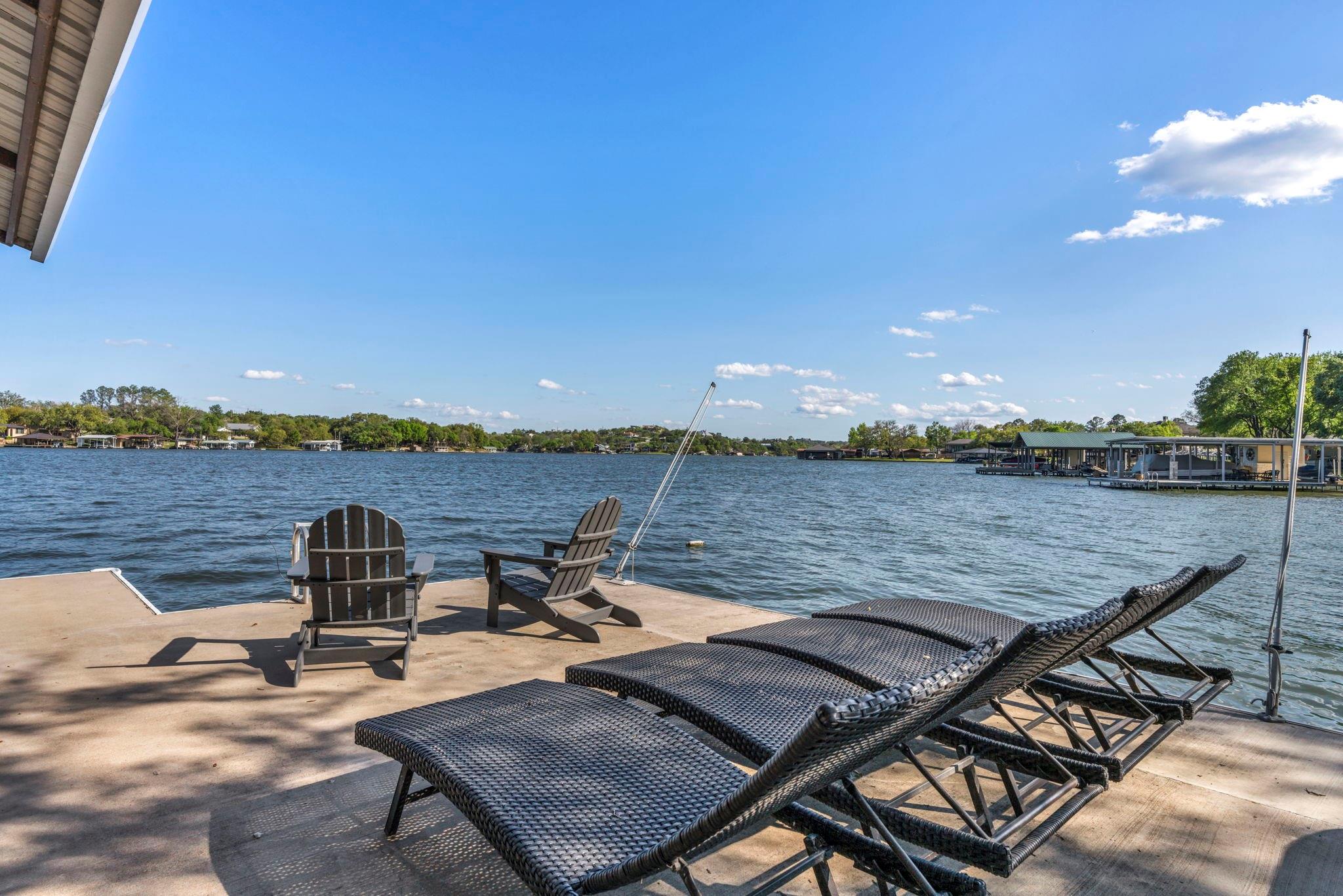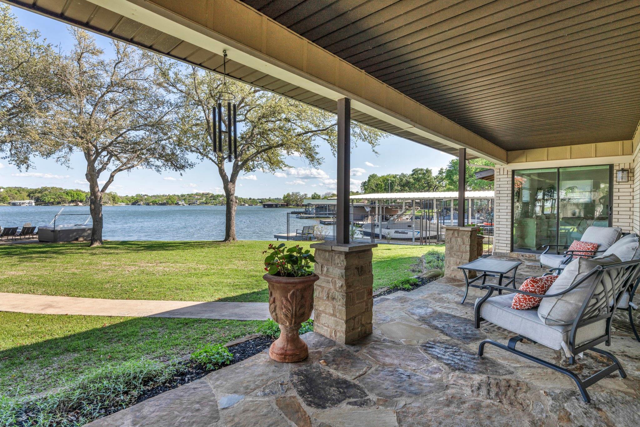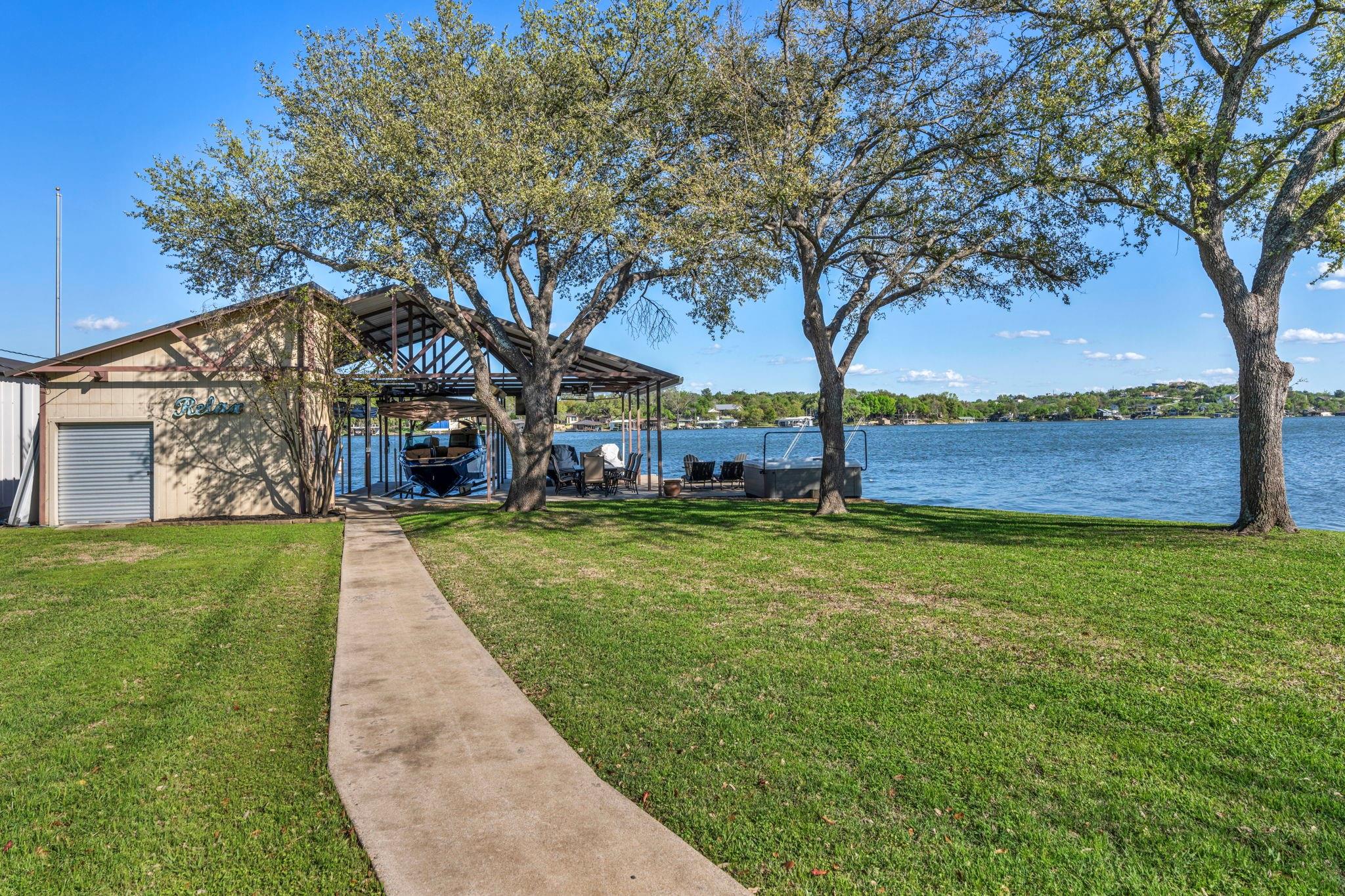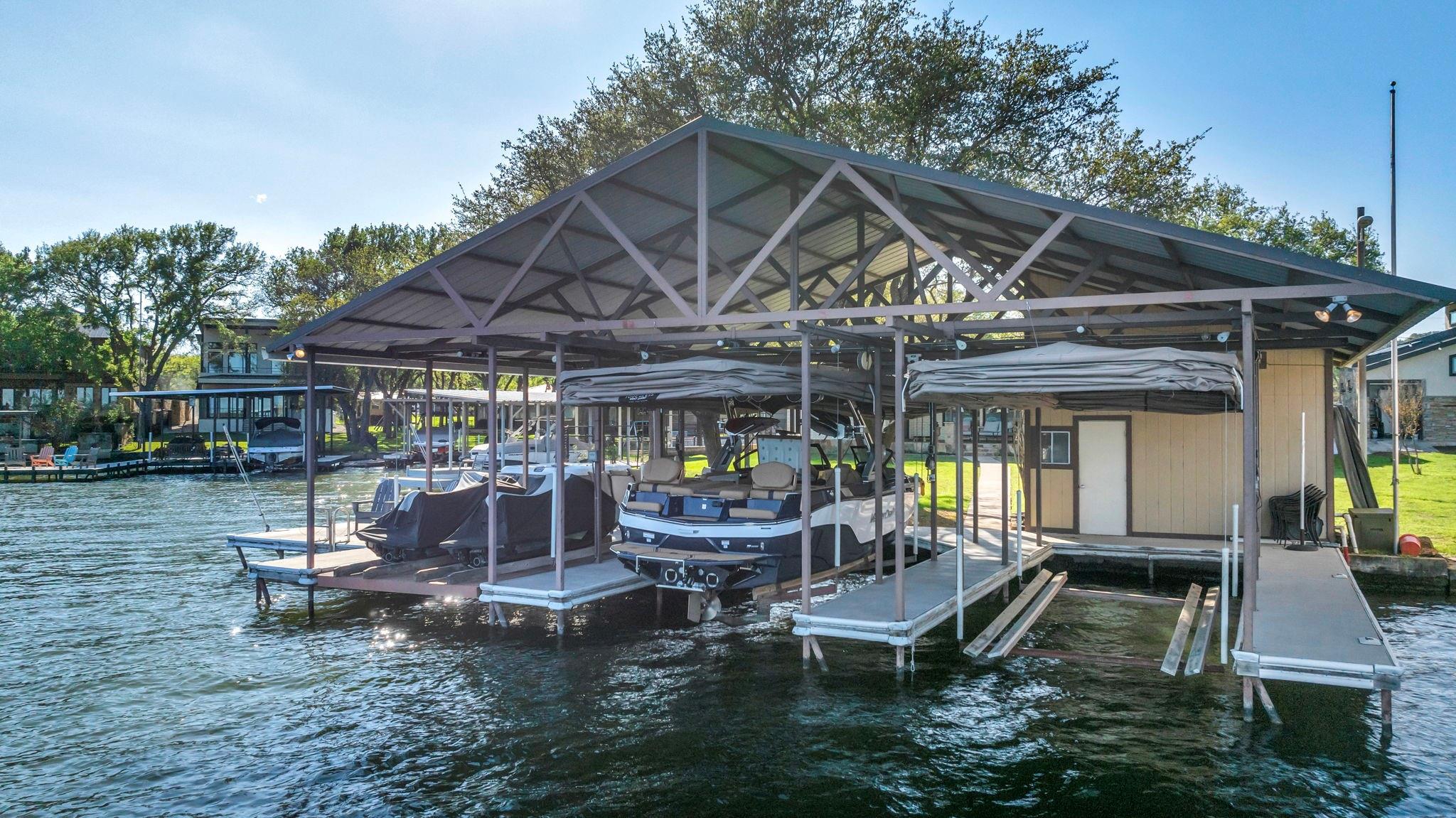 Experience 133 ft of prime East-facing Lake LBJ open waterfront, perfect for swimming, water sports, fishing, paddle boarding, and kayaking. The large boathouse has two tall boat slips with electronic lifts to accommodate tall boats or wake boats, two personal watercraft lifts, storage room, hot tub, additional tie up space for guests, and plenty of seating on the oversized deck. Inside the privately gated property with a large old growth live oak tree, the single-story home features three bedrooms, an office, and three full bathrooms. Incredible lake and Texas Hill Country views are seen through the large windows in the living and dining area, while the primary suite has a large walk in closet and its own private entrance to the large covered lakeside porch. The large bunk room comfortably accommodates guests, and you'll enjoy the multiple storage options throughout the home. With its well-appointed amenities and comfortable living spaces, it presents an exceptional opportunity for lakefront living. Sold fully furnished with a few exceptions. Agent related to seller.
