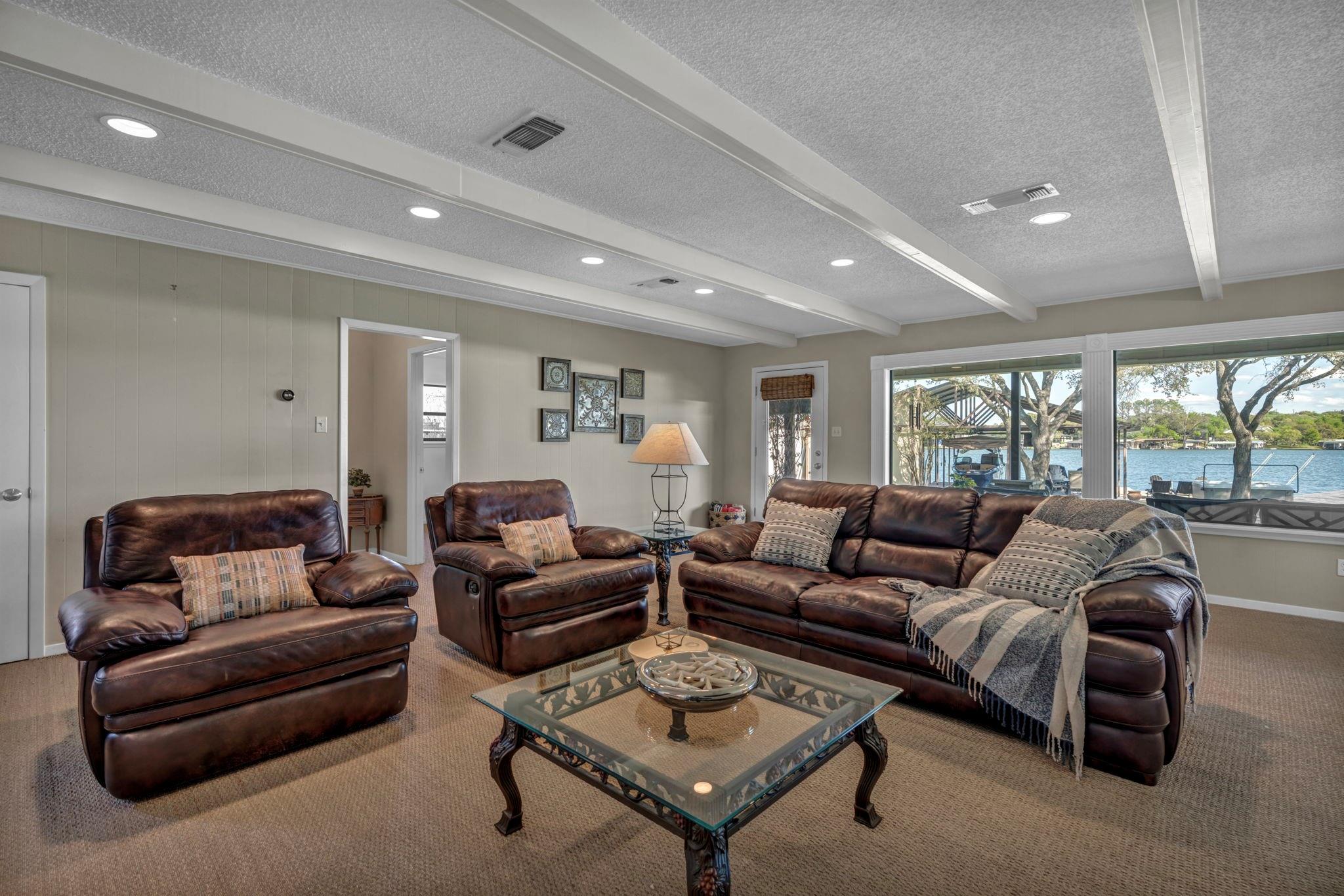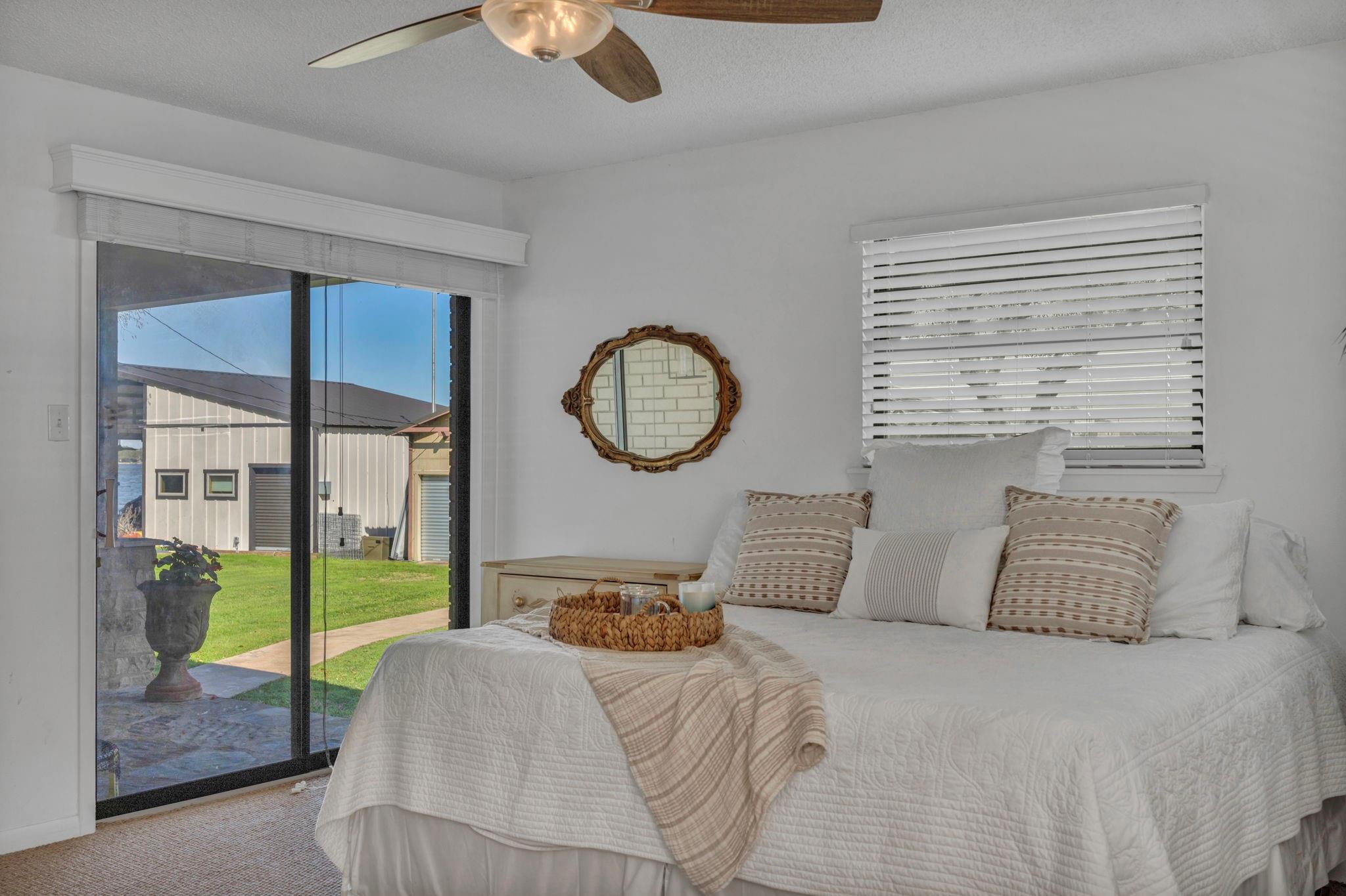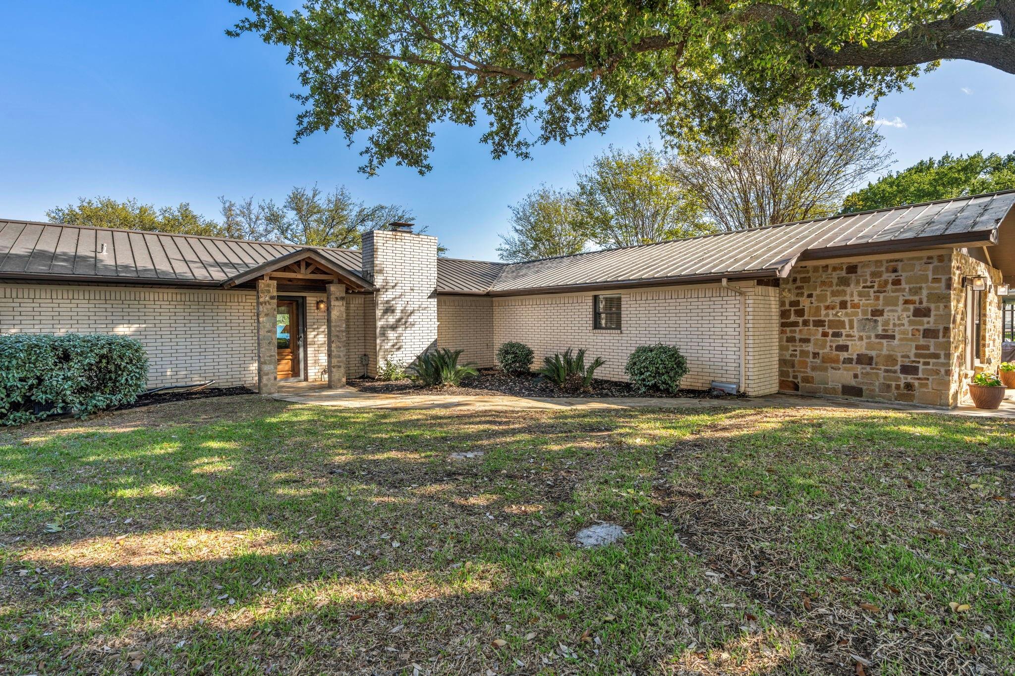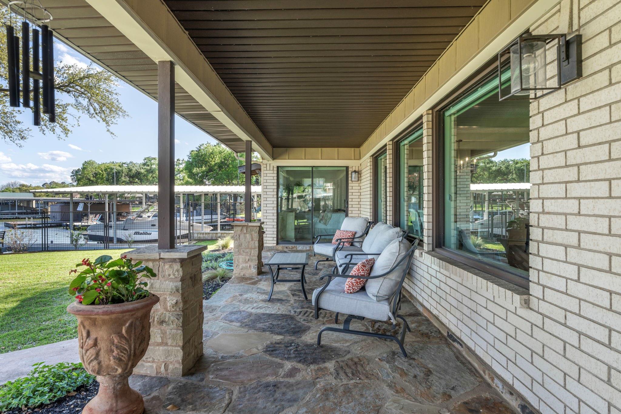 Experience 133 ft of prime East-facing Lake LBJ open waterfront, perfect for swimming, water sports, fishing, paddle boarding, and kayaking. The large boathouse has two tall boat slips with electronic lifts to accommodate tall boats or wake boats, two personal watercraft lifts, storage room, hot tub, additional tie up space for guests, and plenty of seating on the oversized deck. Inside the privately gated property with a large old growth live oak tree, the single-story home features three bedrooms, an office, and three full bathrooms. Incredible lake and Texas Hill Country views are seen through the large windows in the living and dining area, while the primary suite has a large walk in closet and its own private entrance to the large covered lakeside porch. The large bunk room comfortably accommodates guests, and you'll enjoy the multiple storage options throughout the home. With its well-appointed amenities and comfortable living spaces, it presents an exceptional opportunity for lakefront living. Sold fully furnished with a few exceptions. Agent related to seller.