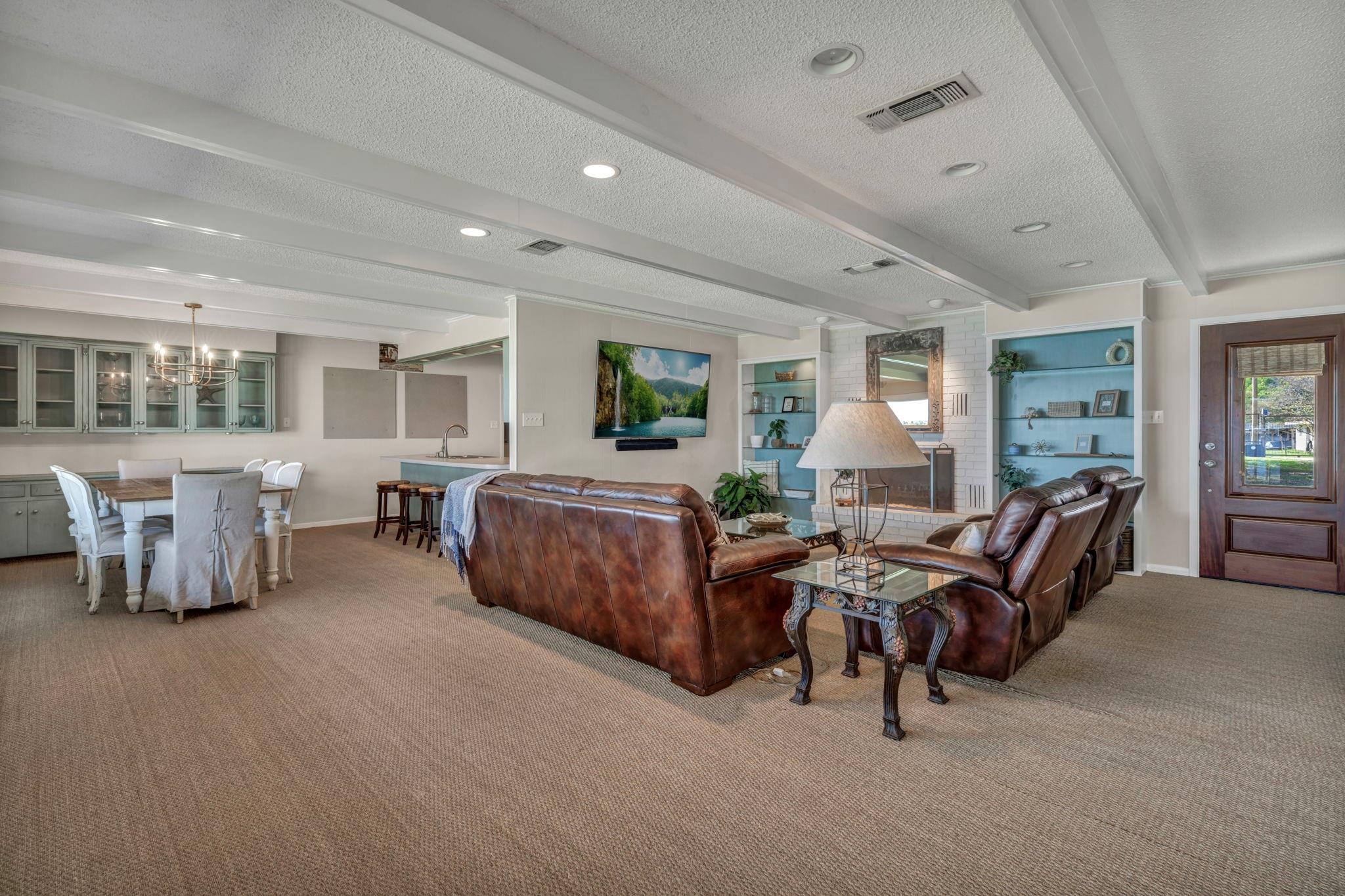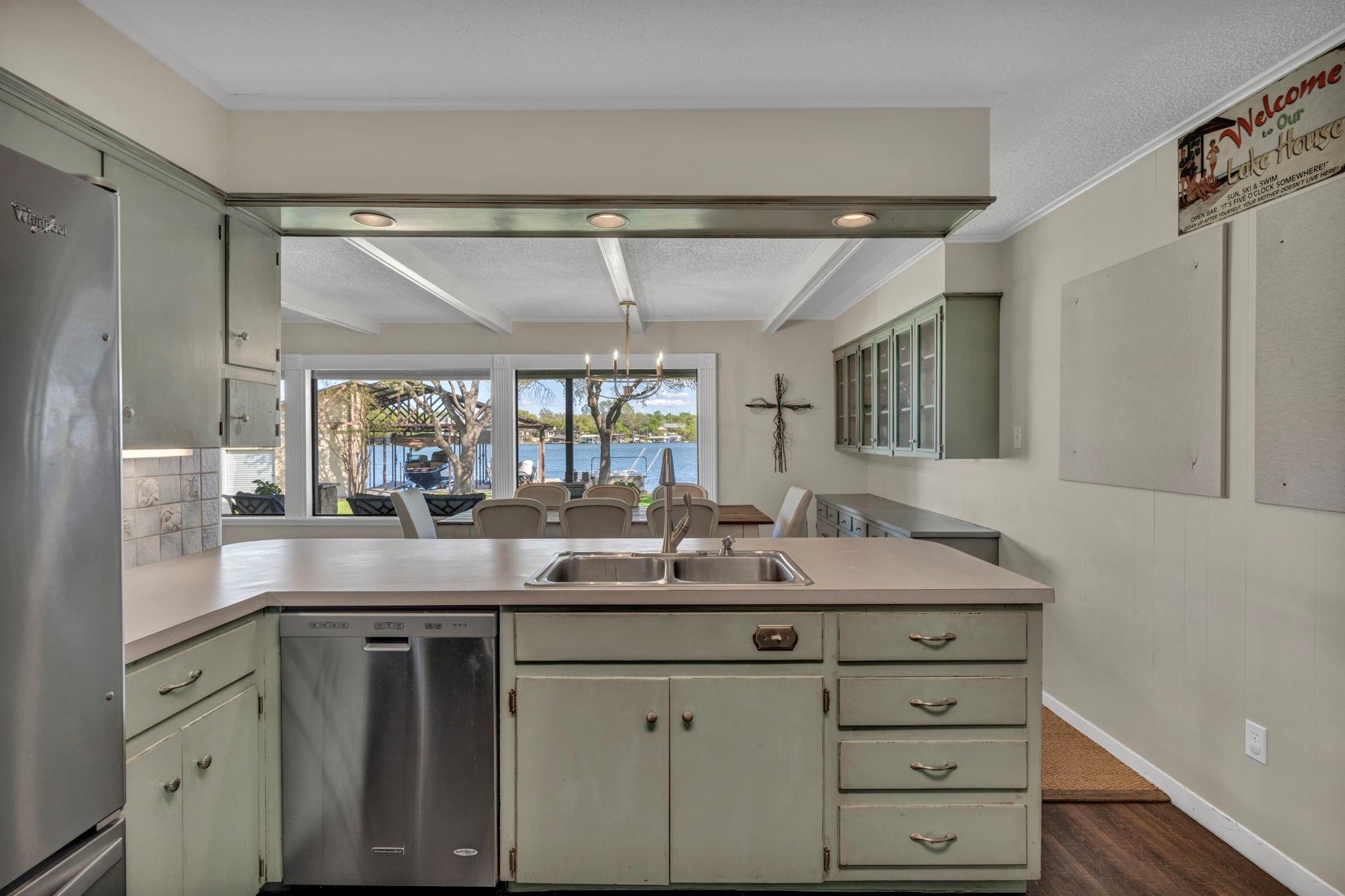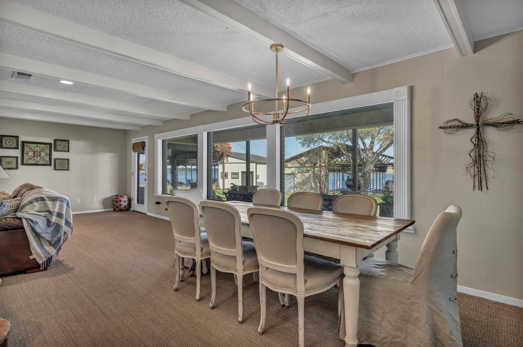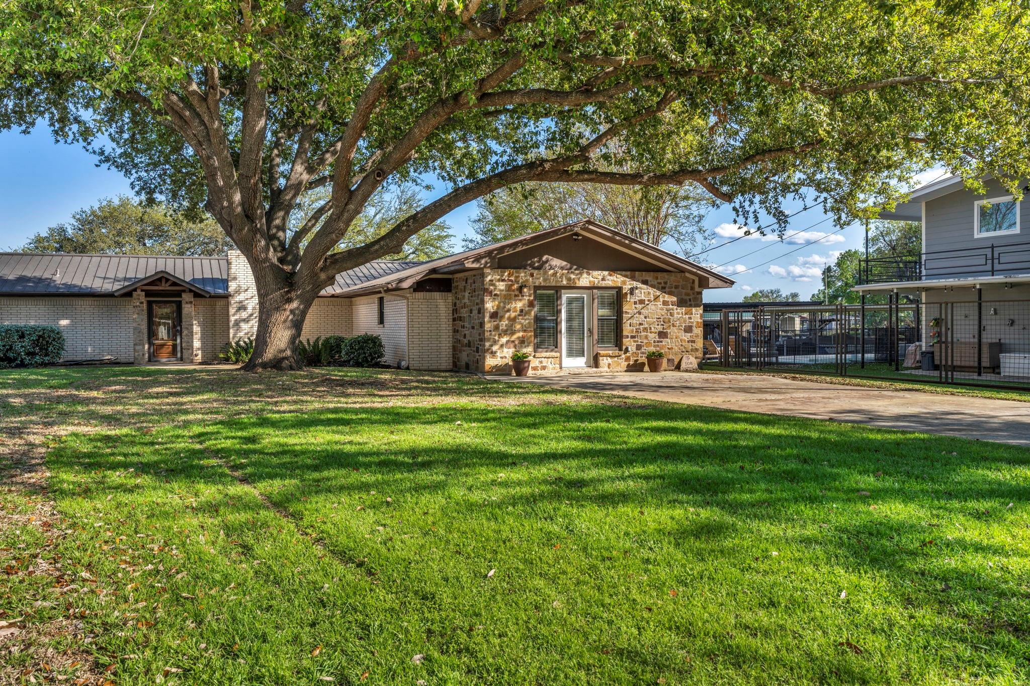 Experience 133 ft of prime East-facing Lake LBJ open waterfront, perfect for swimming, water sports, fishing, paddle boarding, and kayaking. The large boathouse has two tall boat slips with electronic lifts to accommodate tall boats or wake boats, two personal watercraft lifts, storage room, hot tub, additional tie up space for guests, and plenty of seating on the oversized deck. Inside the privately gated property with a large old growth live oak tree, the single-story home features three bedrooms, an office, and three full bathrooms. Incredible lake and Texas Hill Country views are seen through the large windows in the living and dining area, while the primary suite has a large walk in closet and its own private entrance to the large covered lakeside porch. The large bunk room comfortably accommodates guests, and you'll enjoy the multiple storage options throughout the home. With its well-appointed amenities and comfortable living spaces, it presents an exceptional opportunity for lakefront living. Sold fully furnished with a few exceptions. Agent related to seller.