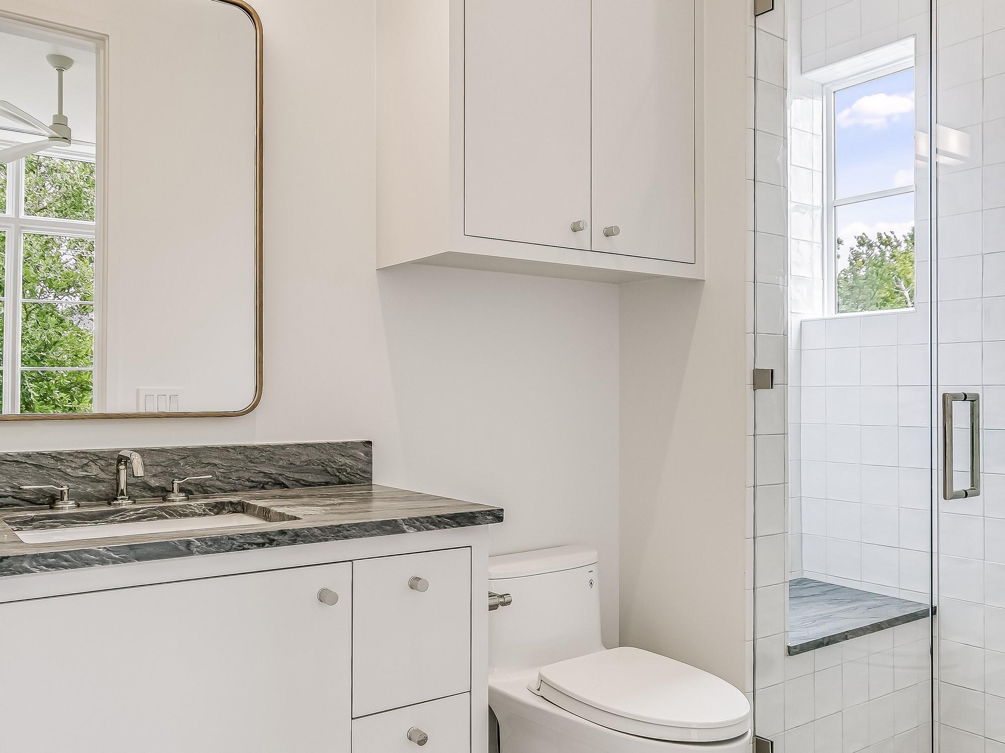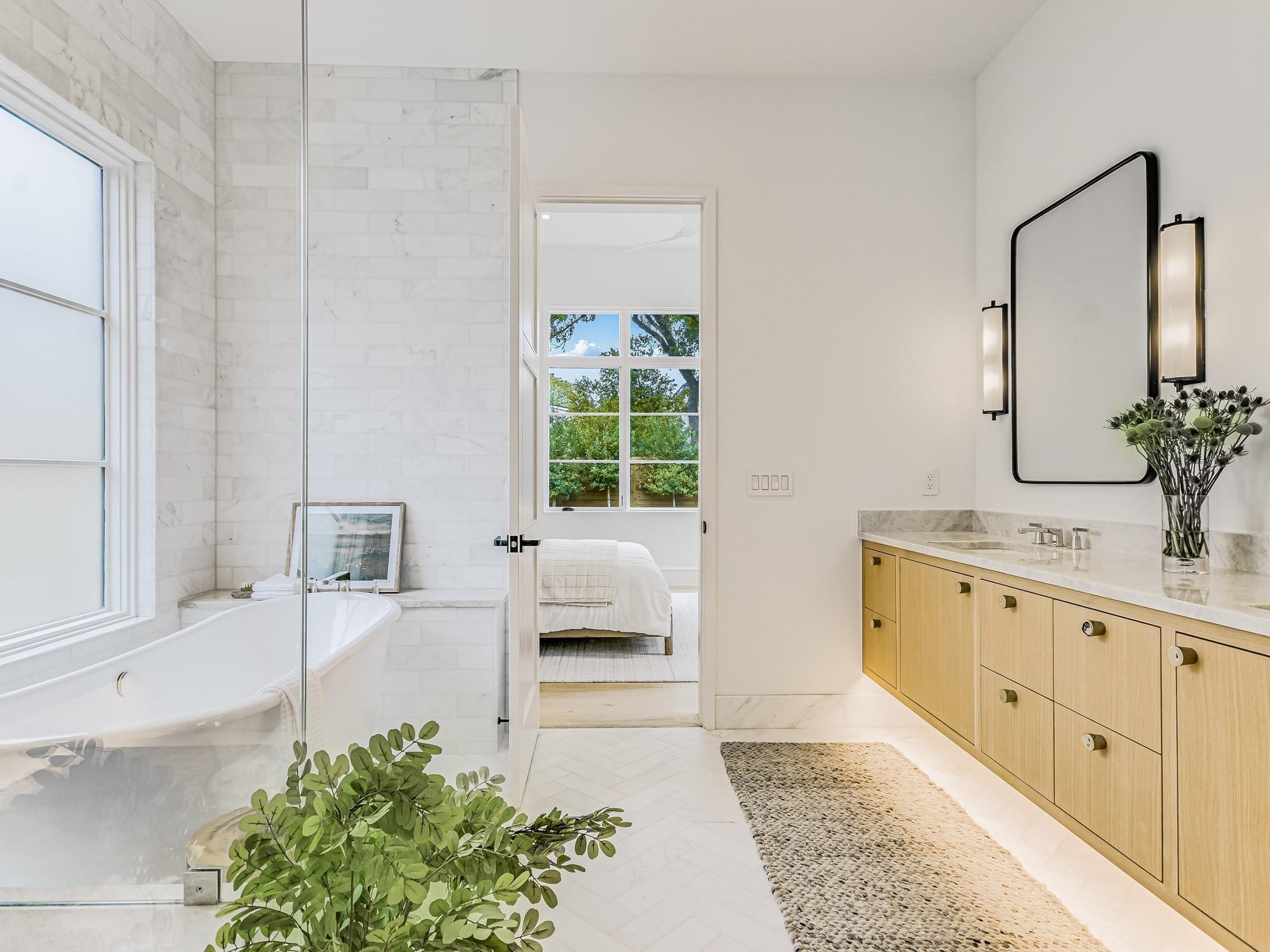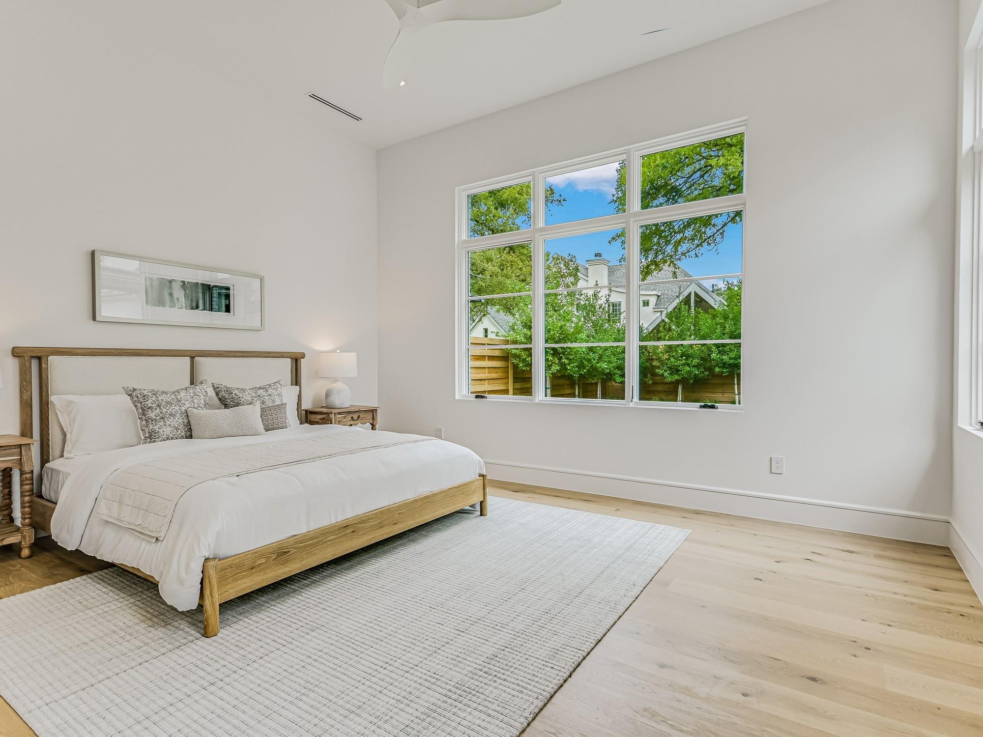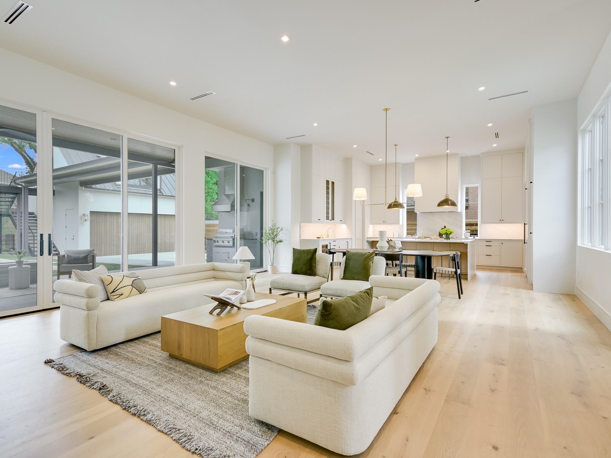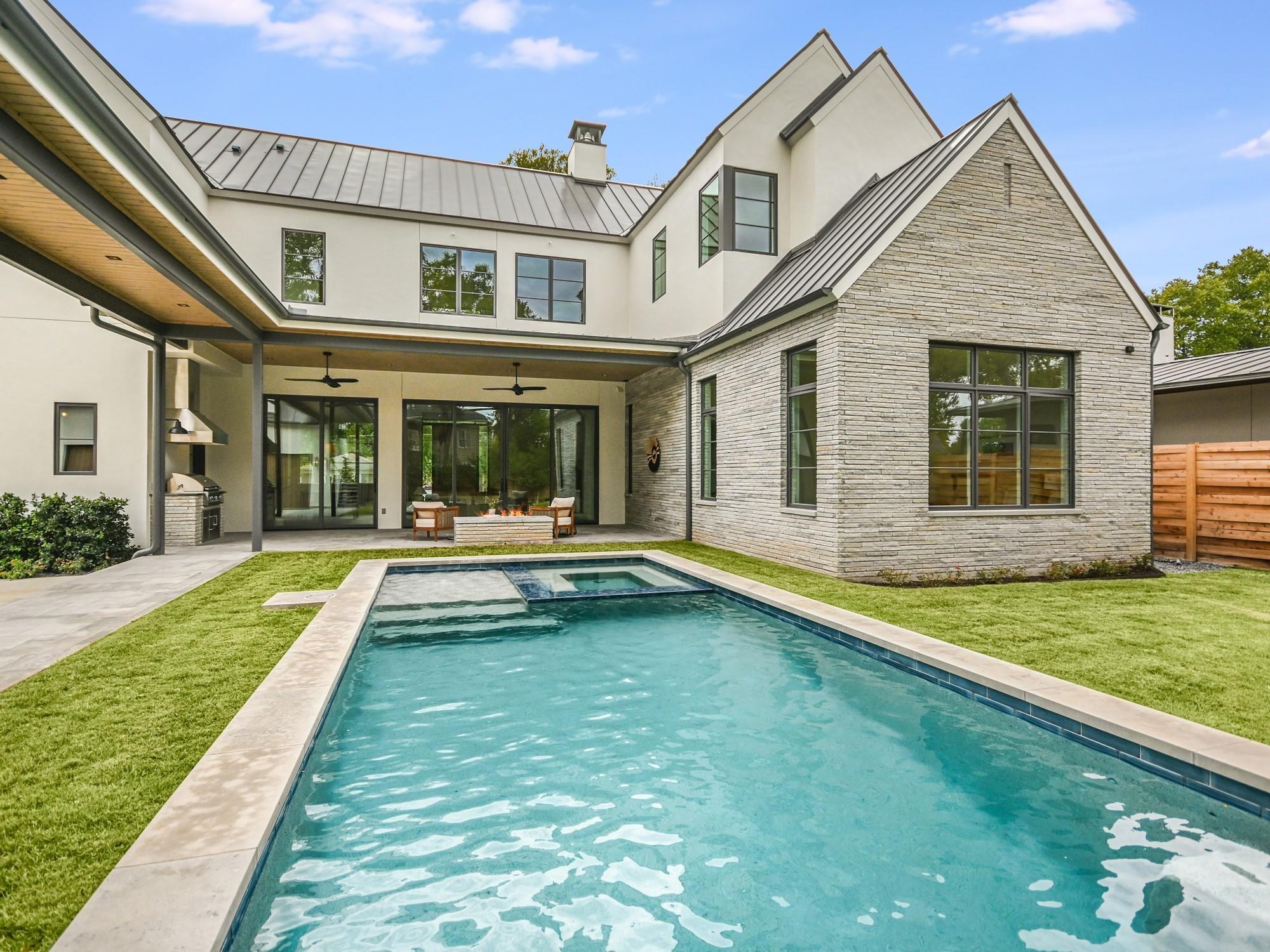 Situated on a beautiful lot adorned by trees, this new construction showcases contemporary and luxury. Open the front door to a spacious living area with views of the pool and backyard. Large covered area that has a fireplace and grilling area perfect for entertaining. Kitchen features a large island as well as a large pantry and butlers pantry with a large window to prep for entertaining. Next is a large mudroom and laundry with a pool bath. Upstairs offers an additional living area, kids bar area, large laundry room, and 3 bedrooms with ensuite baths with an additional flex room perfect for a peloton and exercise area. A covered walkway leads to the garage and guest apartment. The home sits high on the lot and you see trees out almost every window. Large flat backyard with grass area and pool. Built by BRF homes and designed by Cornerstone Architect. Together with Annie Downing Interiors, they have created a beautiful property.