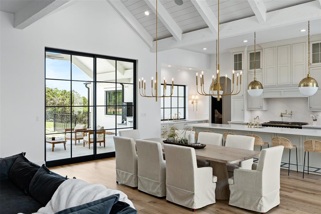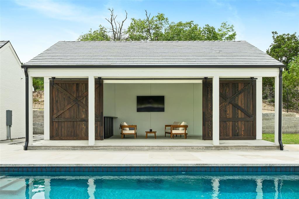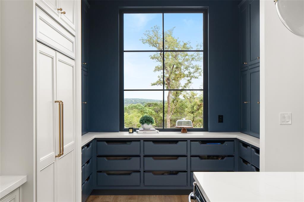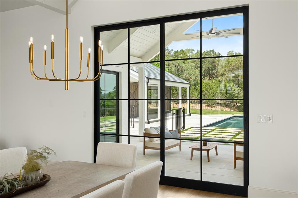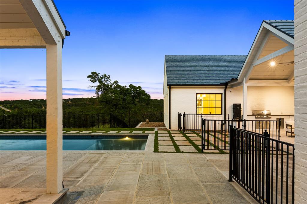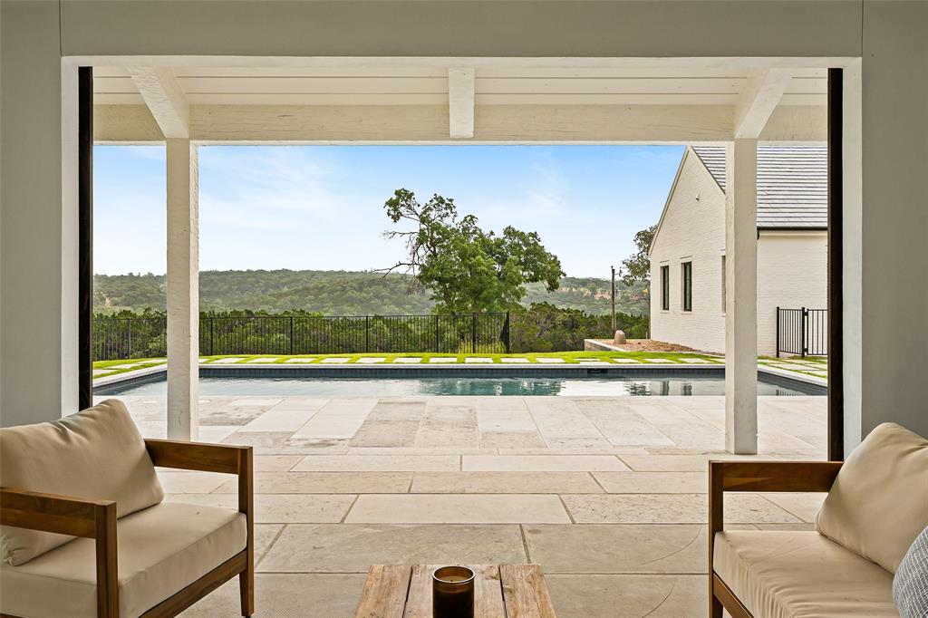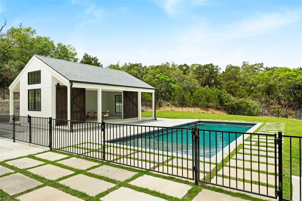 European meets American in this unique property nestled in the Wimberley hillside. Impeccably designed down to the last detail, this home embraces sweeping hill country views and blends contemporary and classic details for a luxurious experience at every turn. The grand entry overlooks rolling hills and features a gorgeous bespoke chandelier. The kitchen centers around a 13ft island, featuring unique custom cabinetry all the way to the 12ft ceiling. The 48" Italian range complements the Sub-Zero refrigerator, integrated dishwasher, and ice maker for the perfect appliance package. The pantry is truly unique, elevating the space to a bright open storage solution that keeps everything hidden, yet immediately accessible. Incredible outdoor views and amenities are brought inside with multiple custom sliders, giving you natural light and views throughout the home. Each of the 4.5 bathrooms is meticulously designed. The exquisite primary suite boasts incredible views, a vaulted ceiling, a luxurious spa shower, and a spacious closet with large center island. The upstairs office features breathtaking views from every angle. Storage is abundant, with additional custom cabinetry throughout. Outdoors, the heated pool is overlooked by a well appointed pool house. Featuring overhead speakers, a large bar, refrigerator, ice maker and sink, this area is sure to be the center of the party–or simply the perfect area to watch the sun set over the hills. The spacious covered patio and outdoor kitchen add even more entertaining space. Dual cobblestone driveways lend a luxurious touch to the front of the home and offer abundant parking. Built to satisfy the most discerning buyer, this breathtaking home is truly unique among the currently available hill country options. Minutes from downtown Wimberley and featuring community creek access, the amount of detail in this home must be seen to be believed. If you've been looking for your own hill country gem to call home, look no further.