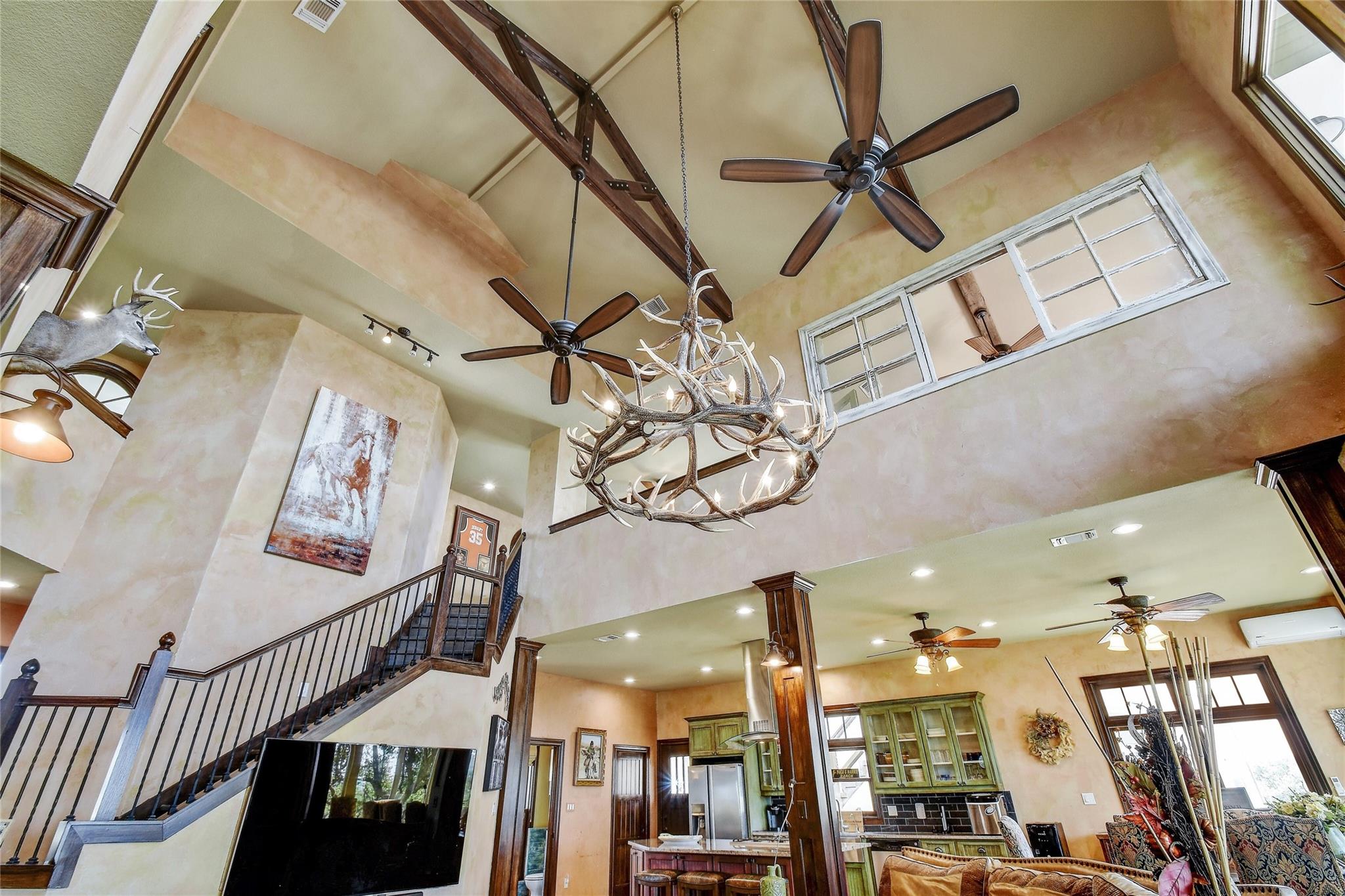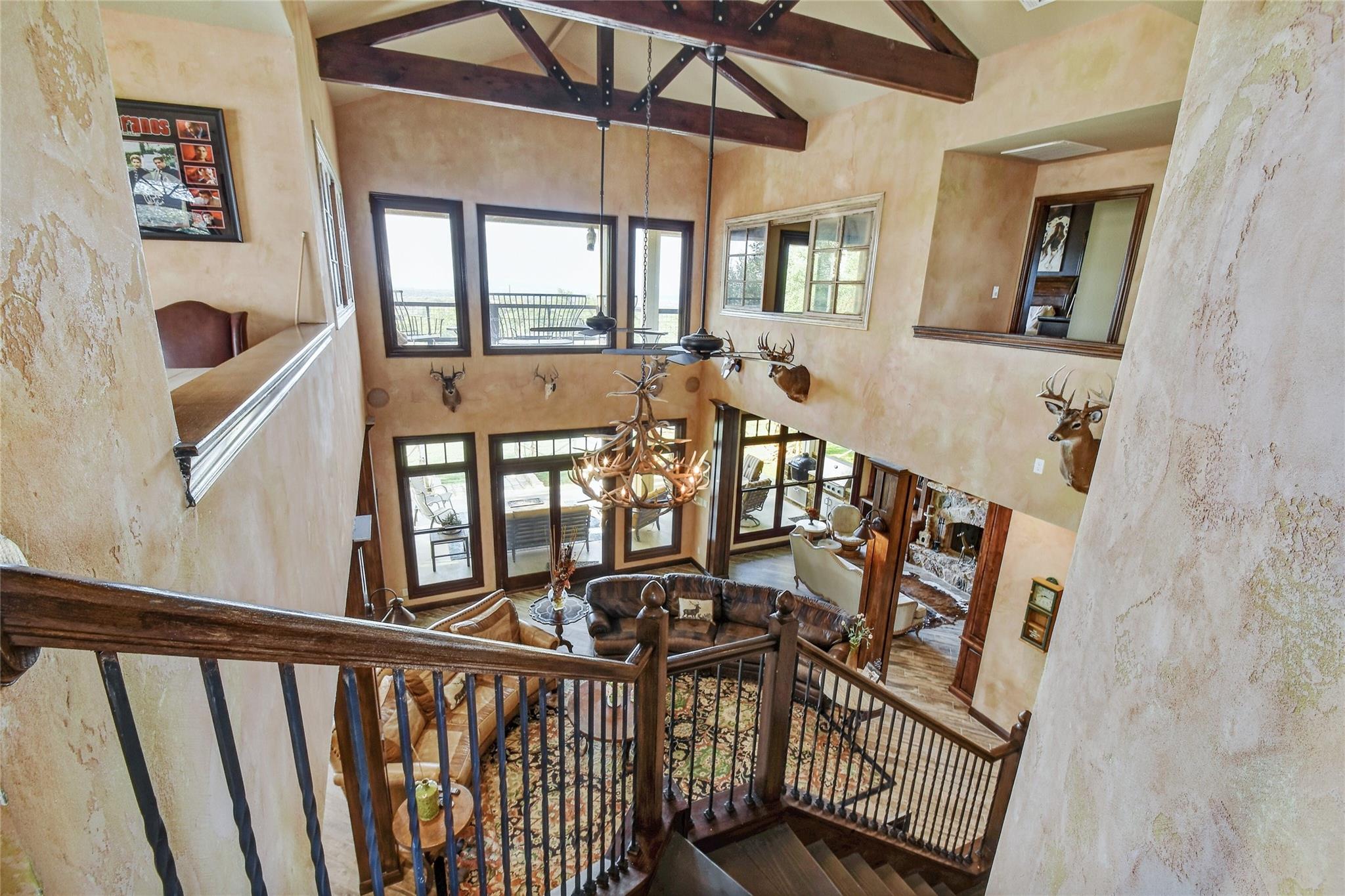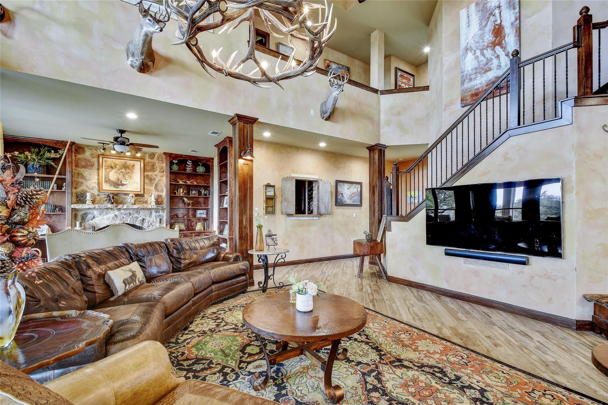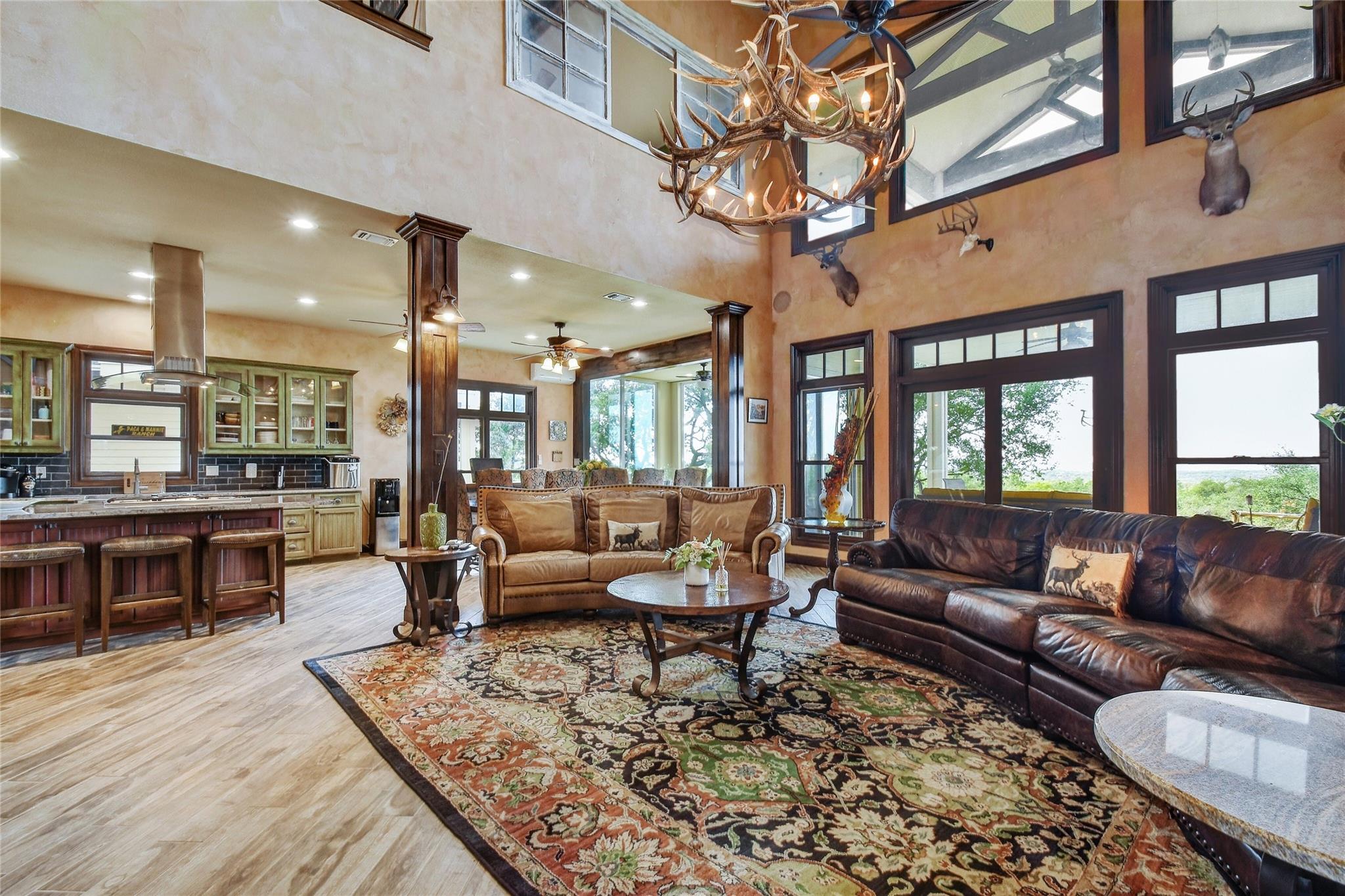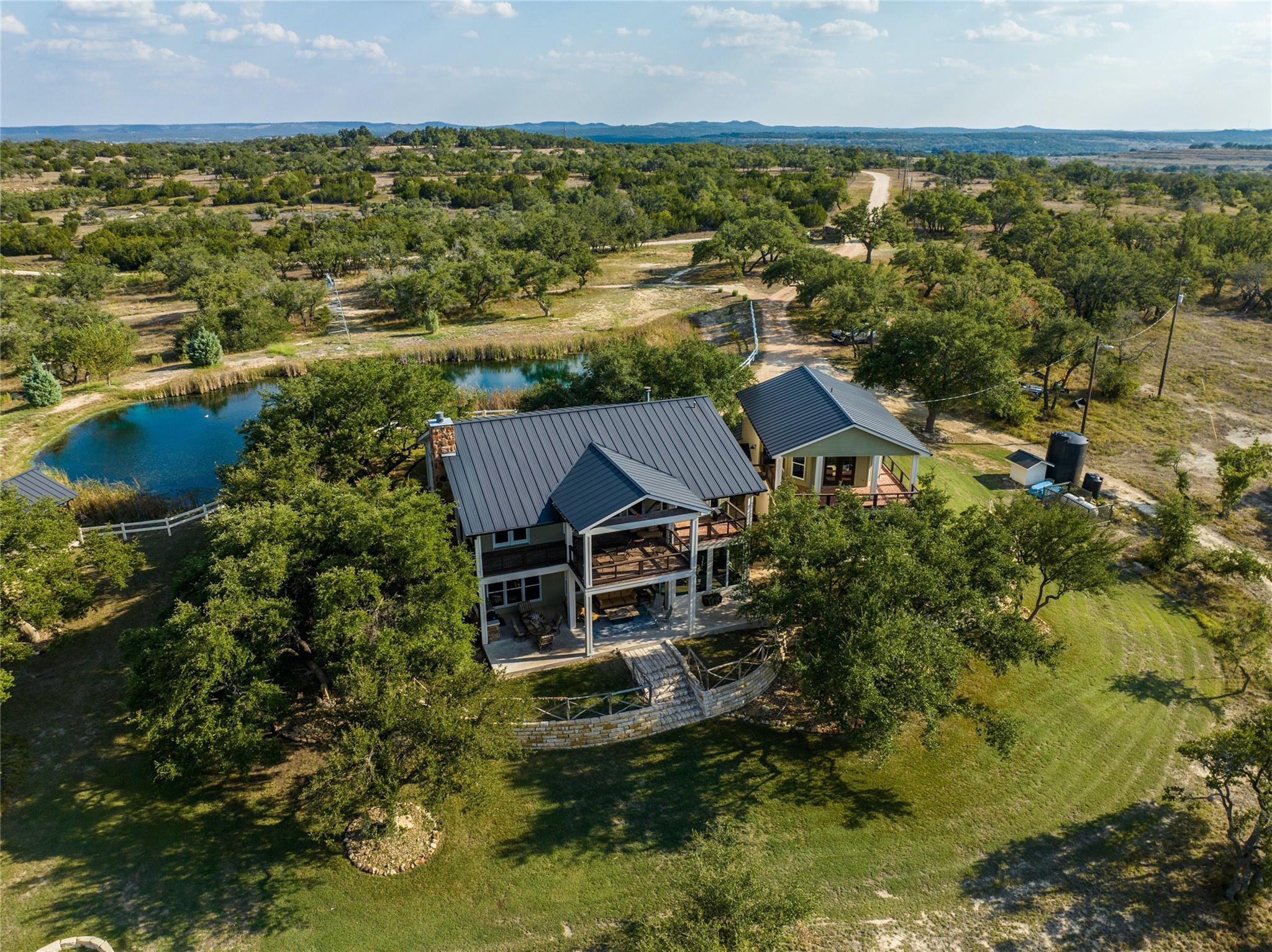 The main house boasts a grand open floorplan with spacious kitchen and huge dining table which then transitions into the great room and living room with fireplace. A fine cigar and cordial room offer antique windows and ports from an old ship. The giant ceilings lend way to an upstairs bedroom & bath, game area with additional fireplace and office or second bedroom. The attached via covered walkway guest house boast 4 nice size bedrooms, 2 baths and a community living area. All structures offer multiple 1st and 2nd level porches, patios and sitting areas. There is also an attached multi bay garage. Additionally, the outdoor living area includes bbq area covered pavilion flanking the pond and fire pit ring