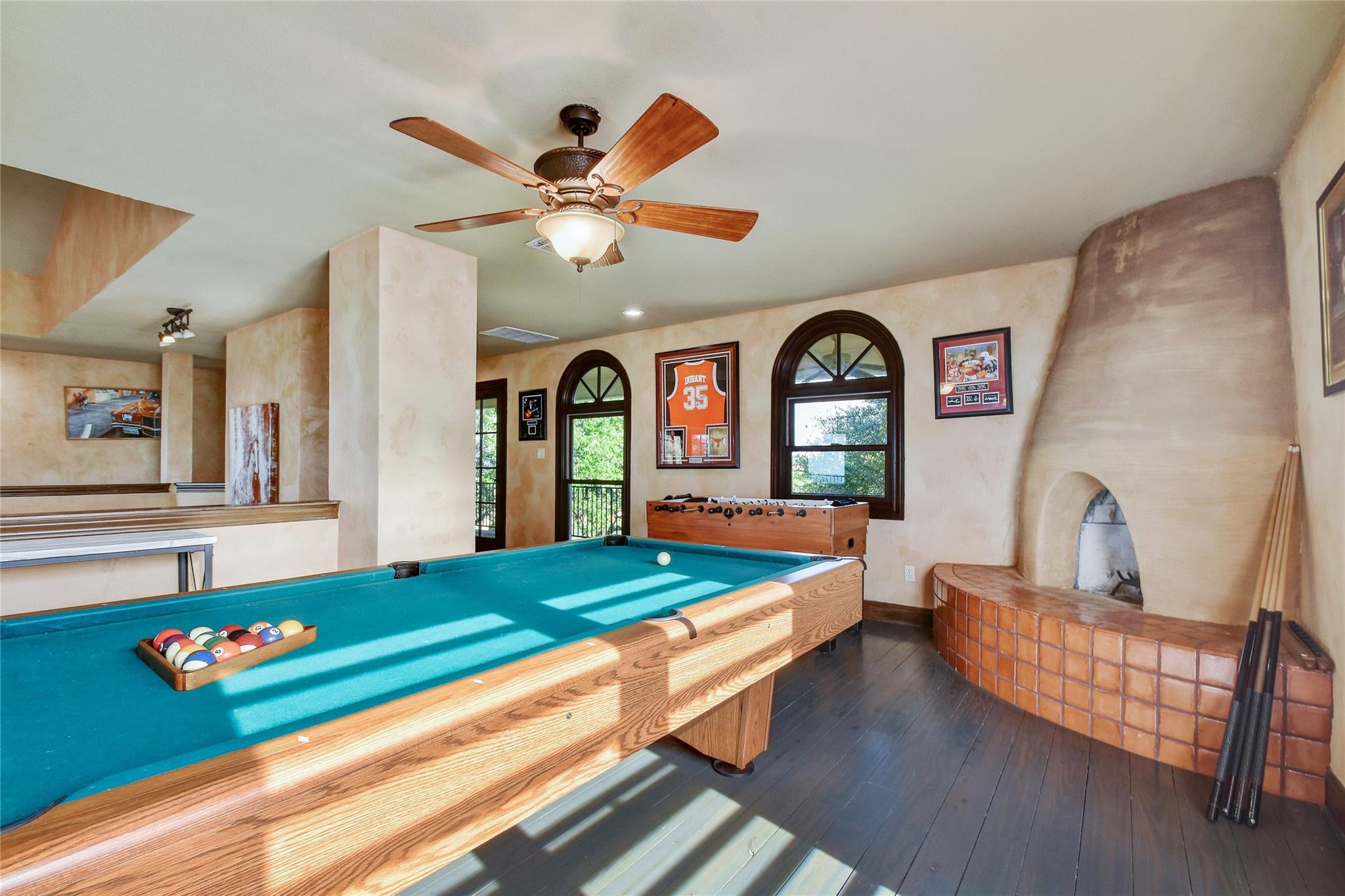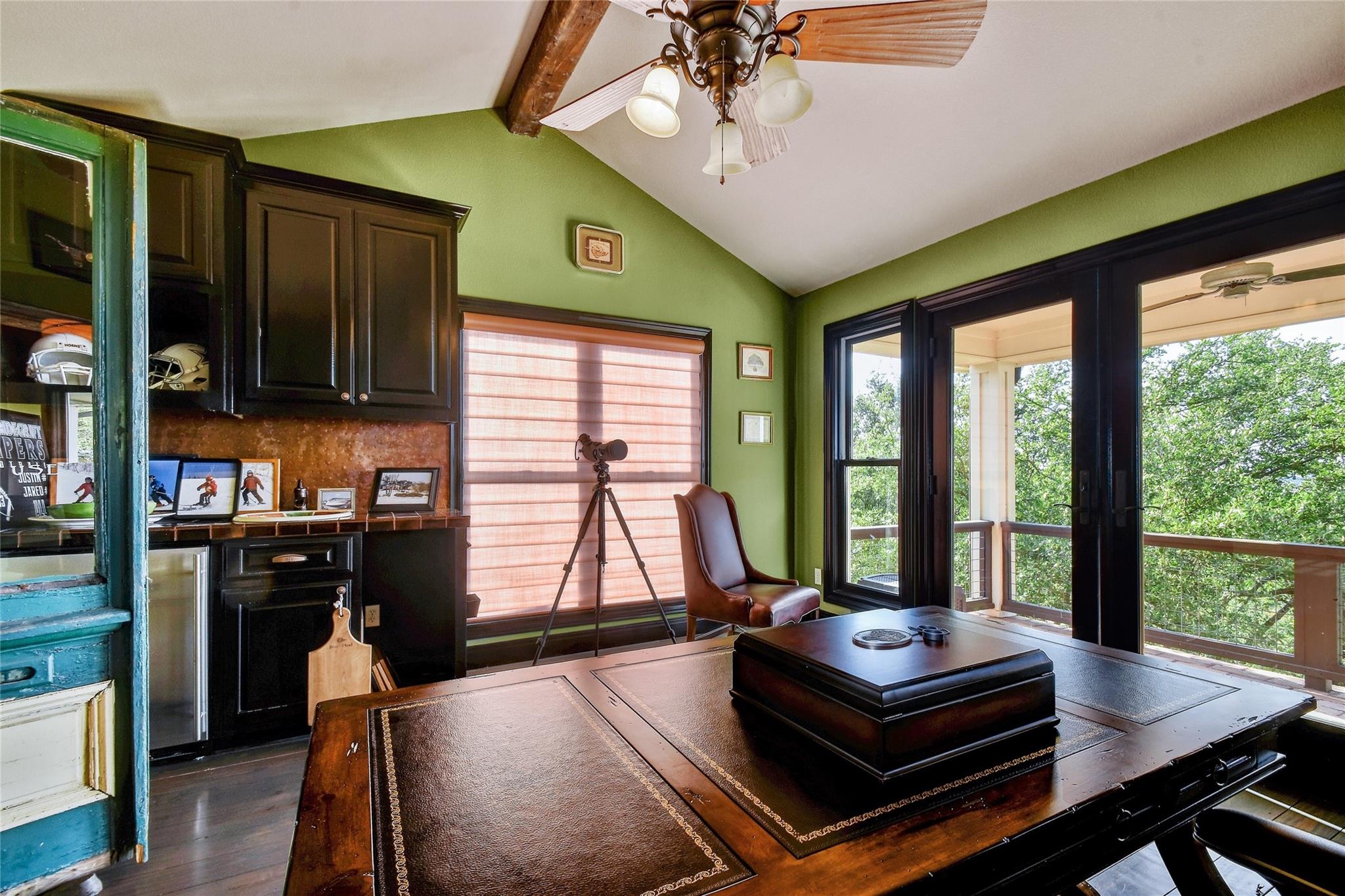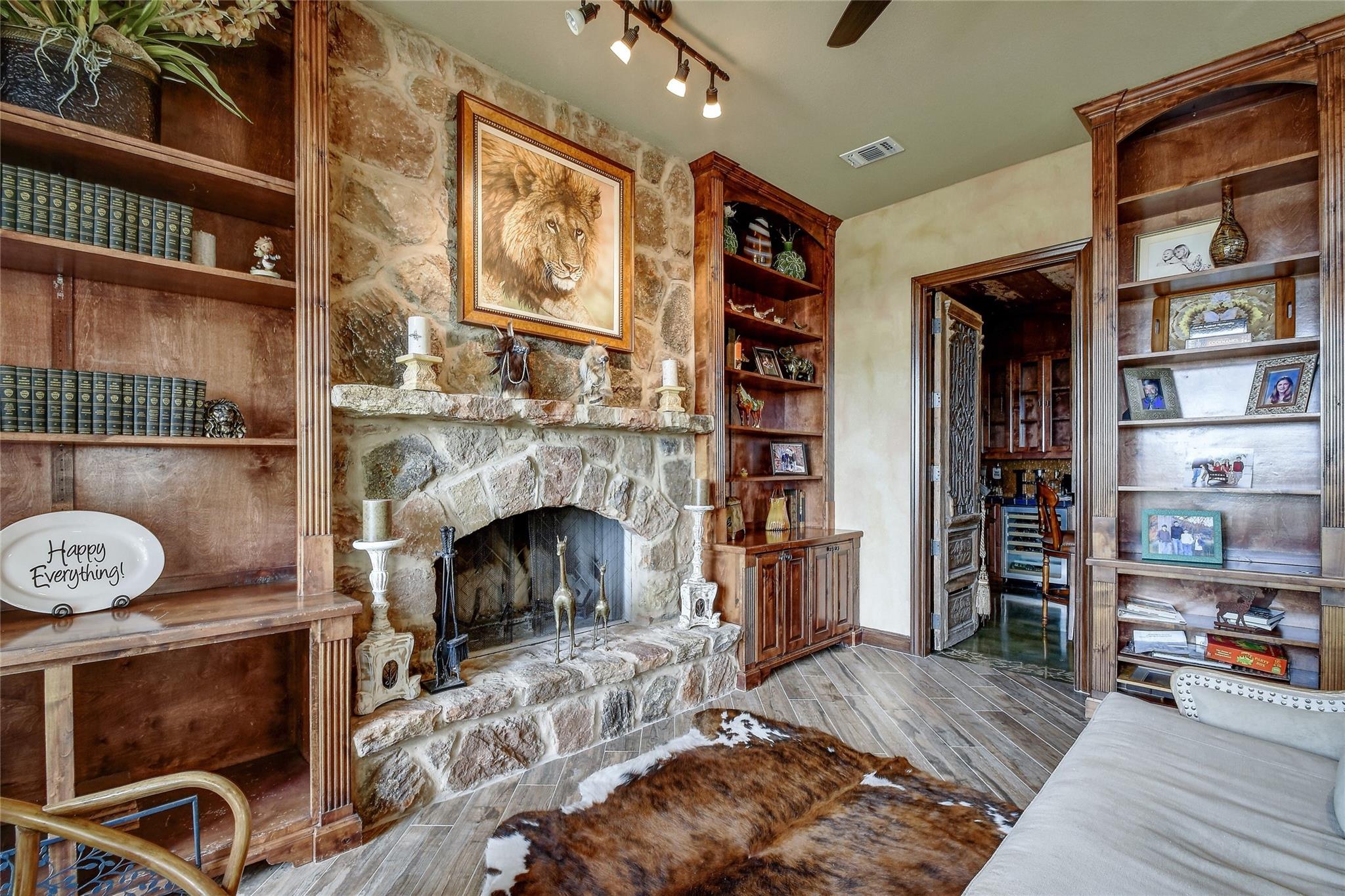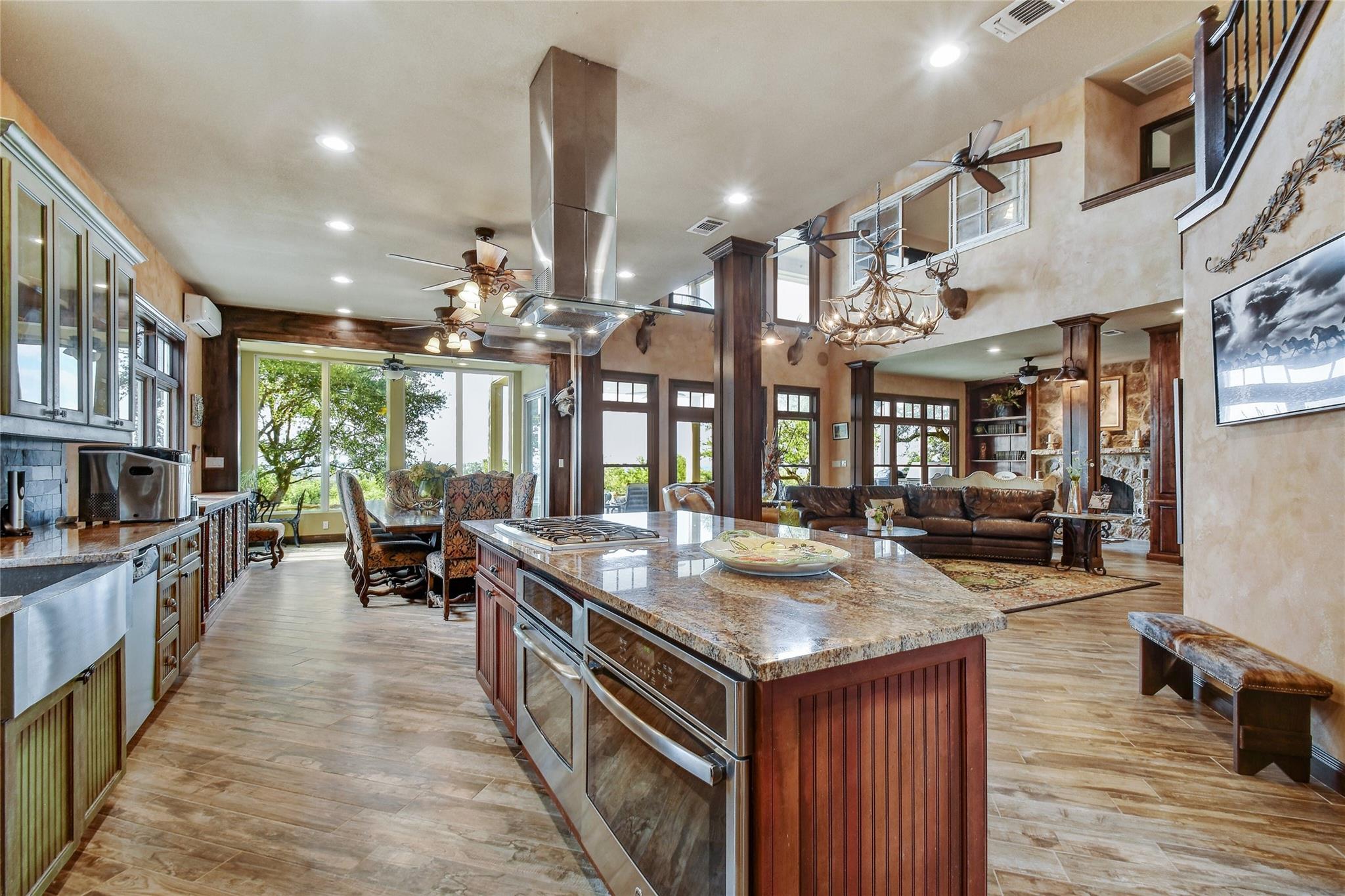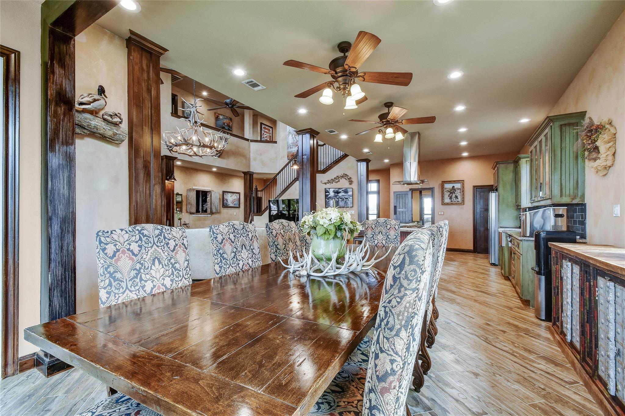 The main house boasts a grand open floorplan with spacious kitchen and huge dining table which then transitions into the great room and living room with fireplace. A fine cigar and cordial room offer antique windows and ports from an old ship. The giant ceilings lend way to an upstairs bedroom & bath, game area with additional fireplace and office or second bedroom. The attached via covered walkway guest house boast 4 nice size bedrooms, 2 baths and a community living area. All structures offer multiple 1st and 2nd level porches, patios and sitting areas. There is also an attached multi bay garage. Additionally, the outdoor living area includes bbq area covered pavilion flanking the pond and fire pit ring