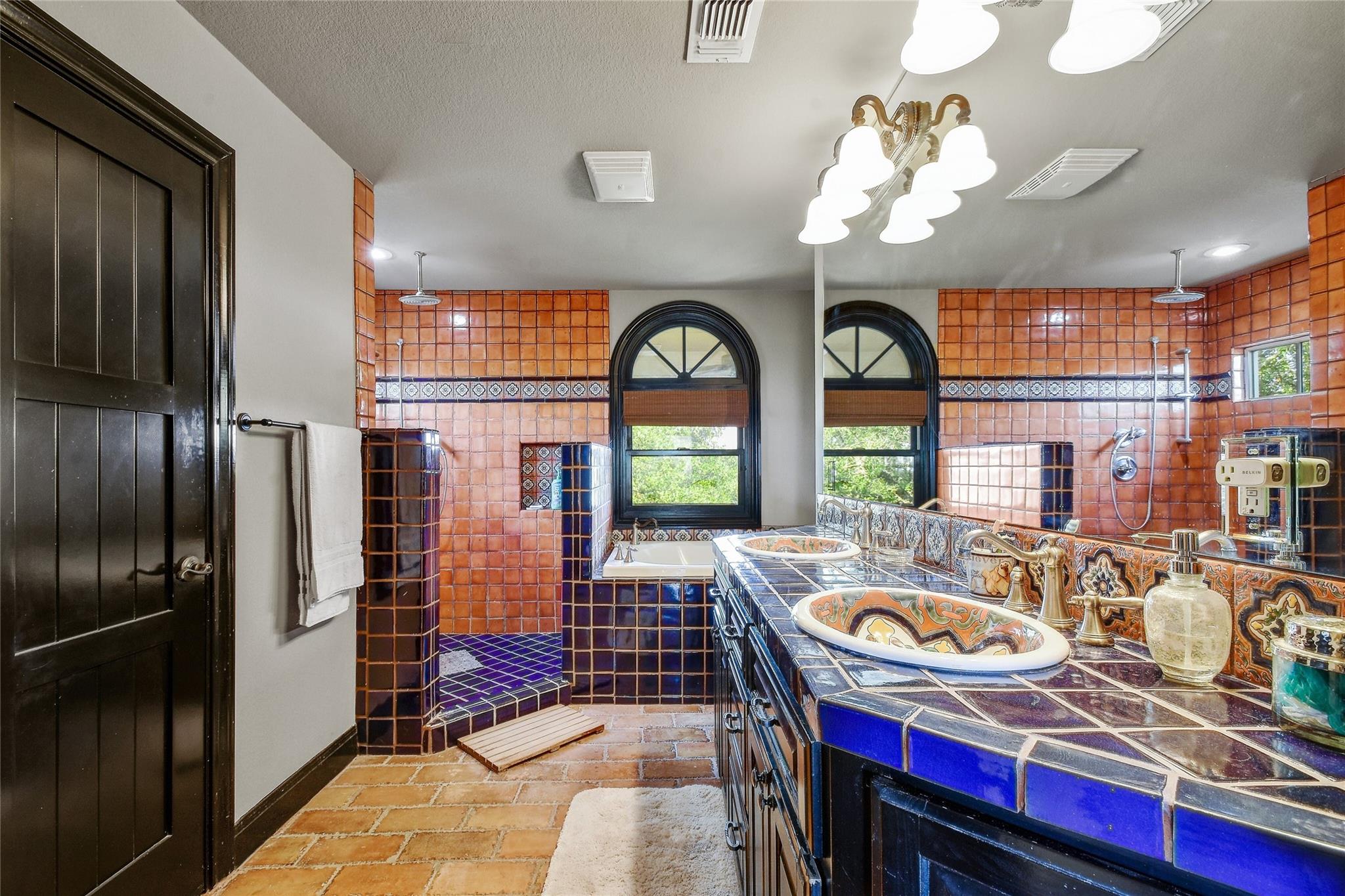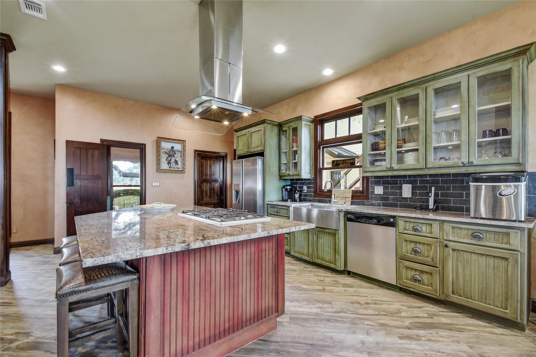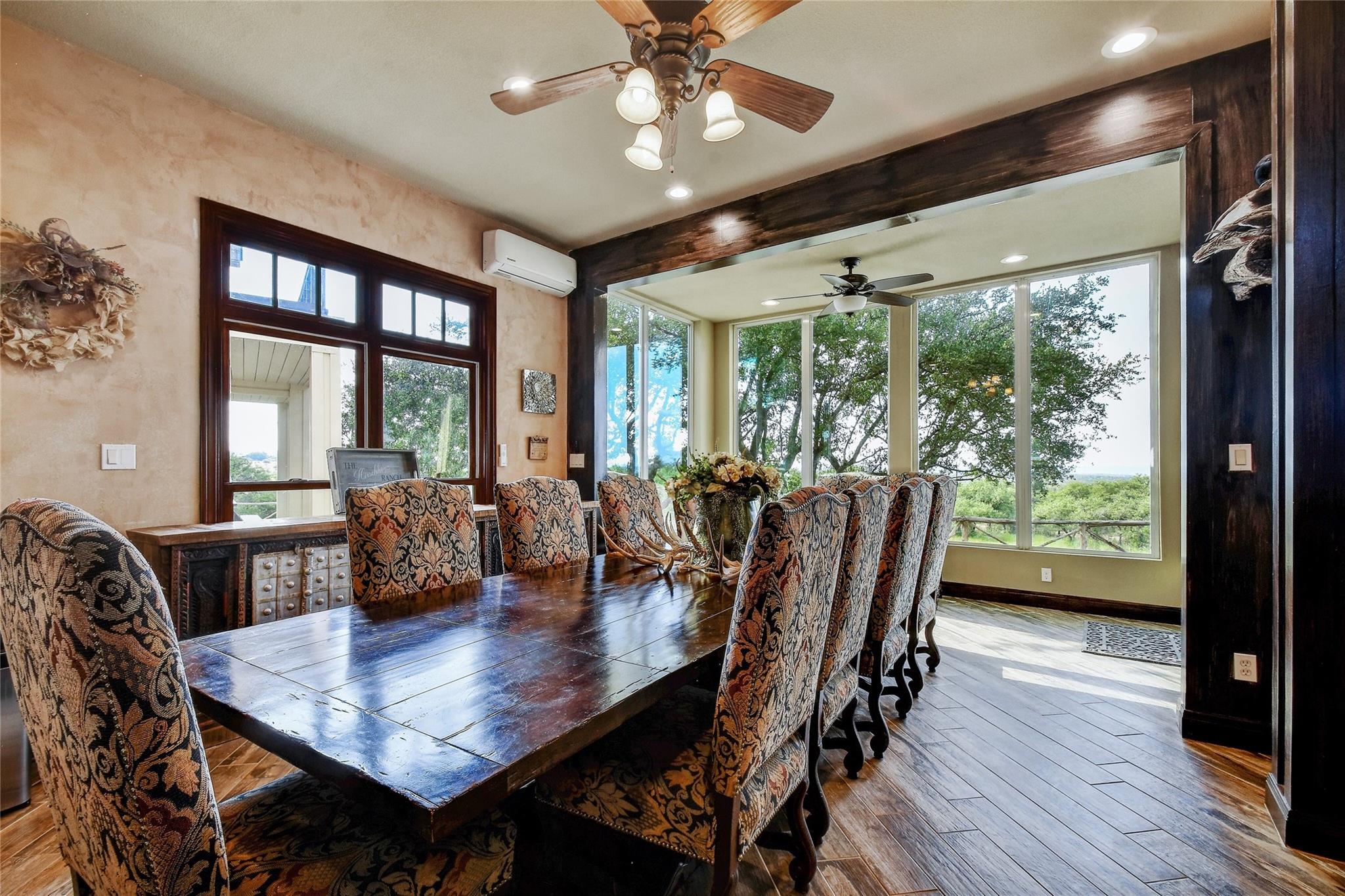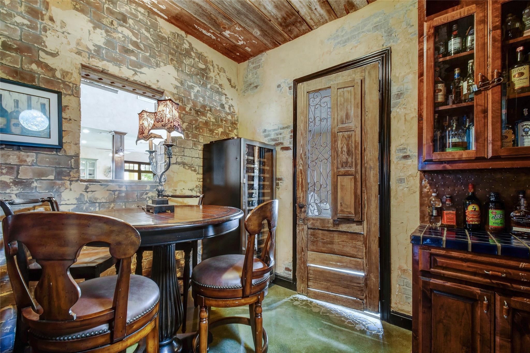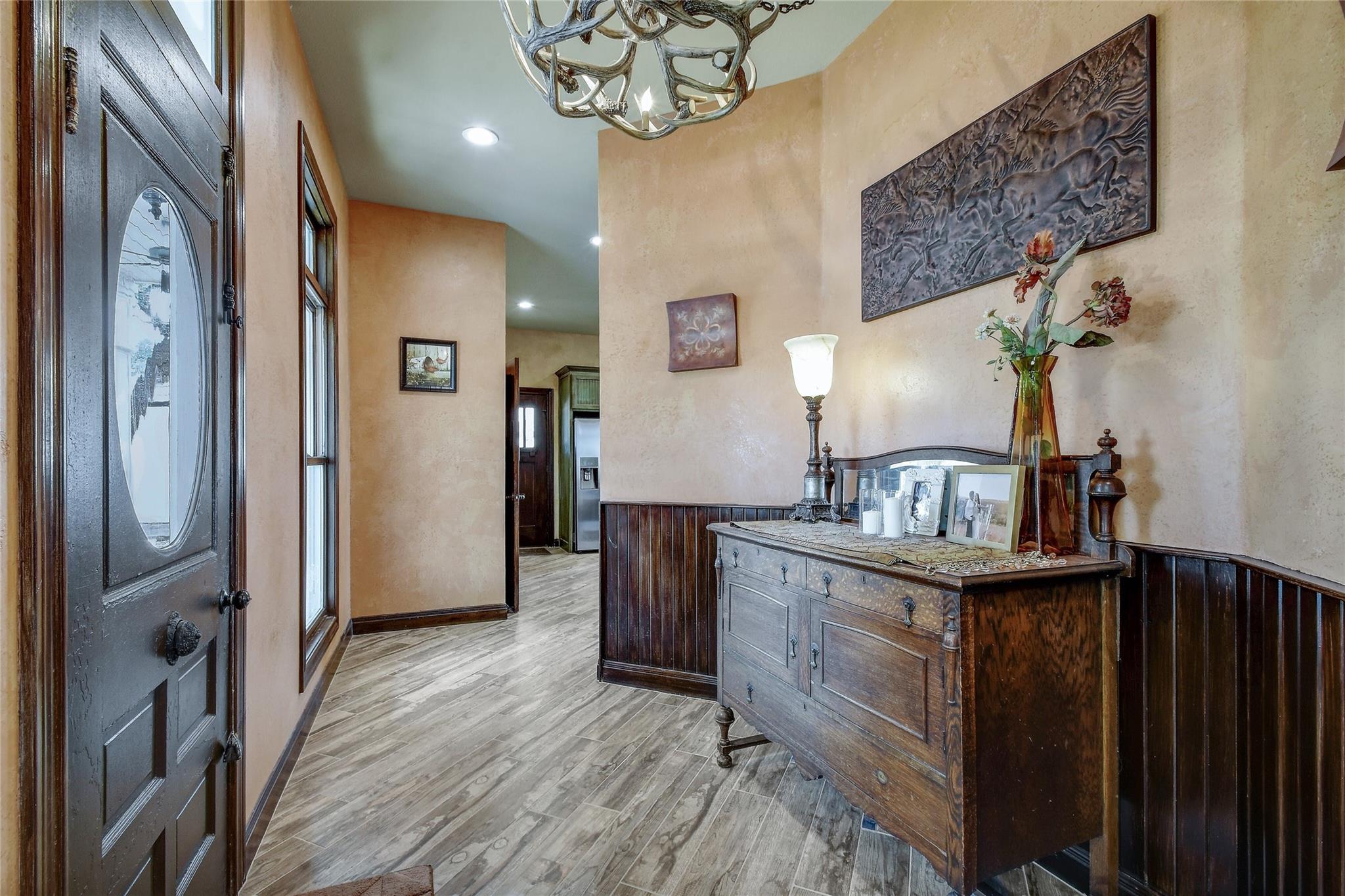 The main house boasts a grand open floorplan with spacious kitchen and huge dining table which then transitions into the great room and living room with fireplace. A fine cigar and cordial room offer antique windows and ports from an old ship. The giant ceilings lend way to an upstairs bedroom & bath, game area with additional fireplace and office or second bedroom. The attached via covered walkway guest house boast 4 nice size bedrooms, 2 baths and a community living area. All structures offer multiple 1st and 2nd level porches, patios and sitting areas. There is also an attached multi bay garage. Additionally, the outdoor living area includes bbq area covered pavilion flanking the pond and fire pit ring