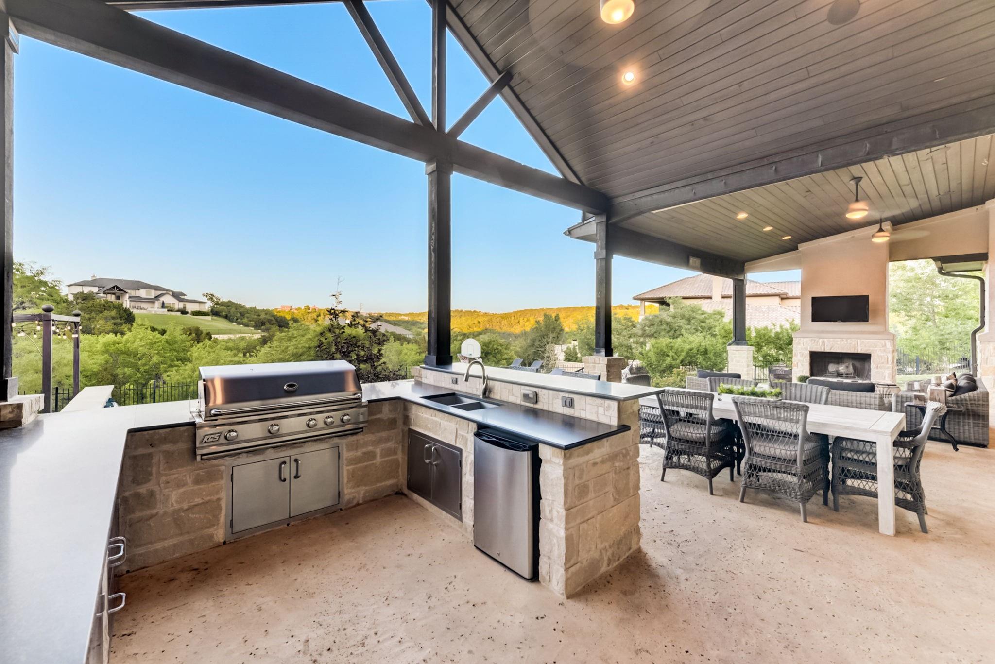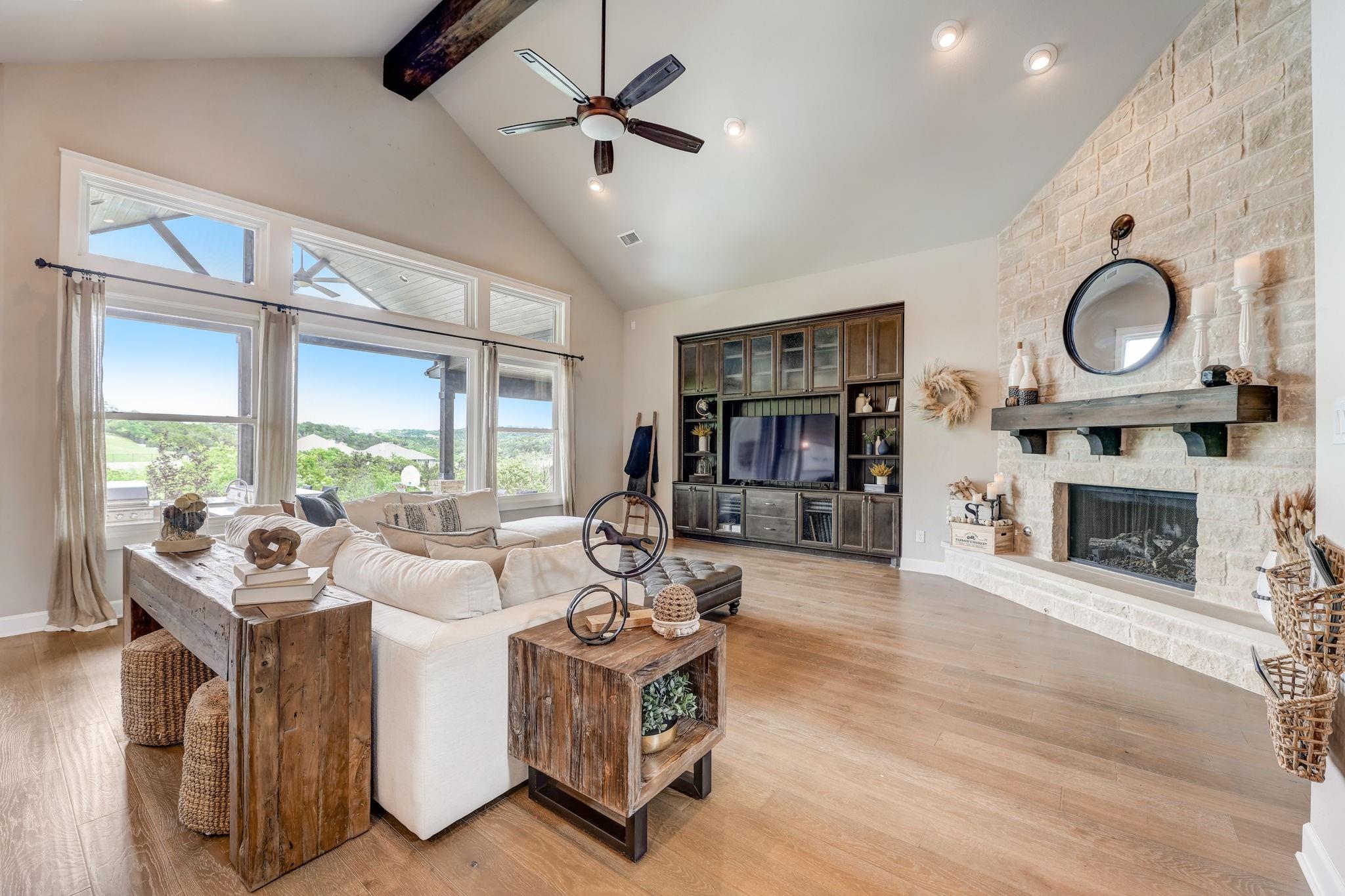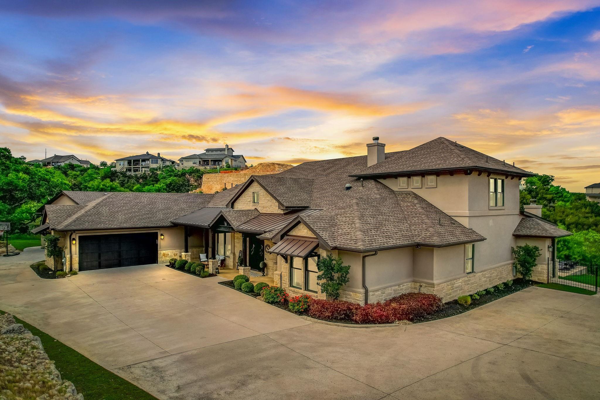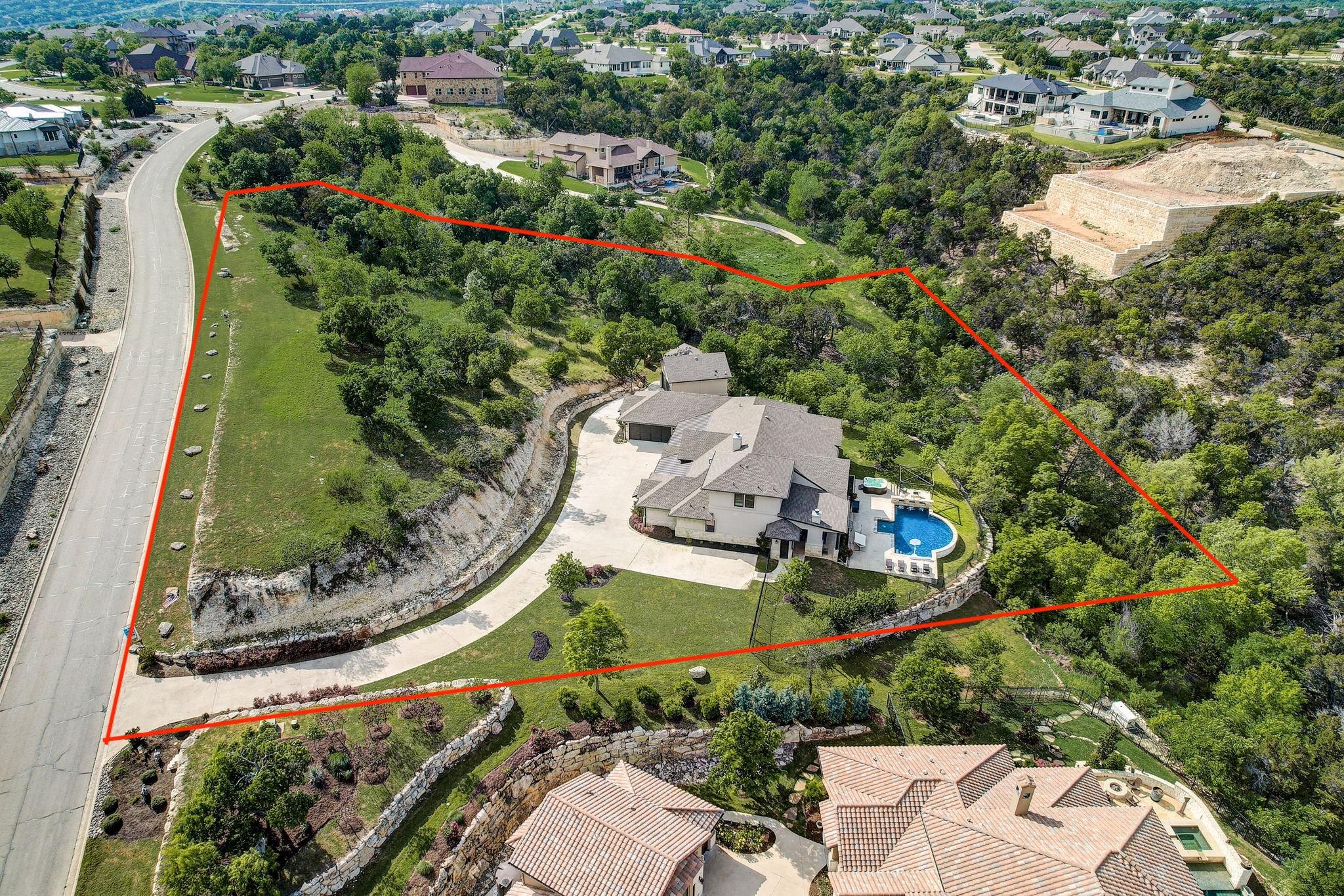 Hill Country luxury awaits in this stunning custom home set on one of the largest estate lots in the exclusive gated community of Grand Mesa at Crystal Falls with a sprawling 3.4-acre lot with almost 180-degree hill country views that will never be altered. With plenty of acreage on the lot to add supplemental space; a separate dwelling for company, fun, and storage or to transform the current separate garage (currently with ½ bath) to a guest house, or for your specific personal needs. Originally the builder's personal home, this backyard oasis features an in-ground pool complemented by an optional hot tub, a cabana, fire pit, and a huge covered patio with a built-in outdoor kitchen. All bedrooms, along with a flexible office space with closet (could be 5th bedroom), are conveniently located on the main level, offering the comfort of a single-story home. The master suite is a private escape, complete with a spa-like bath and two generous walk-in closets. Upstairs, the spacious game room with a half bath provides additional leisure space and/or option 5th bedroom. The spacious open floor plan features large light-filled rooms, and modern, luxurious touches like hand-scraped hardwood floors and designer lighting. The gourmet kitchen offers top-of-the-line stainless steel appliances, a large center island, and a cozy breakfast area - all overlooking the family room. Storage is plentiful with an oversized attached garage and an additional detached garage with a half bath. Situated close to schools, entertainment, medical facilities, shopping, and The Highland Lakes, with access to two amenity centers featuring pools, splash pad, parks, playgrounds, sand volleyball, tennis courts, fishing lake, and outdoor pavilion. Zoned for the highly-rated schools within Leander ISD. Schedule a showing today.