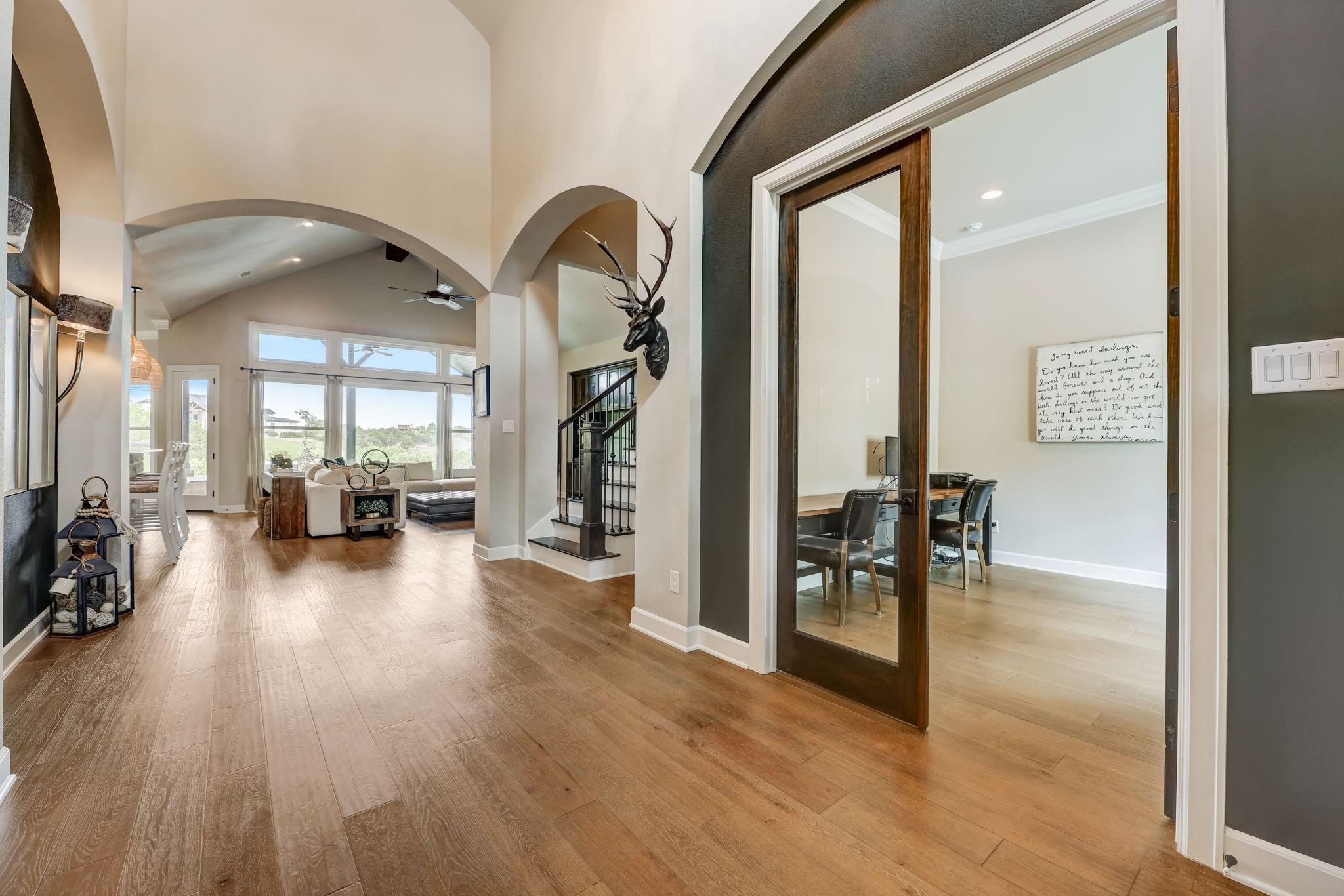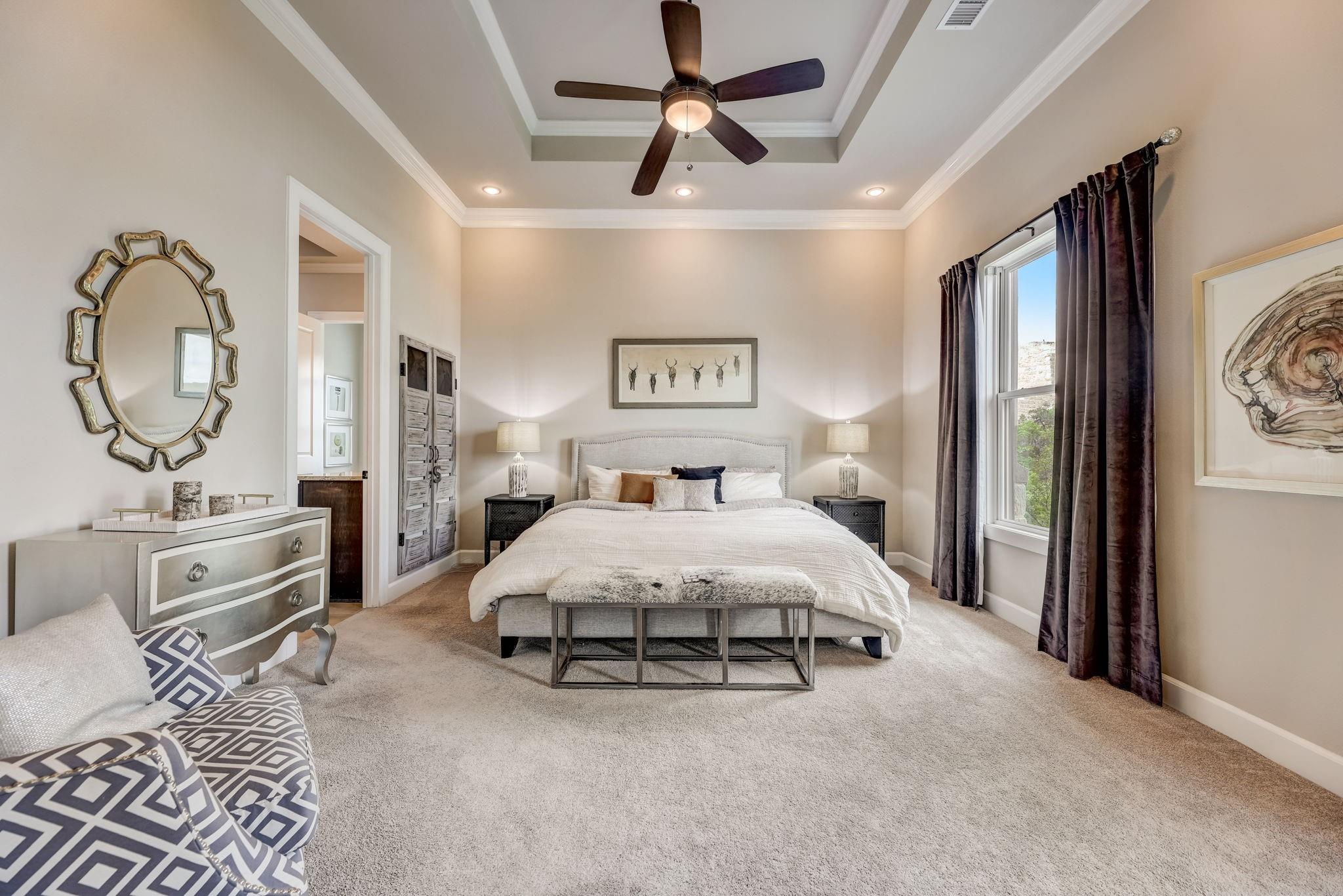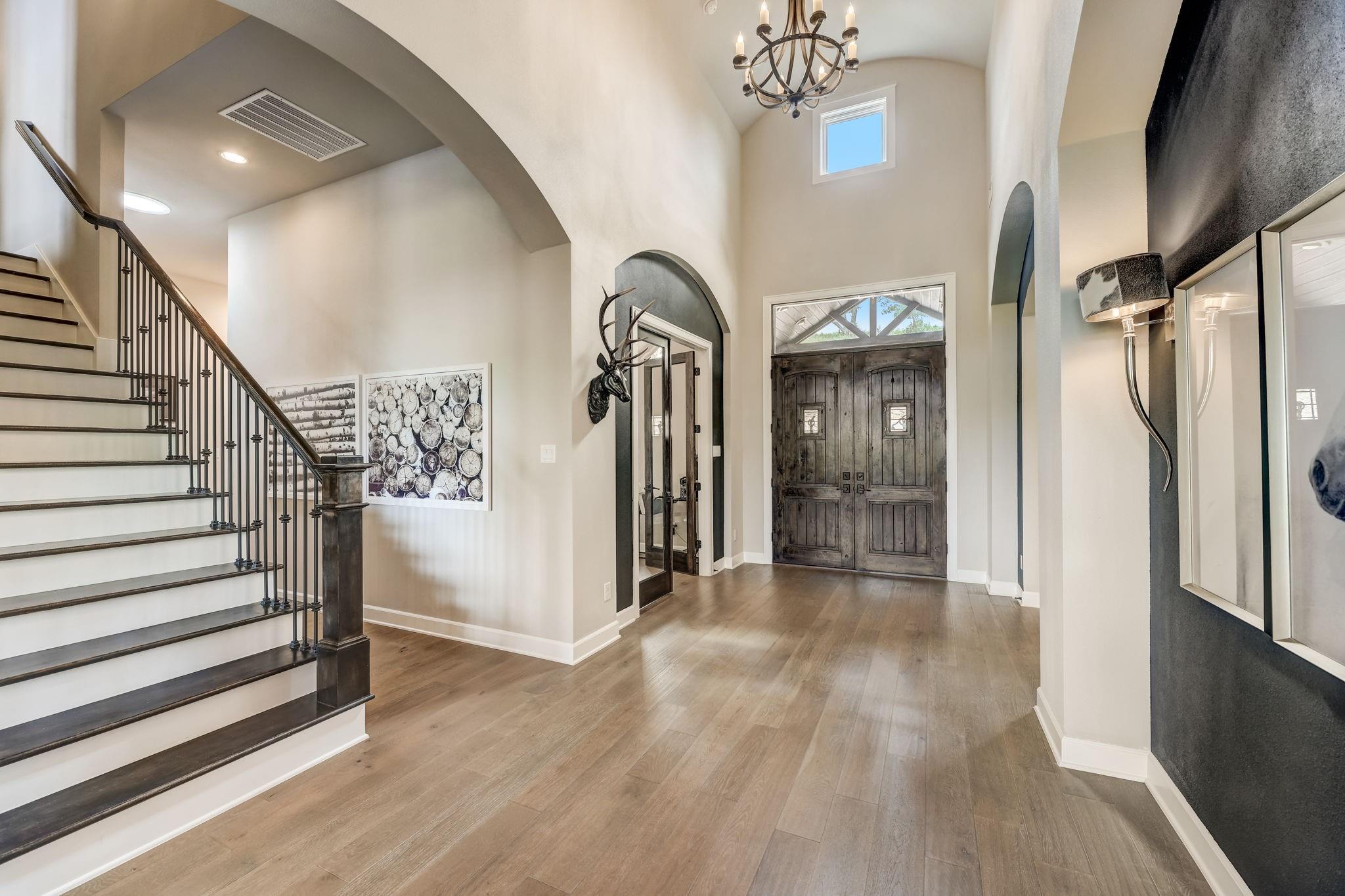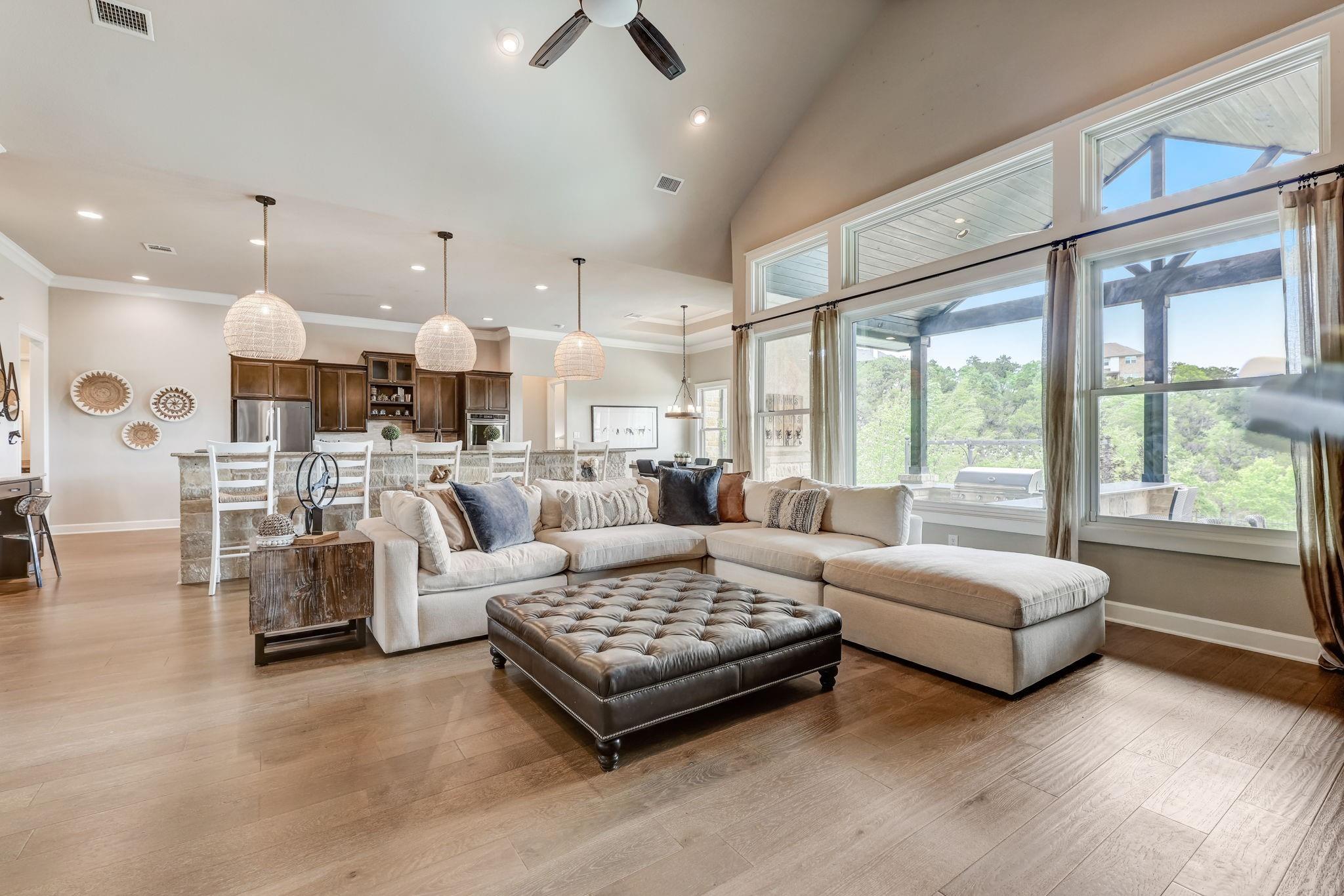 Hill Country luxury awaits in this stunning custom home set on one of the largest estate lots in the exclusive gated community of Grand Mesa at Crystal Falls with a sprawling 3.4-acre lot with almost 180-degree hill country views that will never be altered. With plenty of acreage on the lot to add supplemental space; a separate dwelling for company, fun, and storage or to transform the current separate garage (currently with ½ bath) to a guest house, or for your specific personal needs. Originally the builder's personal home, this backyard oasis features an in-ground pool complemented by an optional hot tub, a cabana, fire pit, and a huge covered patio with a built-in outdoor kitchen. All bedrooms, along with a flexible office space with closet (could be 5th bedroom), are conveniently located on the main level, offering the comfort of a single-story home. The master suite is a private escape, complete with a spa-like bath and two generous walk-in closets. Upstairs, the spacious game room with a half bath provides additional leisure space and/or option 5th bedroom. The spacious open floor plan features large light-filled rooms, and modern, luxurious touches like hand-scraped hardwood floors and designer lighting. The gourmet kitchen offers top-of-the-line stainless steel appliances, a large center island, and a cozy breakfast area - all overlooking the family room. Storage is plentiful with an oversized attached garage and an additional detached garage with a half bath. Situated close to schools, entertainment, medical facilities, shopping, and The Highland Lakes, with access to two amenity centers featuring pools, splash pad, parks, playgrounds, sand volleyball, tennis courts, fishing lake, and outdoor pavilion. Zoned for the highly-rated schools within Leander ISD. Schedule a showing today.