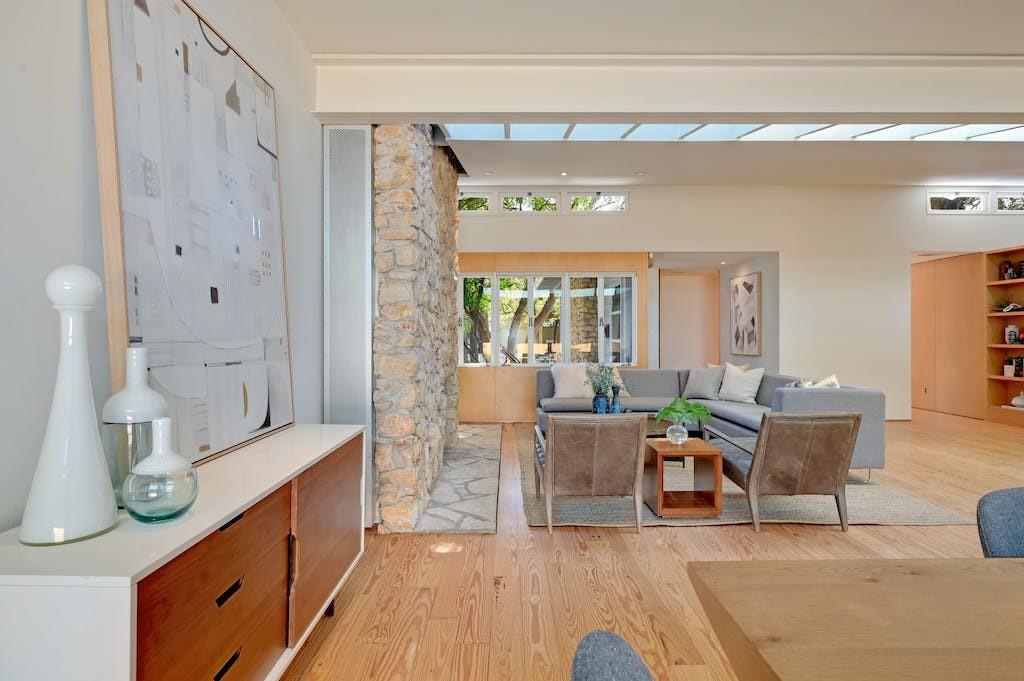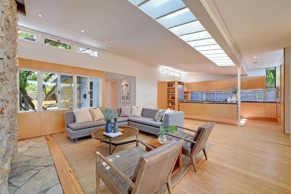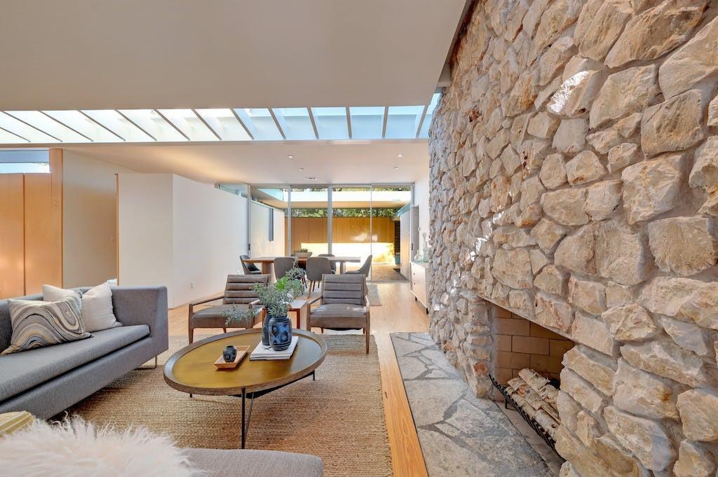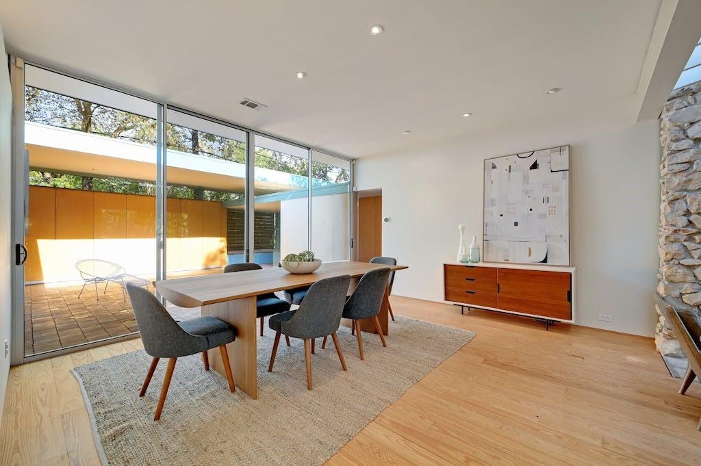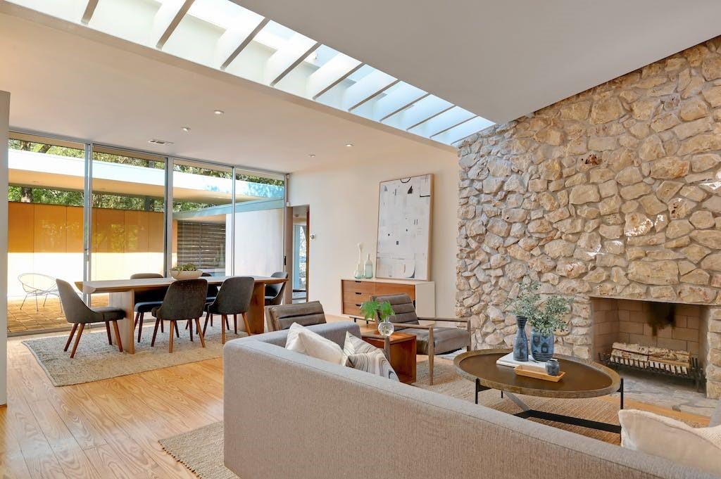 Nestled in the heart of Zilker Park, this exceptional mid-century modern home is a testament to the timeless design of renowned designer / builder AD Stenger, enhanced by the visionary touch of architect MJ Neal in 2009 and further elevated in 2016. This property seamlessly blends mid-century charm with modern sophistication. Originally built in 1950, this home retains the original lines and low profile exterior and features signature AD Stenger clerestory windows and stone fireplace. In 2009, MJ Neal remodeled the entire home with a modern twist. The project featured an open gourmet kitchen with soapstone counters and Viking appliances, custom maple cabinetry and paneling to compliment the pine floors, walls of glass opening to a central atrium, updated baths including a primary glass shower overlooking a private side atrium and a massive central skylight that floods the interior with natural light. In 2016, the award winning "transformer room" was created to connect the interior to the exterior via architectural walls featuring a modern drawbridge and custom glass corner that hinges open to the neighborhood. Don't miss the opportunity to own a piece of Austin's architectural history with this meticulously updated mid-century masterpiece.
