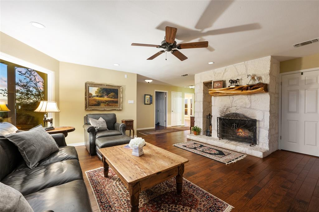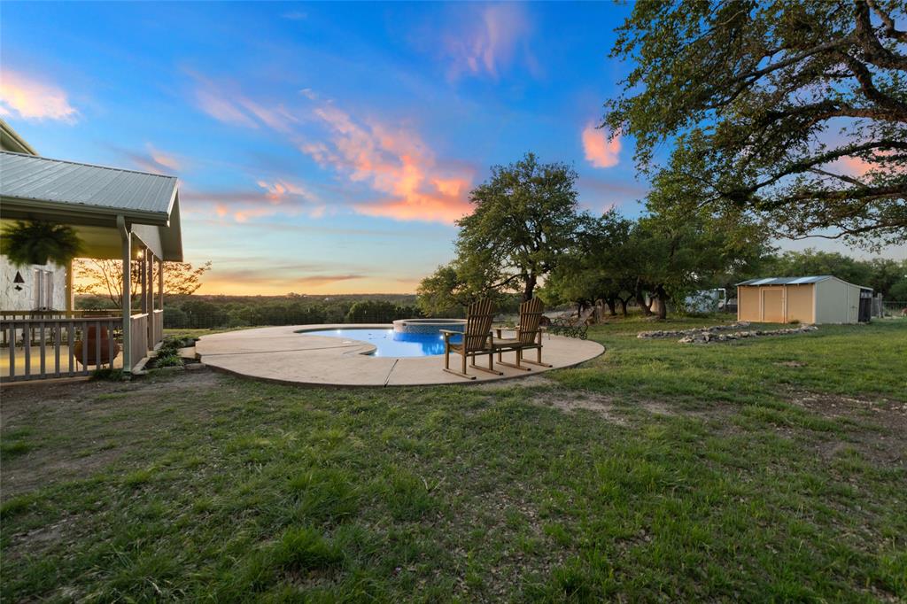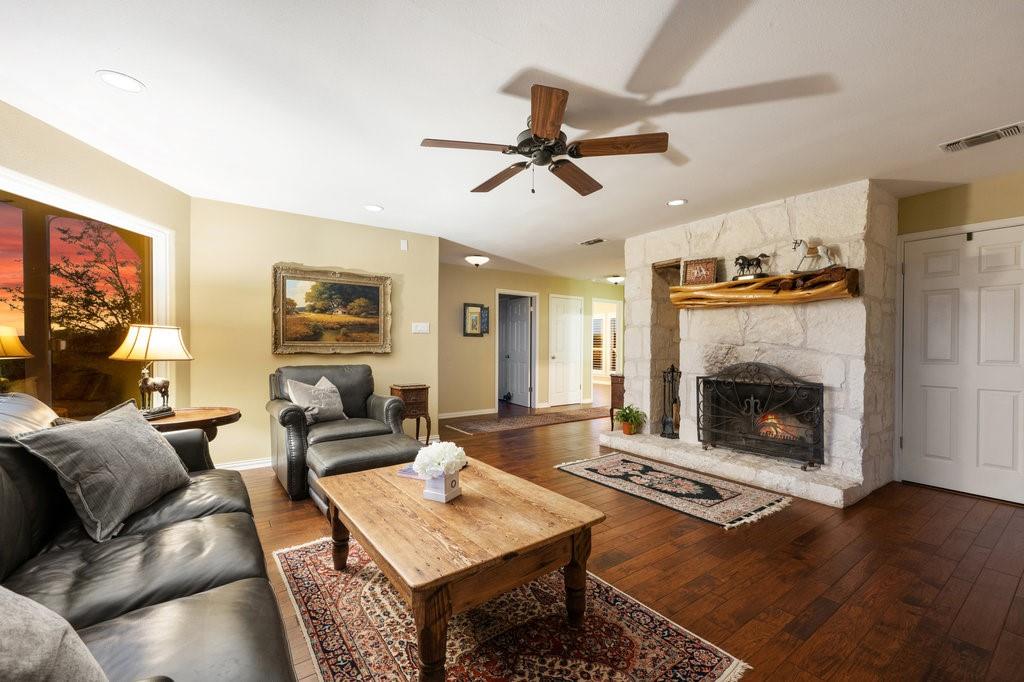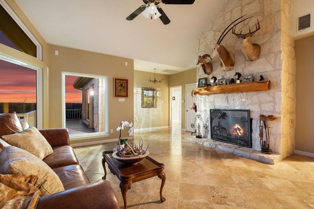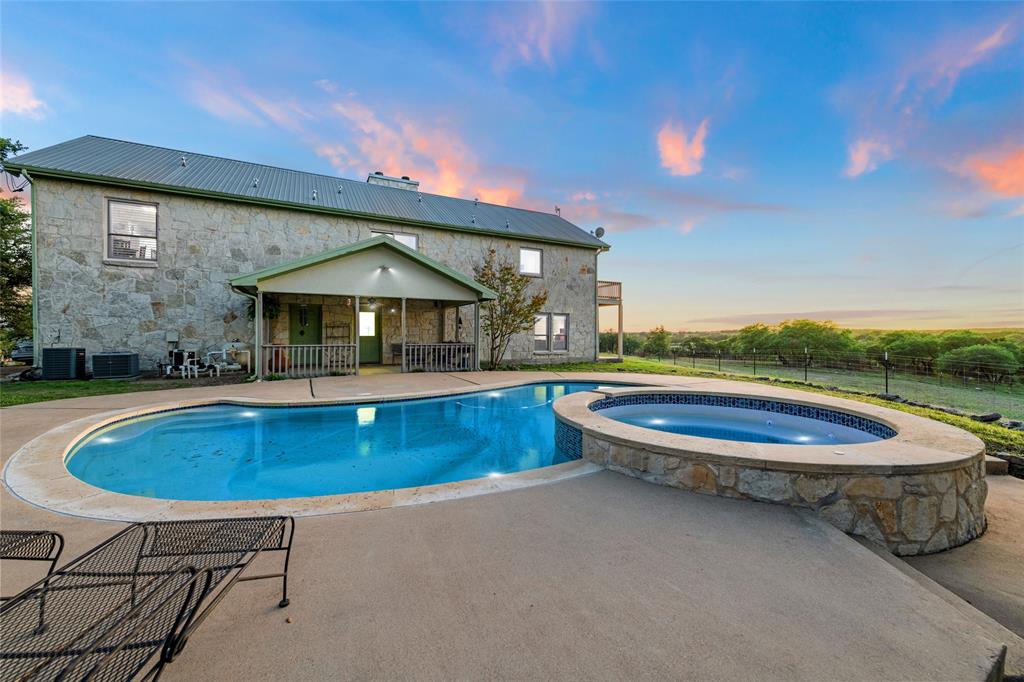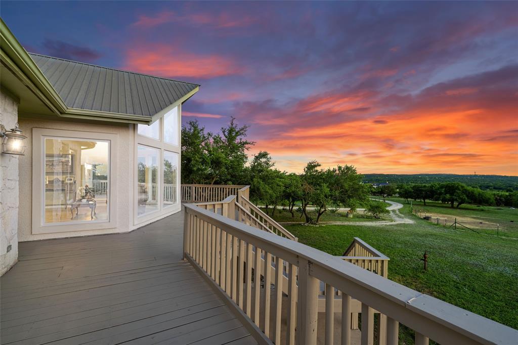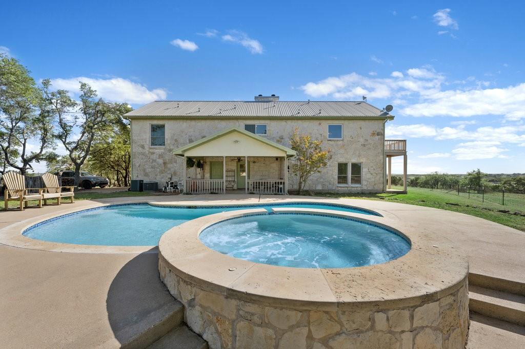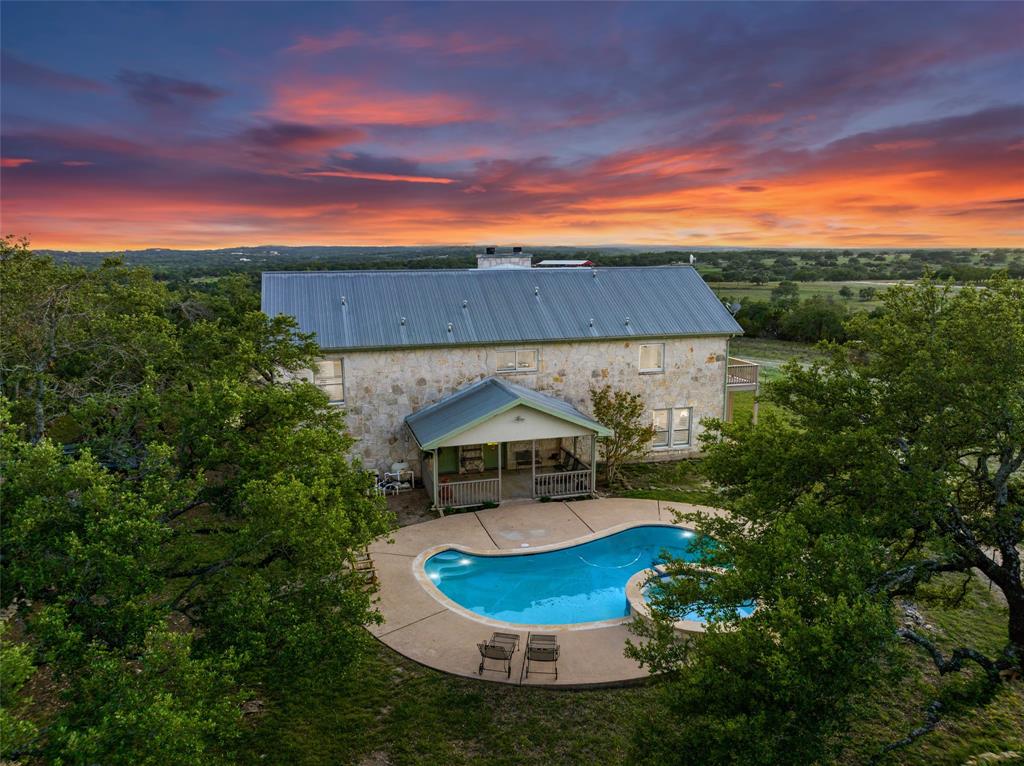 Enjoy The Privilege of Privacy on 29.117 fully fenced acres. With divided pastures this land is cleared, full of towering hardwoods and ag exempt. A gated entry and tree lined drive sets the tone with green fenced pastures on each side allowing your horses or livestock to greet you. This enchanting custom home has been remodeled to offer a tranquil getaway with modern luxury. Nestled high on a hilltop with 3140 square feet, you will find 3 bedrooms, a study which can serve as a 4th bedroom, 3 full baths, two living both with white limestone fireplaces, 2 dining rooms and a large country kitchen with soft white cabinetry and windows that bring nature inside. Generously sized family room with vaulted ceilings graced by a stone fireplace and huge walls of windows that invite wonderful natural light and breathtaking sunsets over the spacious deck. Rich travertine flooring flows throughout this main level where you will find a private owner's retreat with soft white shutters on windows and access to freshly painted deck. A sunny breakfast nook and a handsome study could serve as your 4th bedrooms with access to a beautifully remodeled full bathroom. The lower level offers 2 bedrooms with wood flooring, shutters on windows and a beautifully remodeled bathroom offering tile wainscotting, dual vanities with granite countertops and a walk-in shower with floor to ceiling tile surround. The grand living room showcases a built-in entertainment wall with bookshelves and walls of glass to enjoy views and grant access to covered patio. Treat your senses aside a sparkling pool with a waterfall spa and a covered patio which delivers wonderful views of land and hill country. Multiple outdoor living areas creating a wealth of entertaining options. The large Mueller metal building has two rooms totaling nearly 3000 square feet of storage. This land can be subdivided into 6 acre parcels and has two entrances to the land. One entrance is on Fitzhugh and the other on South Oak Forest.