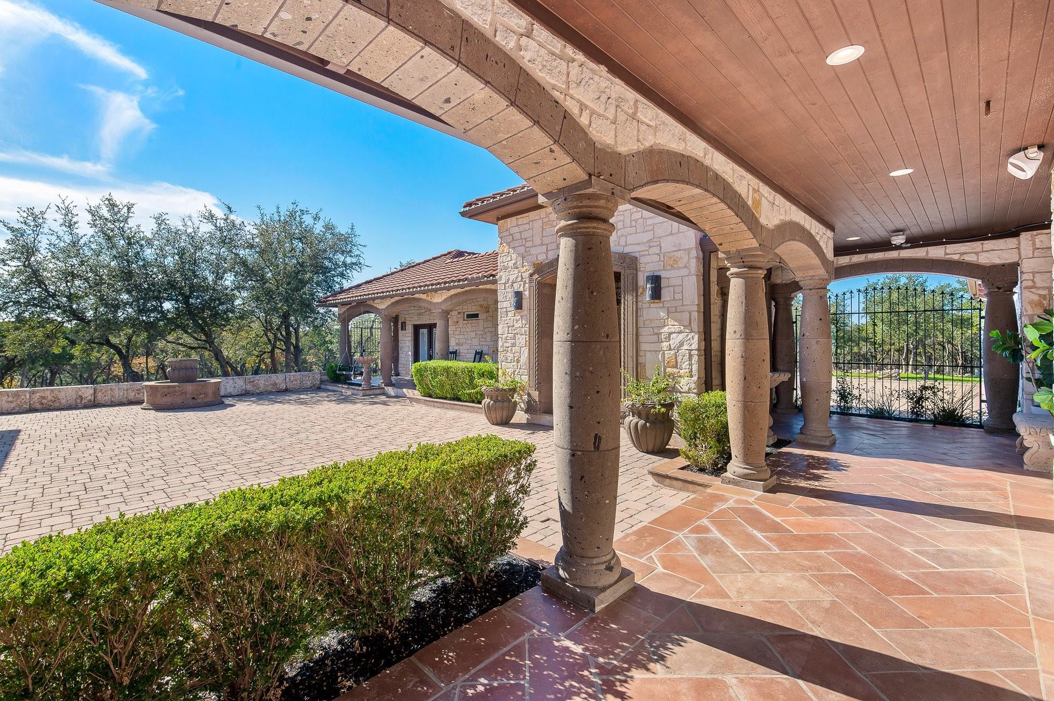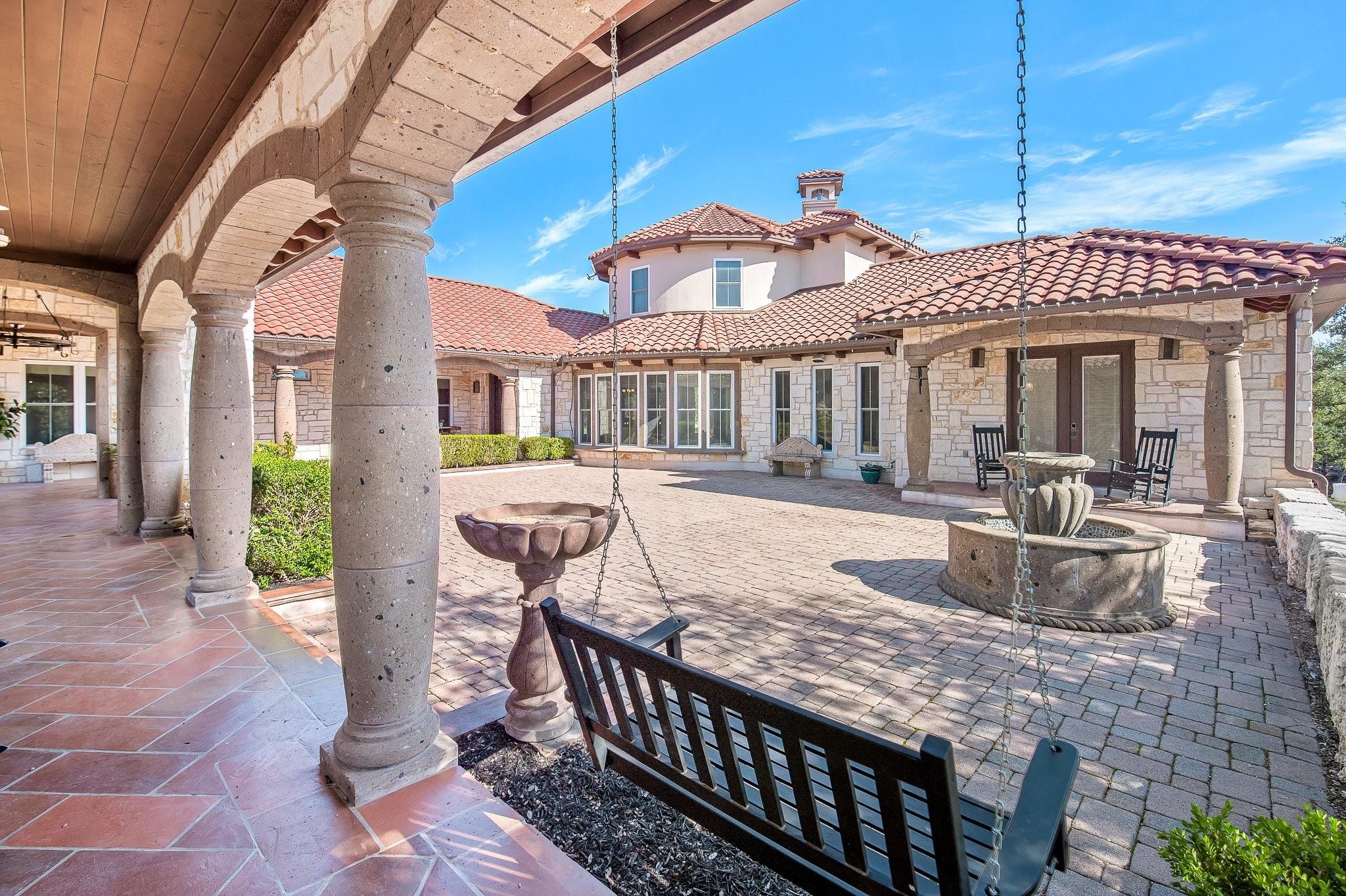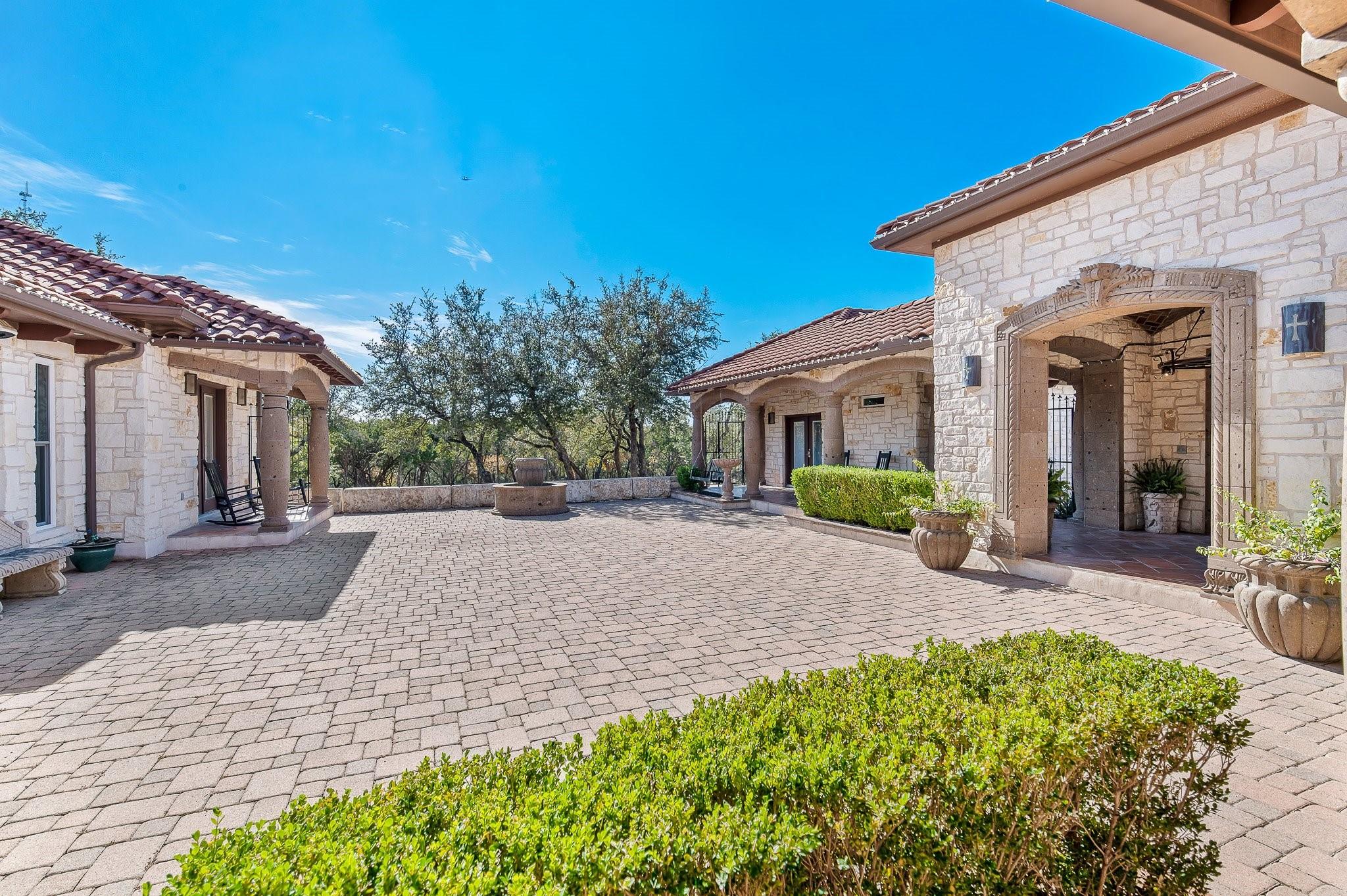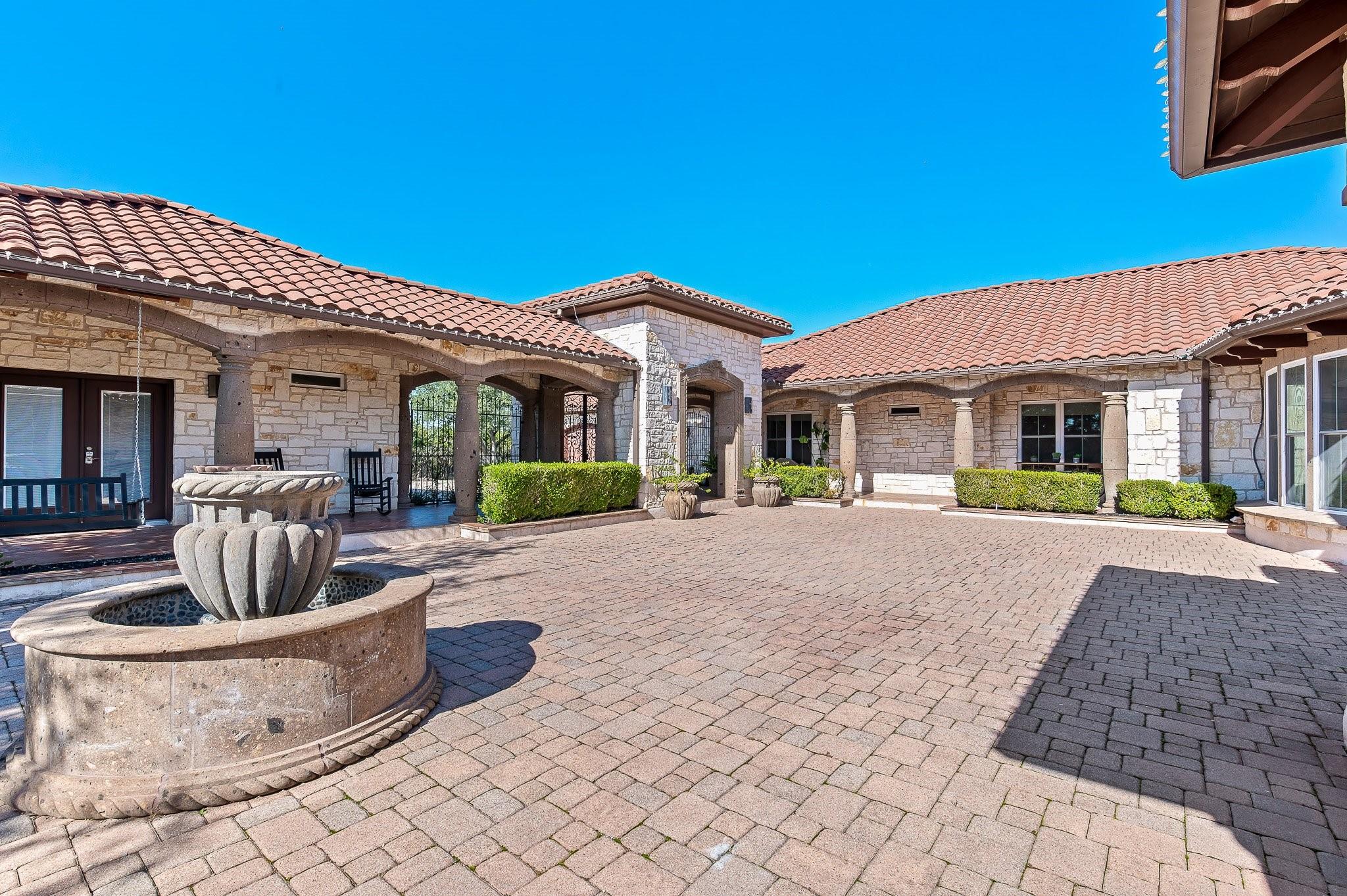 Stunning home on over 7 acres of gently rolling elevations with amazing hill-country views. Part of undeveloped land is zoned commercial for Local Office 2A. See Agent/Owner for details. From the courtyard to the massive kitchen and sunken family room, you'll want to stay. The master is beautifully nestled on it own wing of the house and is accompanied by a fabulous master bath complete with domed ceilings, walk in shower and closets as well as an oversized jetted/heated tub...you will LOVE IT! If you entertain, this is the place. Theatre room upstairs can double as a game room and the kids will love the pool and BB court. Families will love either of the 2 outdoor firepits and the covered patio has its own propane stone fireplace perfect for after you've finished cooking and want a fire. The other wing of the house has 4 bedrooms and 2 full baths, one being a Jack-n-Jill style. The laundry room is also on this side of the home and has lots of natural light and space for a full size refrigerator as well as has a full size sink. You'll have plenty of attic space for storage that is accessible in the main house 2 car garage. YES your Texas truck will fit in this garage! The courtyard is a wonderful place to entertain and has a fantastic water fountain that also has a propane fire feature that allows the fire to dance on the water. The breeze ways and most of the inside of the house has a home speaker system that is controlled in the living room (see agent for details)...it makes it easy to have music for parties! Make sure to check out the guest house with a mini bar/kitchen area and its own full bathroom and one car garage. Last make your way down to the octagon treehouse. It is truly unique.