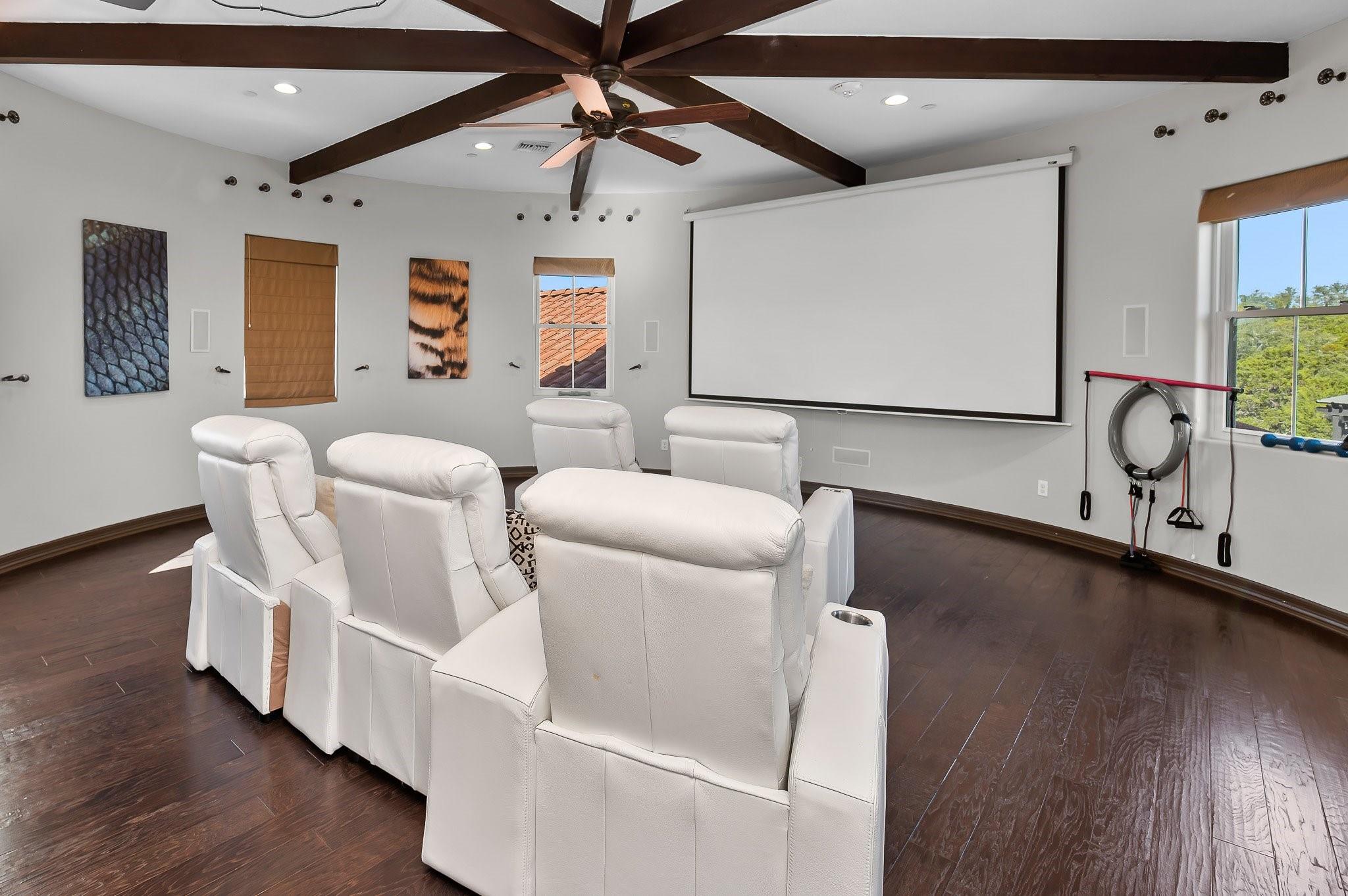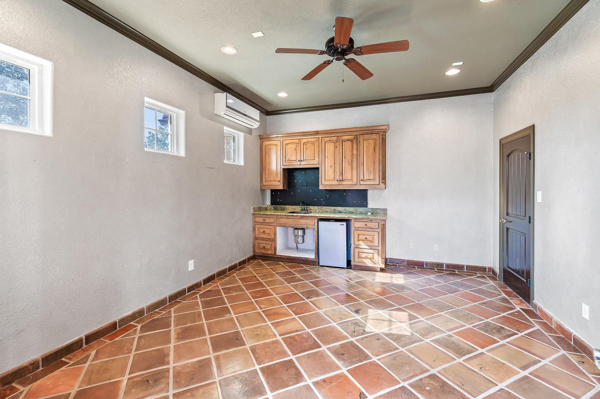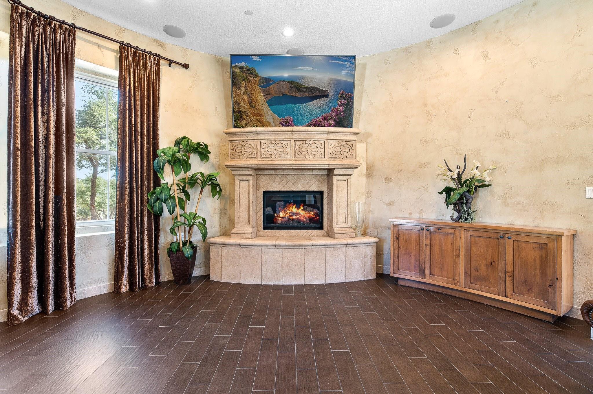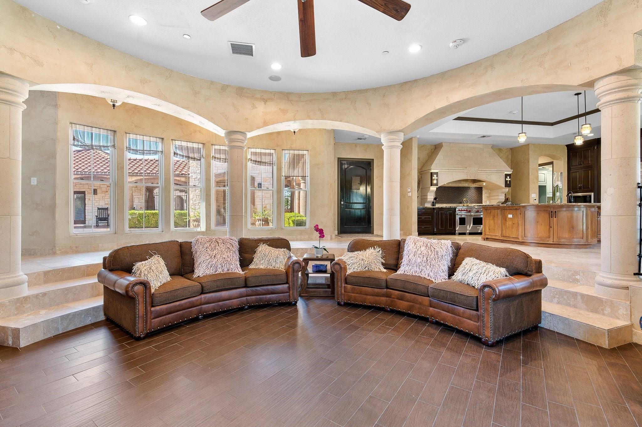 Stunning home on over 7 acres of gently rolling elevations with amazing hill-country views. Part of undeveloped land is zoned commercial for Local Office 2A. See Agent/Owner for details. From the courtyard to the massive kitchen and sunken family room, you'll want to stay. The master is beautifully nestled on it own wing of the house and is accompanied by a fabulous master bath complete with domed ceilings, walk in shower and closets as well as an oversized jetted/heated tub...you will LOVE IT! If you entertain, this is the place. Theatre room upstairs can double as a game room and the kids will love the pool and BB court. Families will love either of the 2 outdoor firepits and the covered patio has its own propane stone fireplace perfect for after you've finished cooking and want a fire. The other wing of the house has 4 bedrooms and 2 full baths, one being a Jack-n-Jill style. The laundry room is also on this side of the home and has lots of natural light and space for a full size refrigerator as well as has a full size sink. You'll have plenty of attic space for storage that is accessible in the main house 2 car garage. YES your Texas truck will fit in this garage! The courtyard is a wonderful place to entertain and has a fantastic water fountain that also has a propane fire feature that allows the fire to dance on the water. The breeze ways and most of the inside of the house has a home speaker system that is controlled in the living room (see agent for details)...it makes it easy to have music for parties! Make sure to check out the guest house with a mini bar/kitchen area and its own full bathroom and one car garage. Last make your way down to the octagon treehouse. It is truly unique.