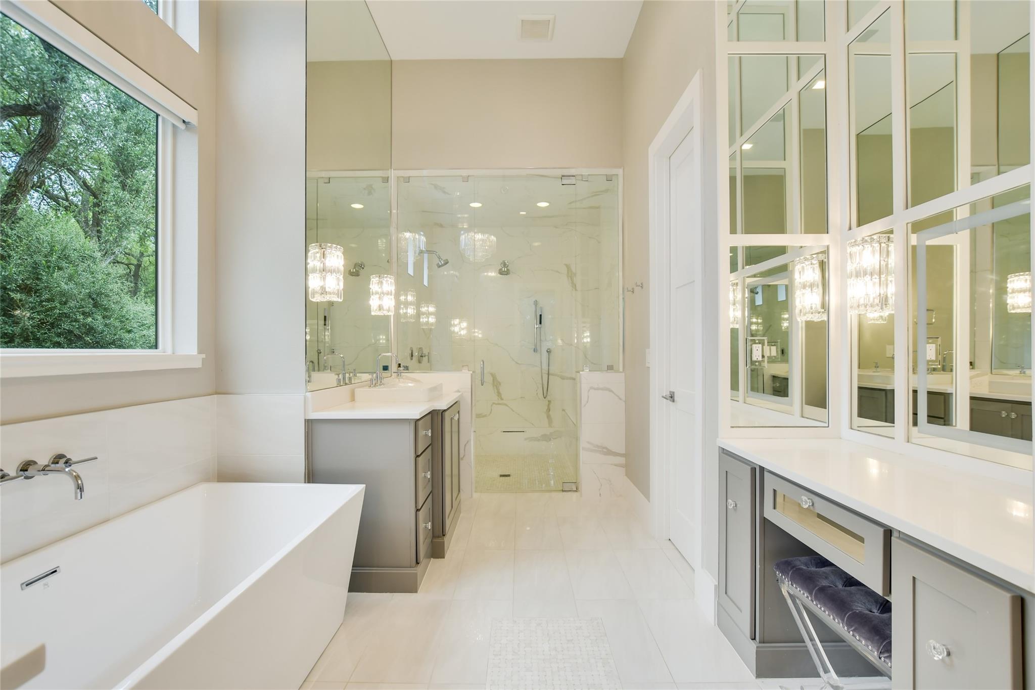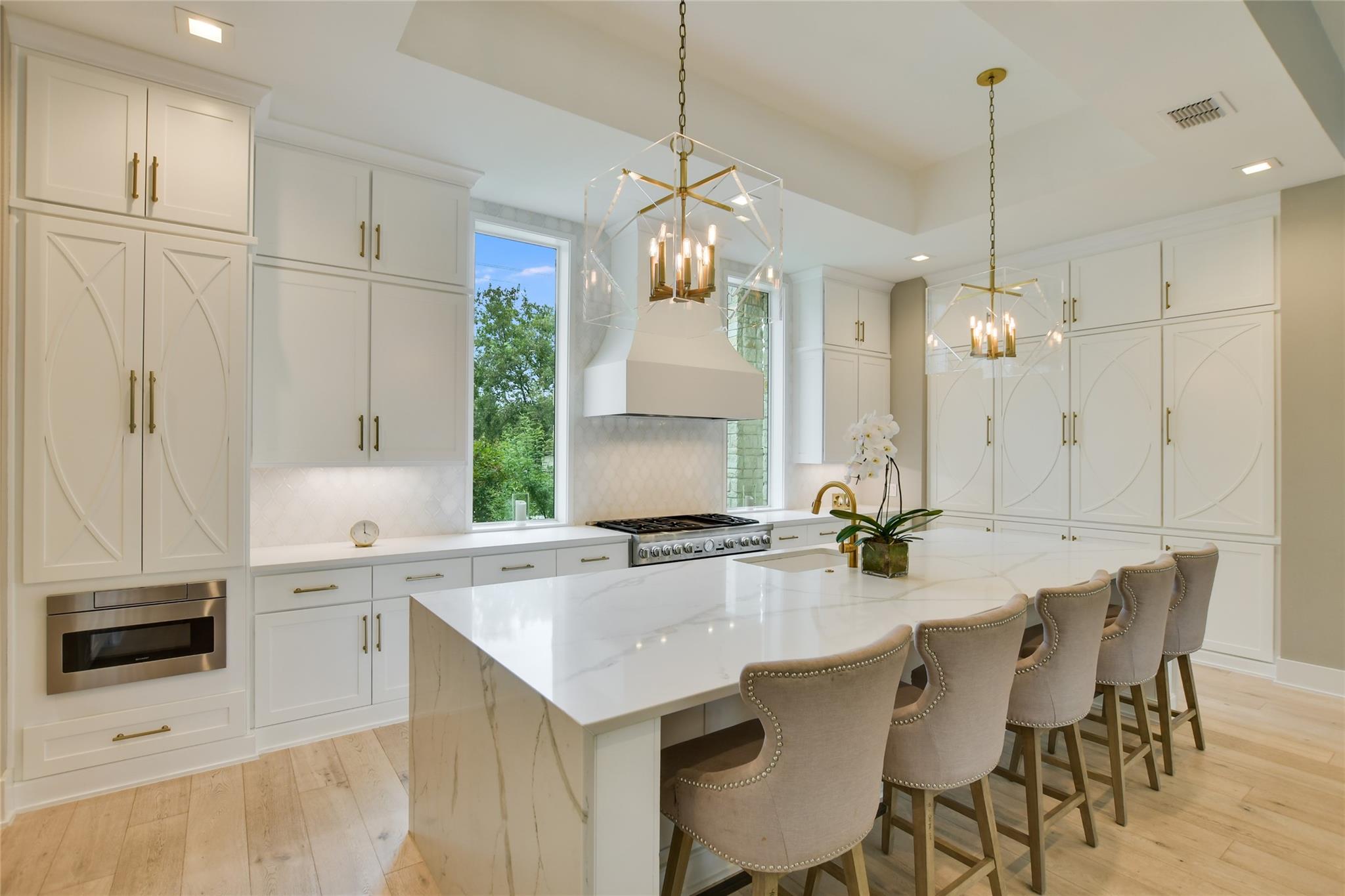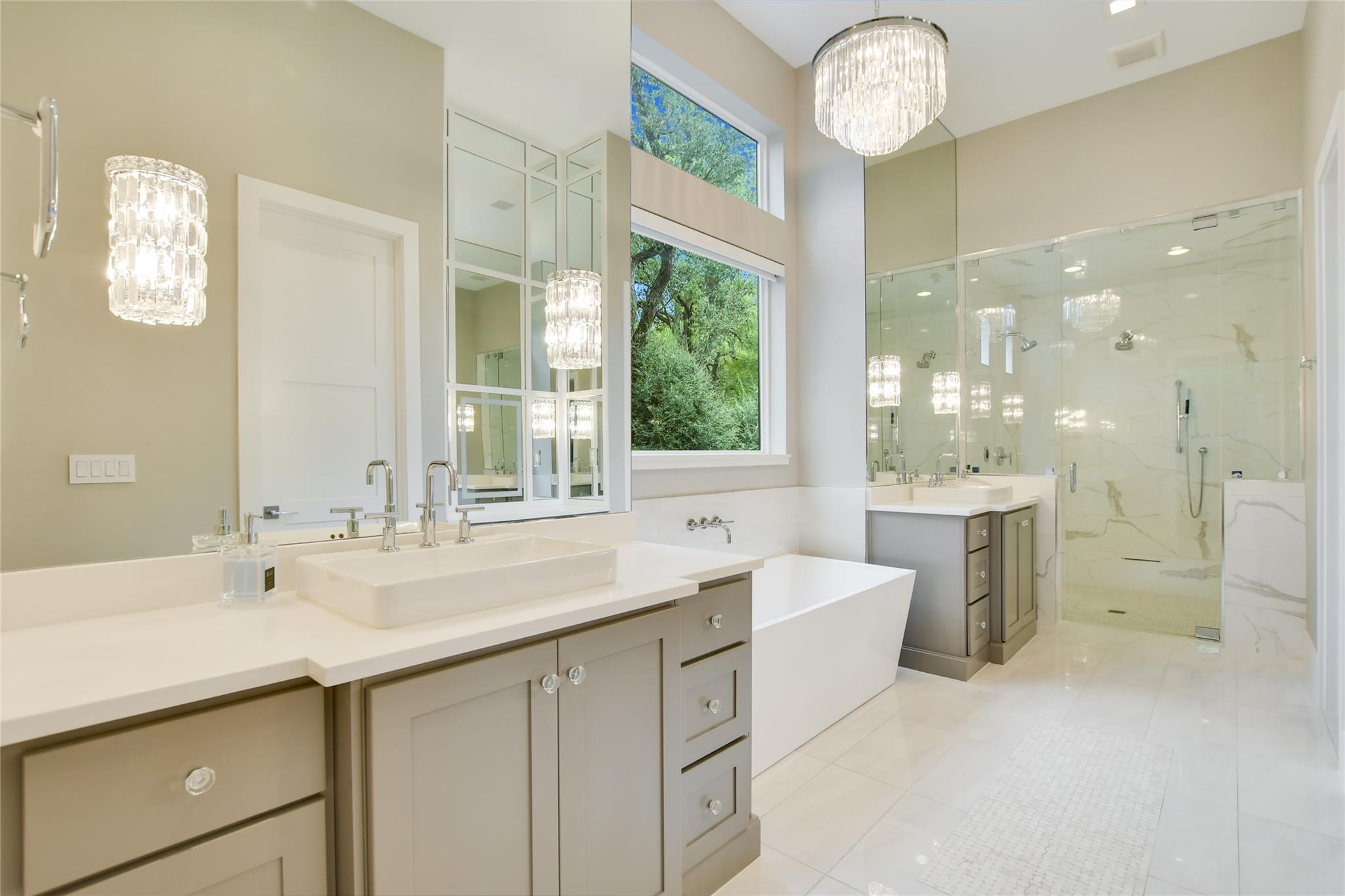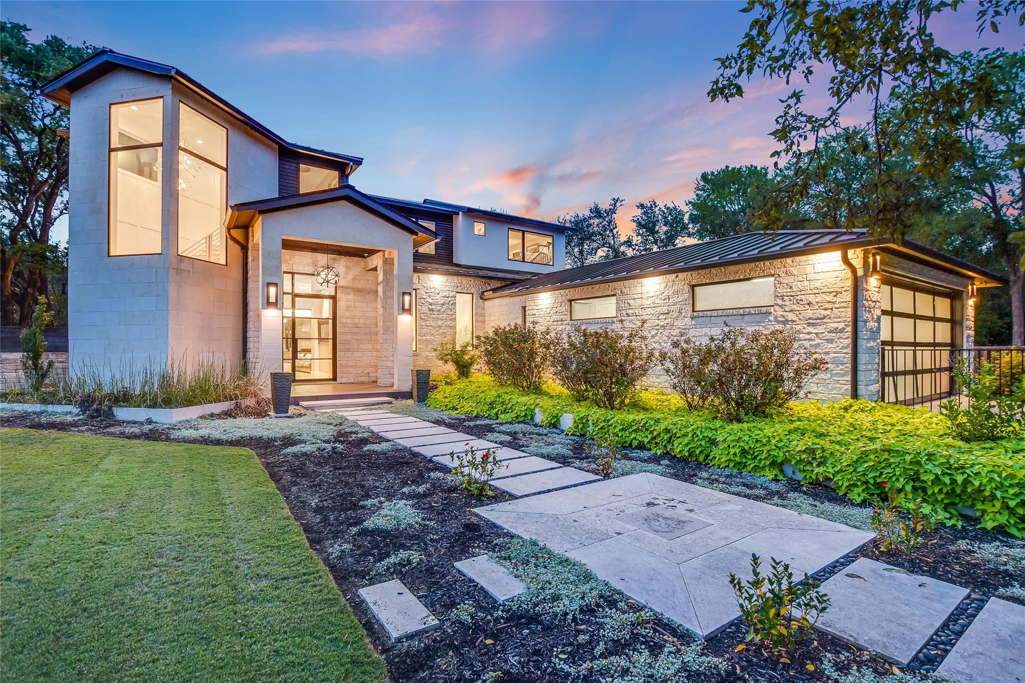 Elegant transitional on a secluded but supremely convenient Westlake street filled with mature trees, large lots, and beautiful homes. Faced with limestone and stucco, the façade is accented with steel doors and windows and topped with a standing-seam metal roof for a modern take on the Hill Country aesthetic. Walking distance from Bee Caves Road, and downtown is just four miles away, with plenty of shopping, dining, and entertainment in between. The back of the home opens to the view of a resort-worthy pool, spa, and manicured landscaping. Grill up dinner in the gourmet, fully equipped summer kitchen and end the evening gathered around the fire pit. Inside, the home features designer-selected finishes like European white oak flooring, dramatic crystal lighting, marble-clad bathrooms, a stacked-stone modern fireplace, plus a chef’s kitchen outfitted with an entire suite of Thermador appliances. Enjoy a sumptuous primary suite and a mirrored gym on the main floor, an upstairs game room, and a state-of-the-art home theatre complemented by control four home automation technology plus many extras.