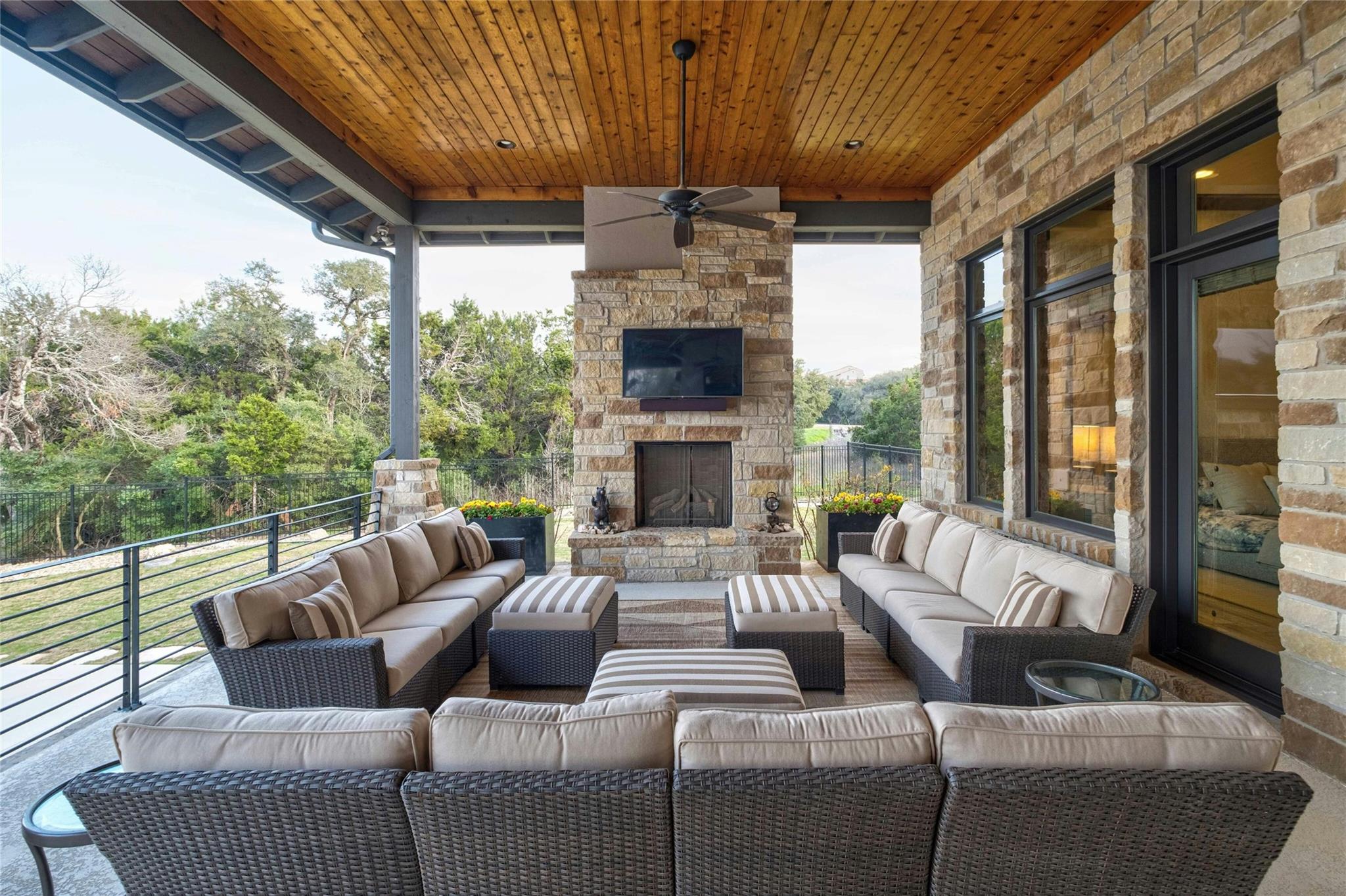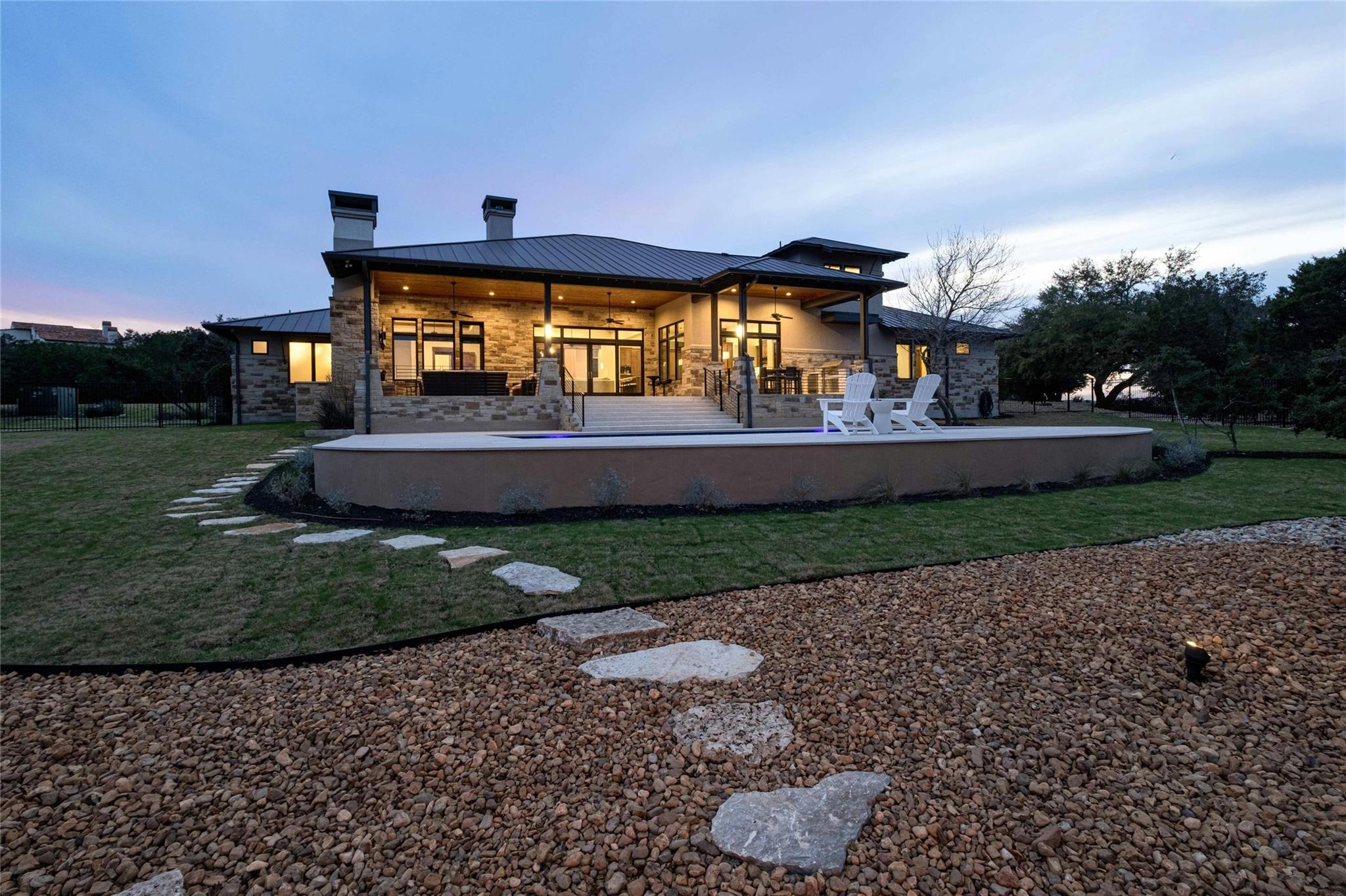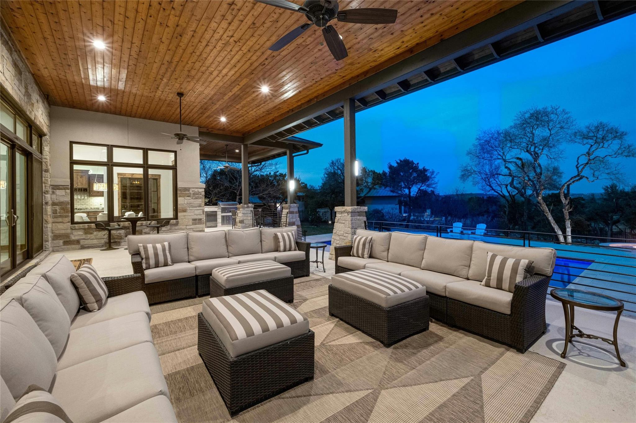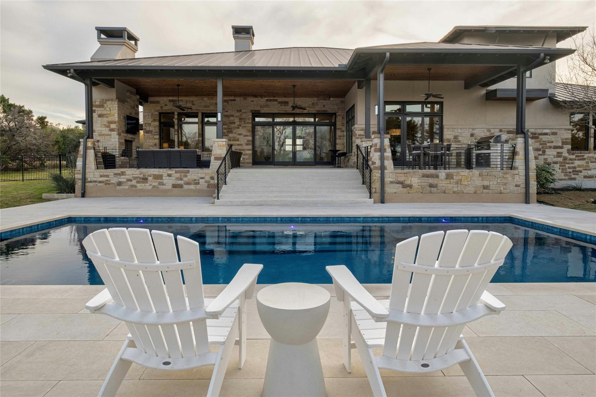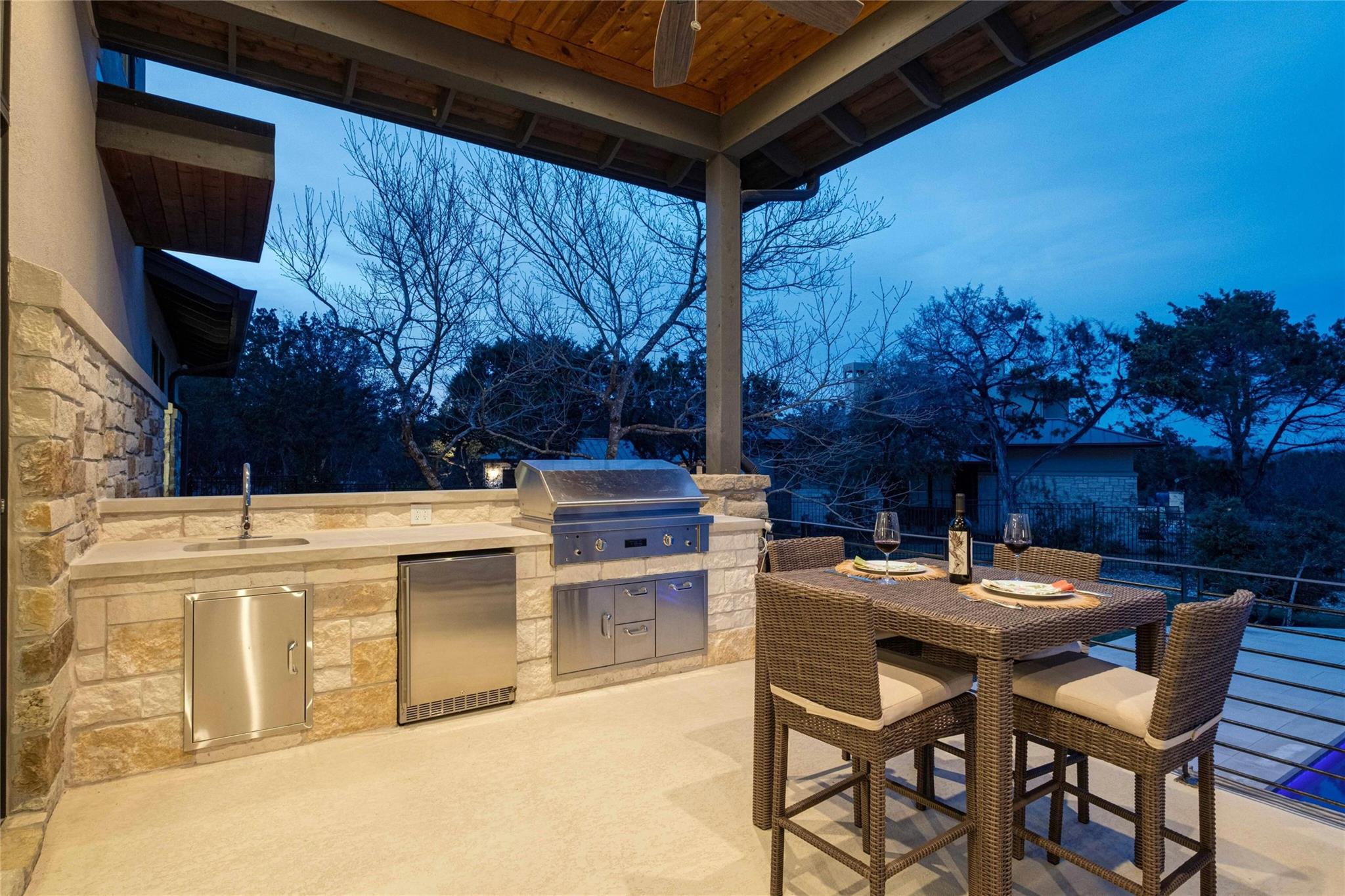 Lightly lived in quality custom constructed one story home in the gated community of Amarra. Designed by Kai Geschke and built by Robert Stephens Homes it has a wonderful layout and attention to detail throughout. The current owners finished out upstairs with a lovely ensuite bedroom perfect for guests and added a 20x40 heated pool, brand new outdoor kitchen with Tec grill and refrigerator and a gorgeous fire pit at the bottom of the garden. The large covered patio leading to the fenced backyard is a peaceful oasis for outdoor living and entertaining. The home sits on almost an acre and backs to the 9th green of The Canyons golf course. The Canyons grill restaurant, driving range and pro shop are a short walk or golf cart ride away. The wow factor continues inside with natural wood and stone throughout, a gourmet kitchen boasts granite counters, a Subzero refrigerator, 6 burner Wolf range, two Bosch dishwashers and a plumbed Miele coffee machine. The high quality construction includes a certified class 4 roof, insulation throughout (including garage), Marvin casement wood clad windows, stain grade custom doors, trim, crown molding and cabinets, Toto toilets, WiFi irrigation and central vacuum. For wine lovers, there is a 500 bottle temperature controlled wine cellar! All four bedrooms have their own full bathrooms. The home conveys a property owner's social membership to Barton Creek Country Club. Privileges include swimming, dining, club events, use of spa and an amazing fitness center with exercise classes. This is one of the few neighborhoods that you can own and drive your registered golf cart on the course (monthly fee applies).