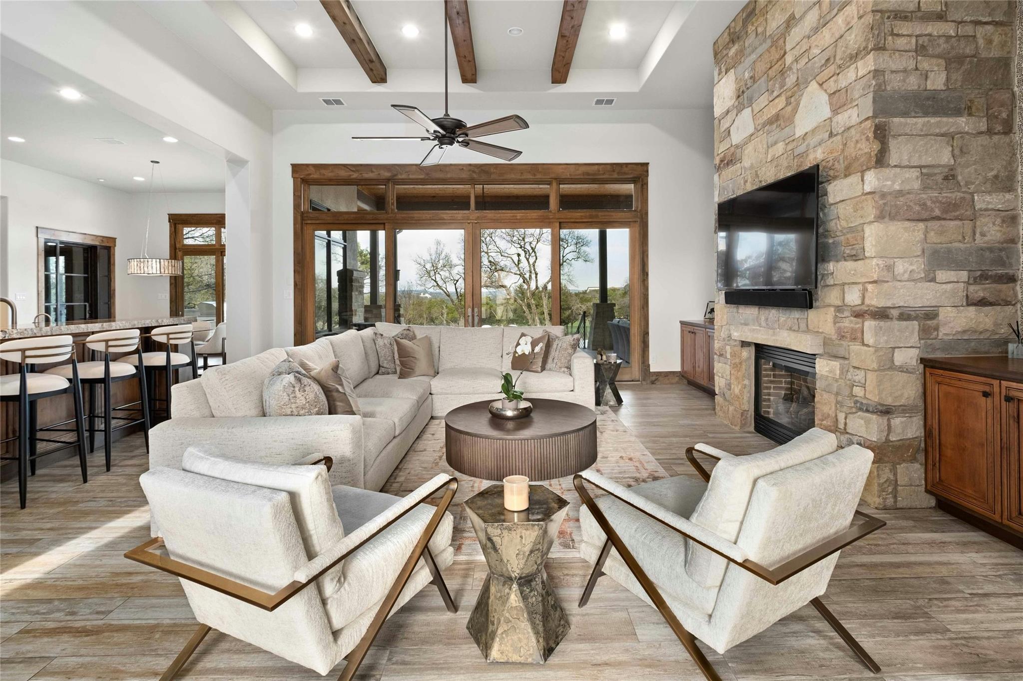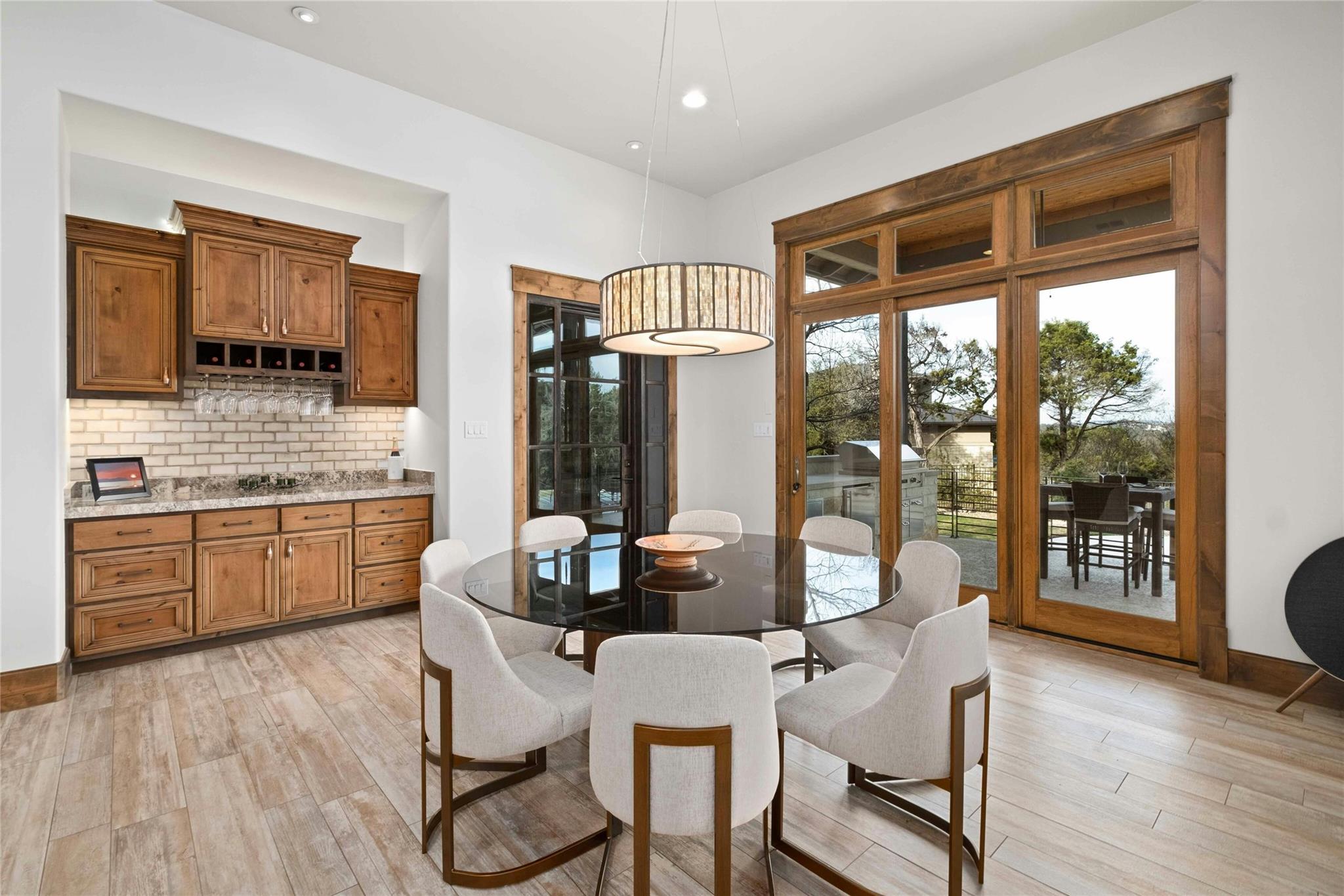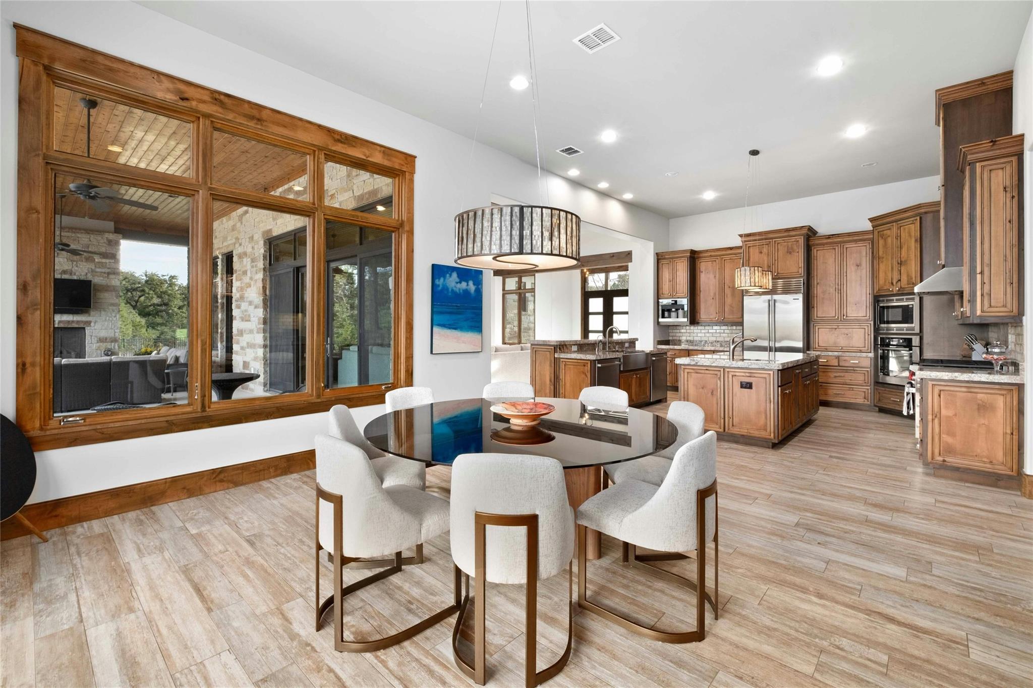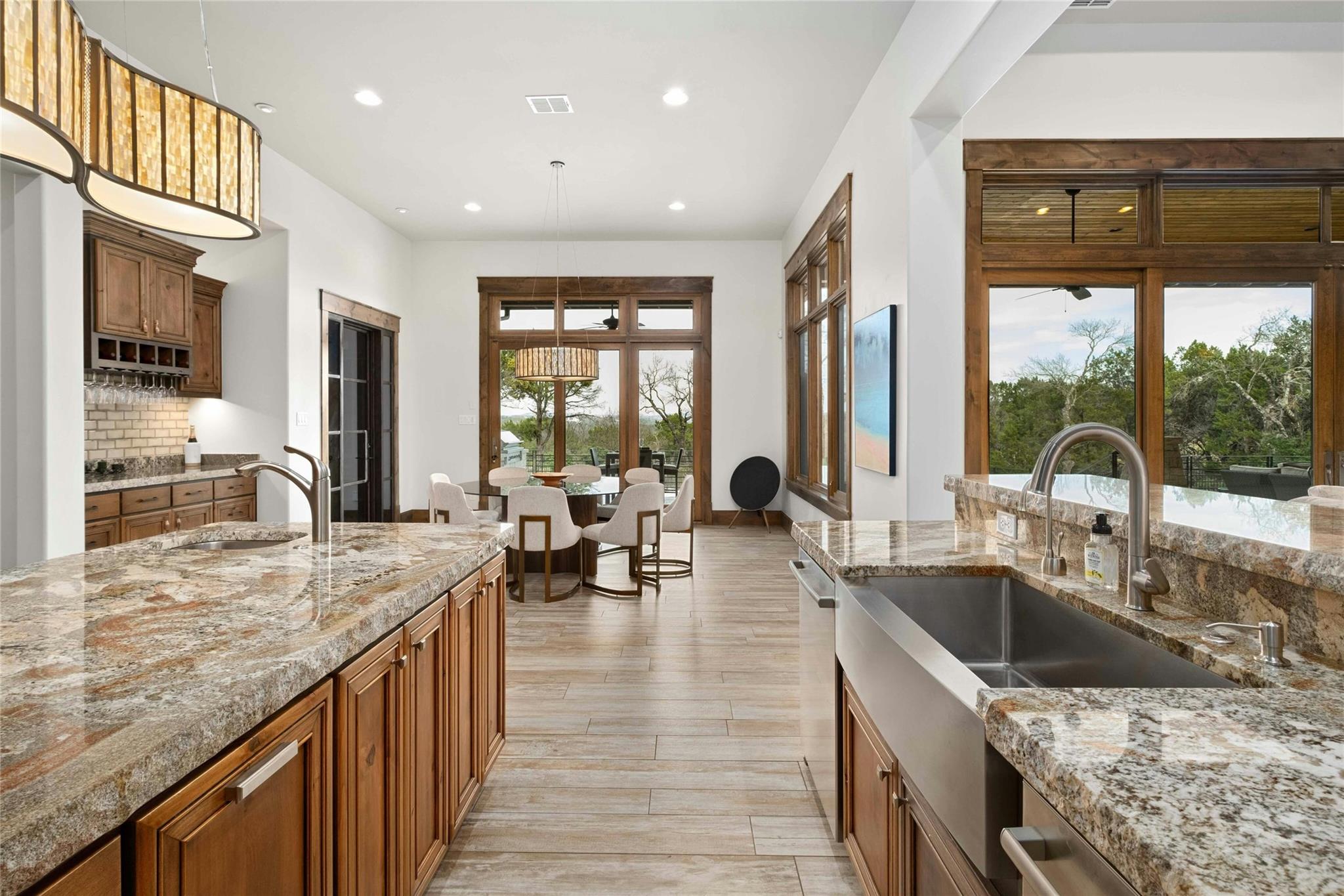 Lightly lived in quality custom constructed one story home in the gated community of Amarra. Designed by Kai Geschke and built by Robert Stephens Homes it has a wonderful layout and attention to detail throughout. The current owners finished out upstairs with a lovely ensuite bedroom perfect for guests and added a 20x40 heated pool, brand new outdoor kitchen with Tec grill and refrigerator and a gorgeous fire pit at the bottom of the garden. The large covered patio leading to the fenced backyard is a peaceful oasis for outdoor living and entertaining. The home sits on almost an acre and backs to the 9th green of The Canyons golf course. The Canyons grill restaurant, driving range and pro shop are a short walk or golf cart ride away. The wow factor continues inside with natural wood and stone throughout, a gourmet kitchen boasts granite counters, a Subzero refrigerator, 6 burner Wolf range, two Bosch dishwashers and a plumbed Miele coffee machine. The high quality construction includes a certified class 4 roof, insulation throughout (including garage), Marvin casement wood clad windows, stain grade custom doors, trim, crown molding and cabinets, Toto toilets, WiFi irrigation and central vacuum. For wine lovers, there is a 500 bottle temperature controlled wine cellar! All four bedrooms have their own full bathrooms. The home conveys a property owner's social membership to Barton Creek Country Club. Privileges include swimming, dining, club events, use of spa and an amazing fitness center with exercise classes. This is one of the few neighborhoods that you can own and drive your registered golf cart on the course (monthly fee applies).