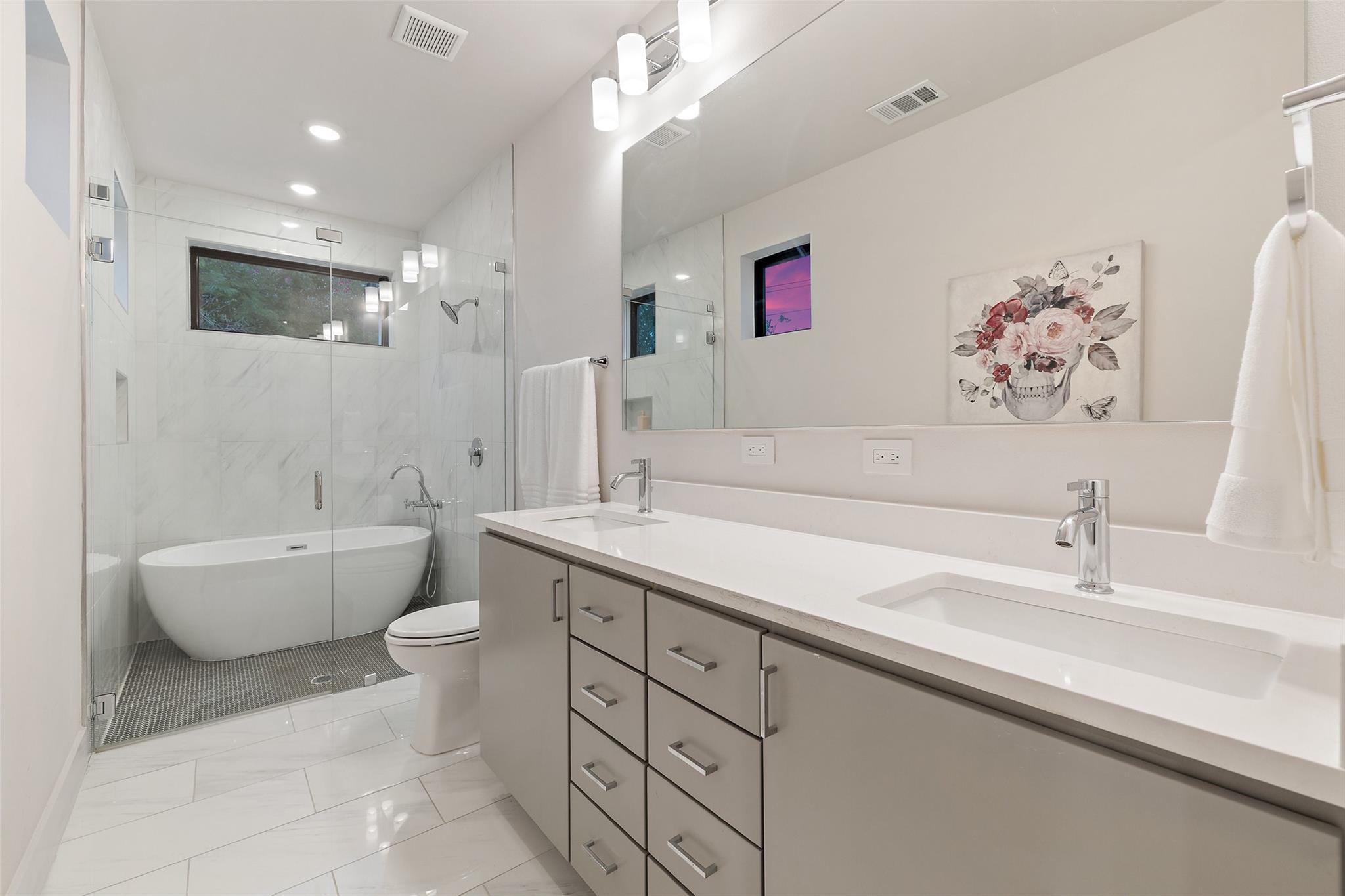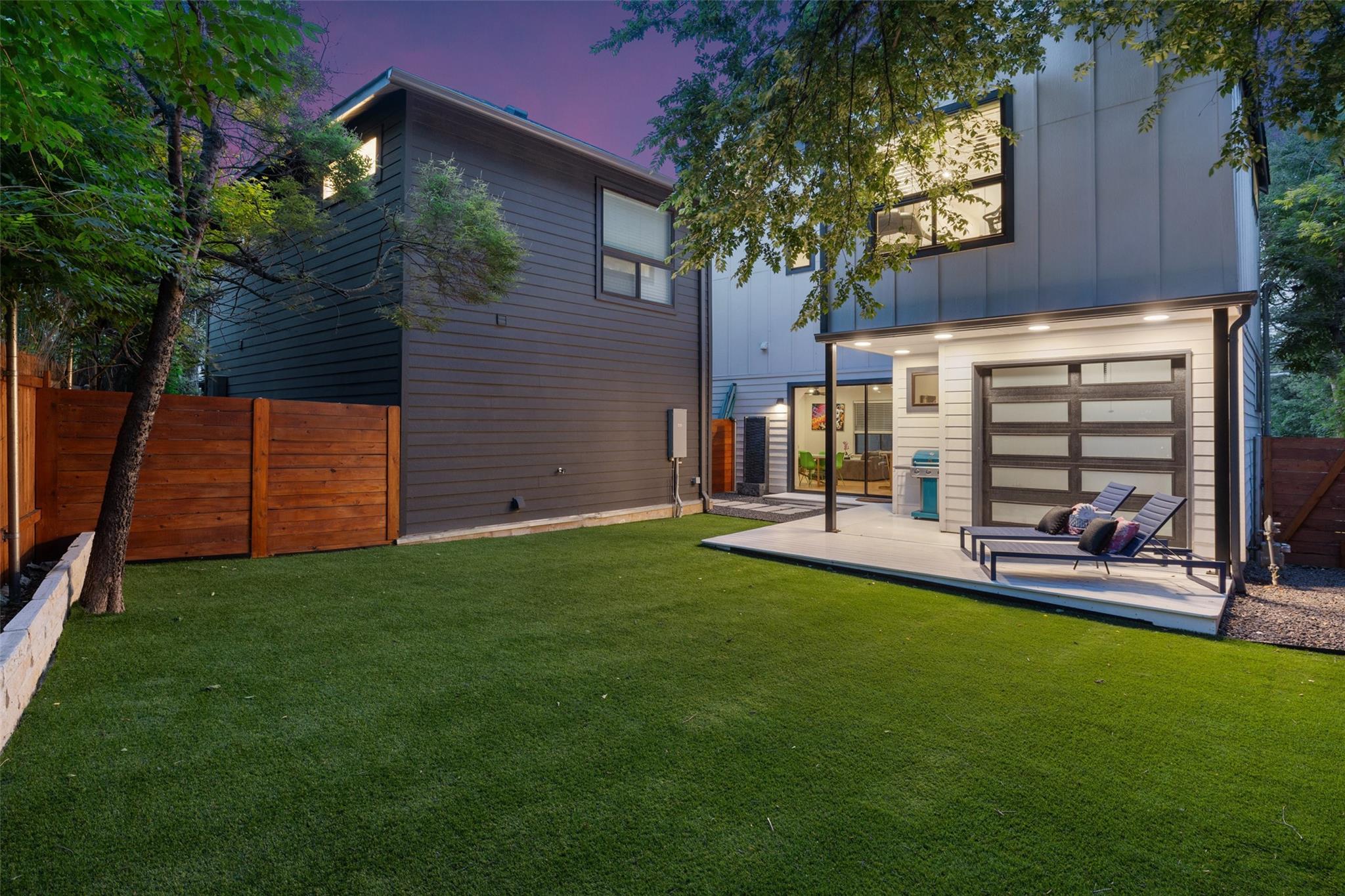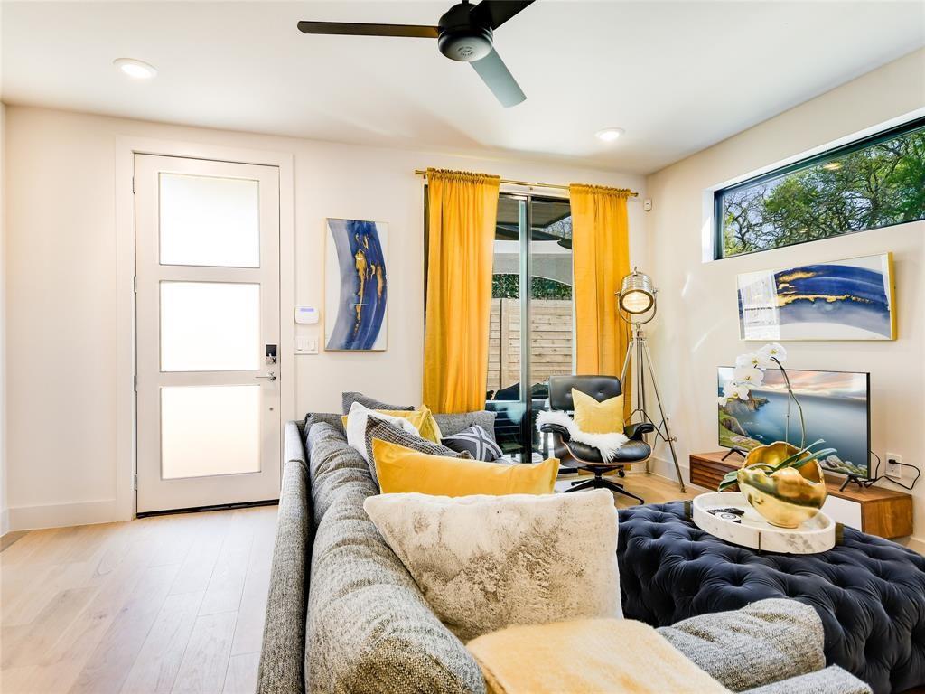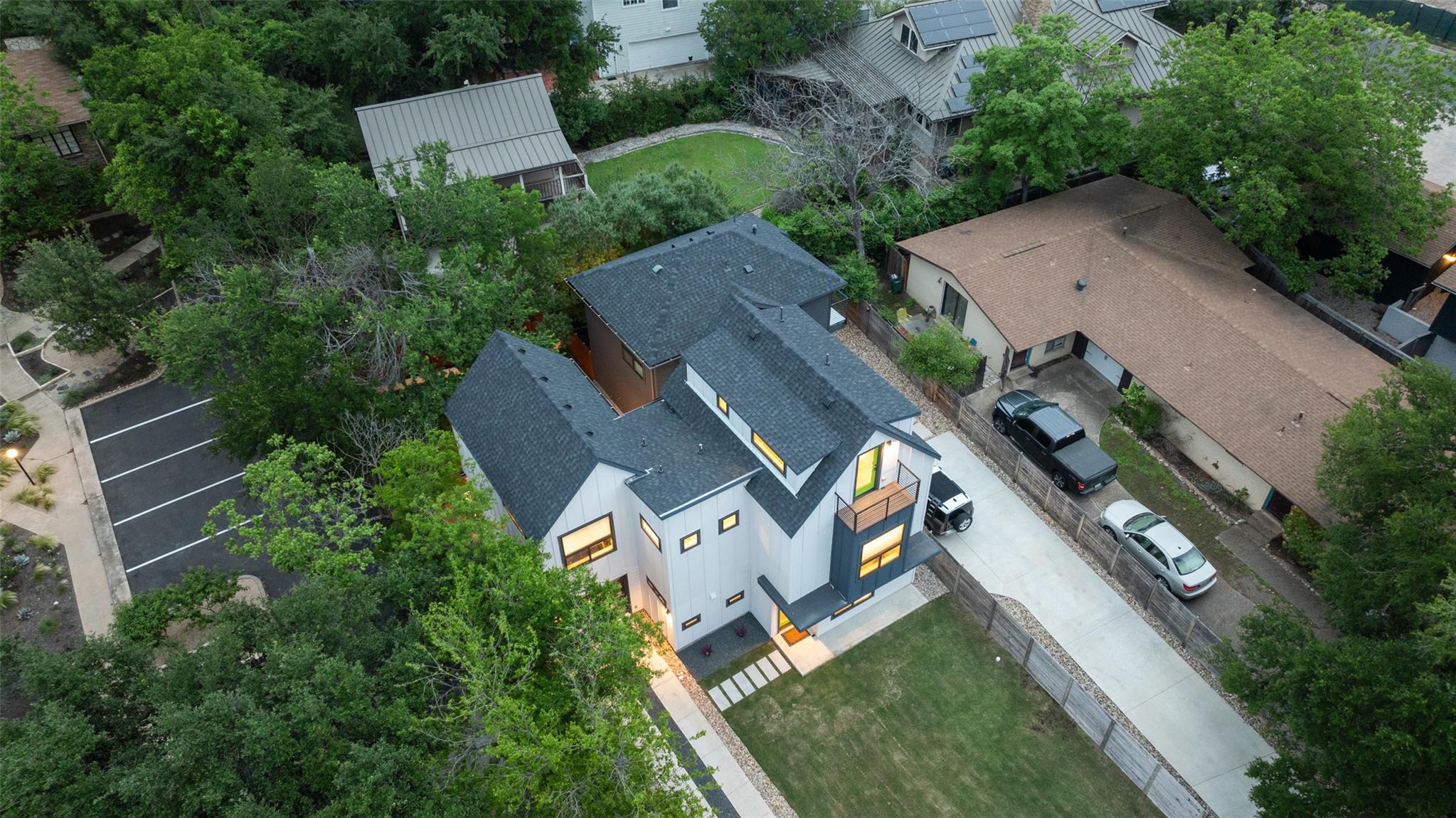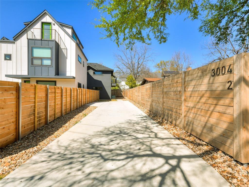 Two fully detached modern homes located in the heart of Austin. Exceptional build by Waterloo City Builders and designed by Local Life Designs. Unit 1: White exterior, 4 bedrooms, 3.5 baths, 1 living, 1 dining, 1 car garage with dual end doors for entertaining in this 2,097 sq.ft. home. Open 1st floor plan with living, dining, kitchen featuring a wall of sliding glass doors that open to the covered patio with AstroTurf fenced in back yard. The garage floor was treated with museum quality white epoxy that spills out to the backyard patio bringing this area into an entertaining space. This would make for a great cabana room or bar if a pool was added to the back yard. Lots of high end finishes, high ceilings, lots of natural light plus wide plank European white oak floors. On the 2nd floor is the primary suite with a huge walk in closet plus 2 more beds and a full bath plus the laundry room. On the 3rd floor is the 4th bedroom with ensuite bath – perfect for a study, hobby room or guest suite. Unit 2: Black exterior, 1,062+/-sq.ft., 2 bedrooms, 2.5 baths, 1 living/dining/kitchen, upper patio, fenced yard, tandem parking in driveway for 3 vehicles. Walk to dining, shopping, and entertainment. Close to Lake Austin, Mozart’s Coffee, Hula Hut, and the Lions Golf course.