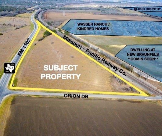 Approx. 10.114 Acres located in the booming north side of New Braunfels and just minutes from downtown Gruene. Approx. 2,095 feet of frontage on FM 1102 and approx. 521 feet of frontage on Orion Drive. No portion of the Property lies with the FEMA 100-year floodplain. All utilities through NBU. Property is located in the Edwards Aquifer Transition Zone. Great commercial corner with frontage on FM 1102. Zoned APD (agricultural/pre-development district), but New Braunfel’s Future Land Use Map (FLUM) indicates Industrial use for this property.